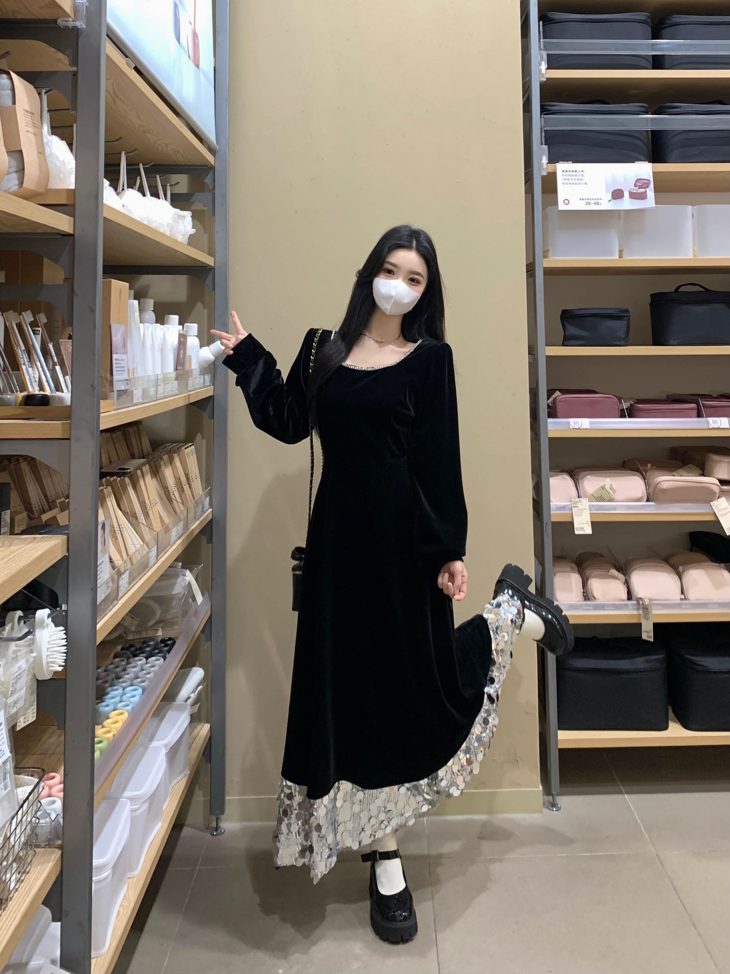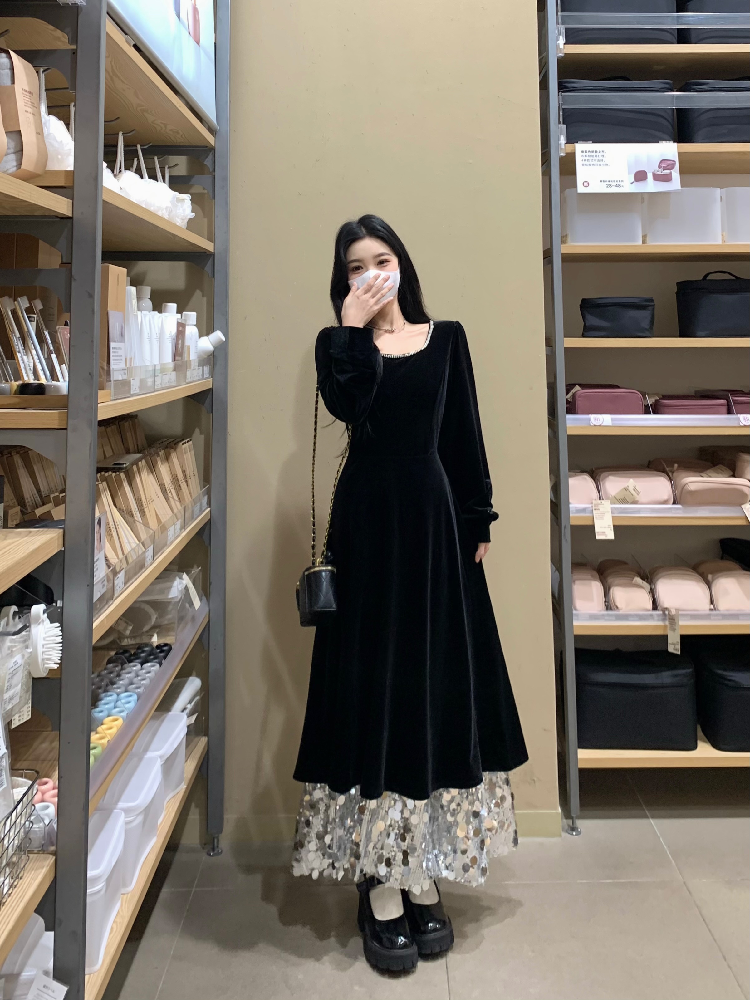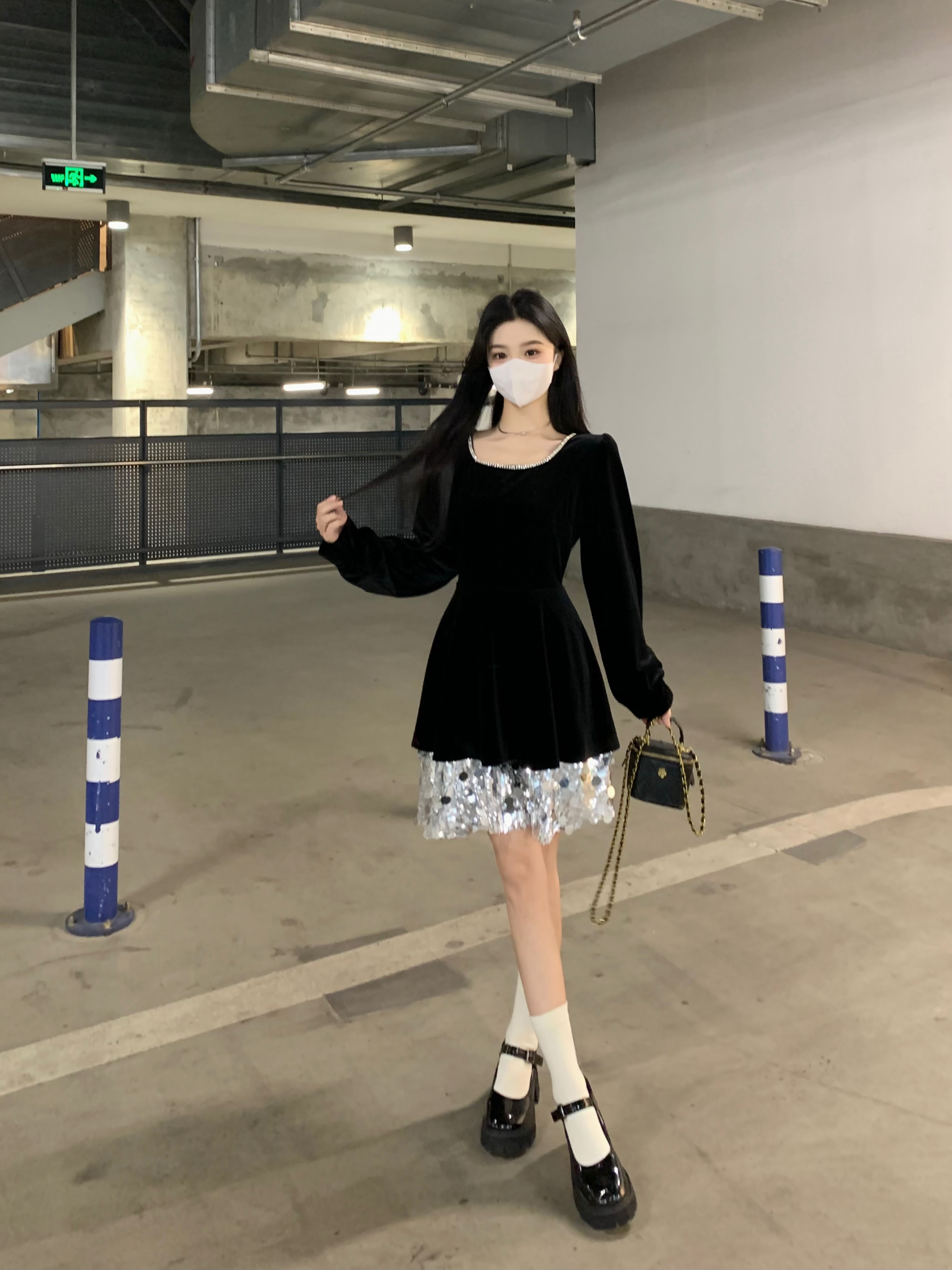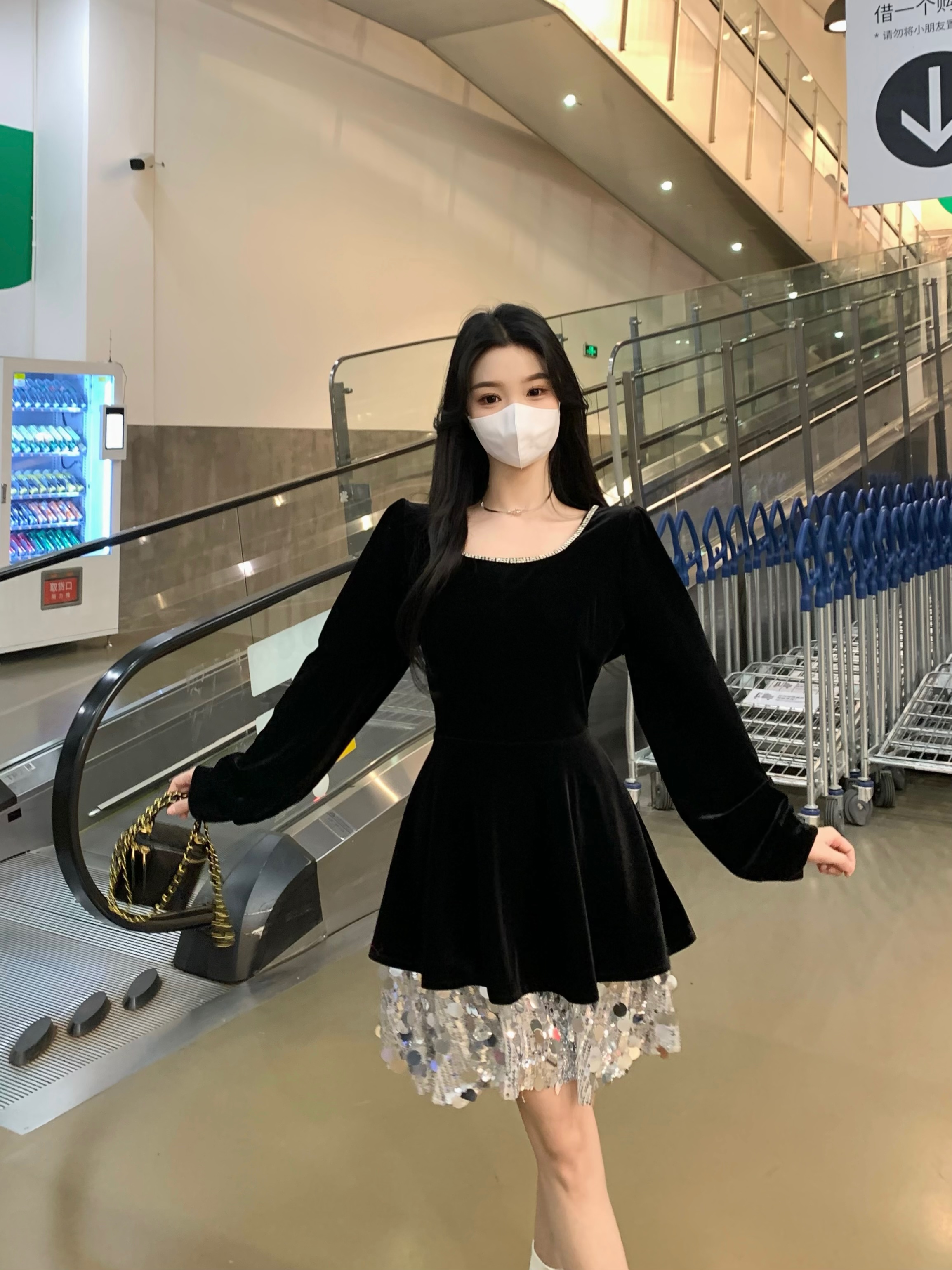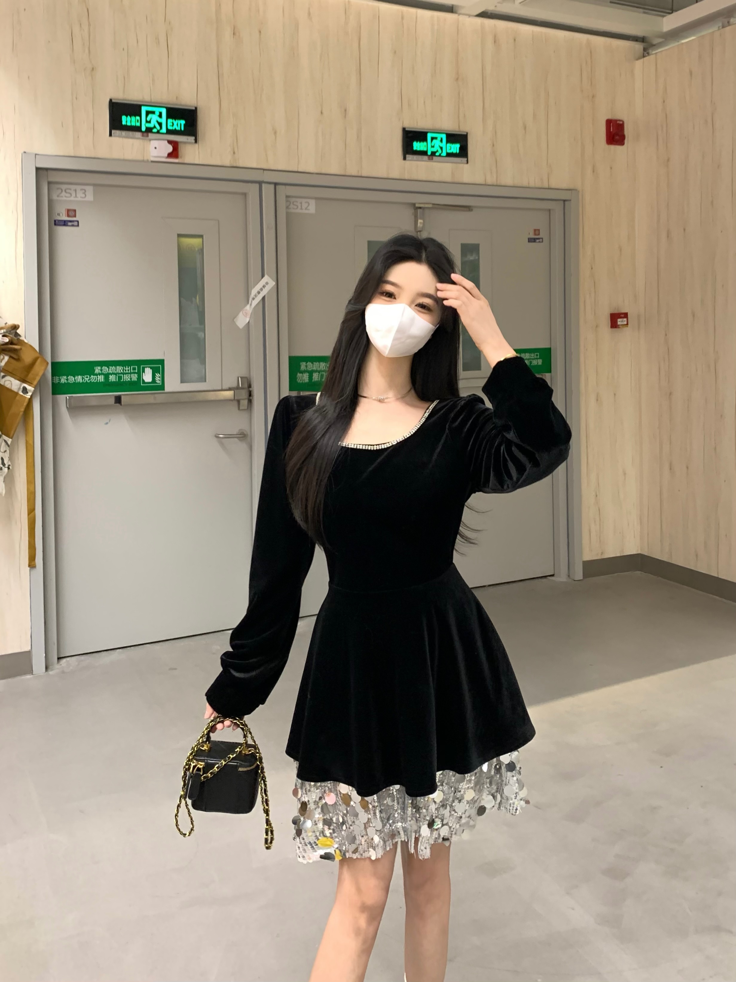 MY14331# 女装胖mm新款布灵小黑裙亮片长短裙方领收腰显瘦连衣裙女裝貨源服裝批發