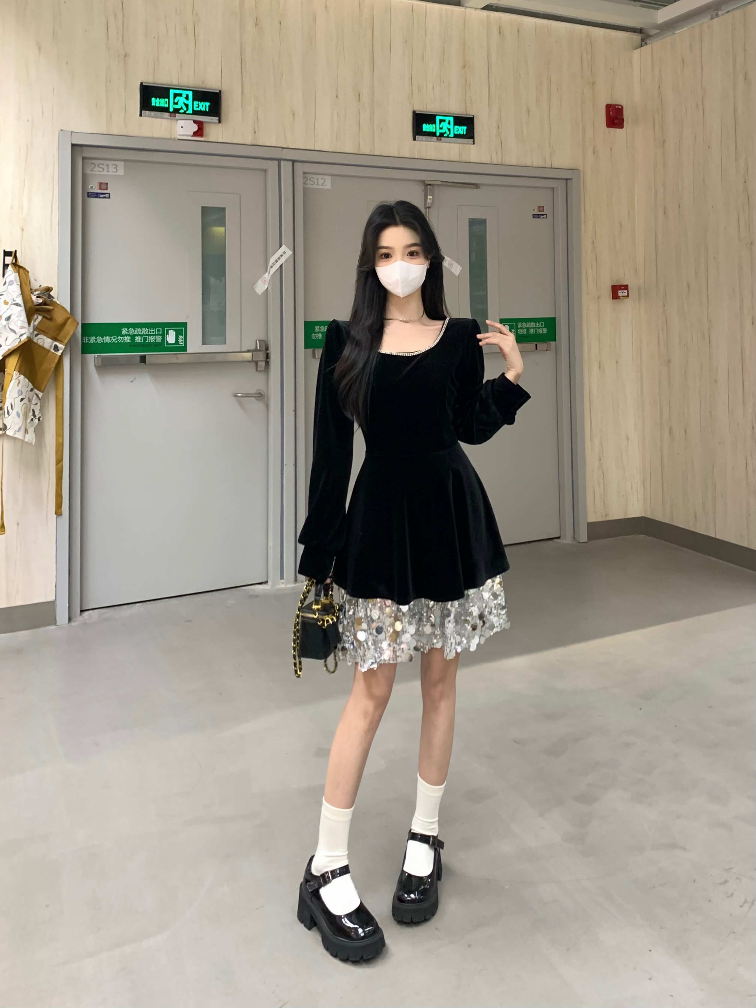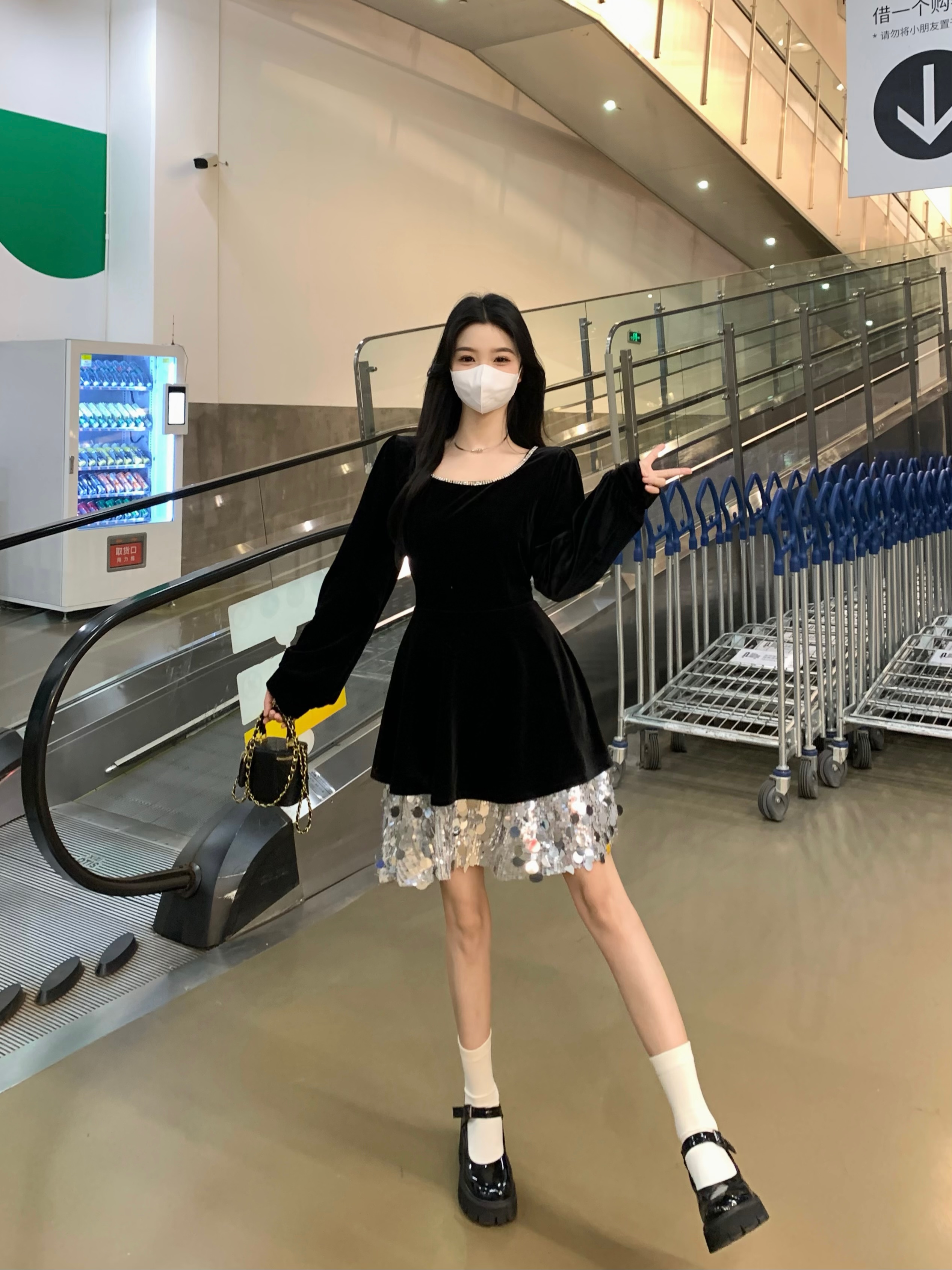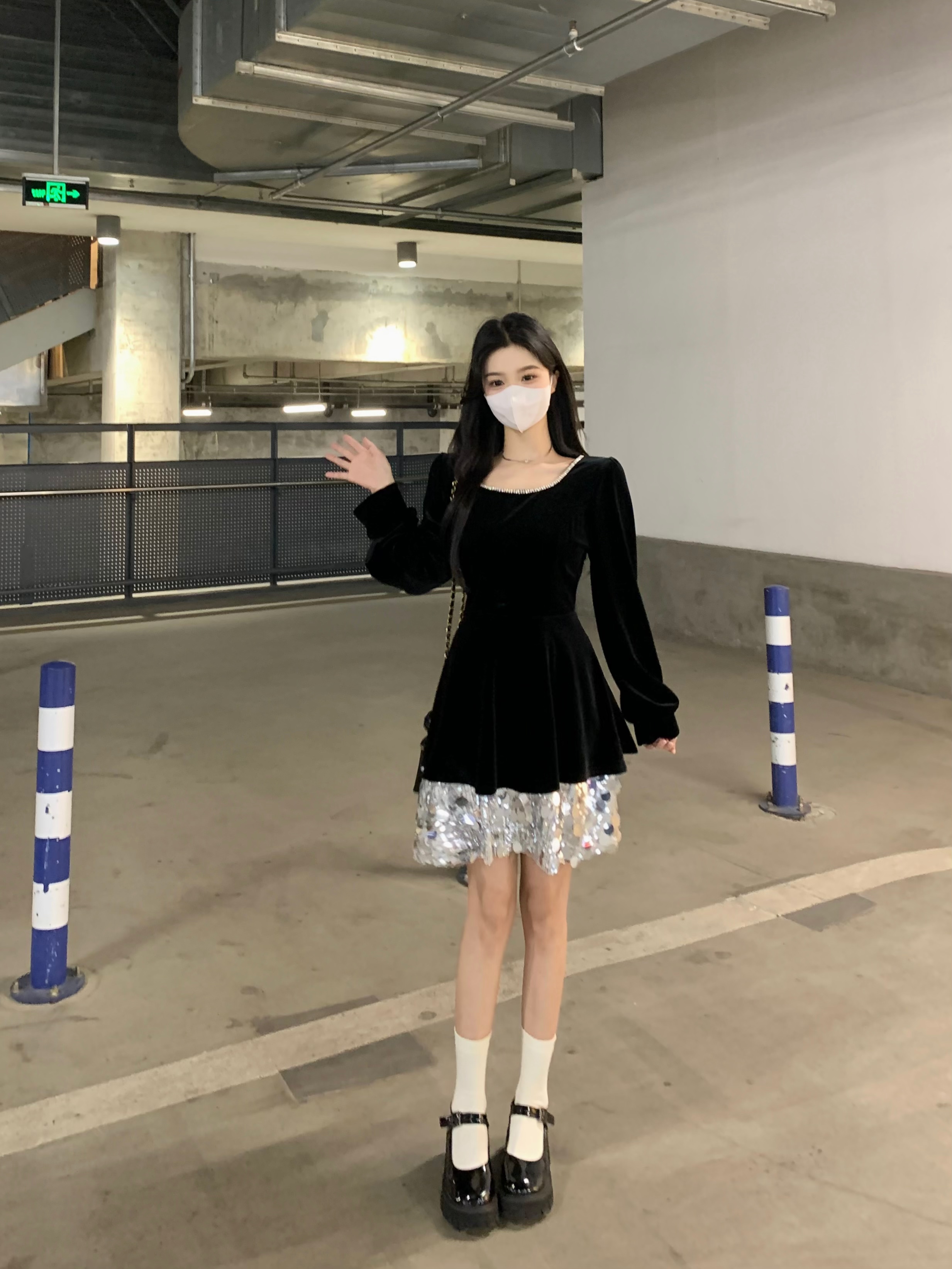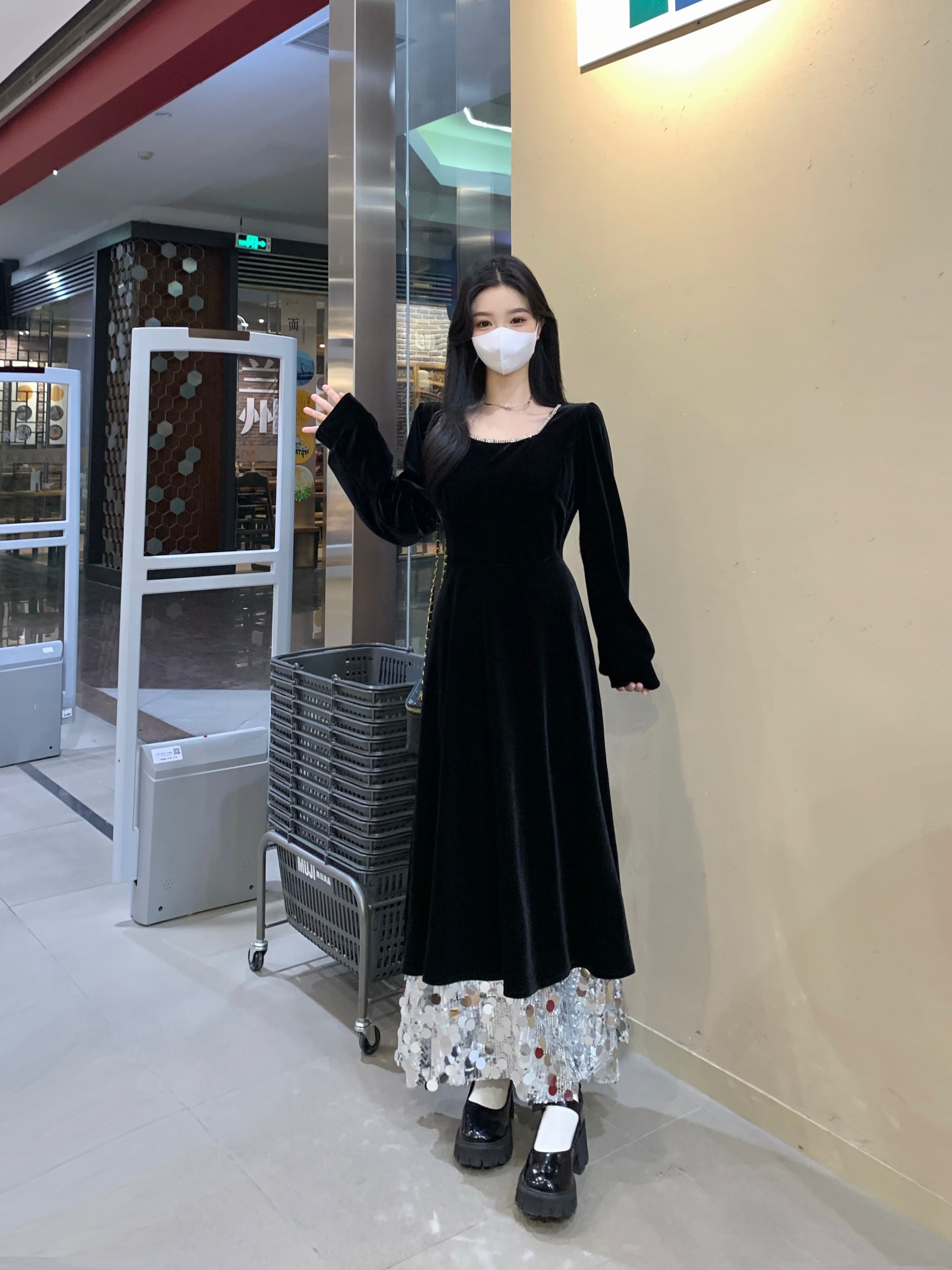 MY14331# 女装胖mm新款布灵小黑裙亮片长短裙方领收腰显瘦连衣裙女裝貨源服裝批發
