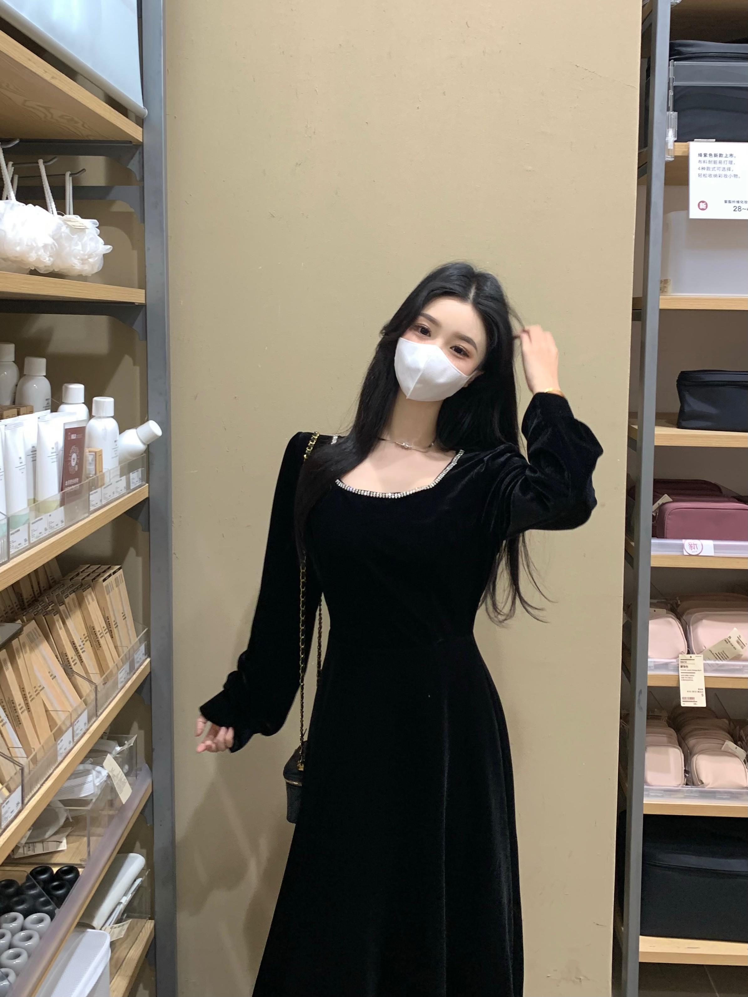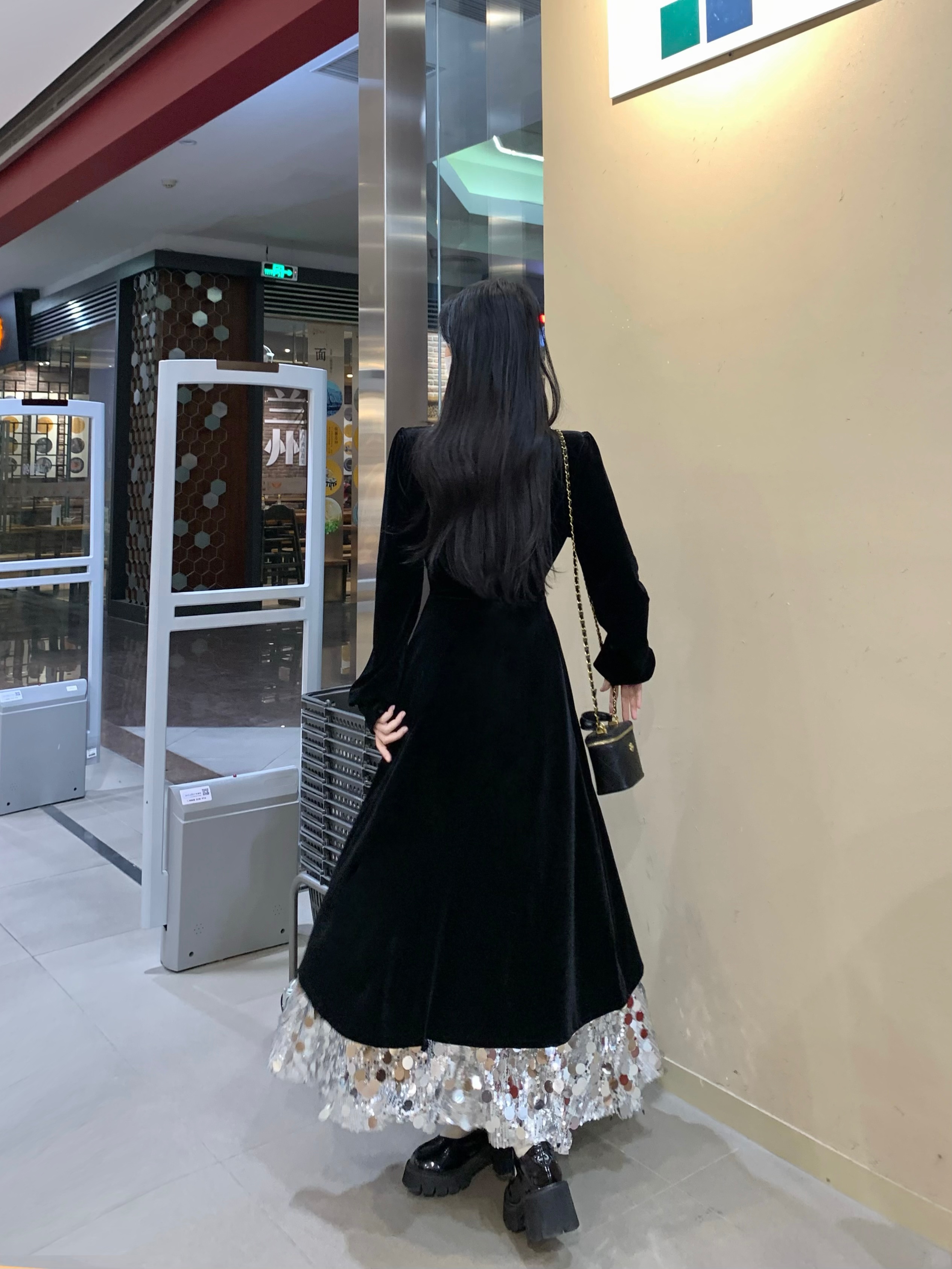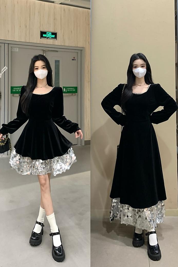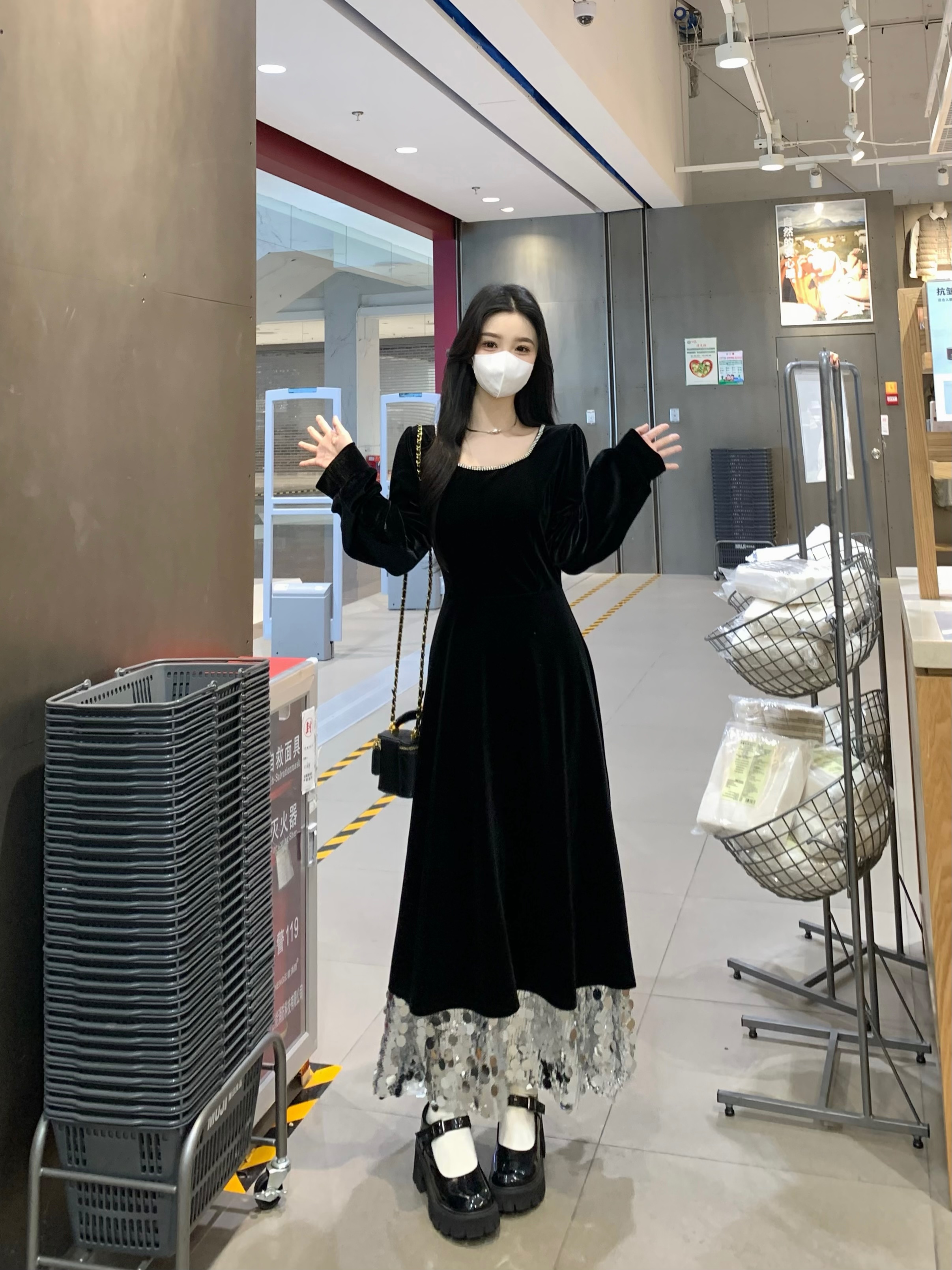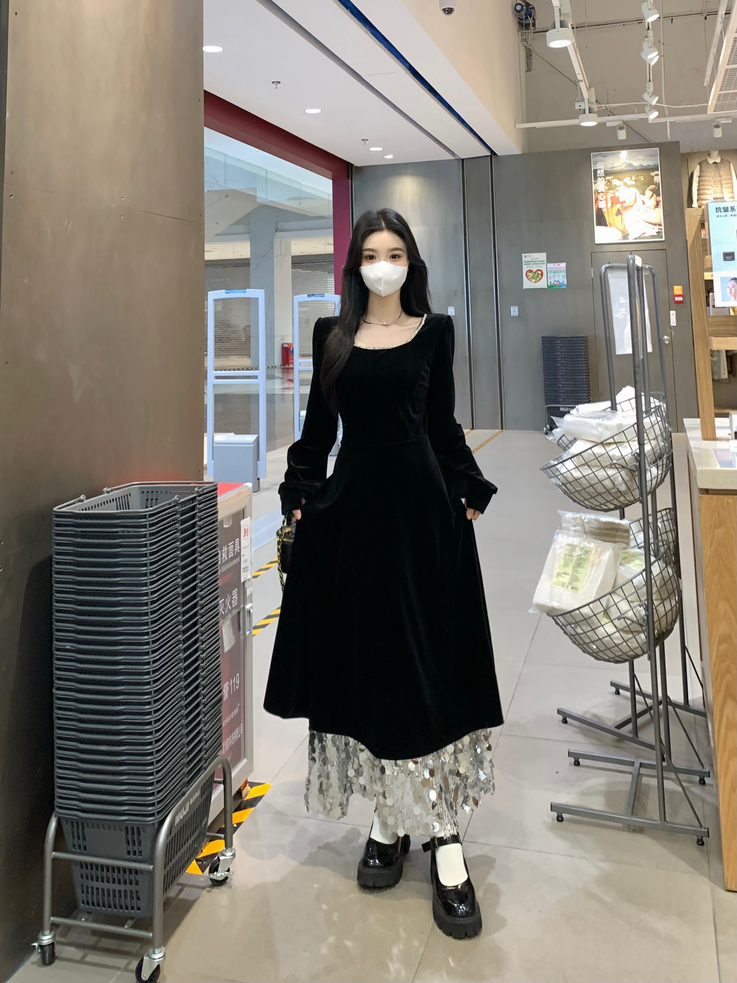 MY14331# 女装胖mm新款布灵小黑裙亮片长短裙方领收腰显瘦连衣裙女裝貨源服裝批發
