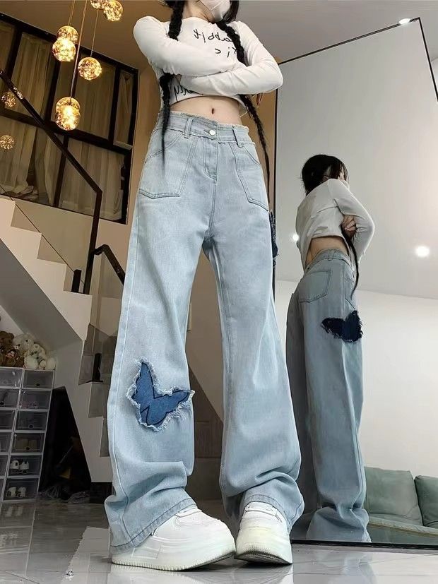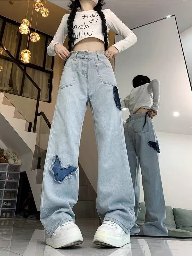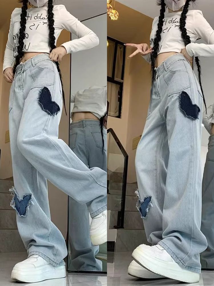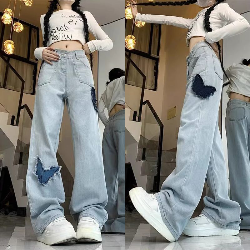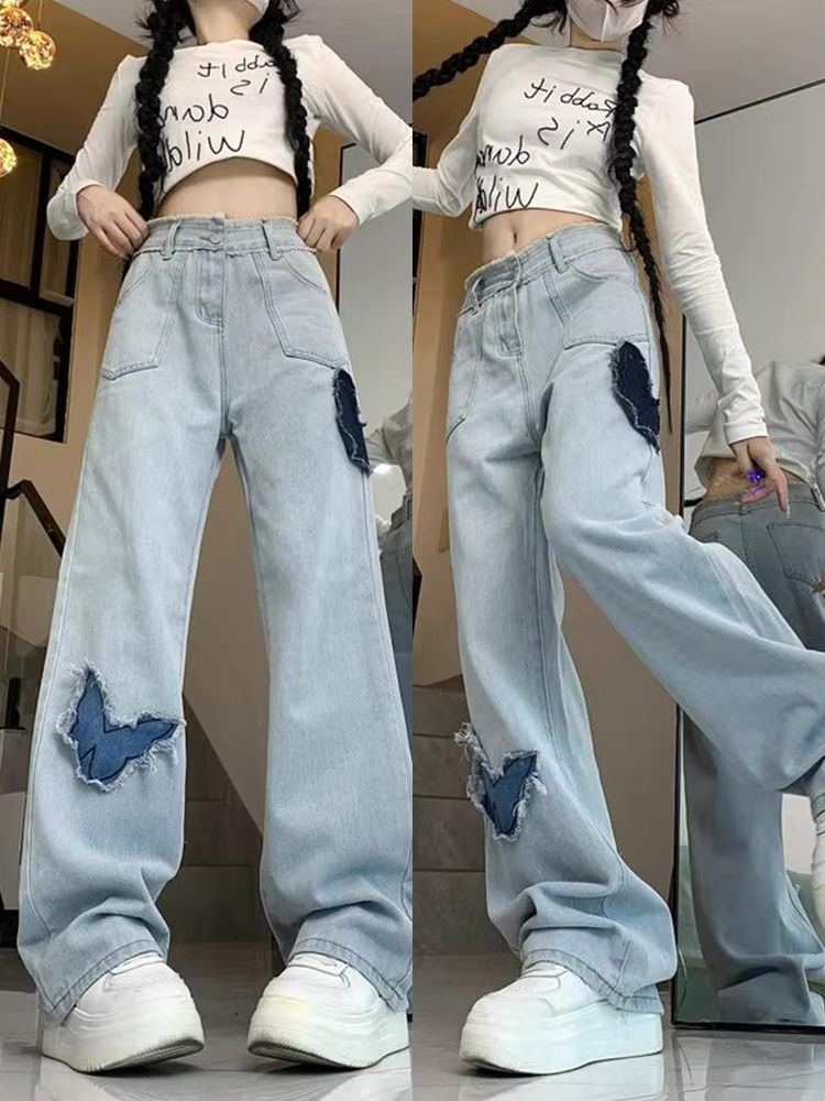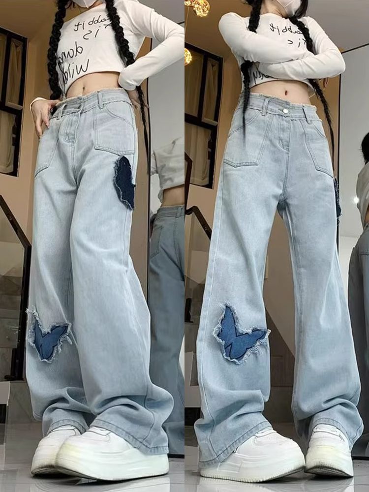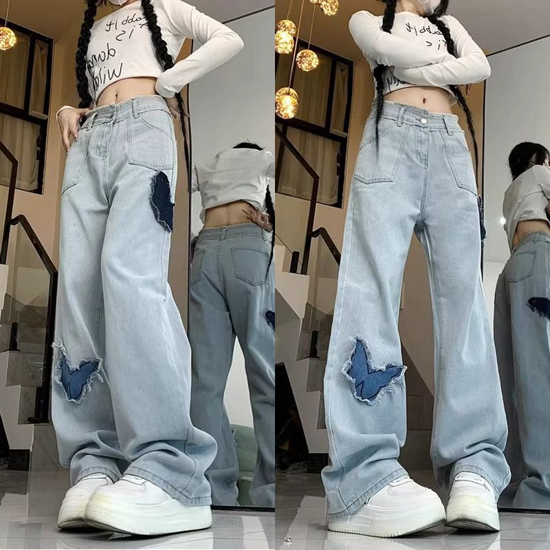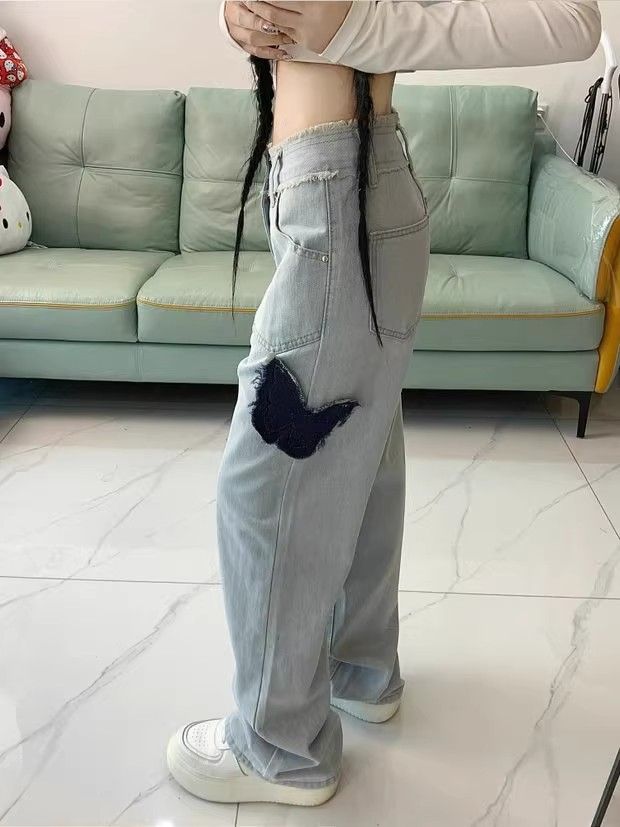 MY14336# 复古毛边直筒牛仔裤女新款蝴蝶设计高腰宽松显瘦百搭阔腿裤子女裝貨源服裝批發