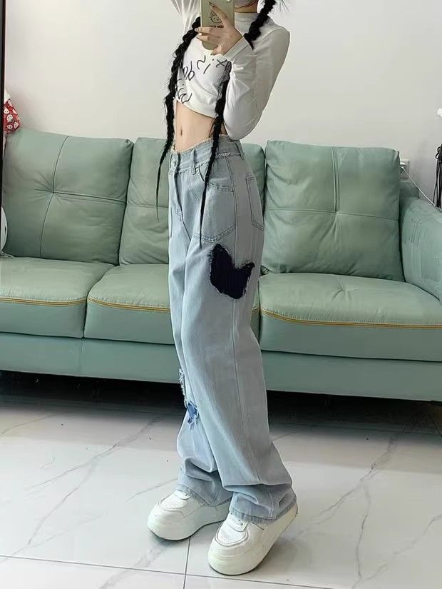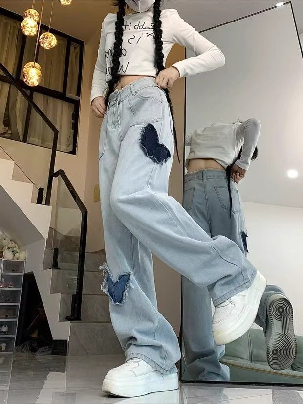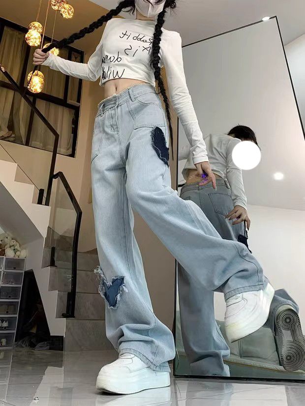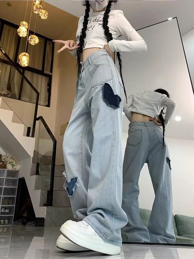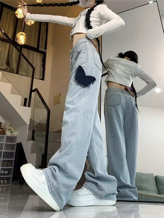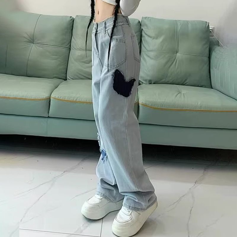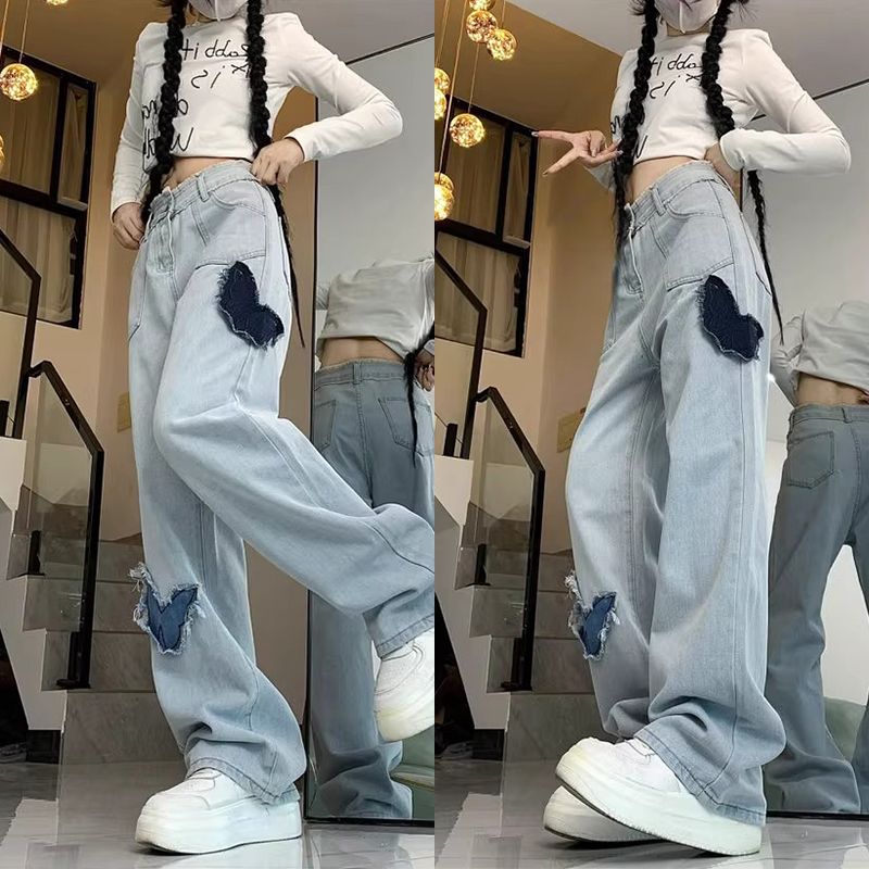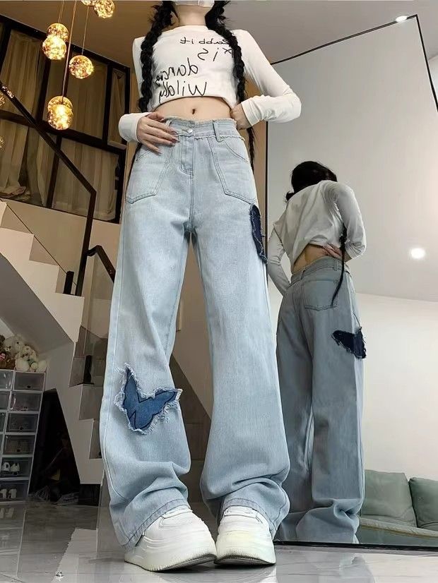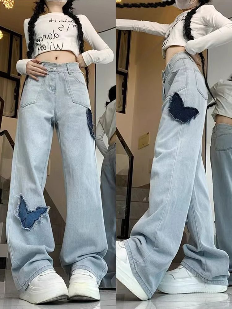 MY14336# 复古毛边直筒牛仔裤女新款蝴蝶设计高腰宽松显瘦百搭阔腿裤子女裝貨源服裝批發