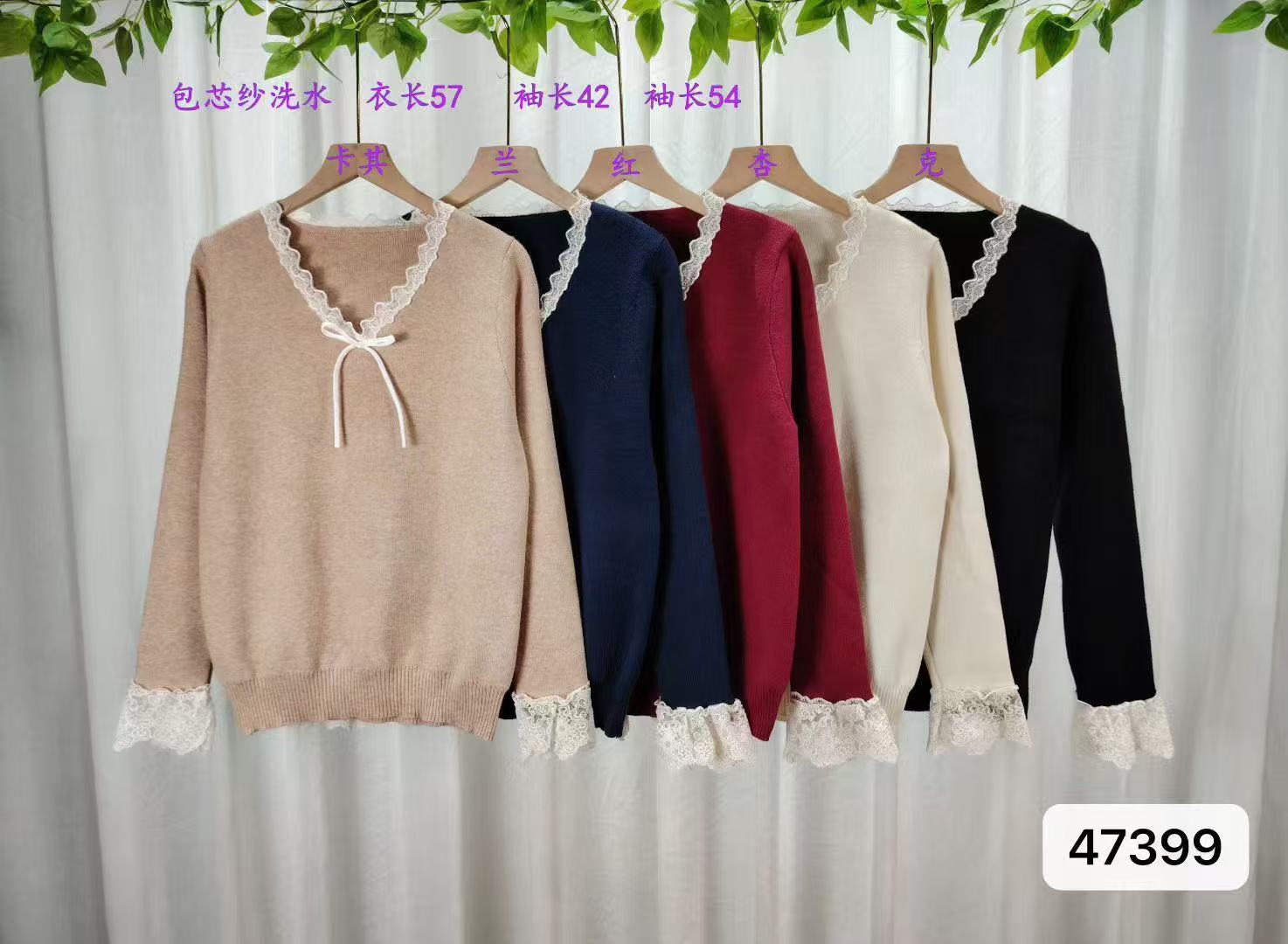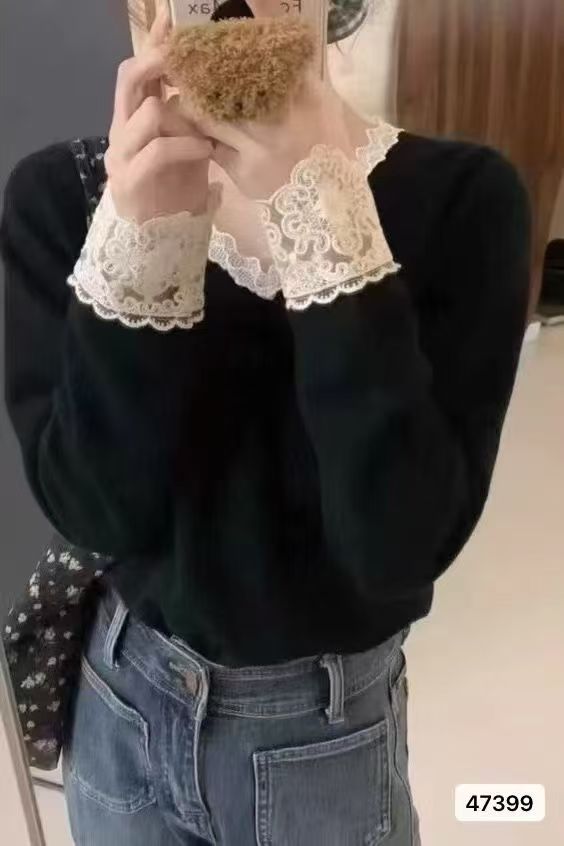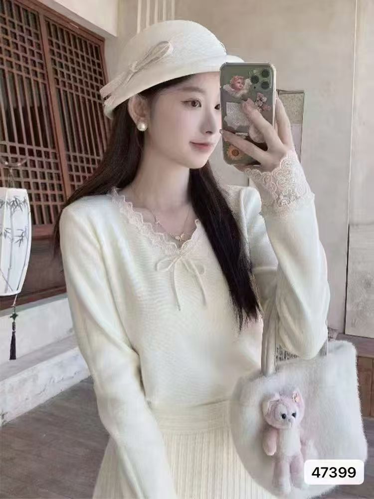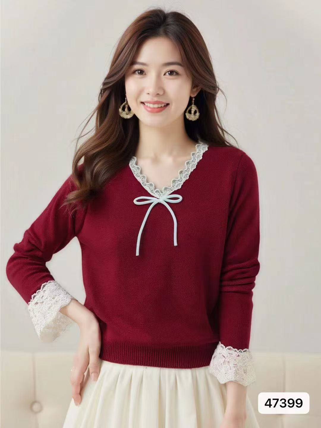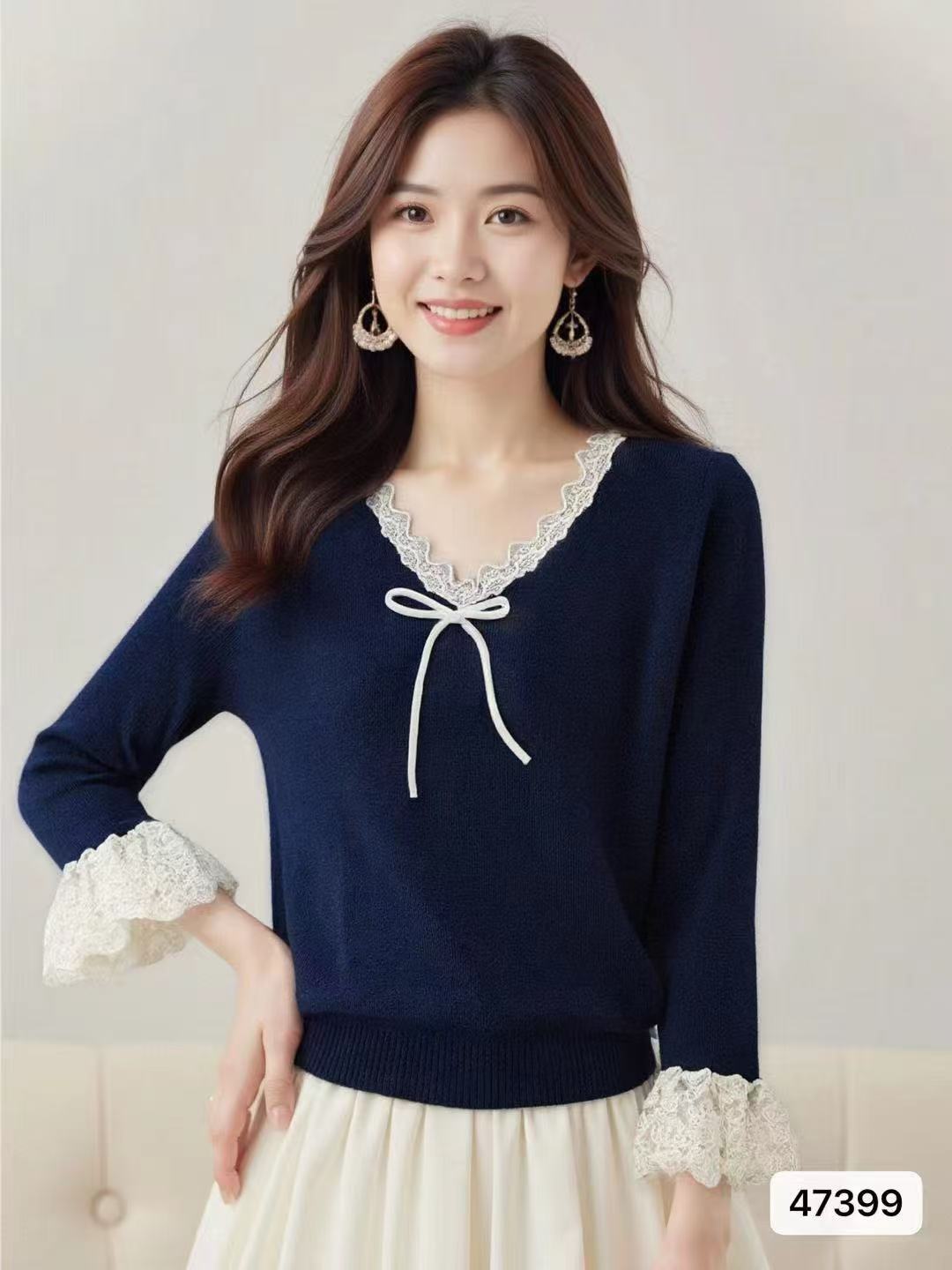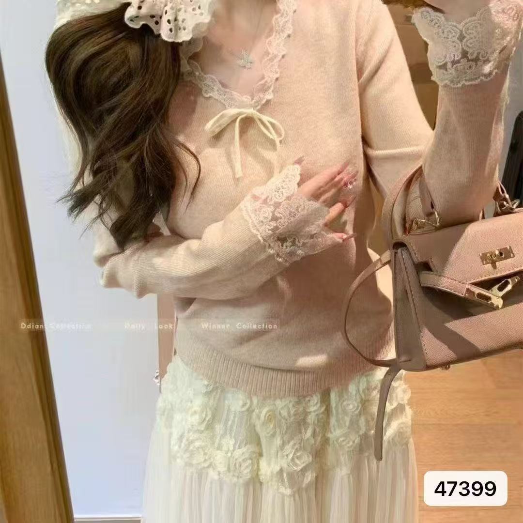 MY14347# 新款韩系V领蝴蝶结系带蕾丝拼接针织长袖上衣女女裝貨源服裝批發