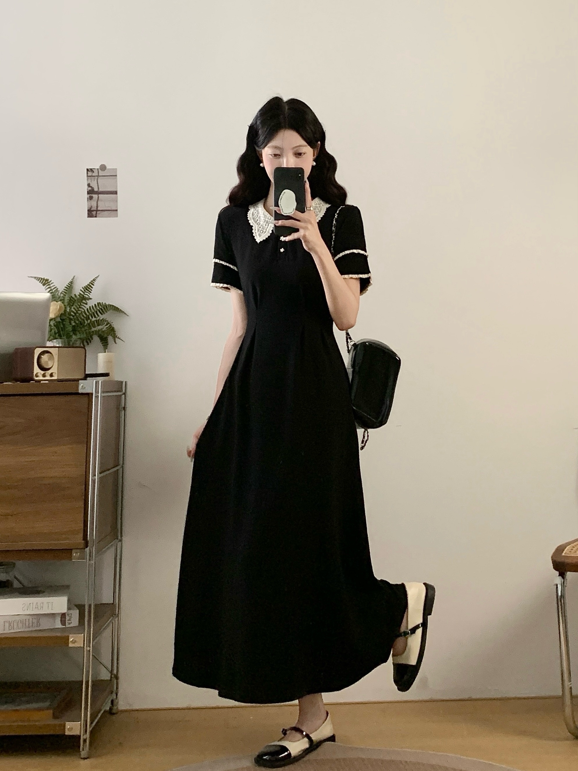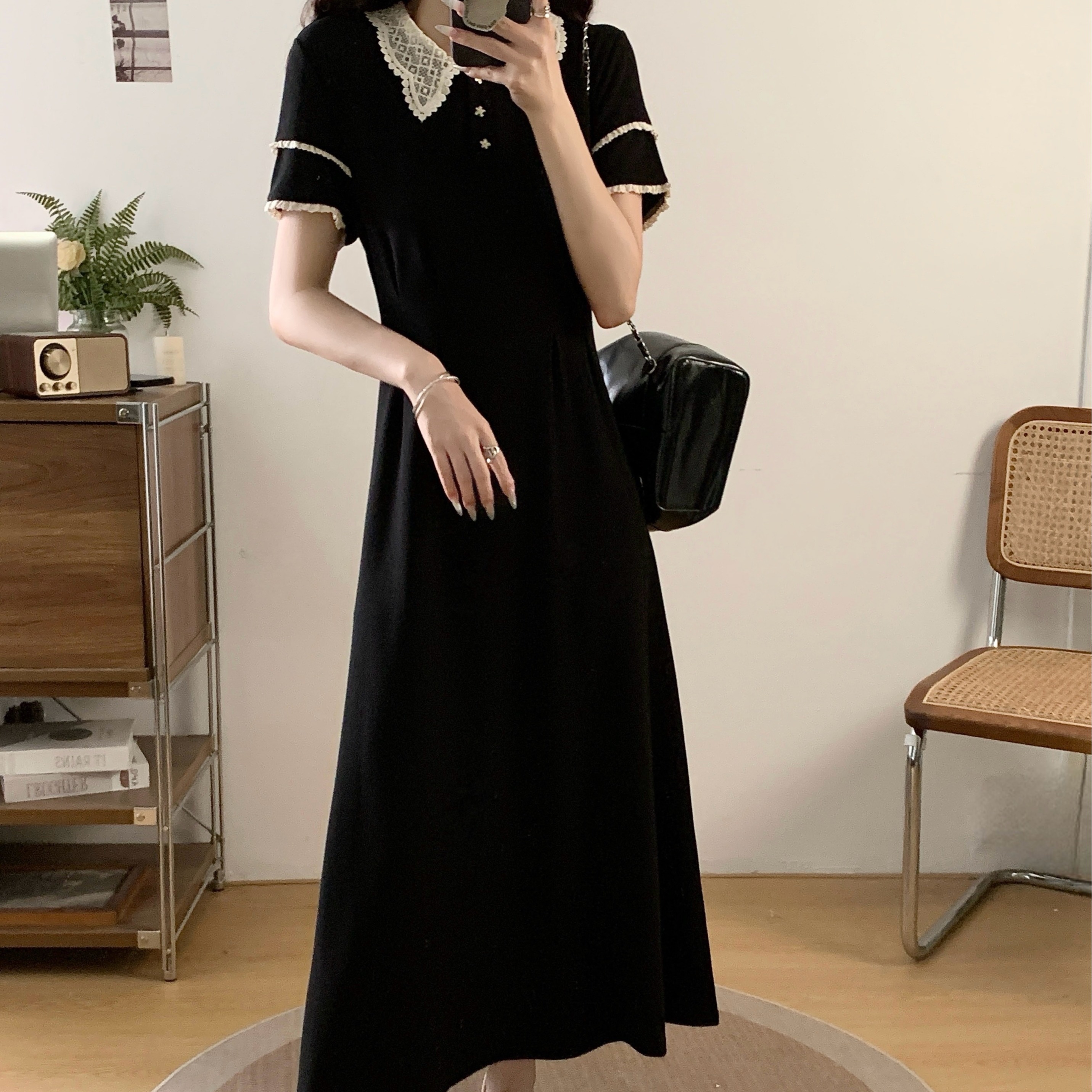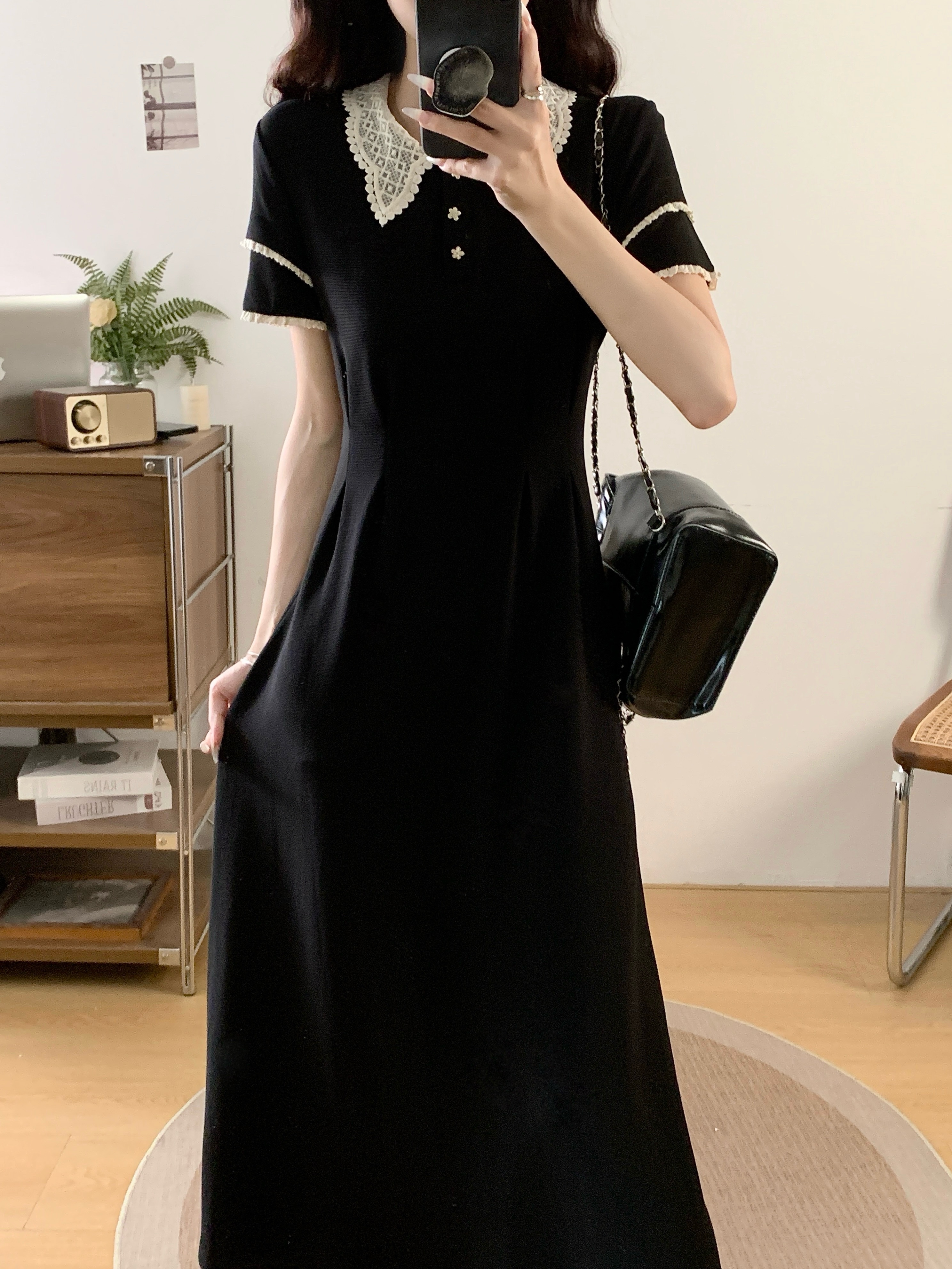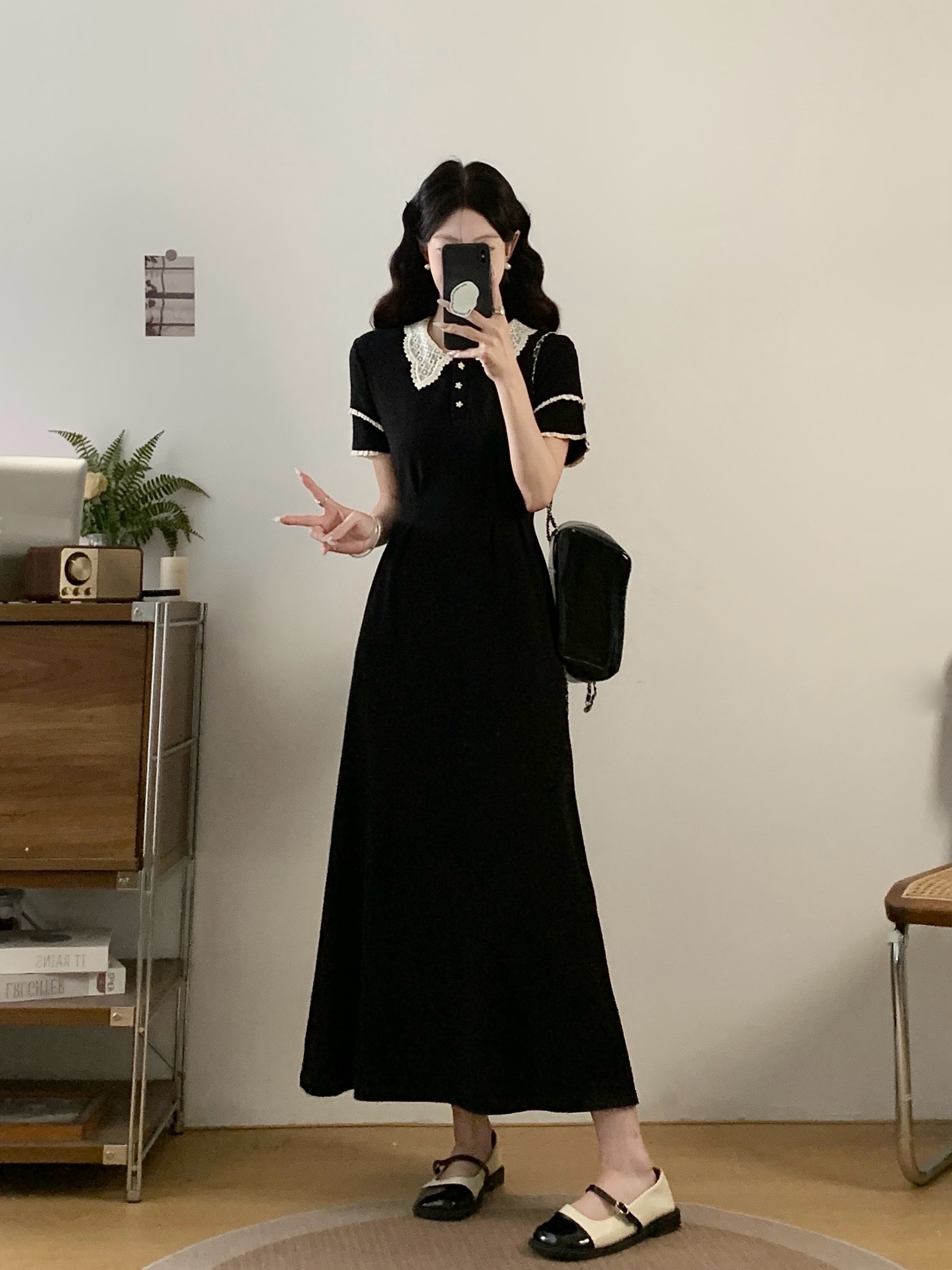 MY14362# 大码女装夏季新款法式休闲polo领蕾丝拼接A字连衣裙女裝貨源服裝批發
