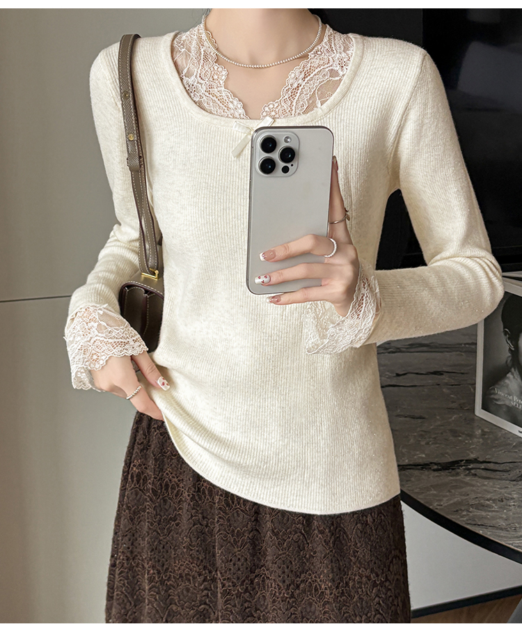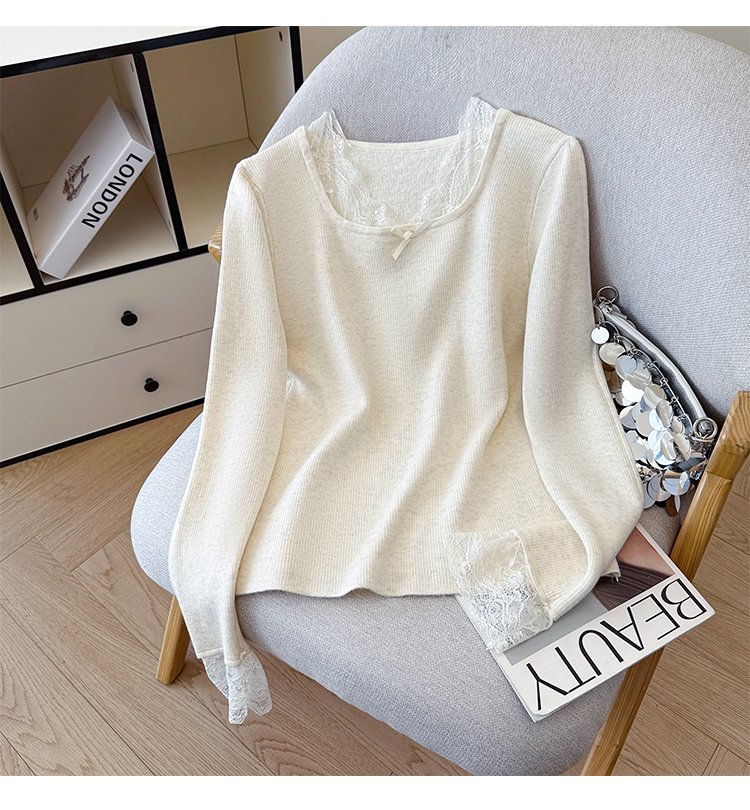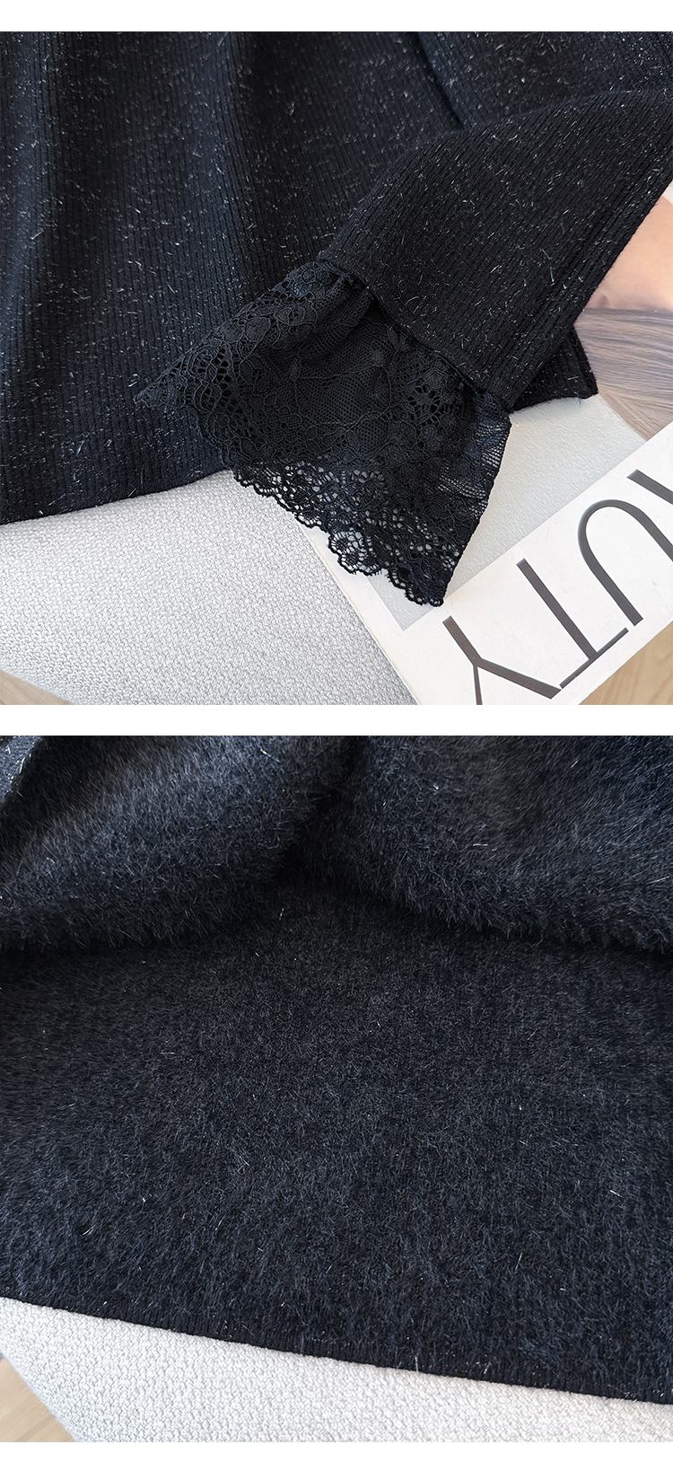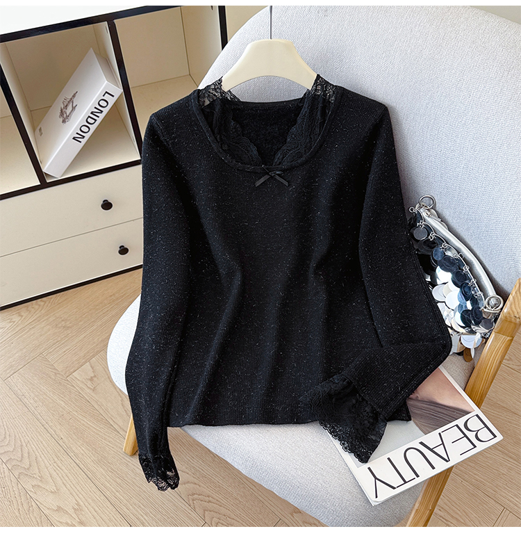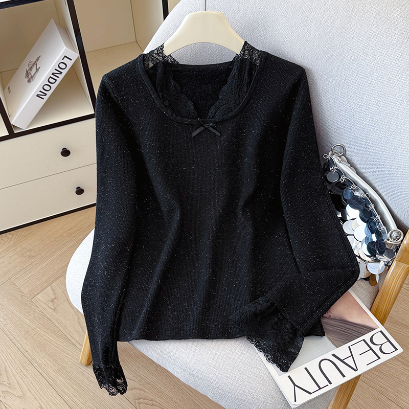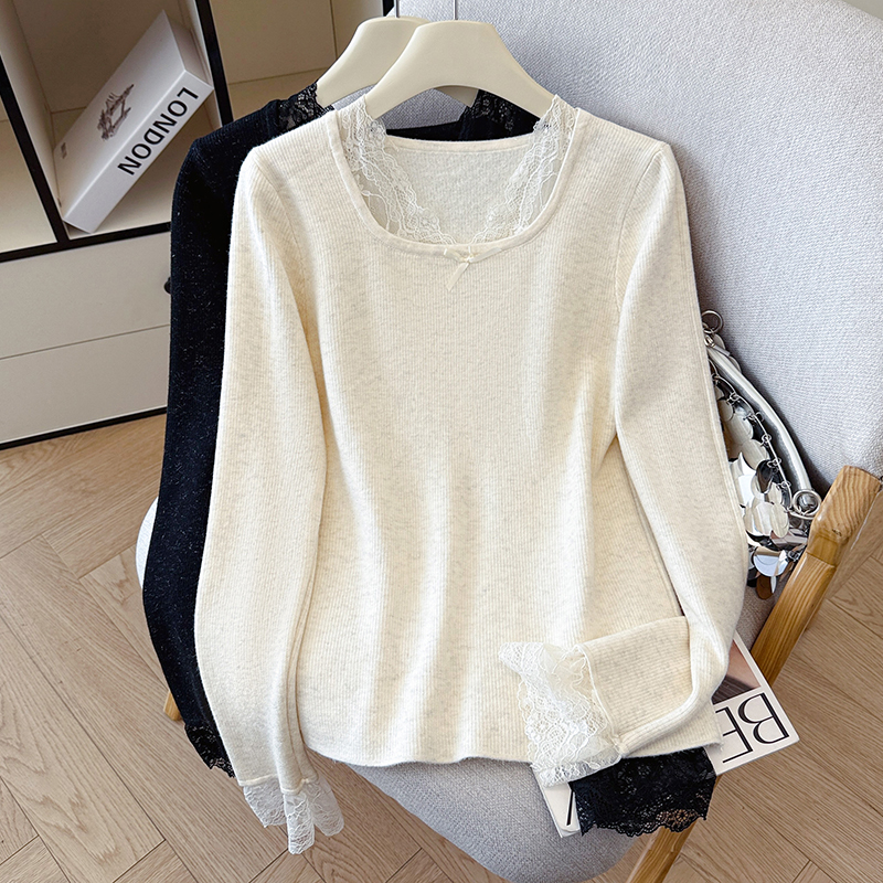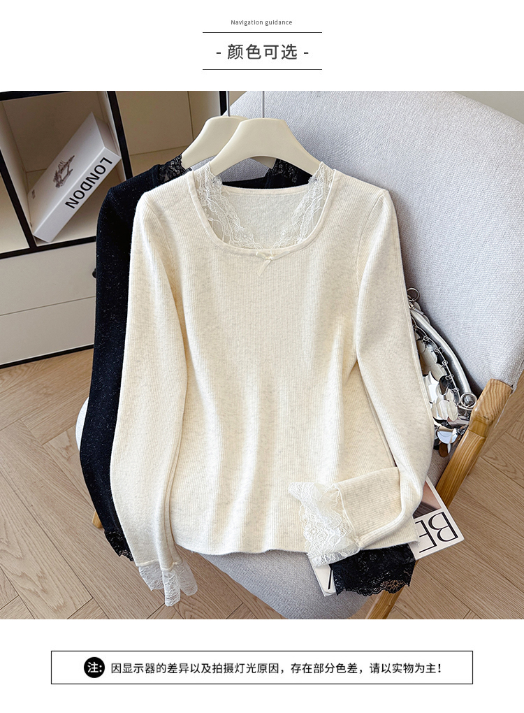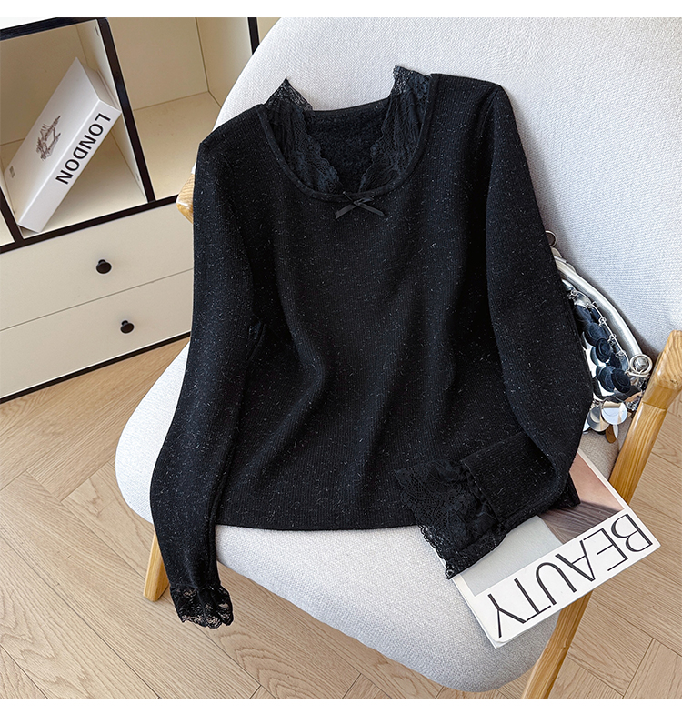 MY14456# 性感蕾丝边圆领加绒加厚打底针织衫女设计感长袖内搭上衣女裝貨源服裝批發