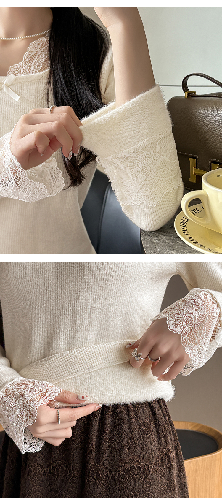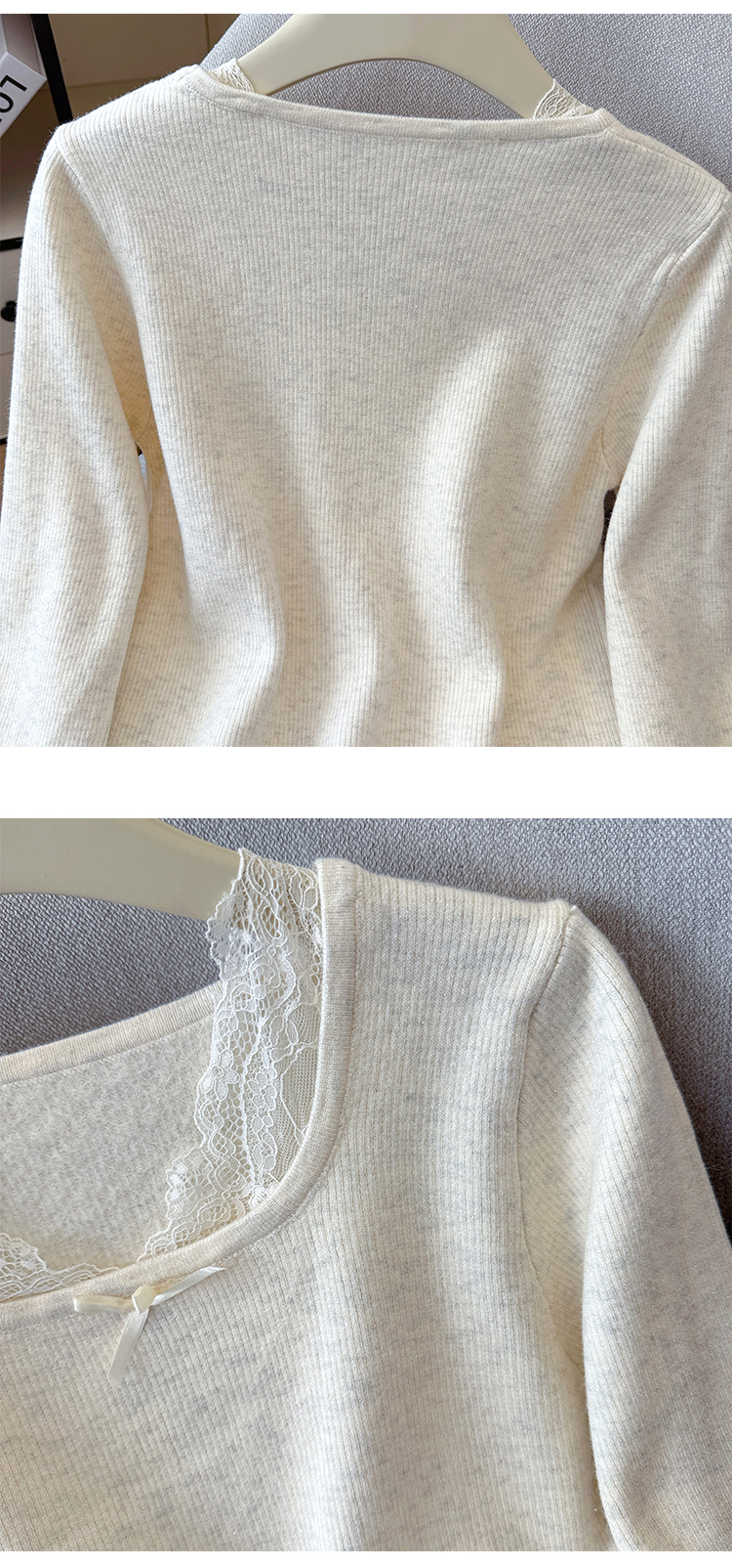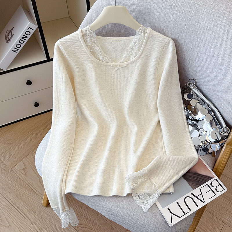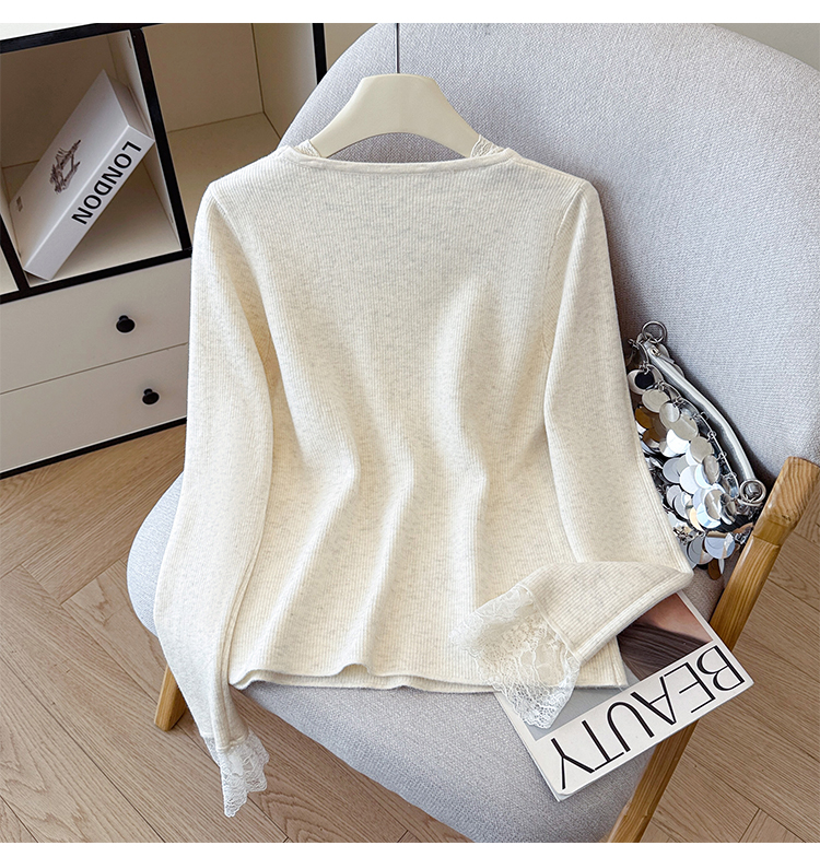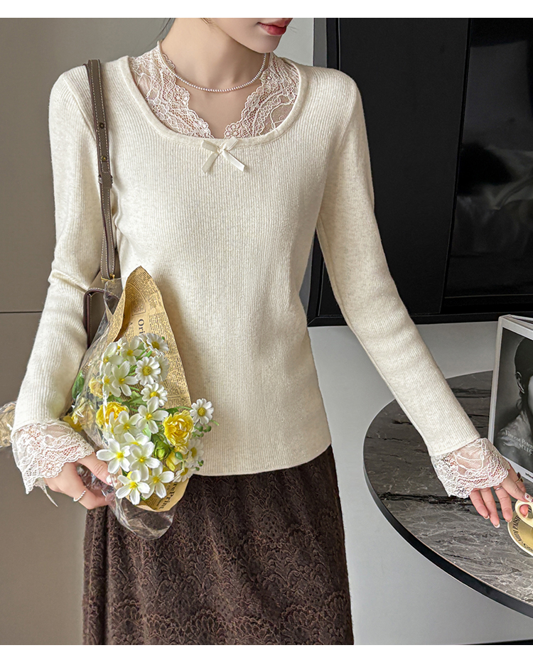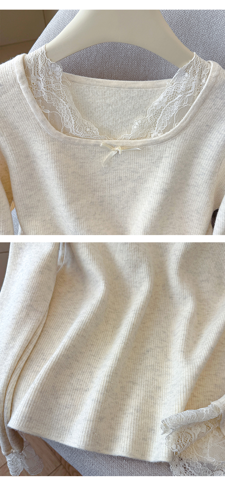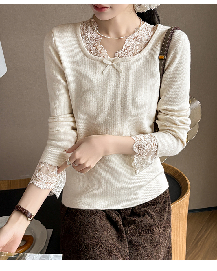 MY14456# 性感蕾丝边圆领加绒加厚打底针织衫女设计感长袖内搭上衣女裝貨源服裝批發