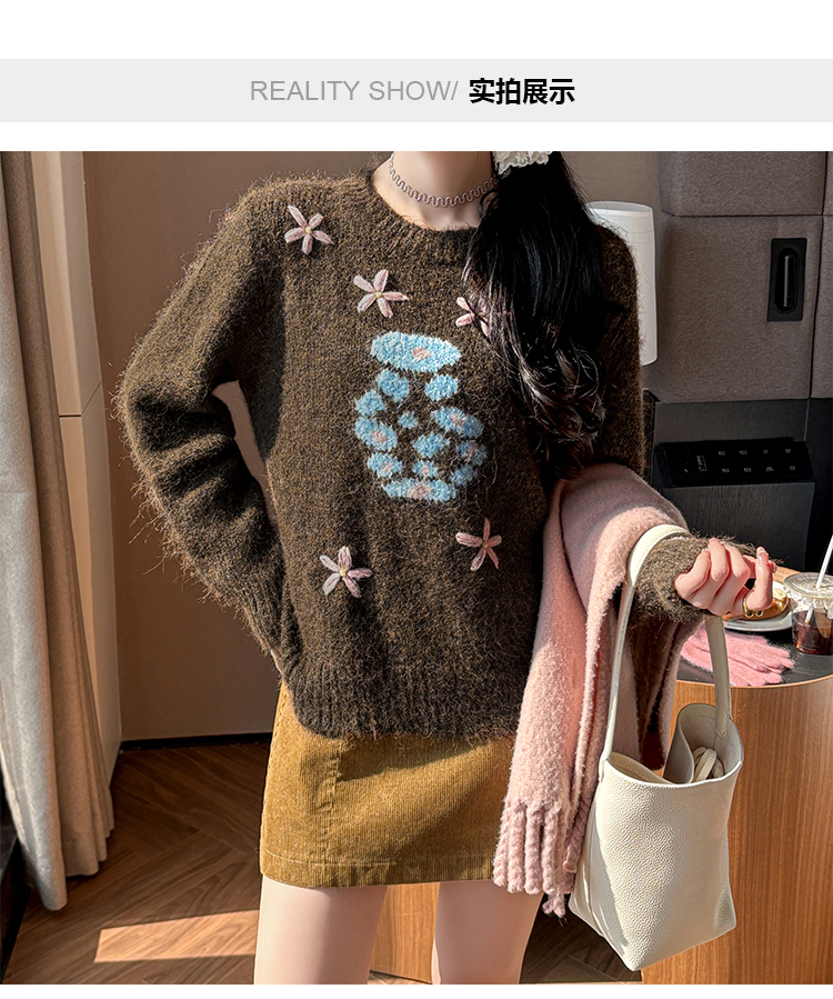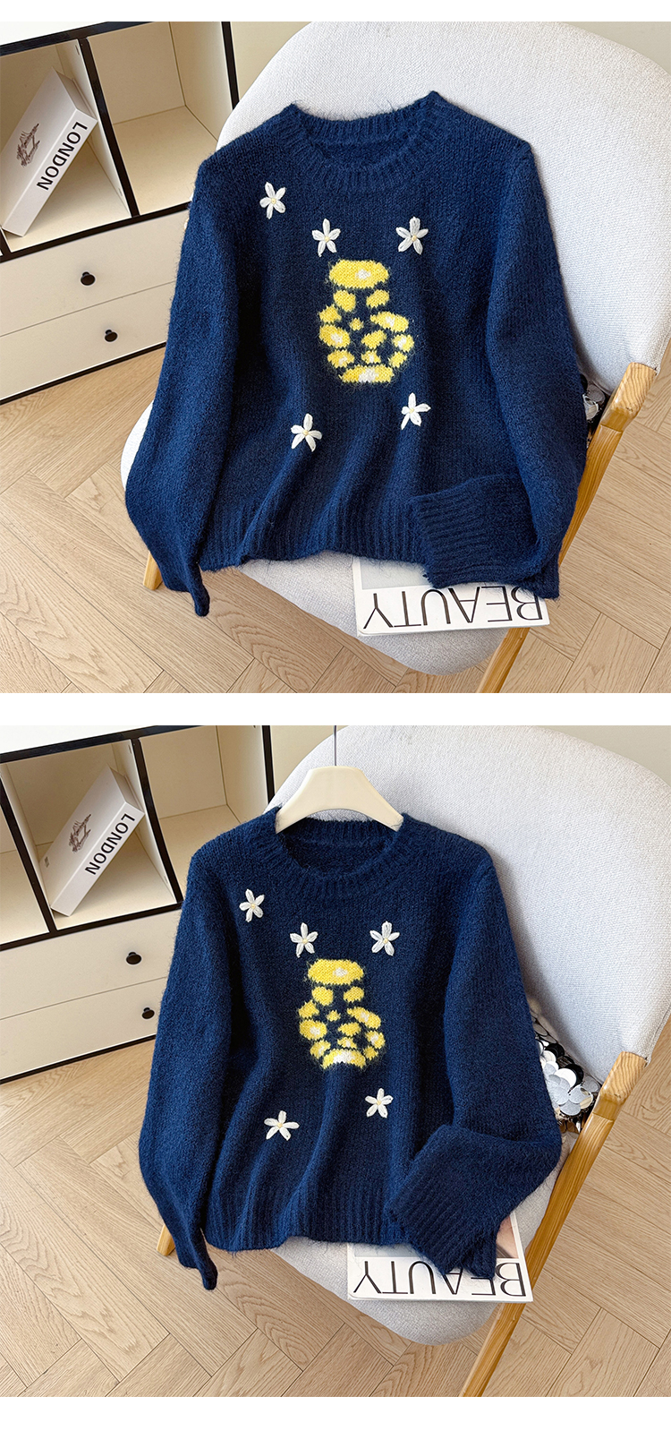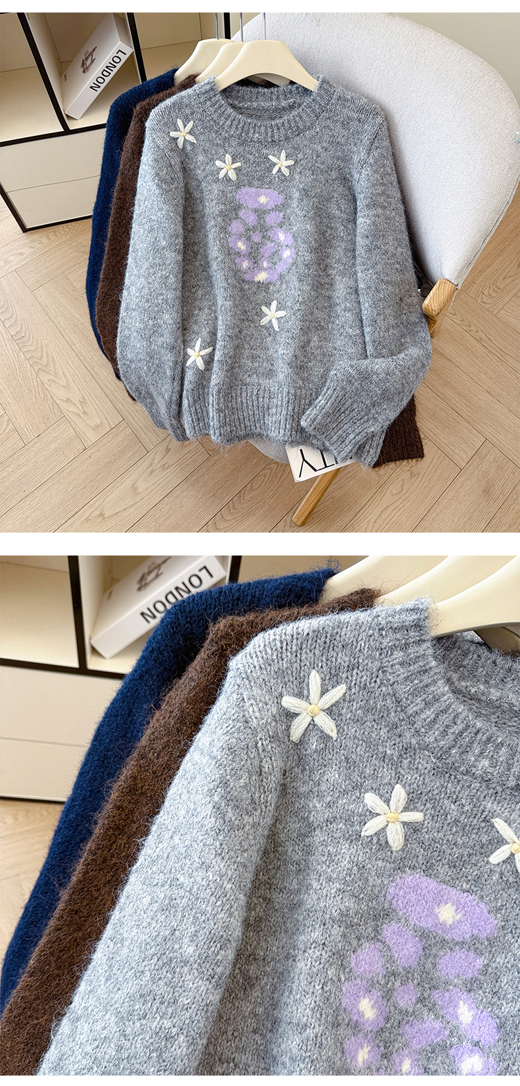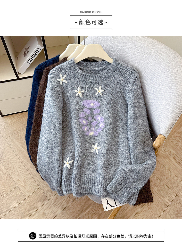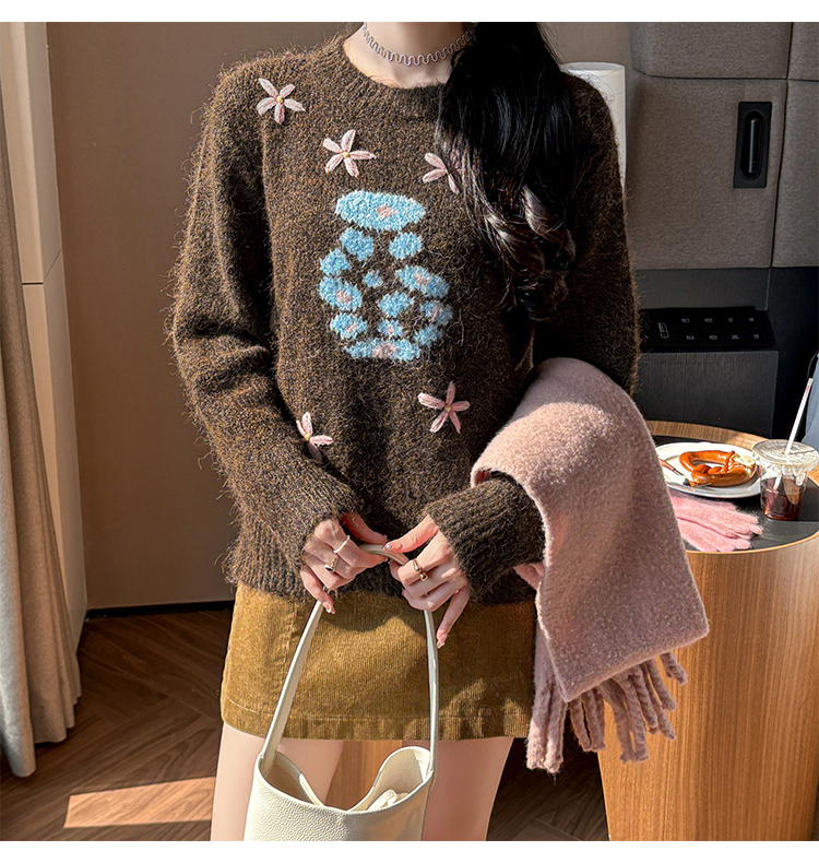 MY14461# 设计感手勾花朵圆领套头打底针织女秋冬提花刺绣毛衣上衣外穿女裝貨源服裝批發