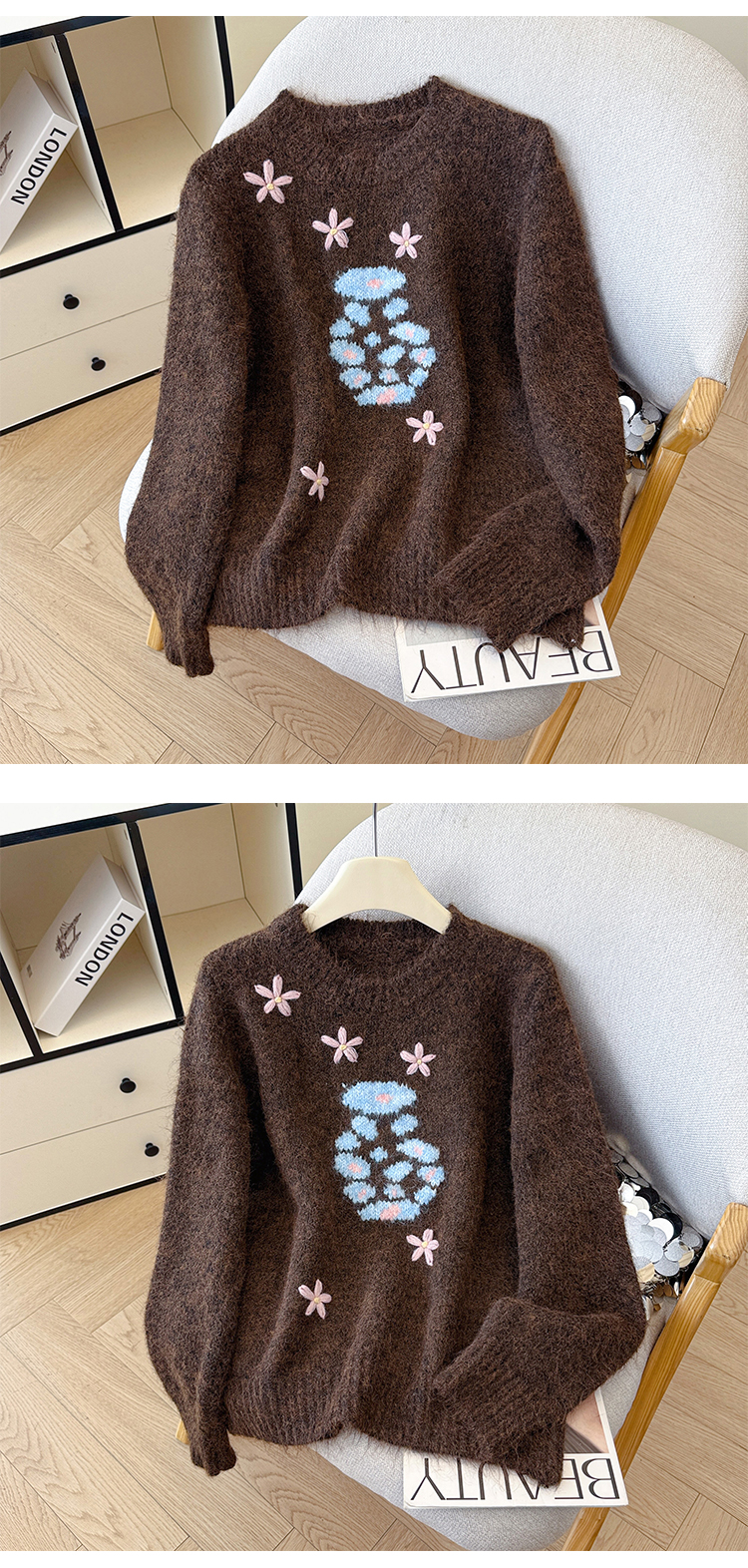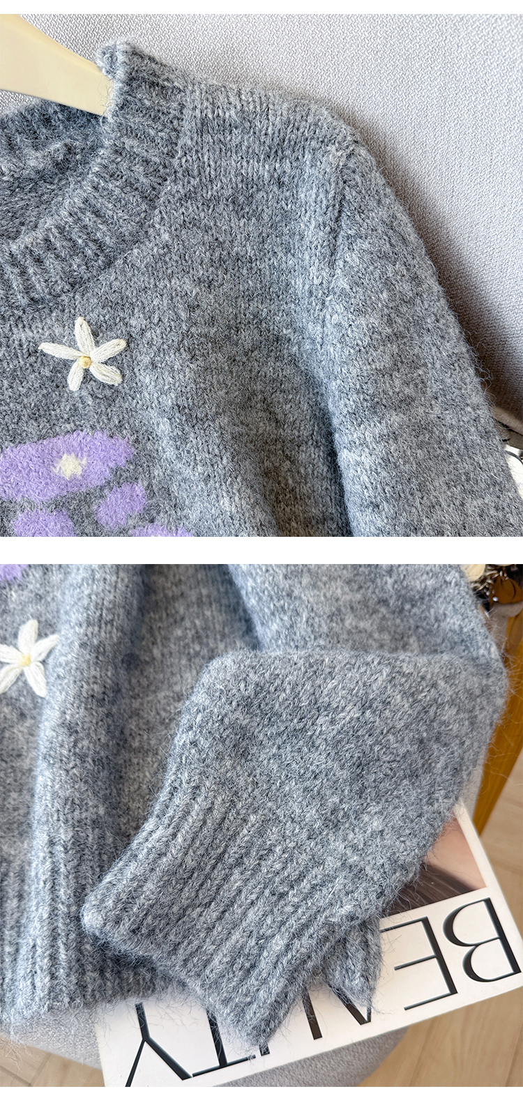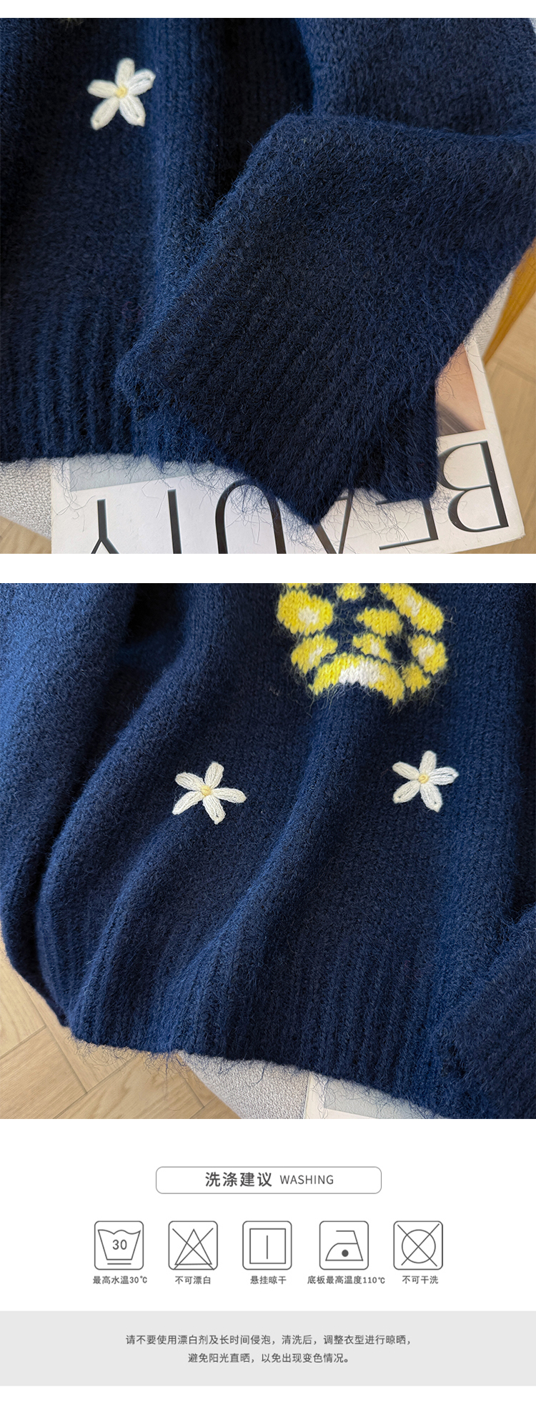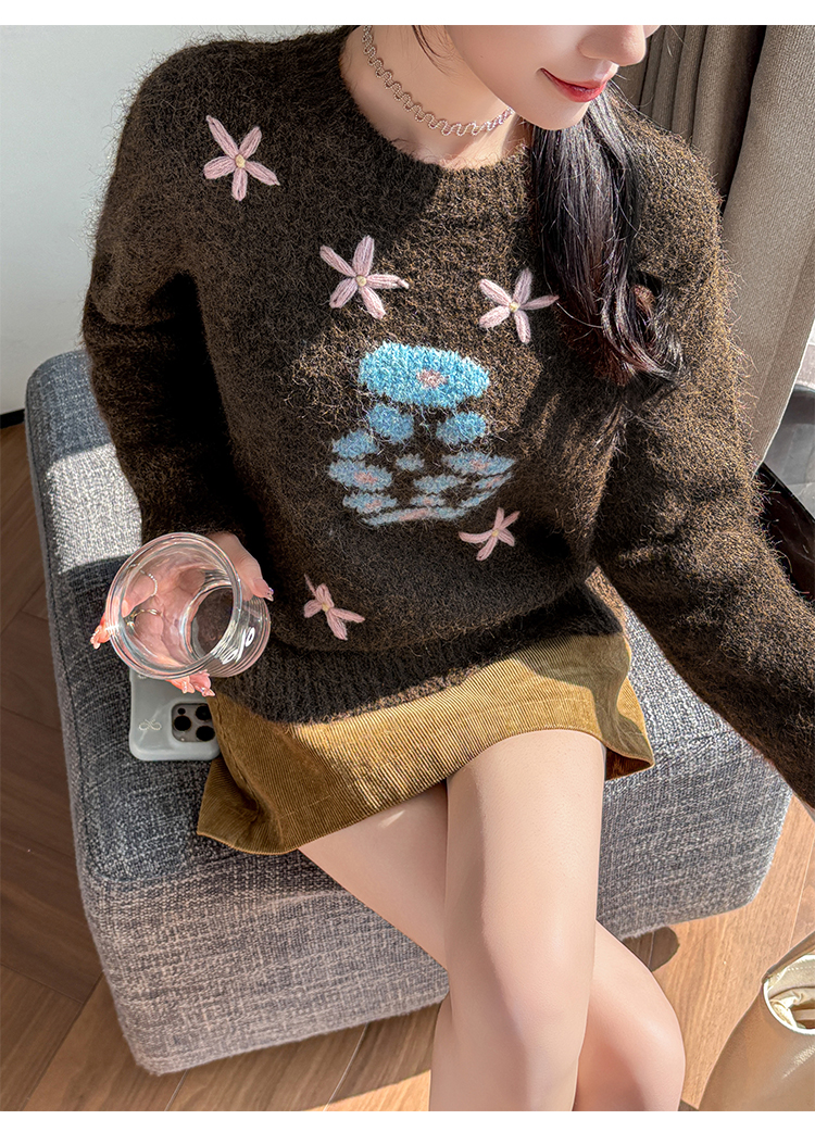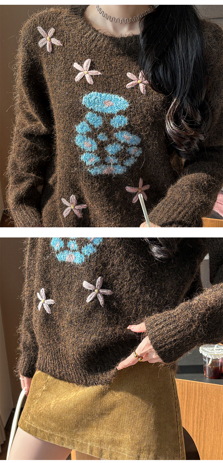 MY14461# 设计感手勾花朵圆领套头打底针织女秋冬提花刺绣毛衣上衣外穿女裝貨源服裝批發