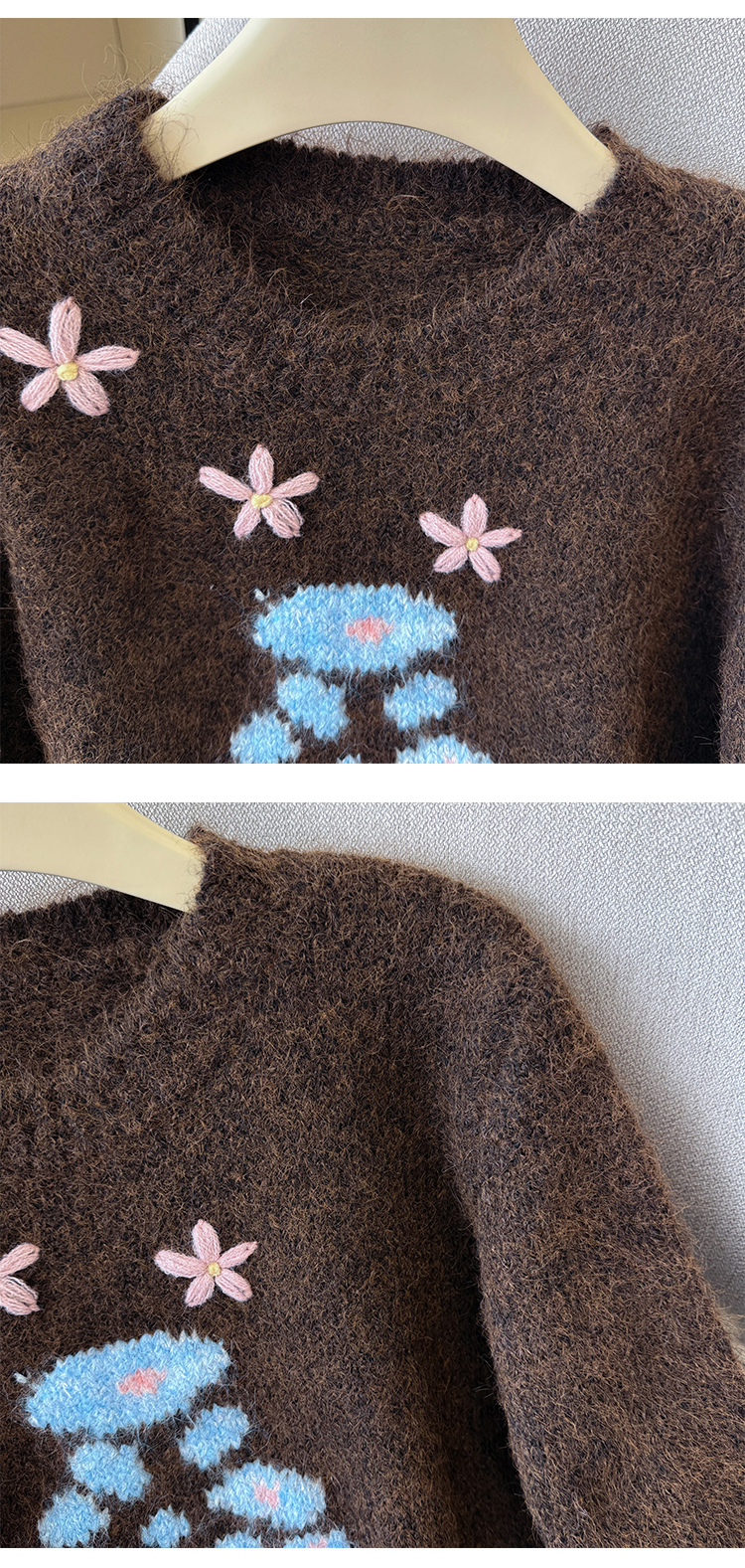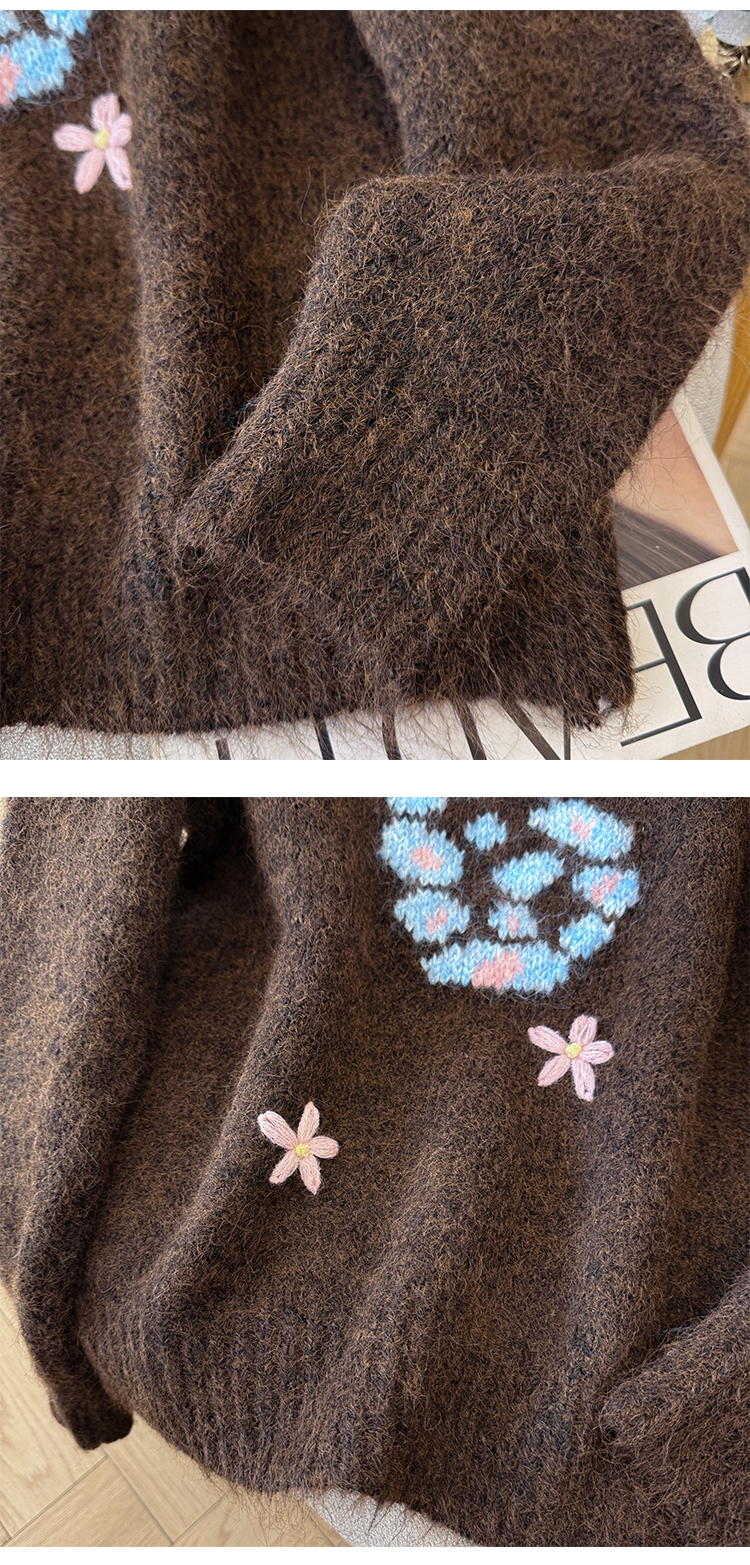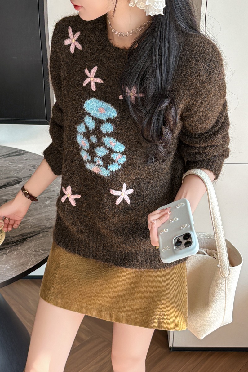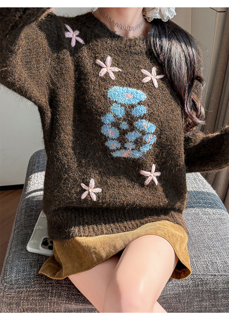 MY14461# 设计感手勾花朵圆领套头打底针织女秋冬提花刺绣毛衣上衣外穿女裝貨源服裝批發