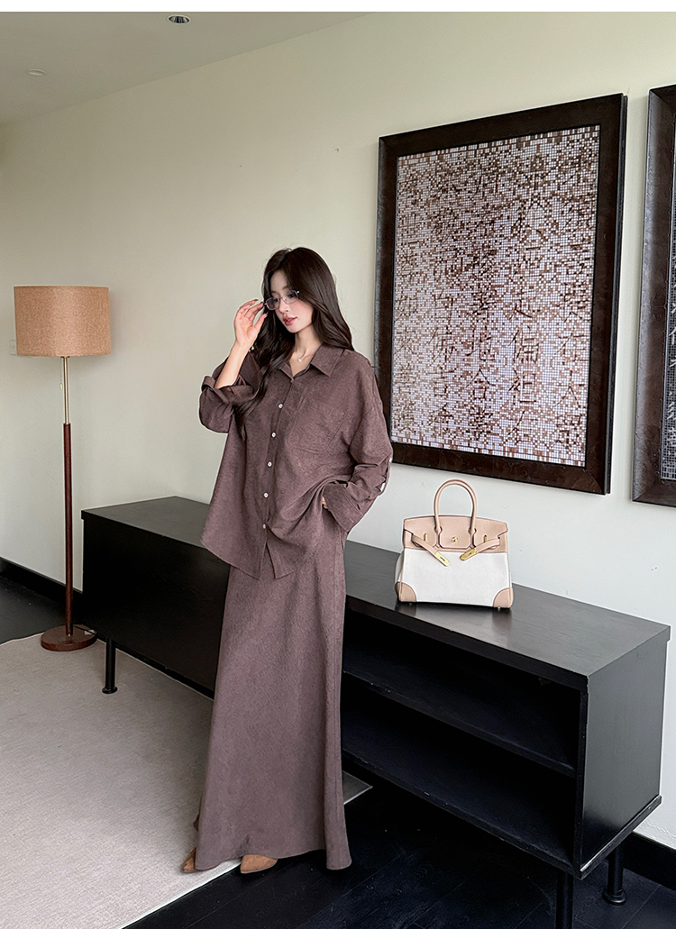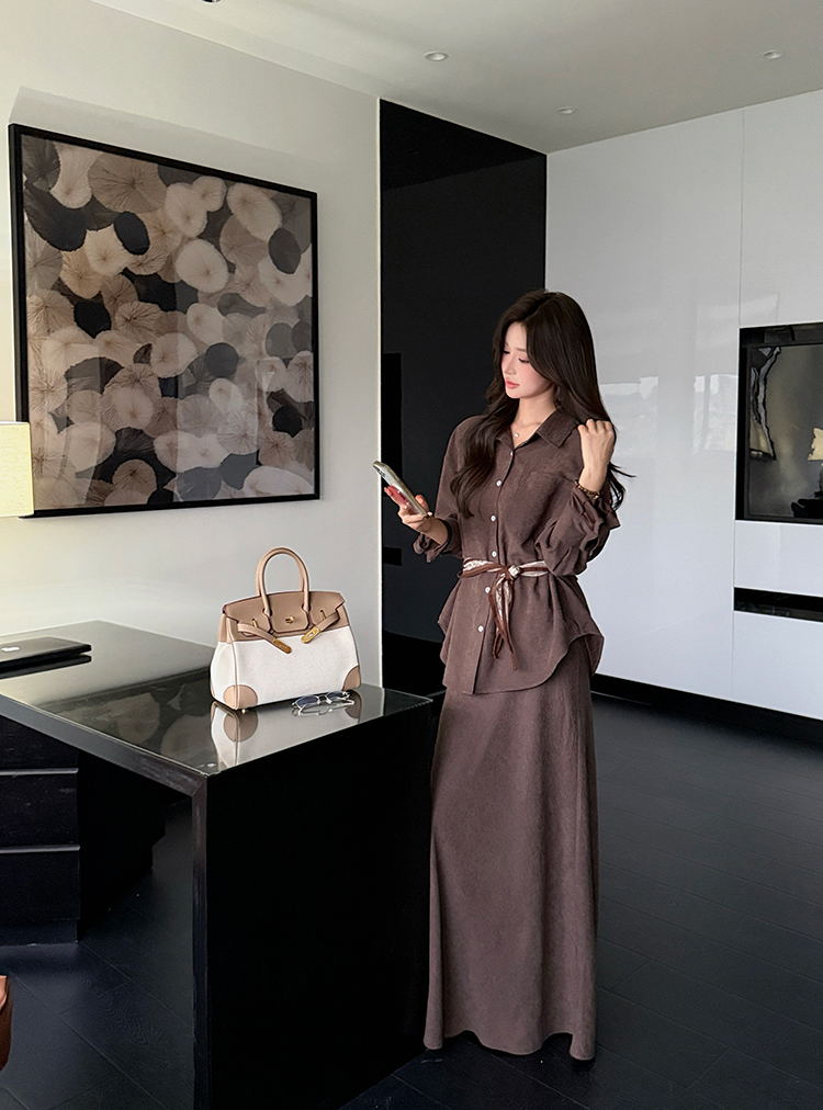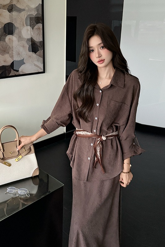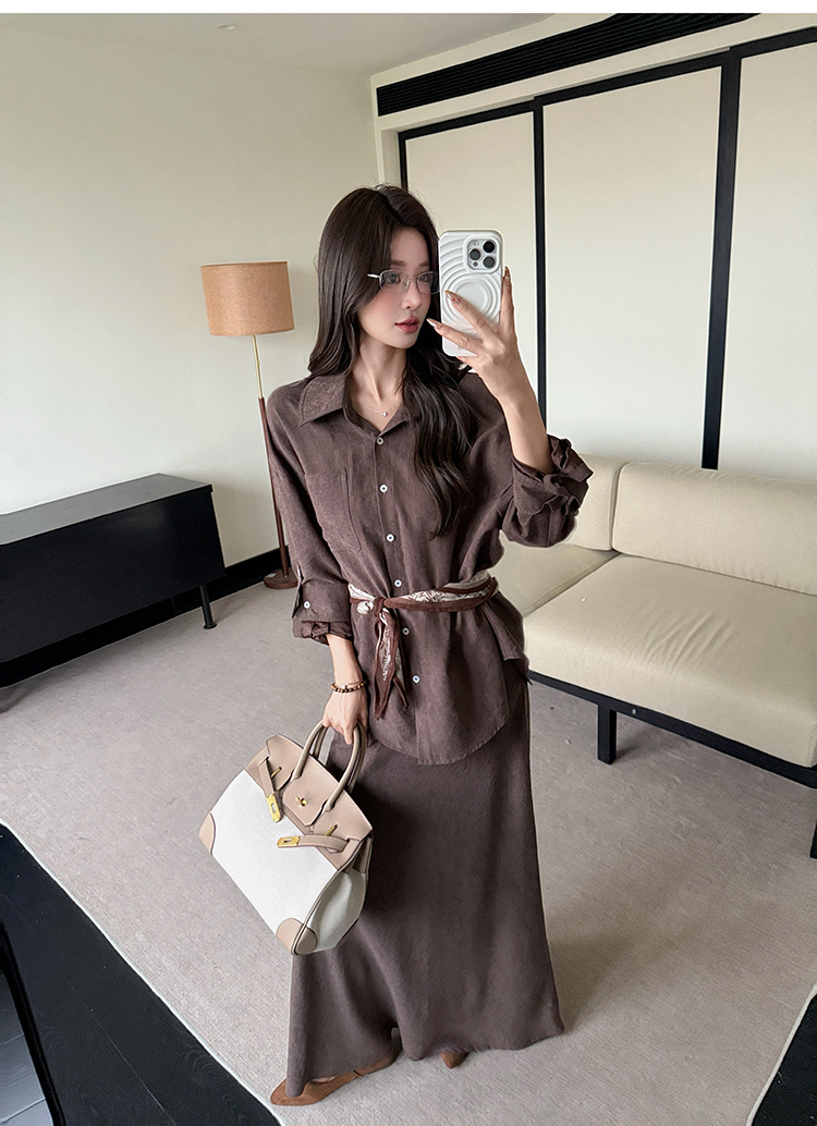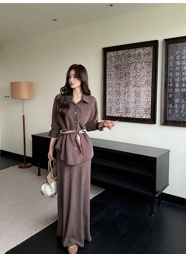 MY14466# 慵懒老钱风 高智感丝巾宽松衬衣百搭半身A字裙三件套装 送丝巾女裝貨源服裝批發
