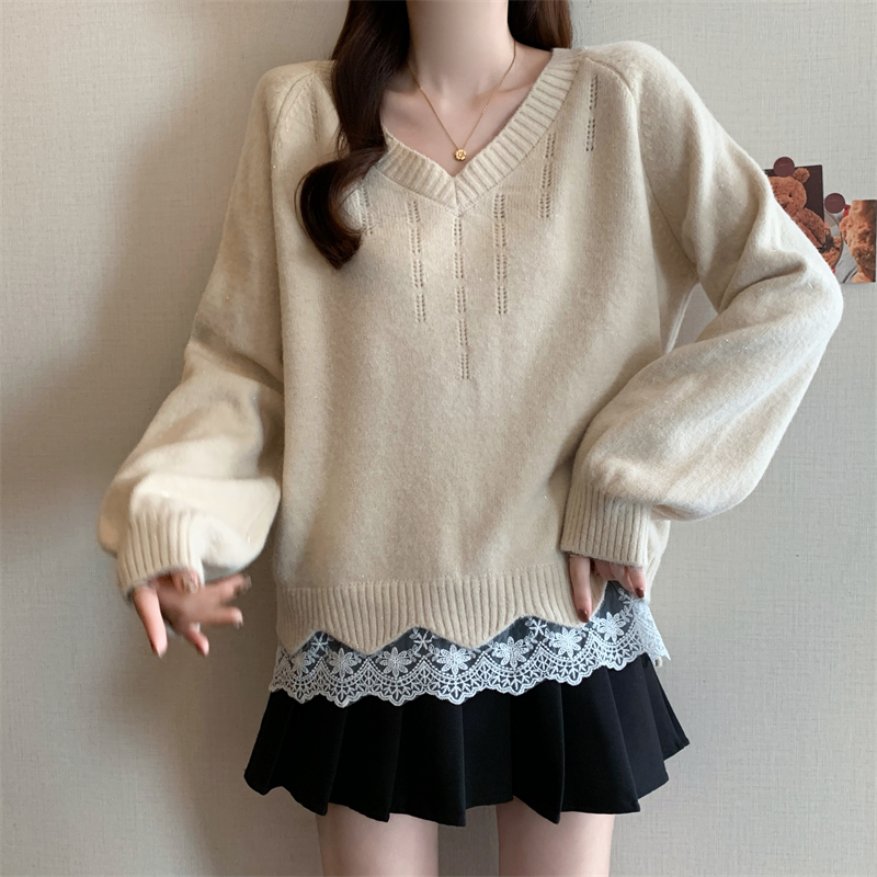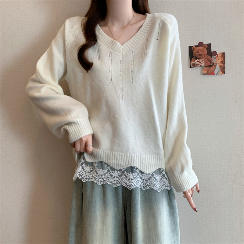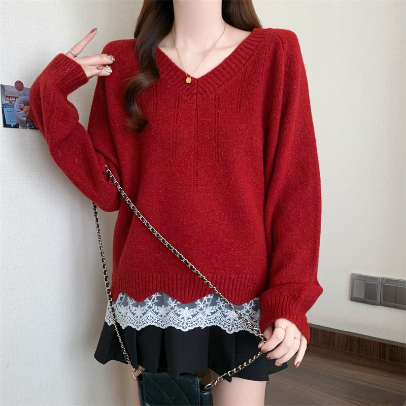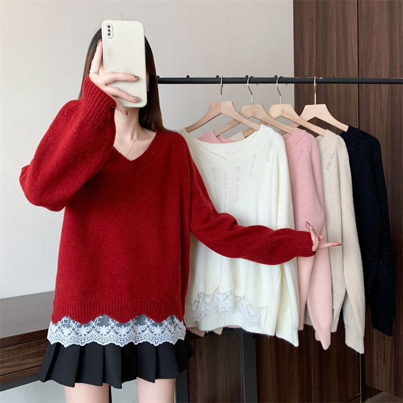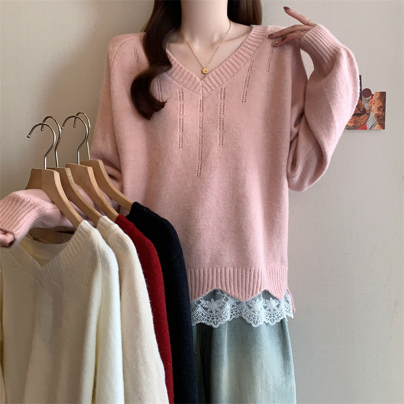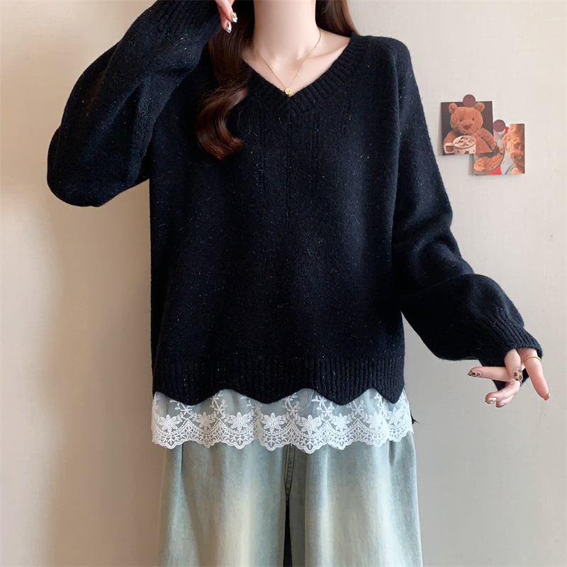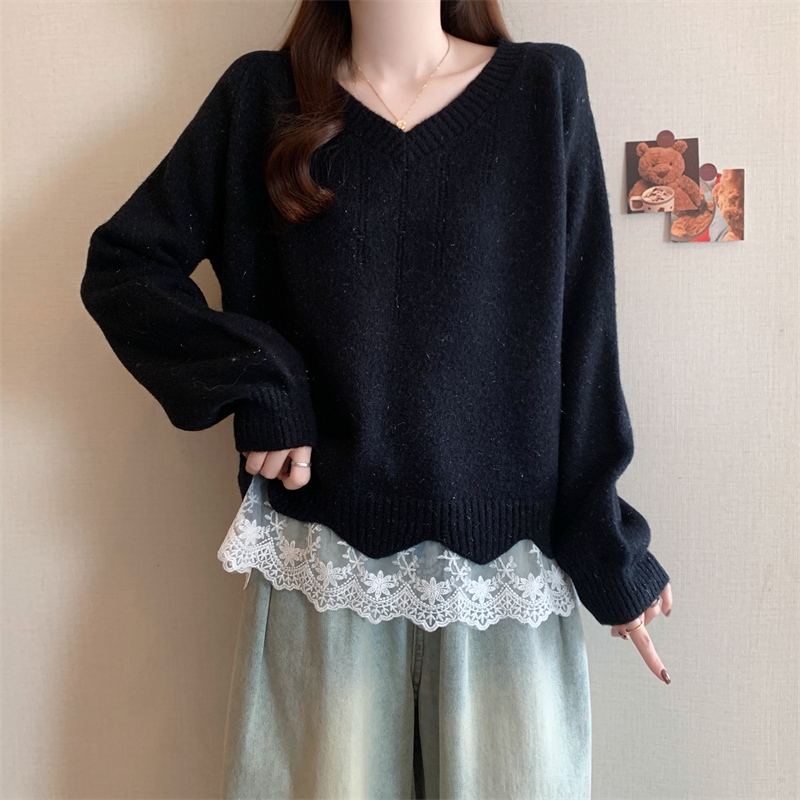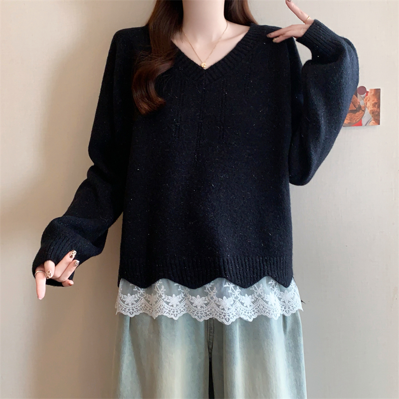 MY14470# 大码女装蕾丝拼接V领毛衣新款宽松胖mm软糥洋气上衣女裝貨源服裝批發