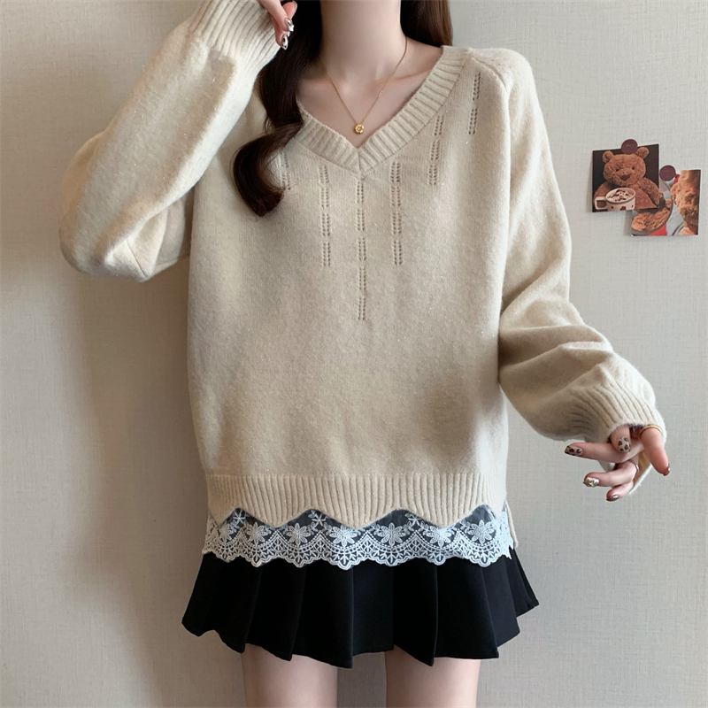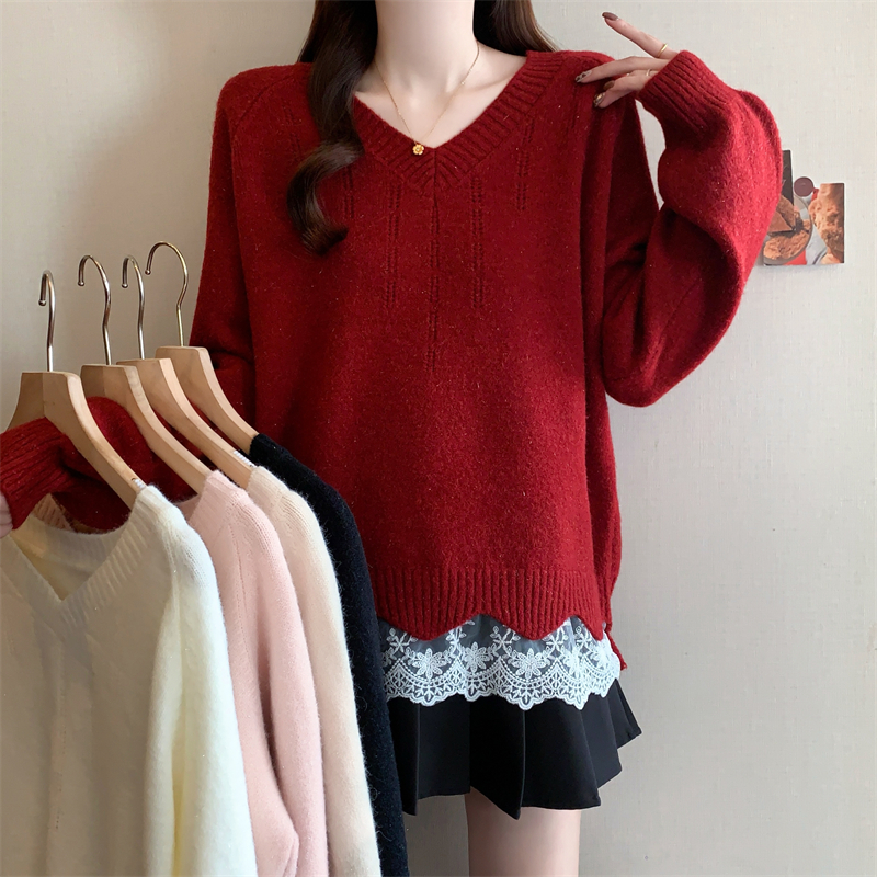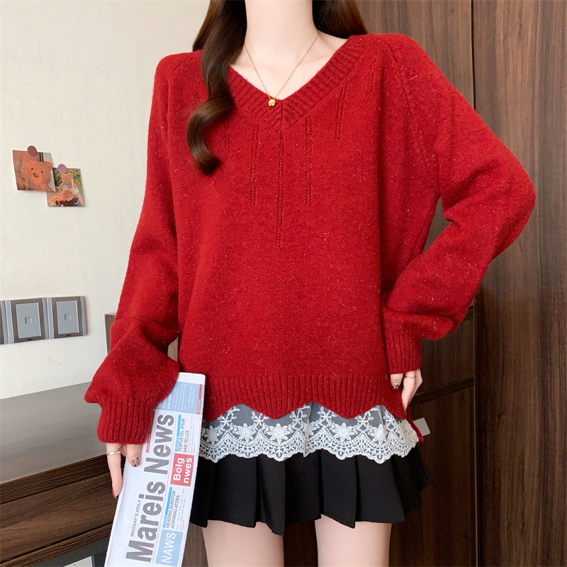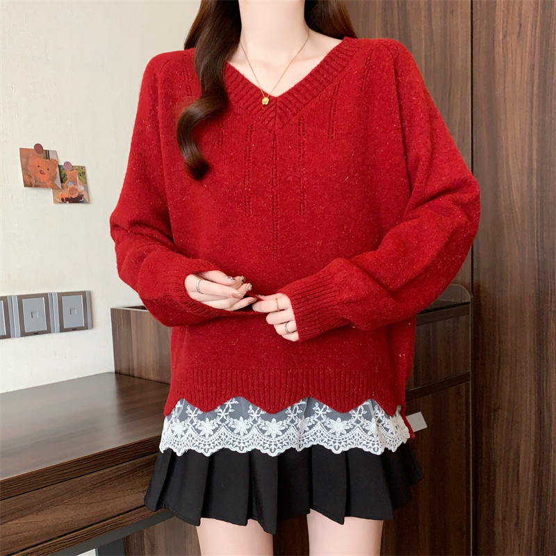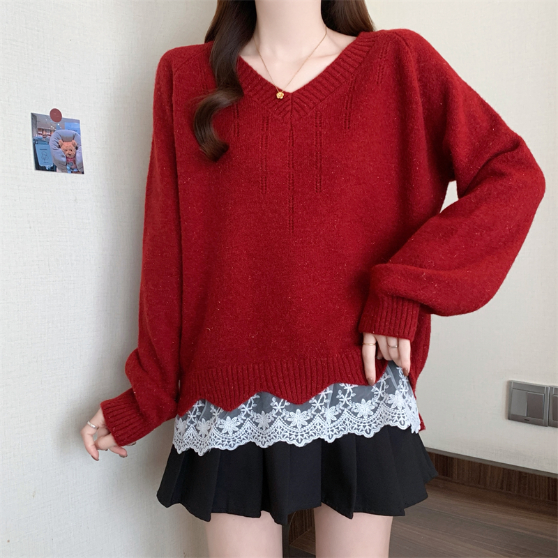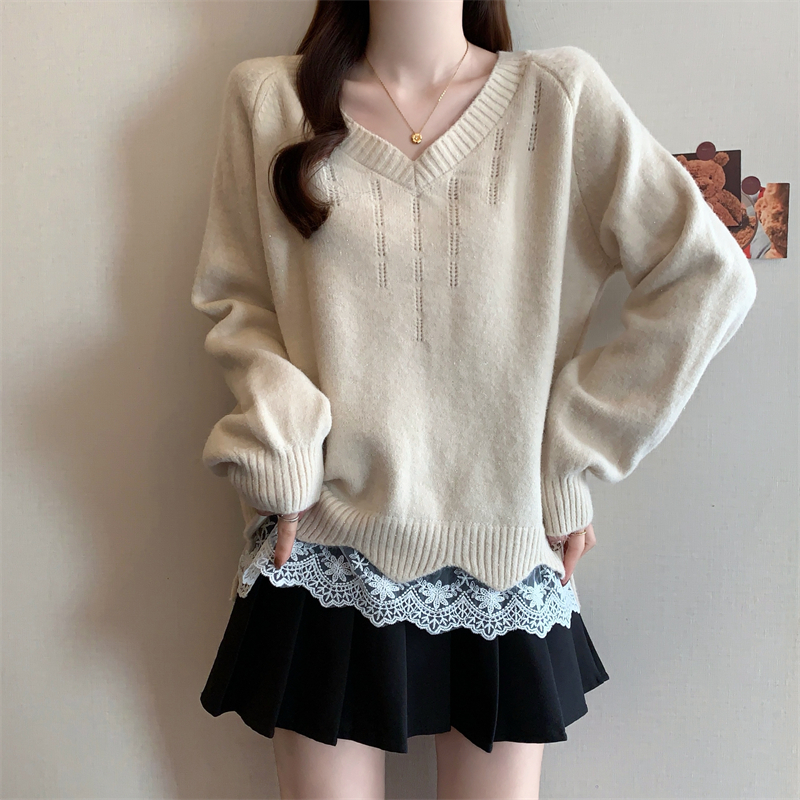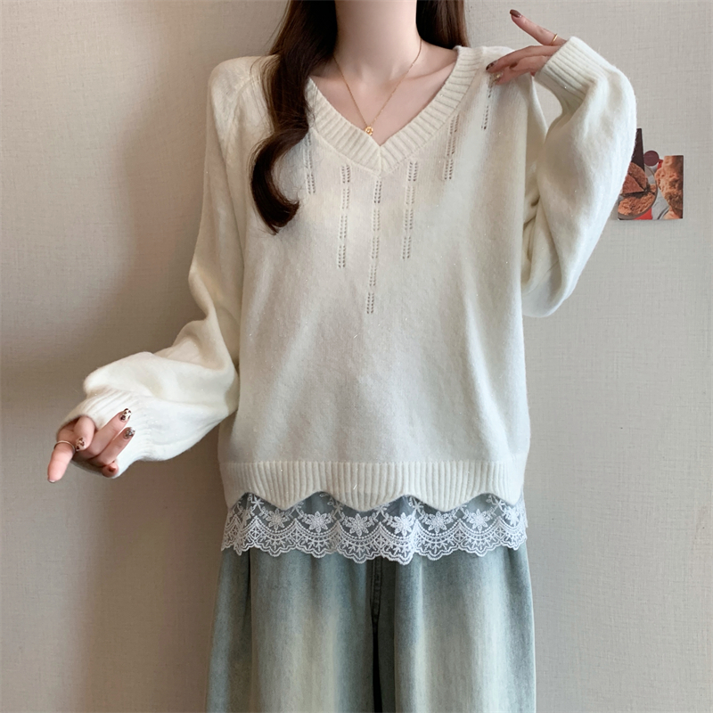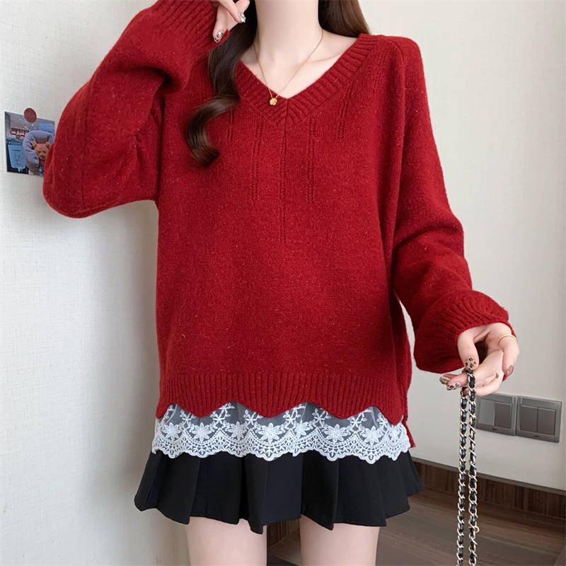 MY14470# 大码女装蕾丝拼接V领毛衣新款宽松胖mm软糥洋气上衣女裝貨源服裝批發