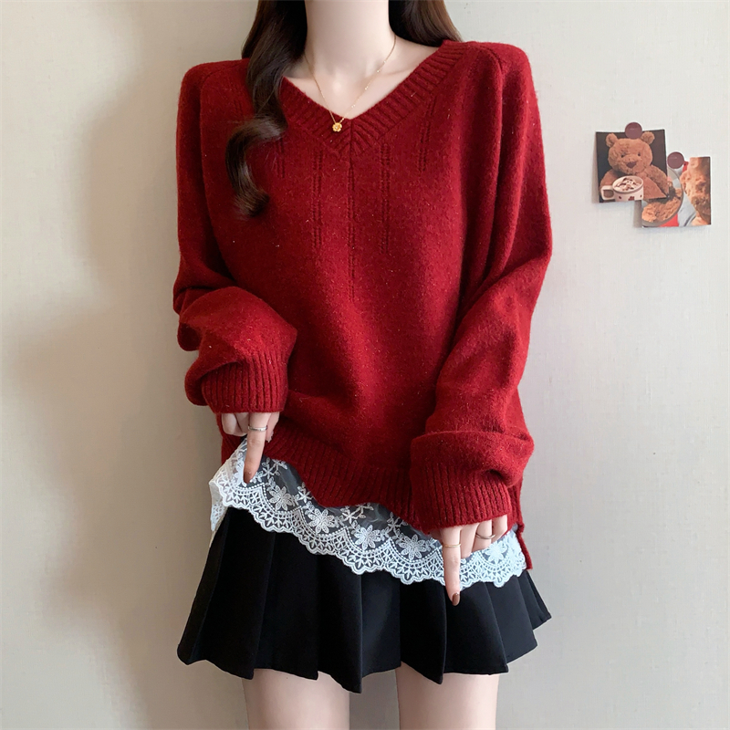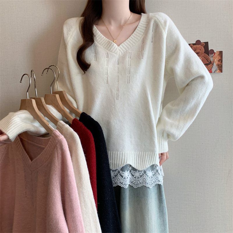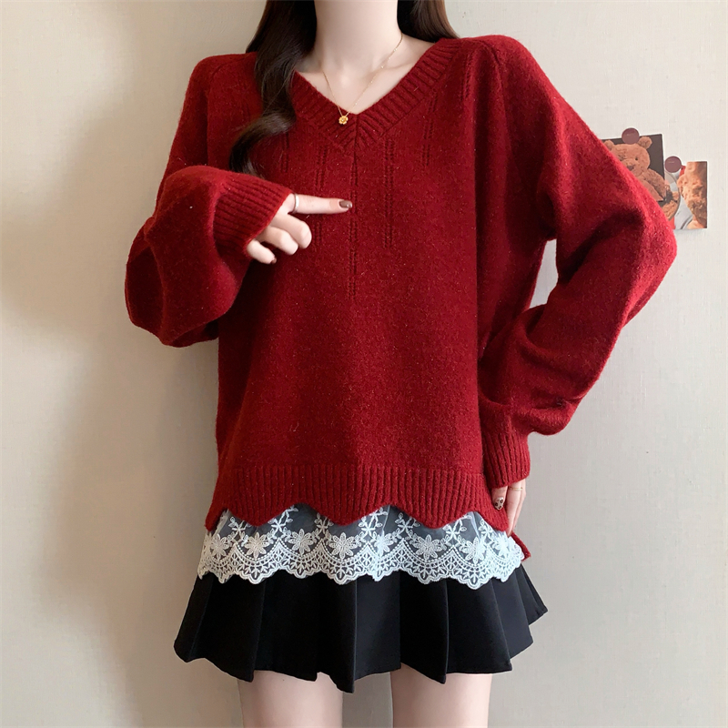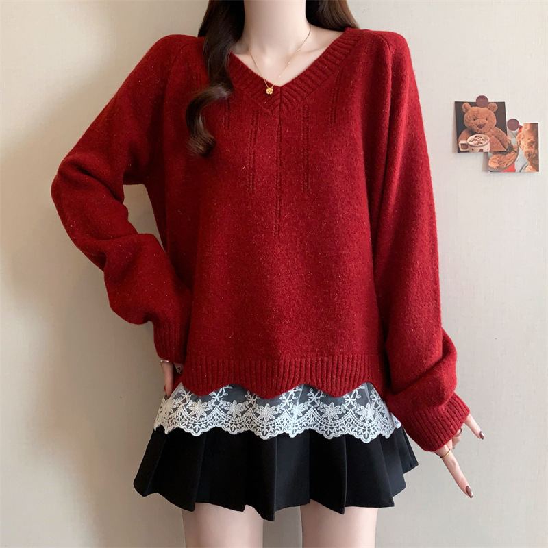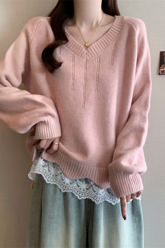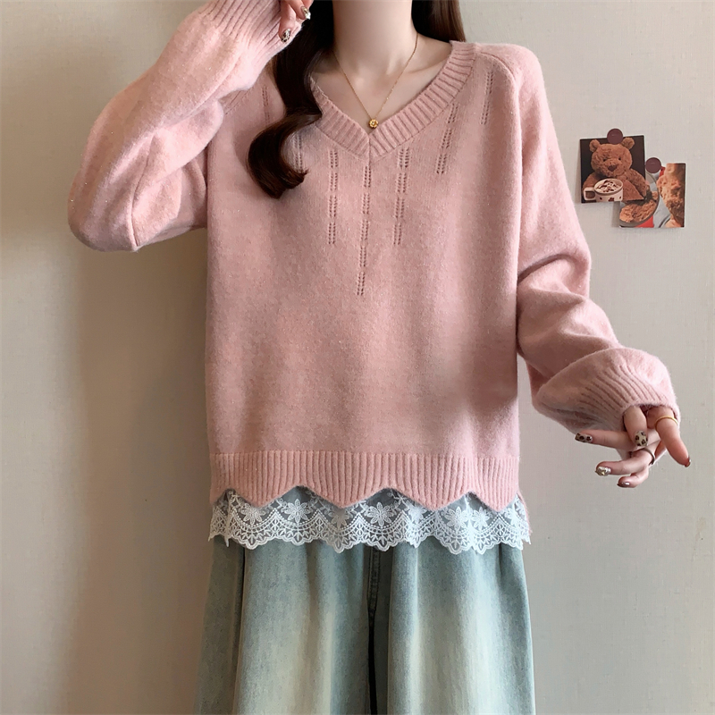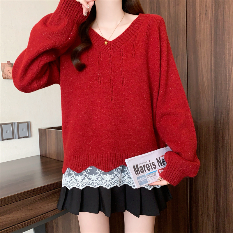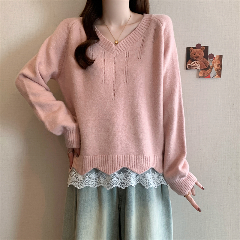 MY14470# 大码女装蕾丝拼接V领毛衣新款宽松胖mm软糥洋气上衣女裝貨源服裝批發