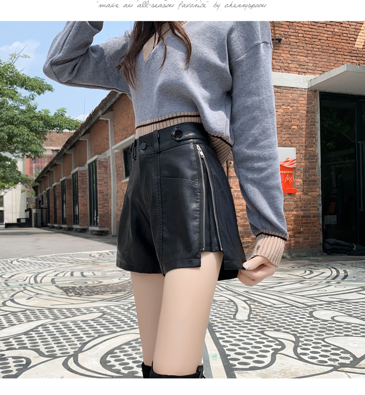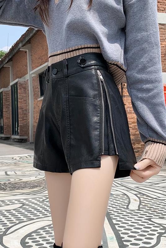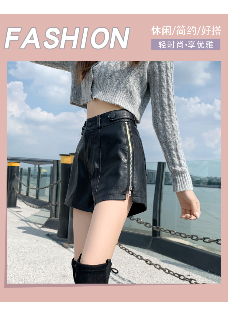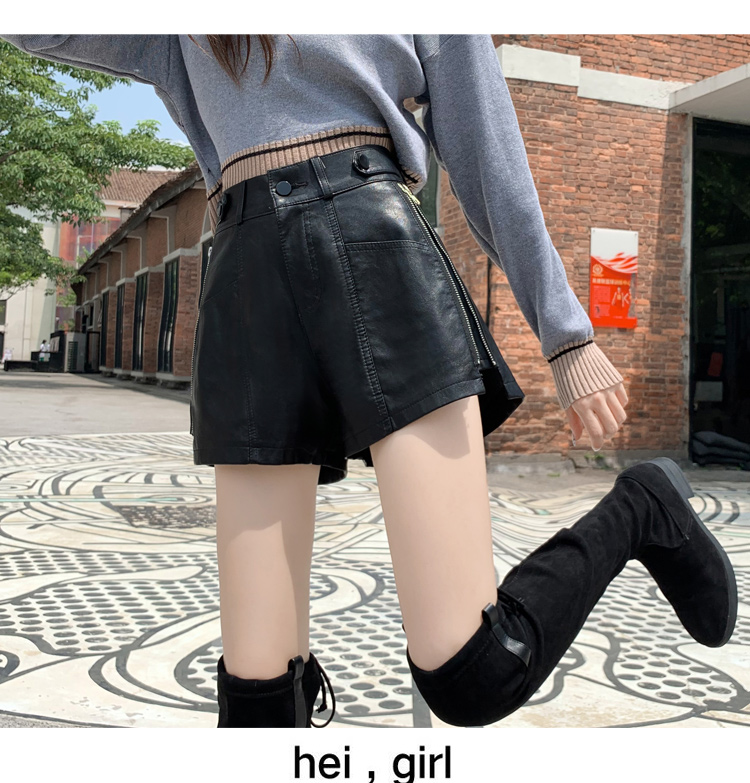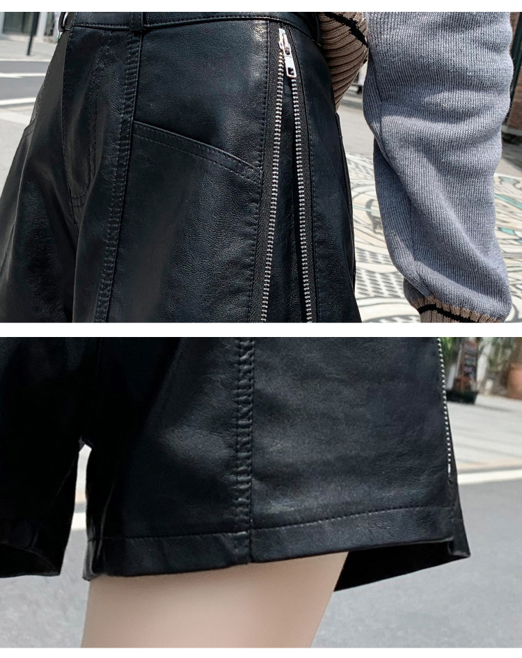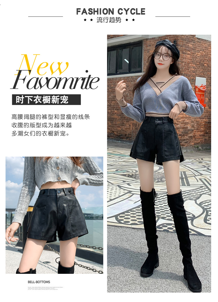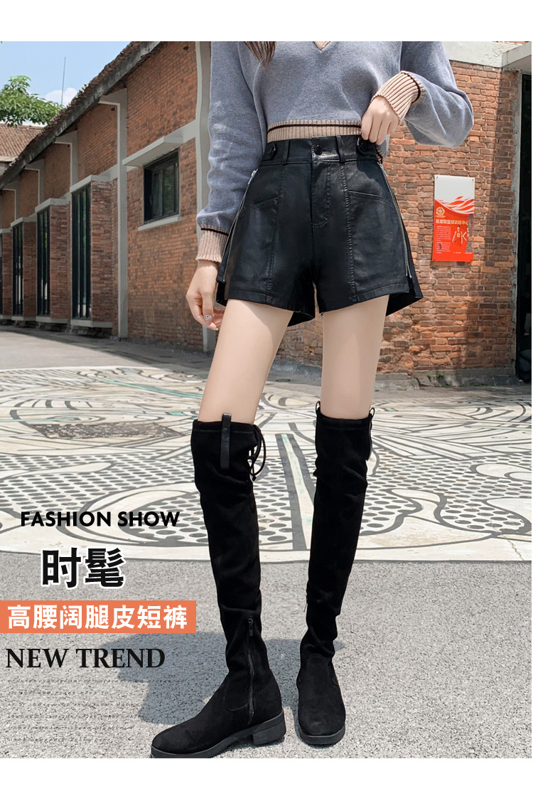 MY14473# 皮裤高腰短裤侧边拉链黑色阔腿裤显瘦休闲外穿靴裤女裝貨源服裝批發
