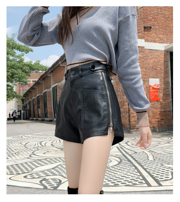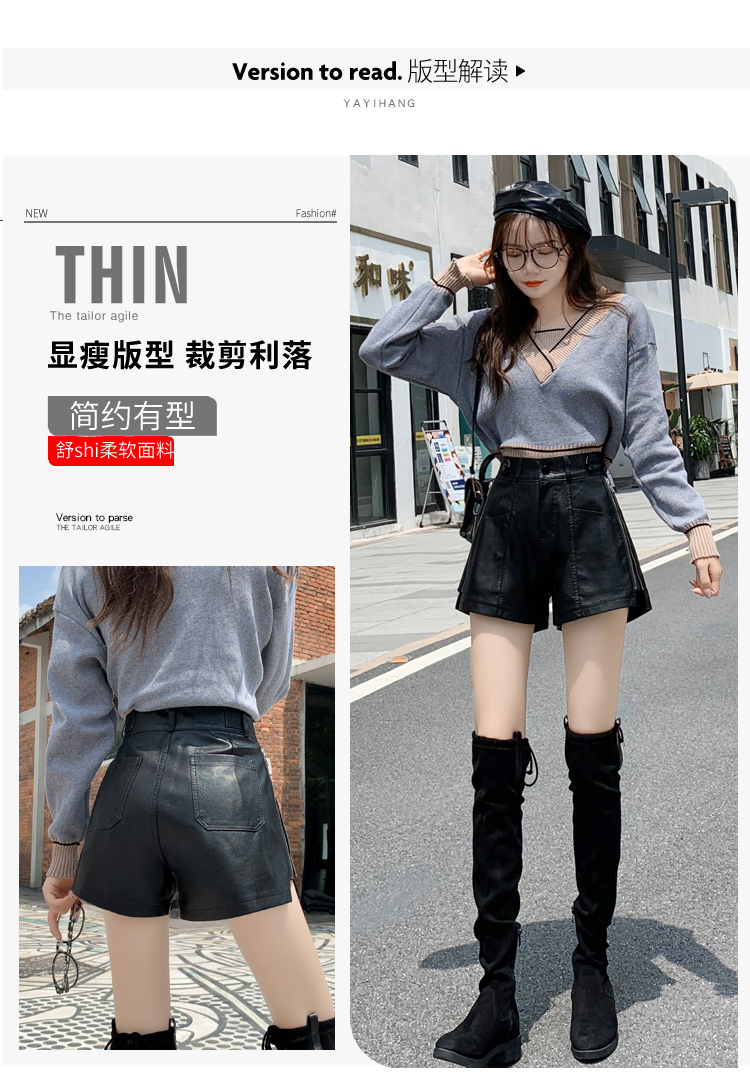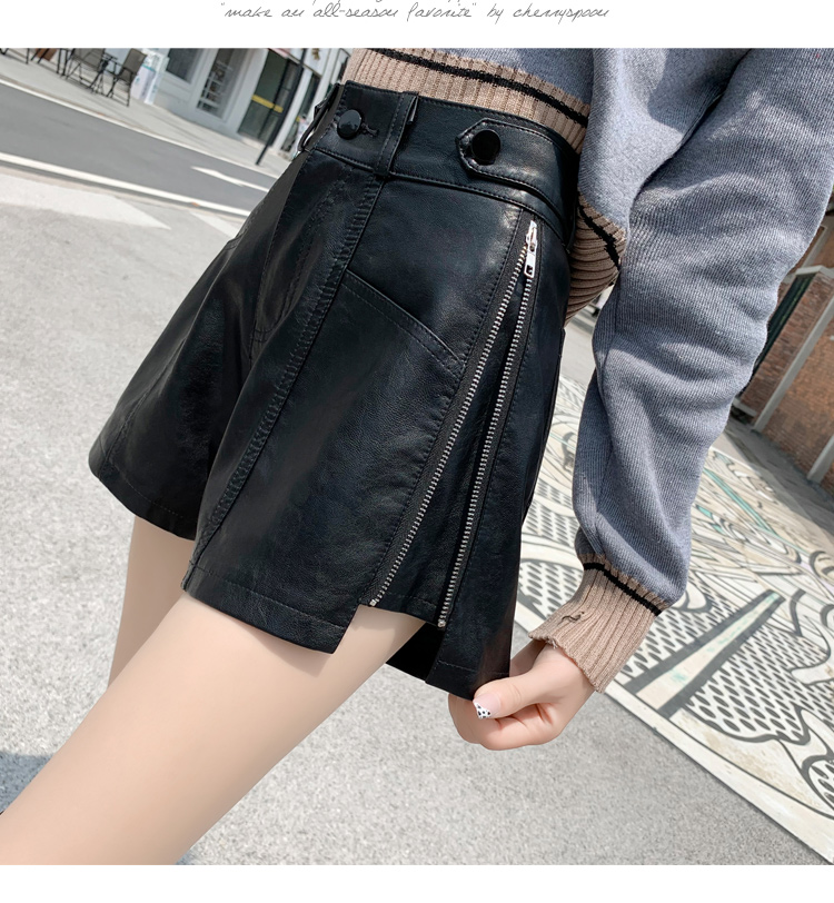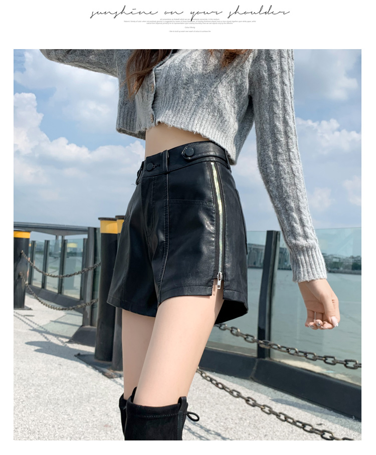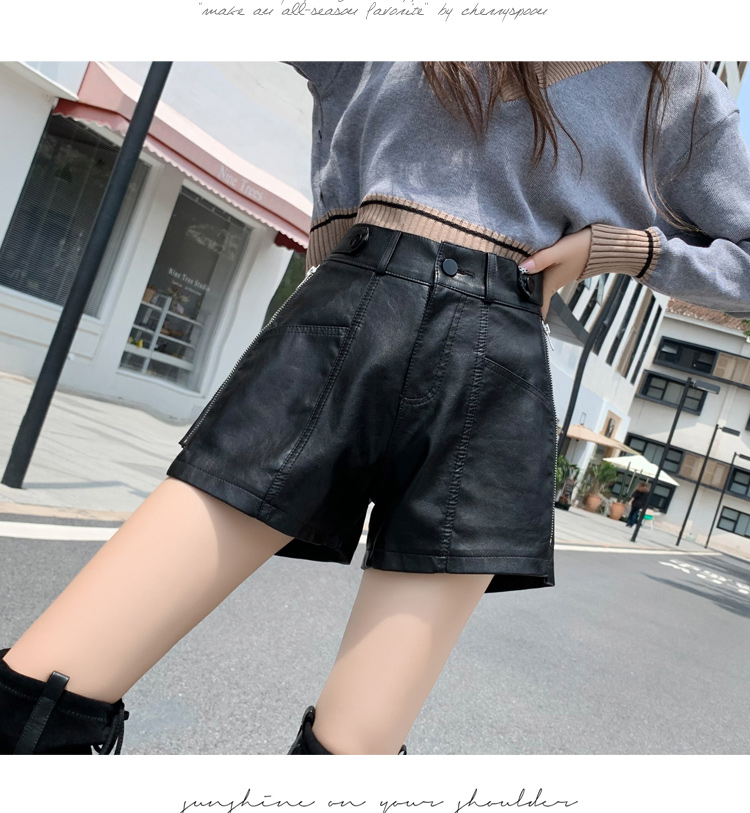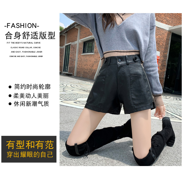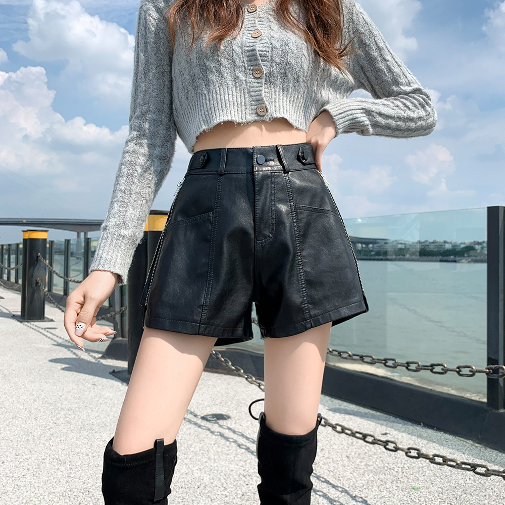 MY14473# 皮裤高腰短裤侧边拉链黑色阔腿裤显瘦休闲外穿靴裤女裝貨源服裝批發