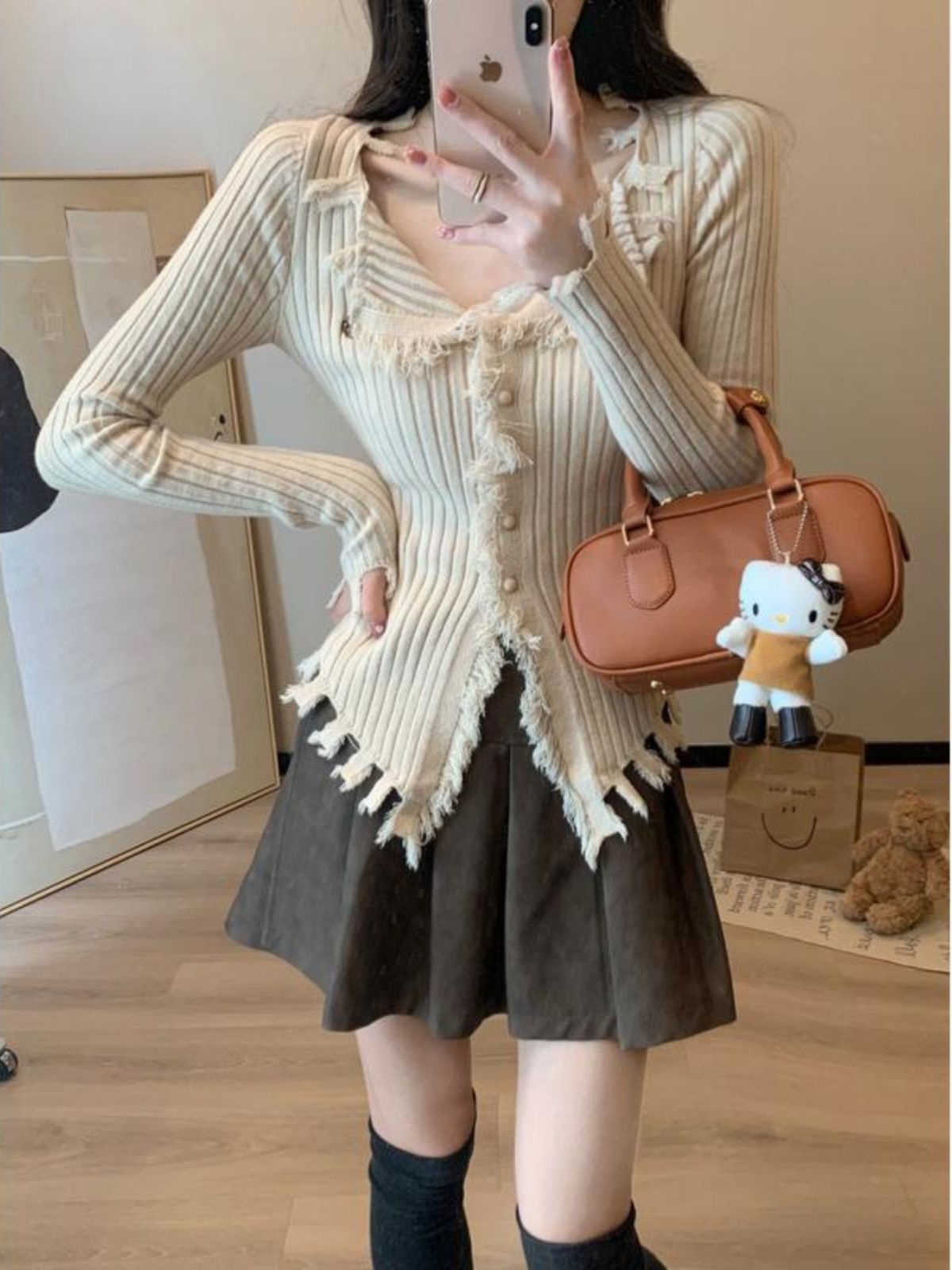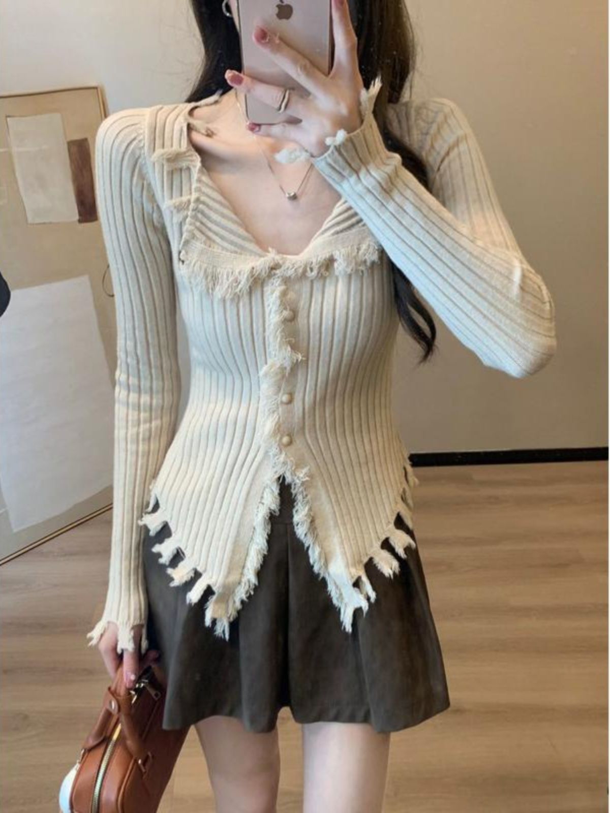 MY14503# 流苏V领毛边针织开衫女装辣妹修身显瘦上衣女裝貨源服裝批發