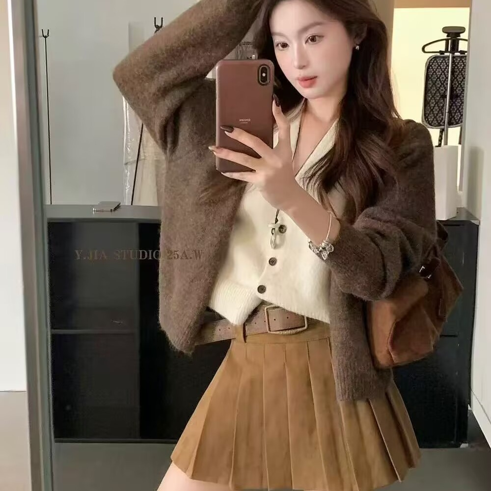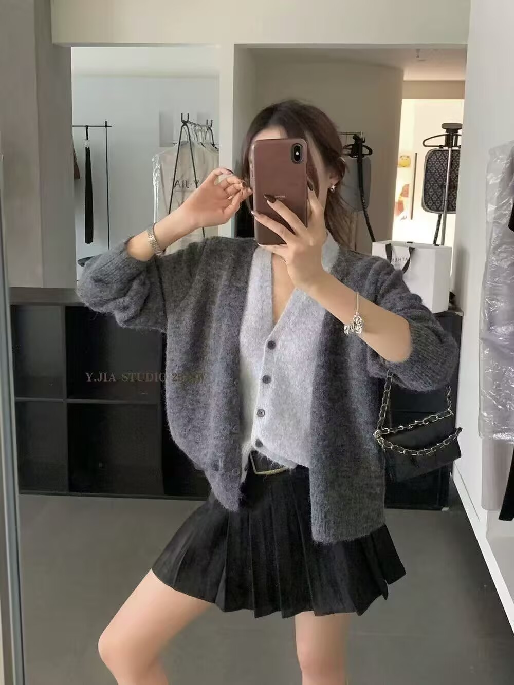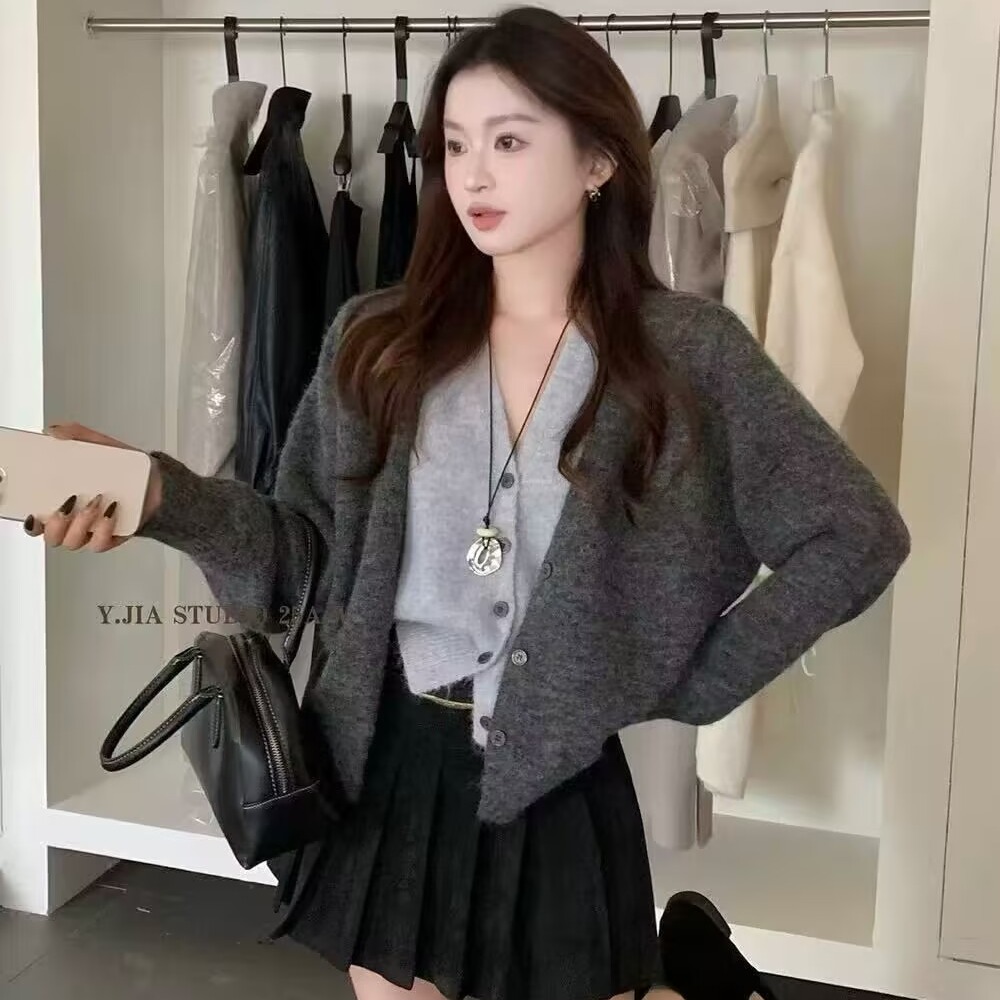 MY14519# 韩版假两件撞色毛衣开衫新款松弛感慵懒风宽松百搭针织上衣女裝貨源服裝批發