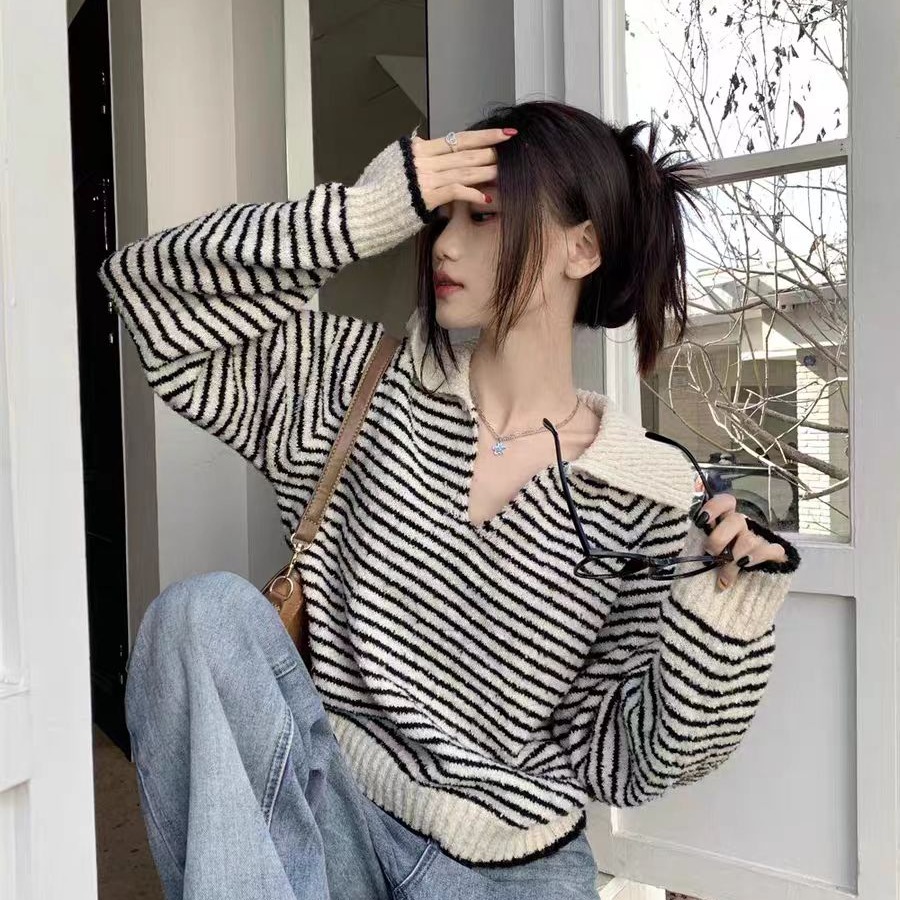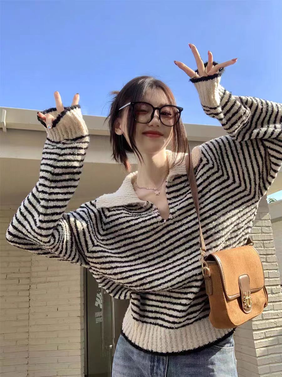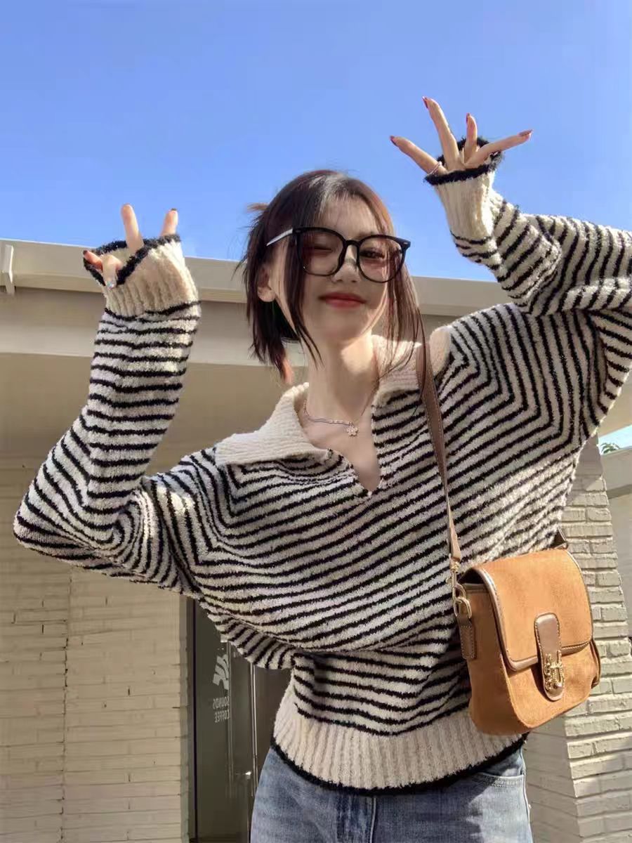 MY14520# 高级感超好看v领毛衣女秋冬宽松显瘦气质polo领条纹显瘦针织衫ins女裝貨源服裝批發