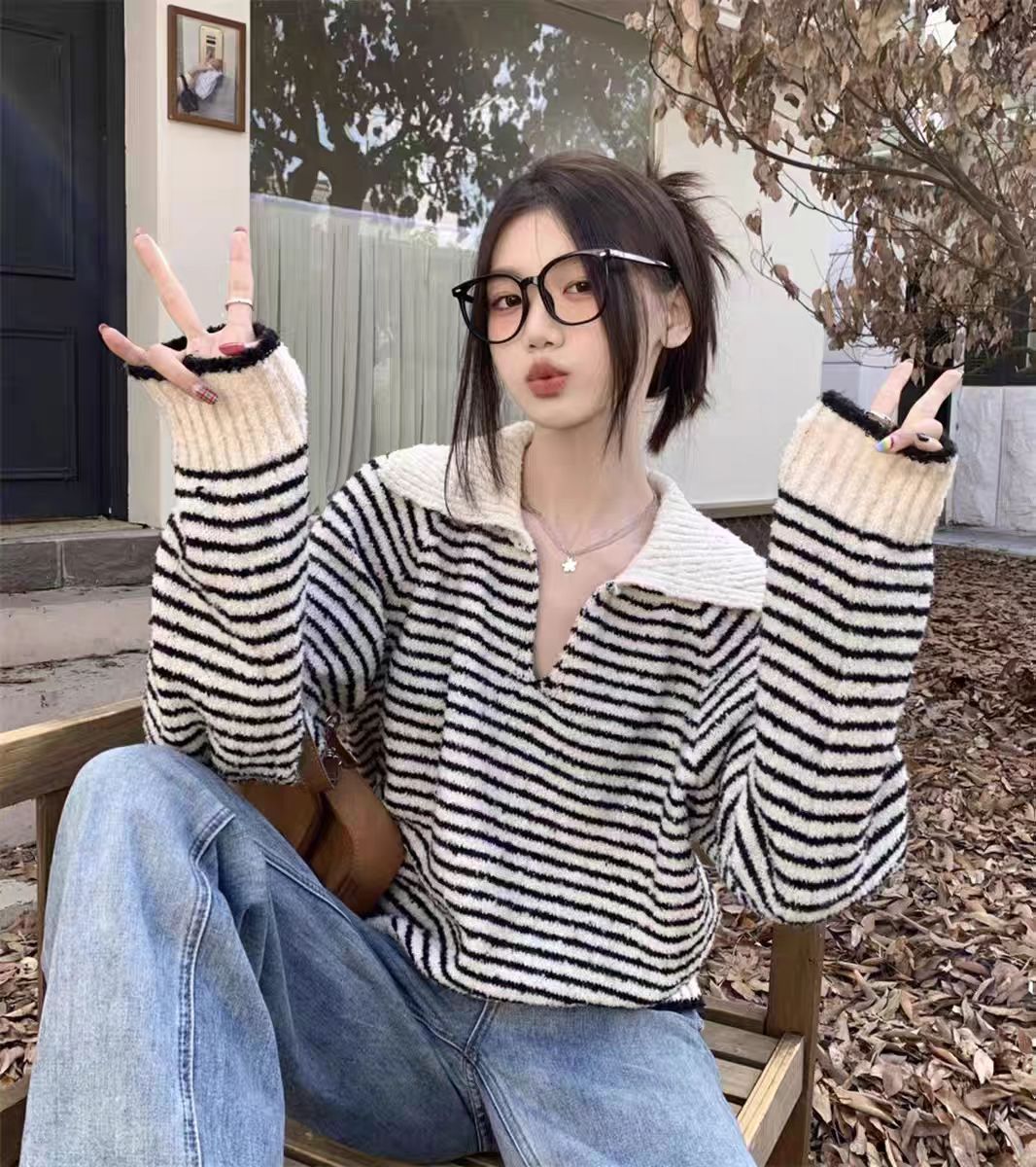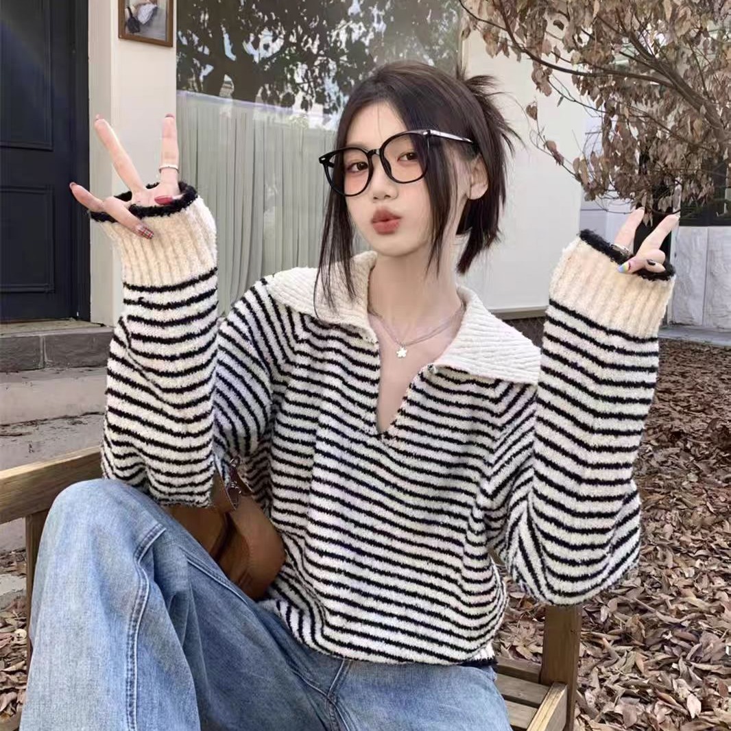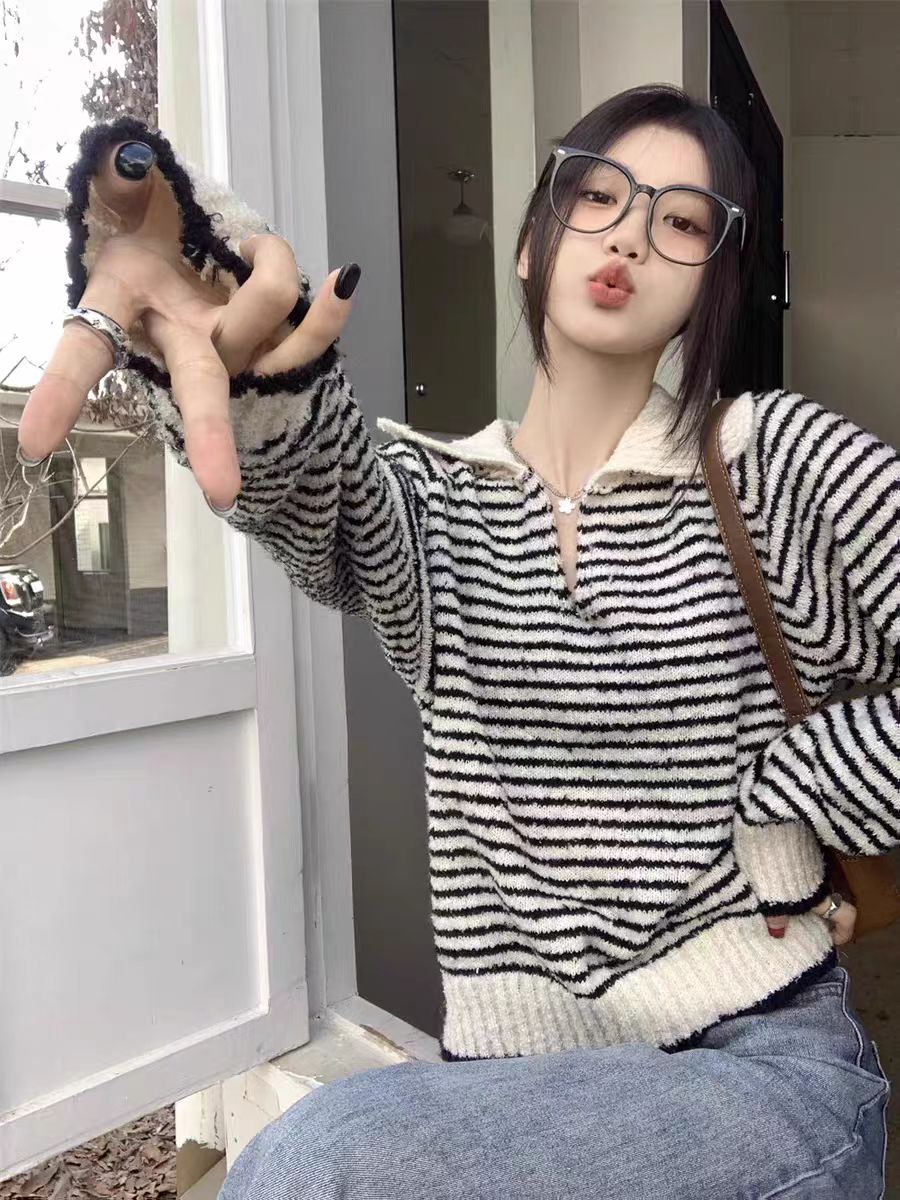 MY14520# 高级感超好看v领毛衣女秋冬宽松显瘦气质polo领条纹显瘦针织衫ins女裝貨源服裝批發