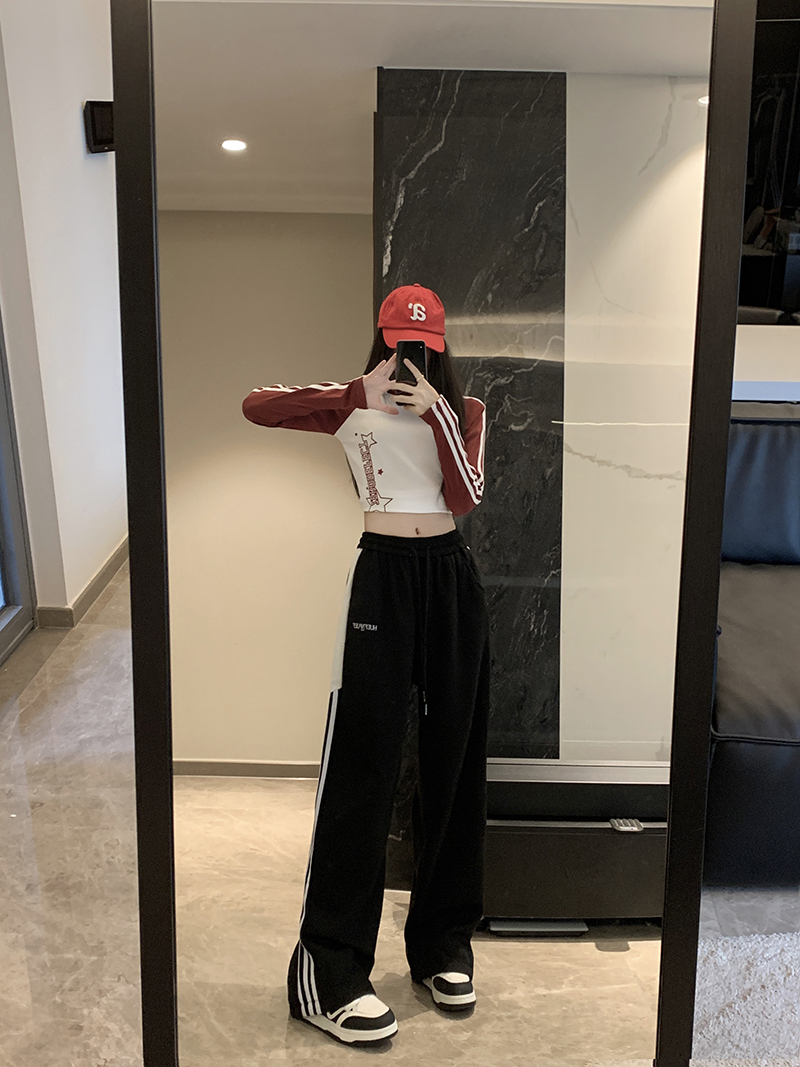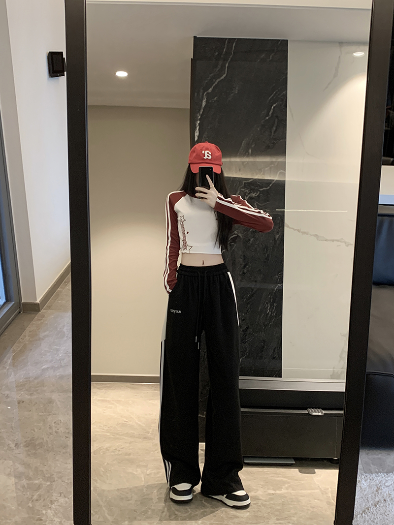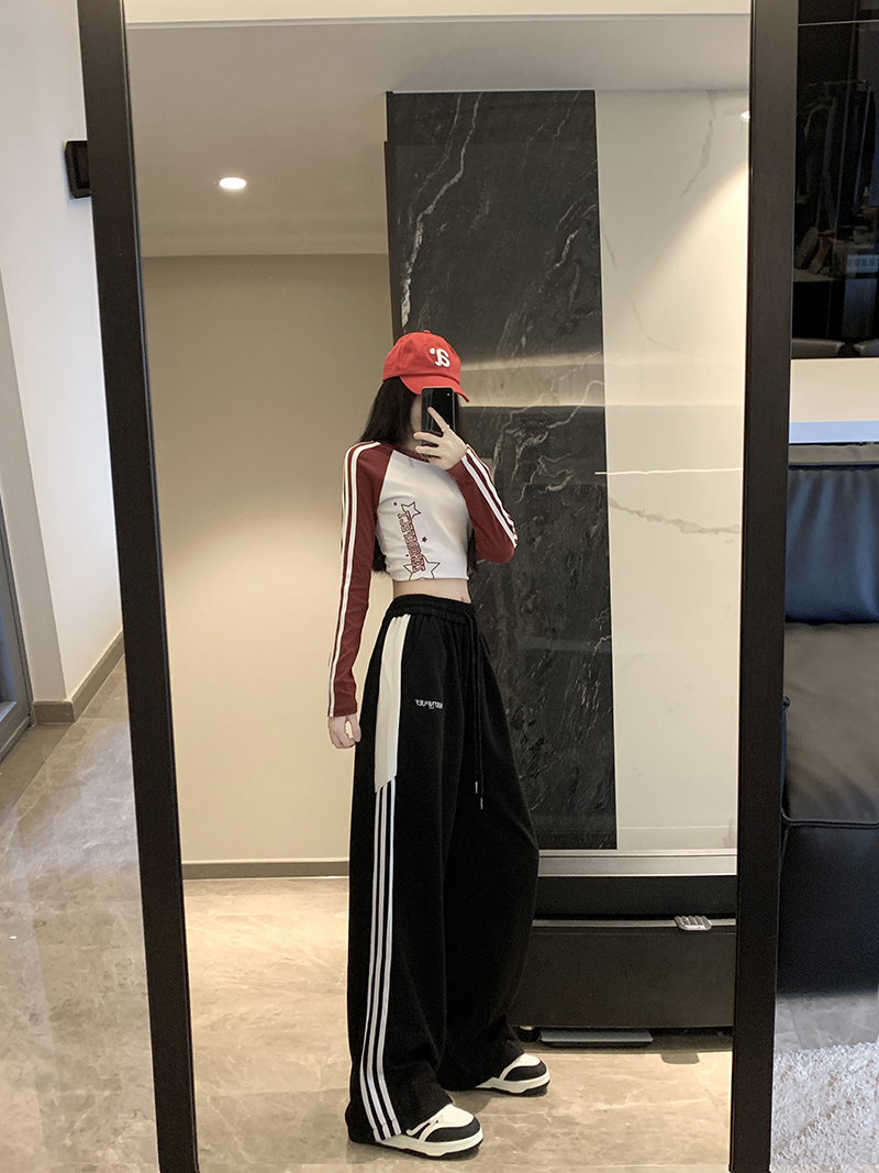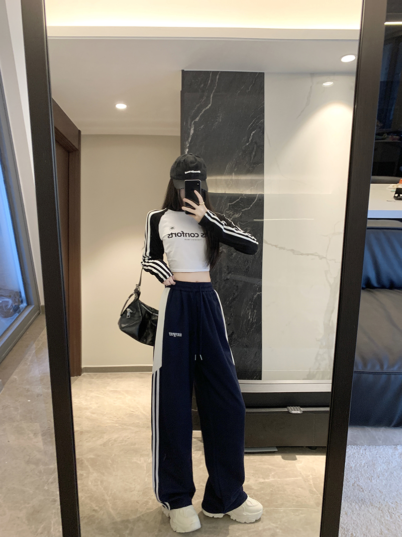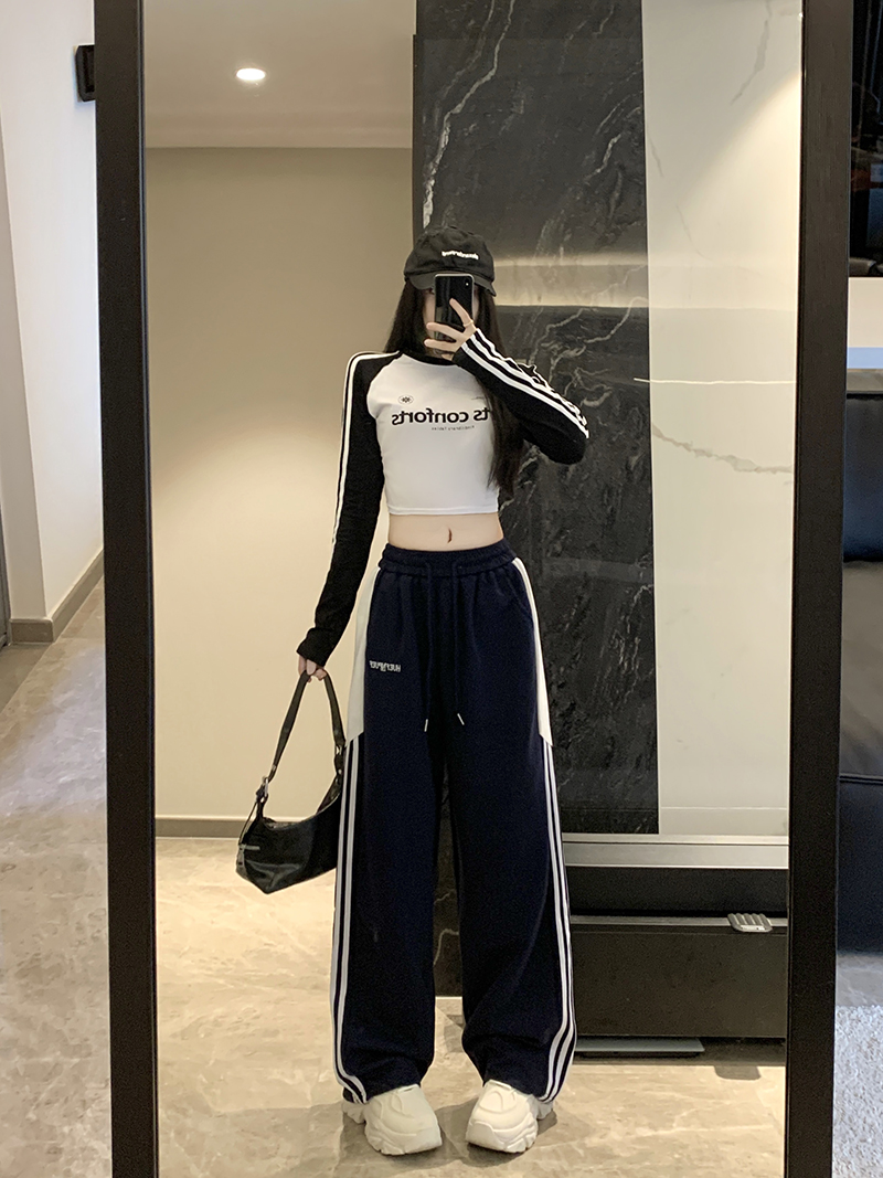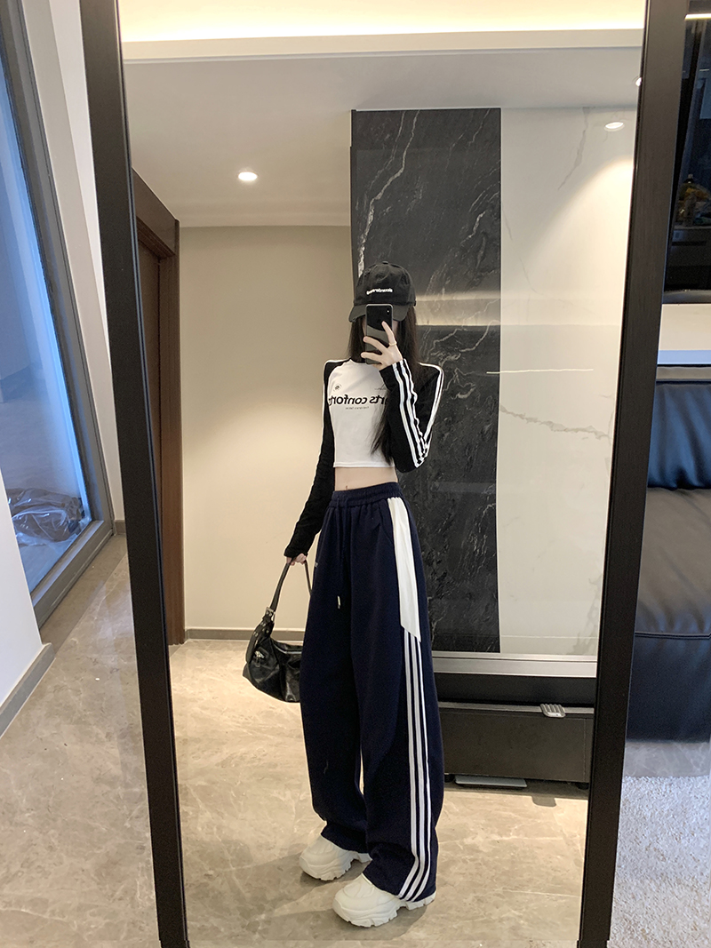 MY14604# 常规/加绒 美式休闲裤女秋季侧边三条杠条纹阔腿长裤女裝貨源服裝批發