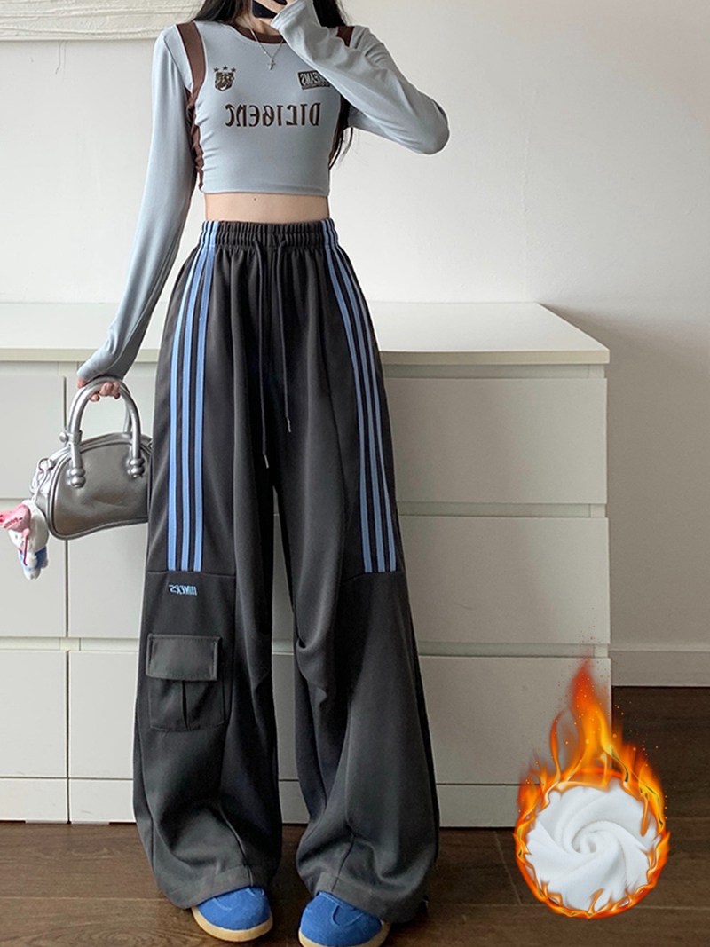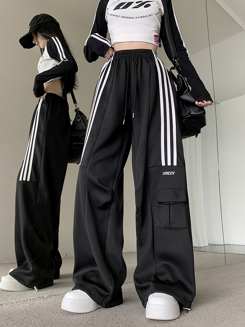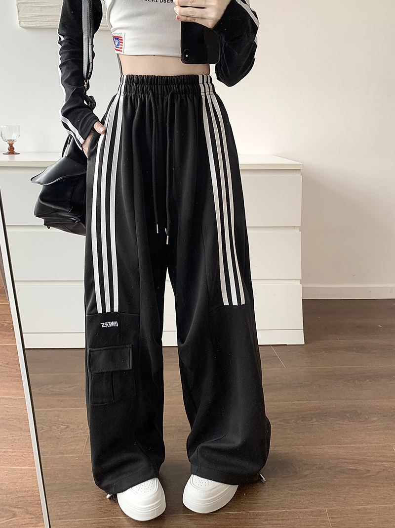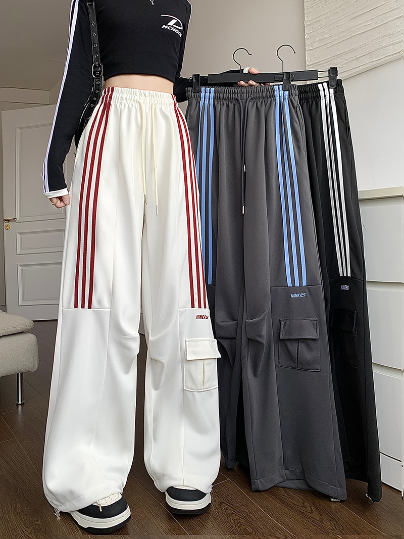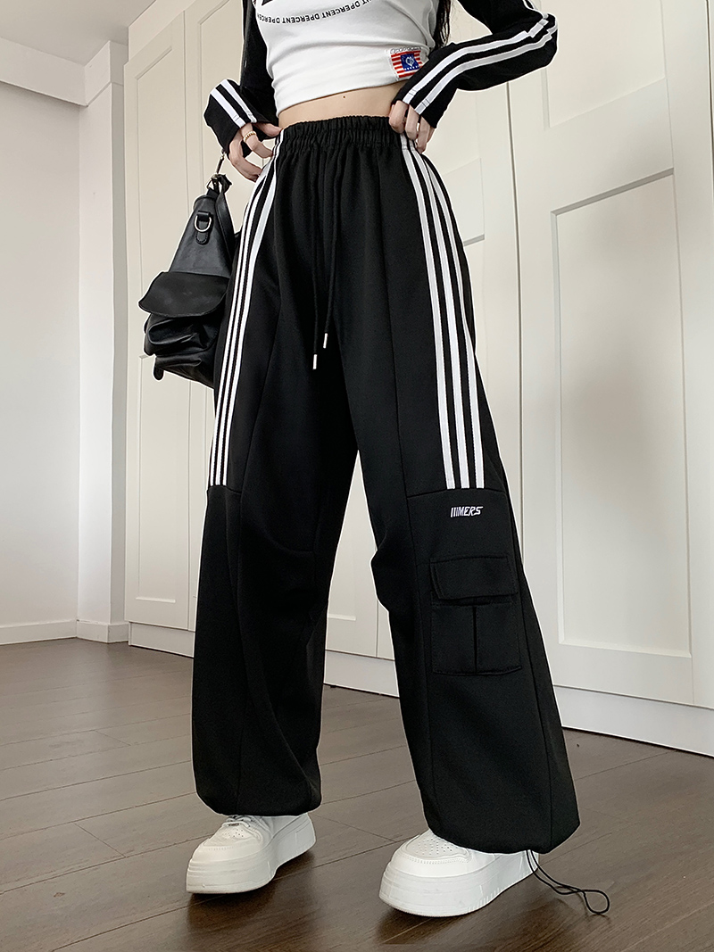 MY14605# 增色 常规/加绒 高街杠条工装裤女休闲运动卫裤宽松阔腿裤子女裝貨源服裝批發