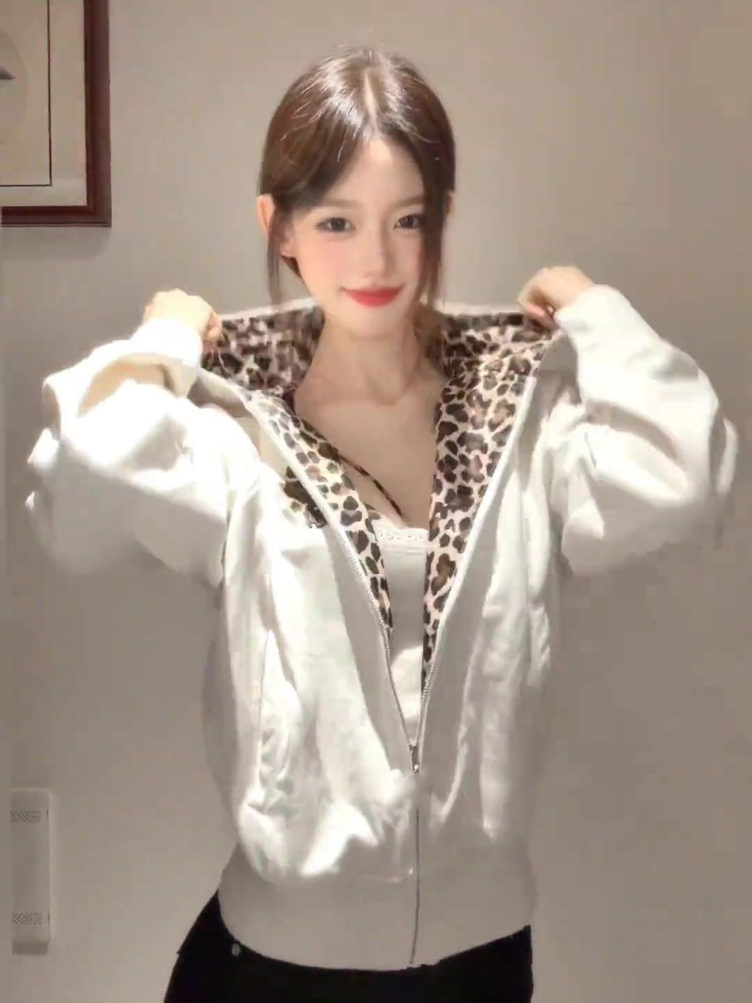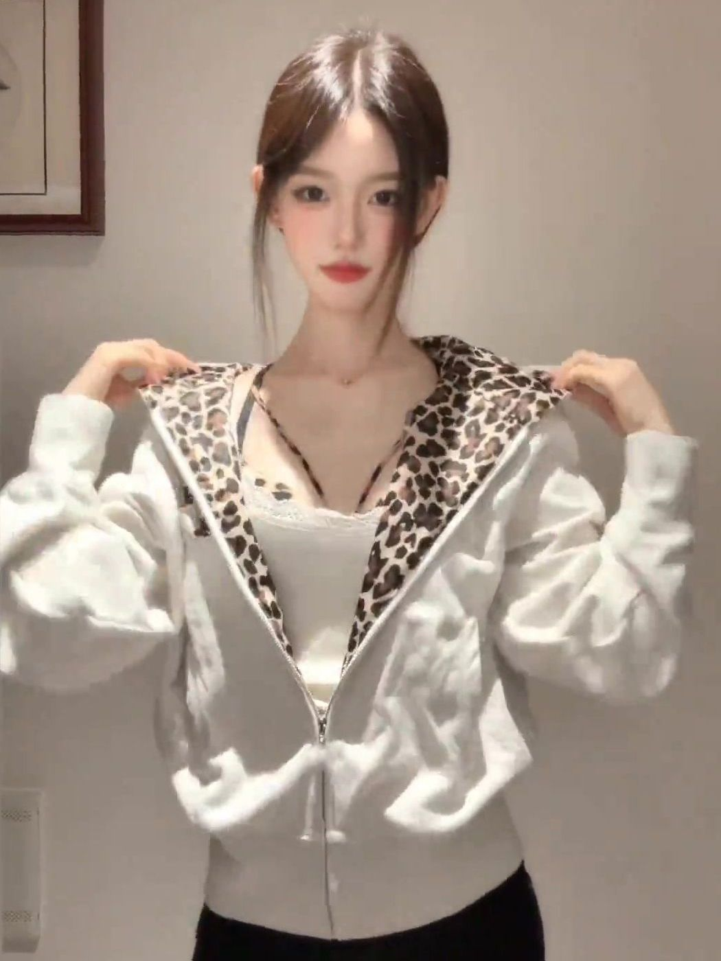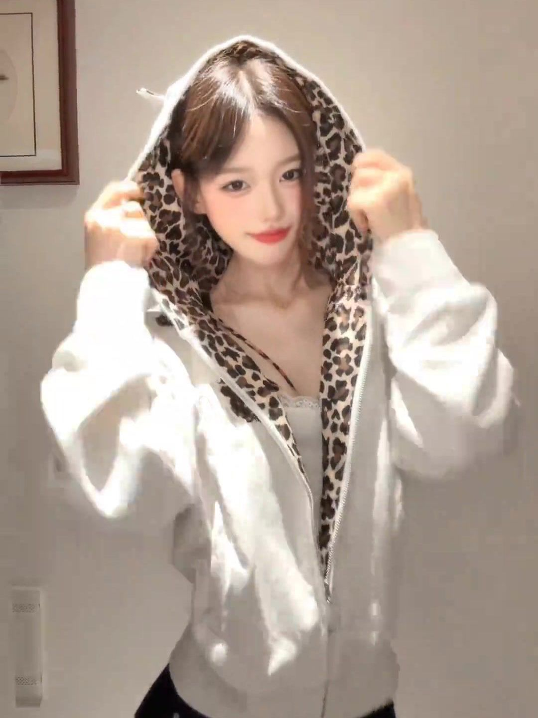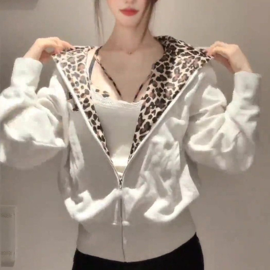 MY14611# 仿棉华棉复合牛奶丝开衫外套女字母印花豹纹连帽卫衣女裝貨源服裝批發