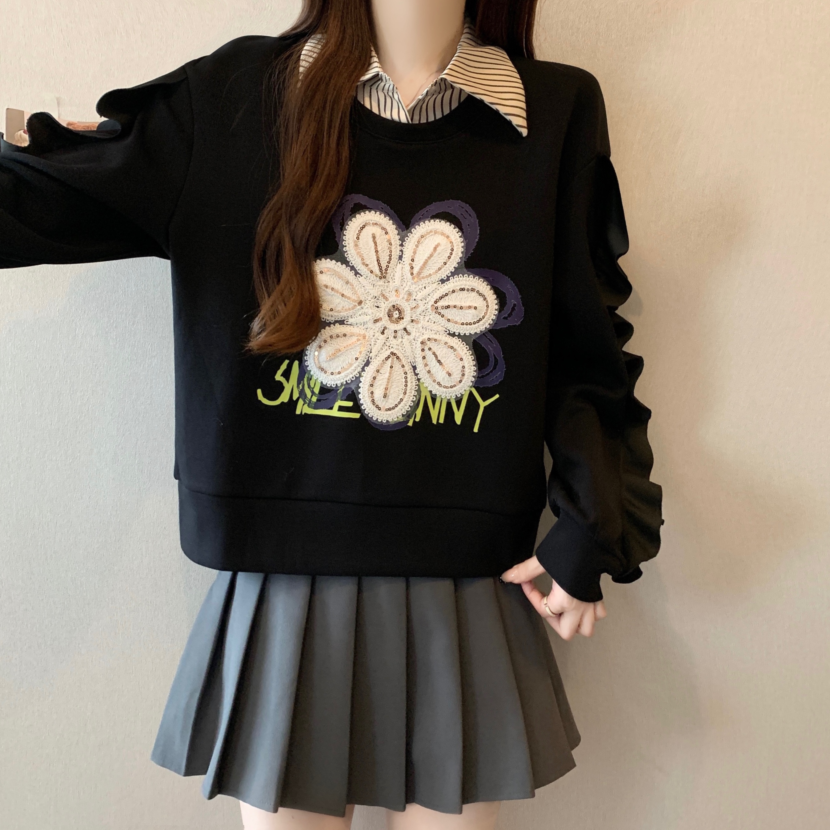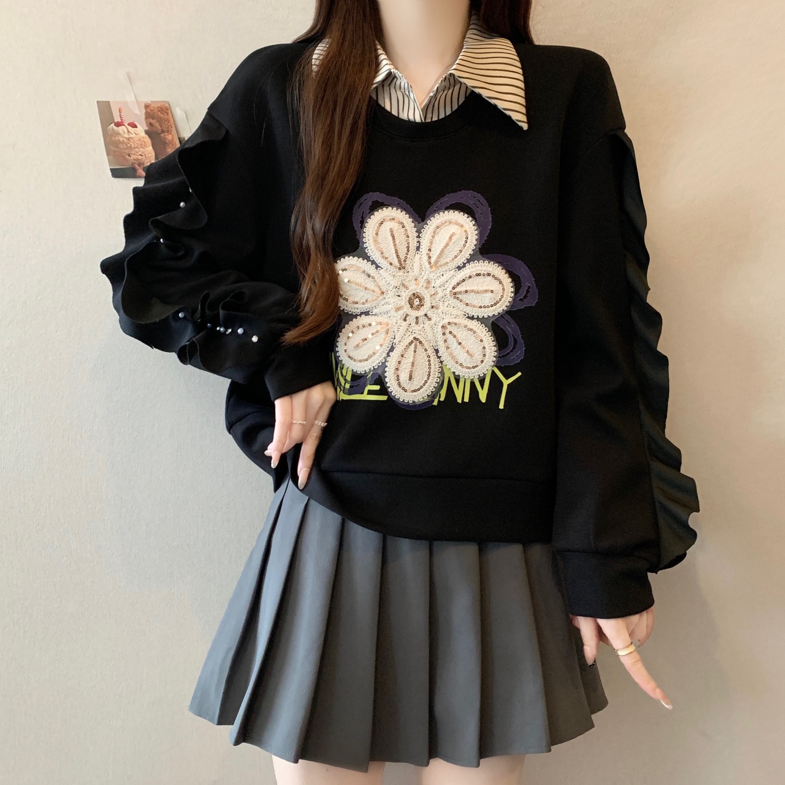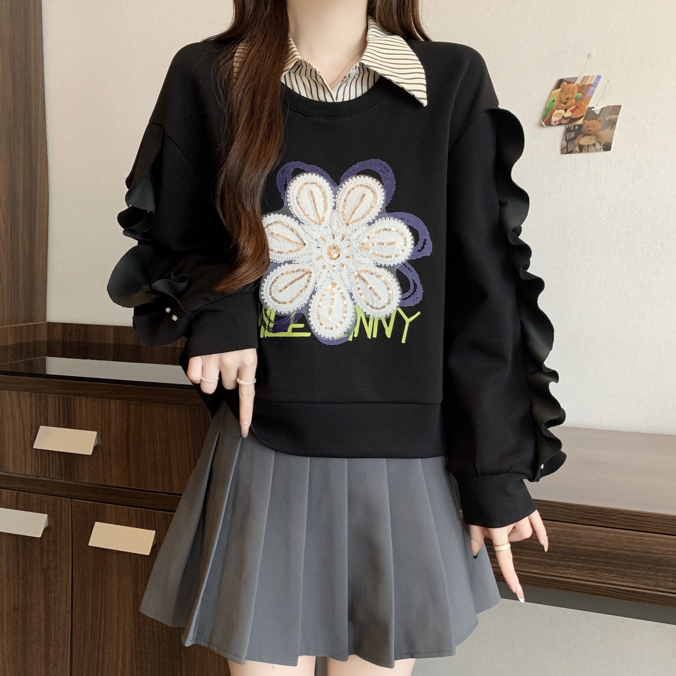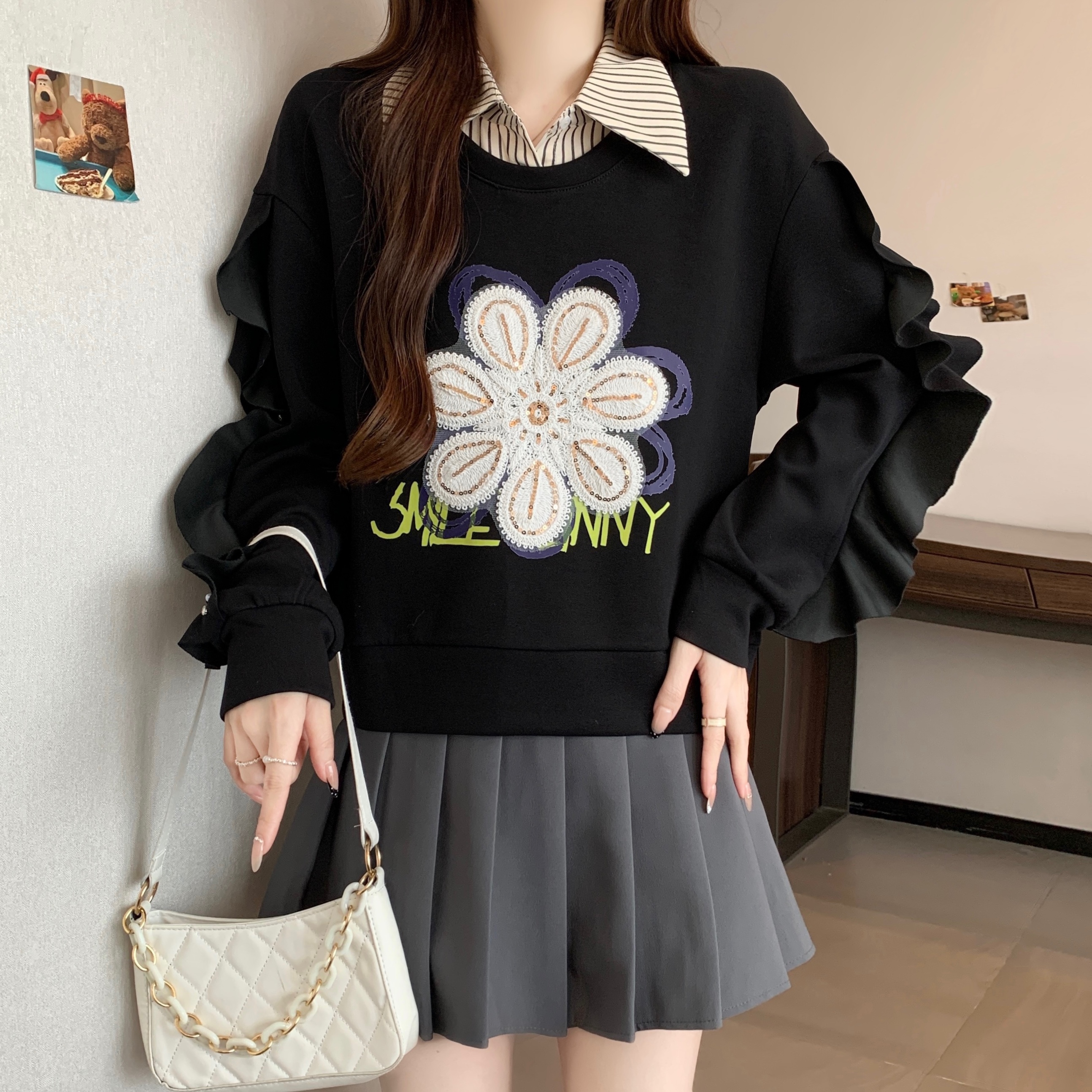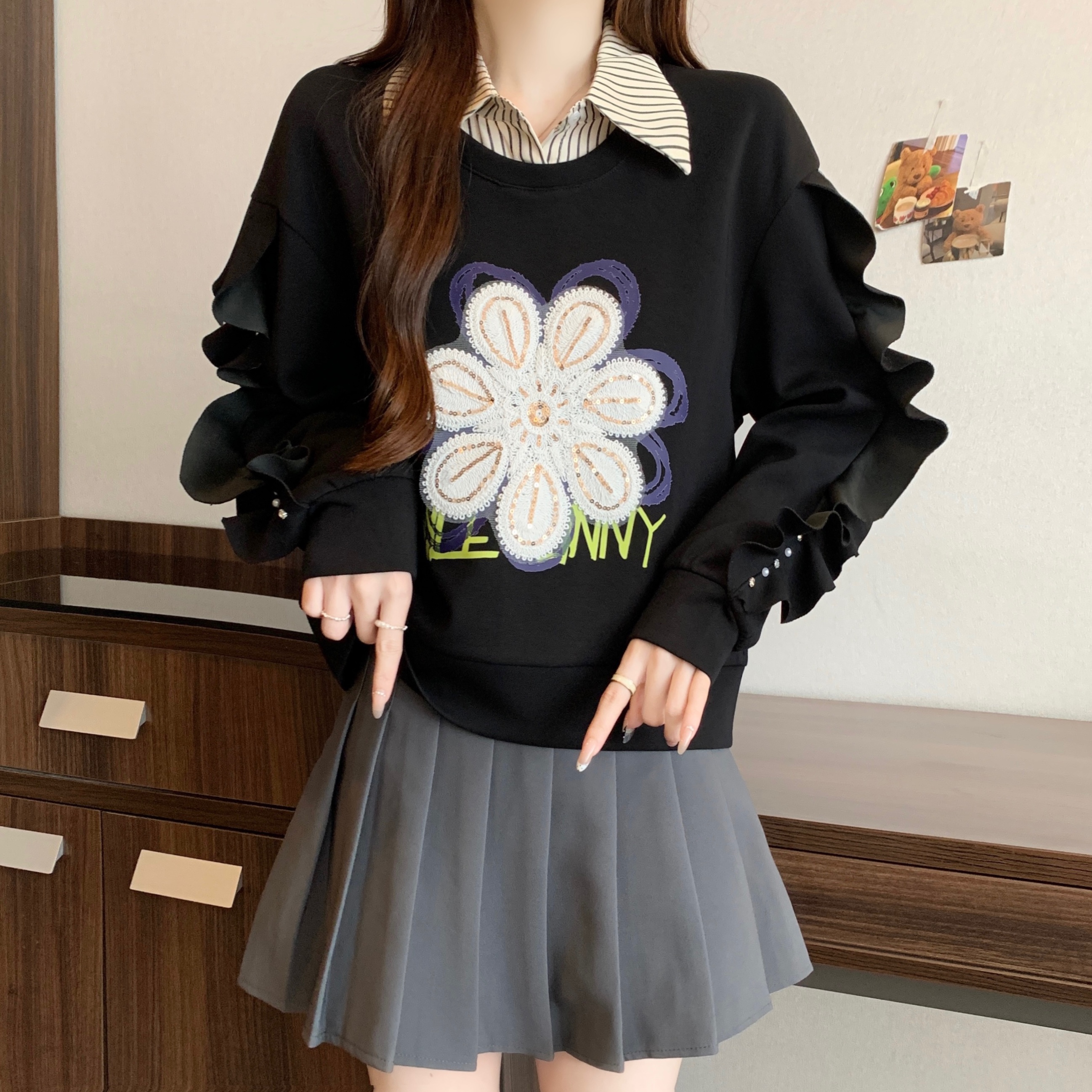 MY14665# 大码重工花朵条纹翻领卫衣小众设计木耳边钉珠休闲上衣女裝貨源服裝批發