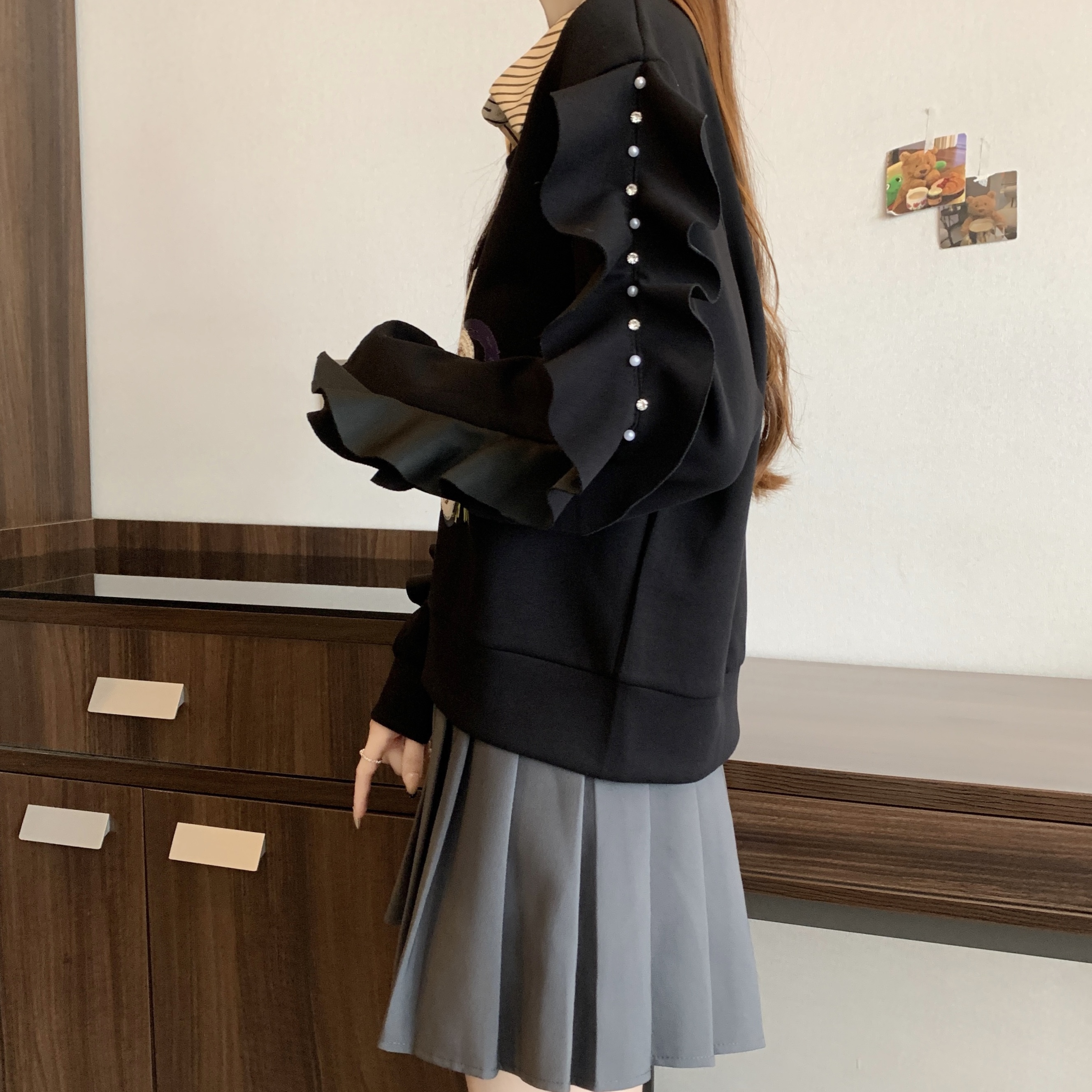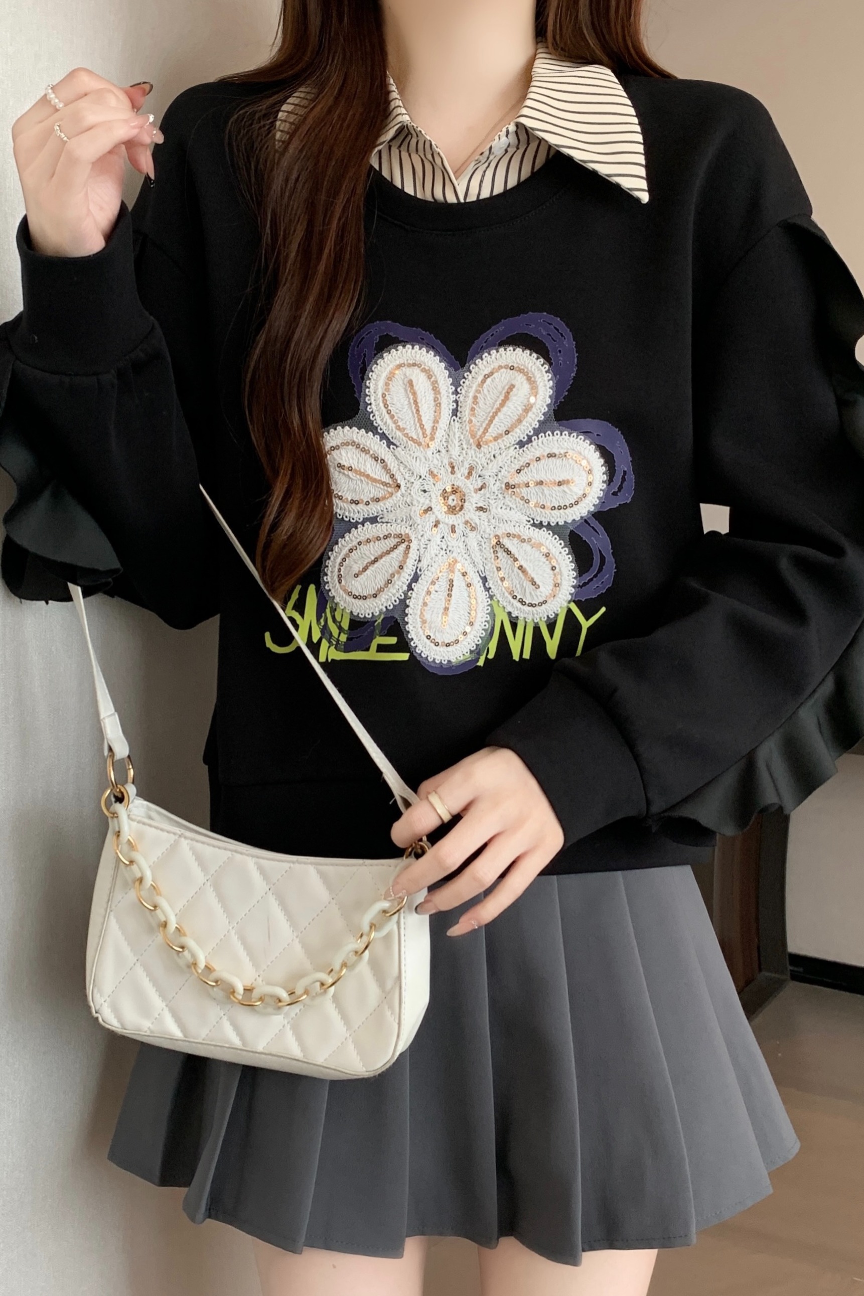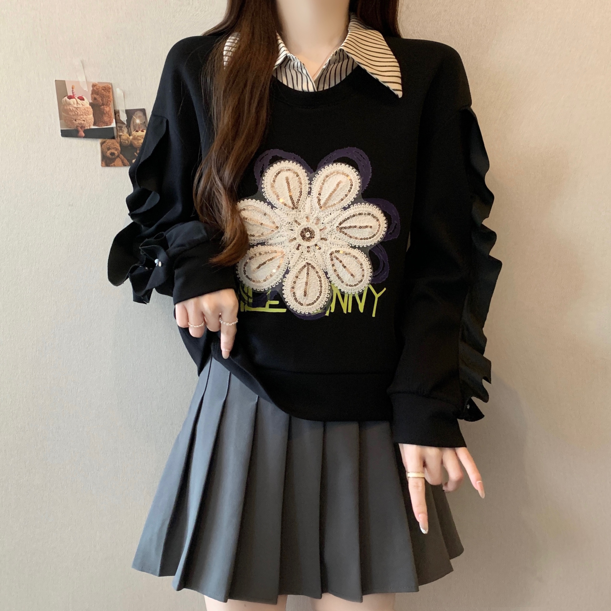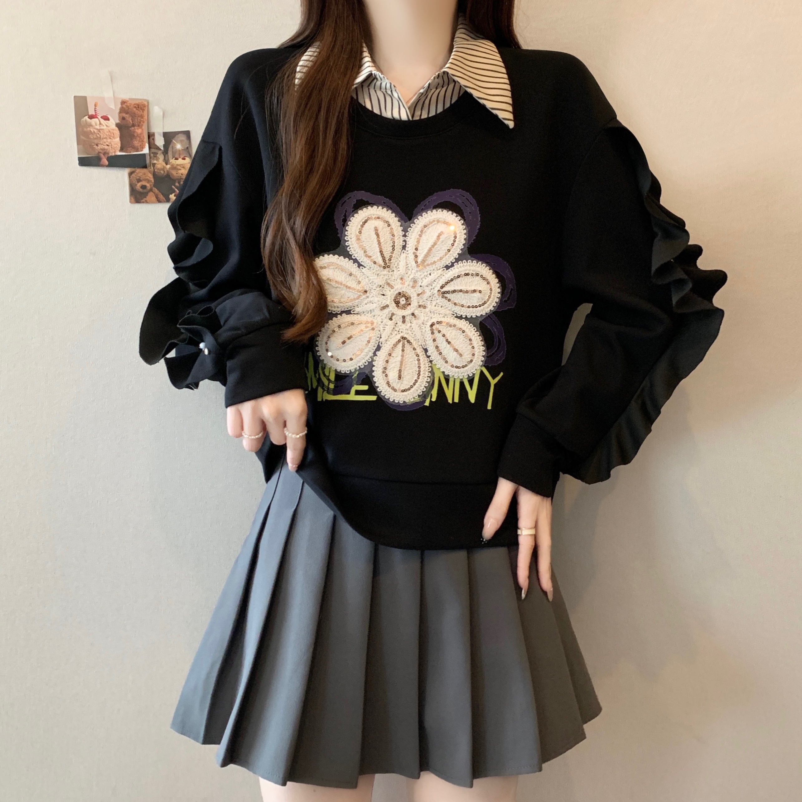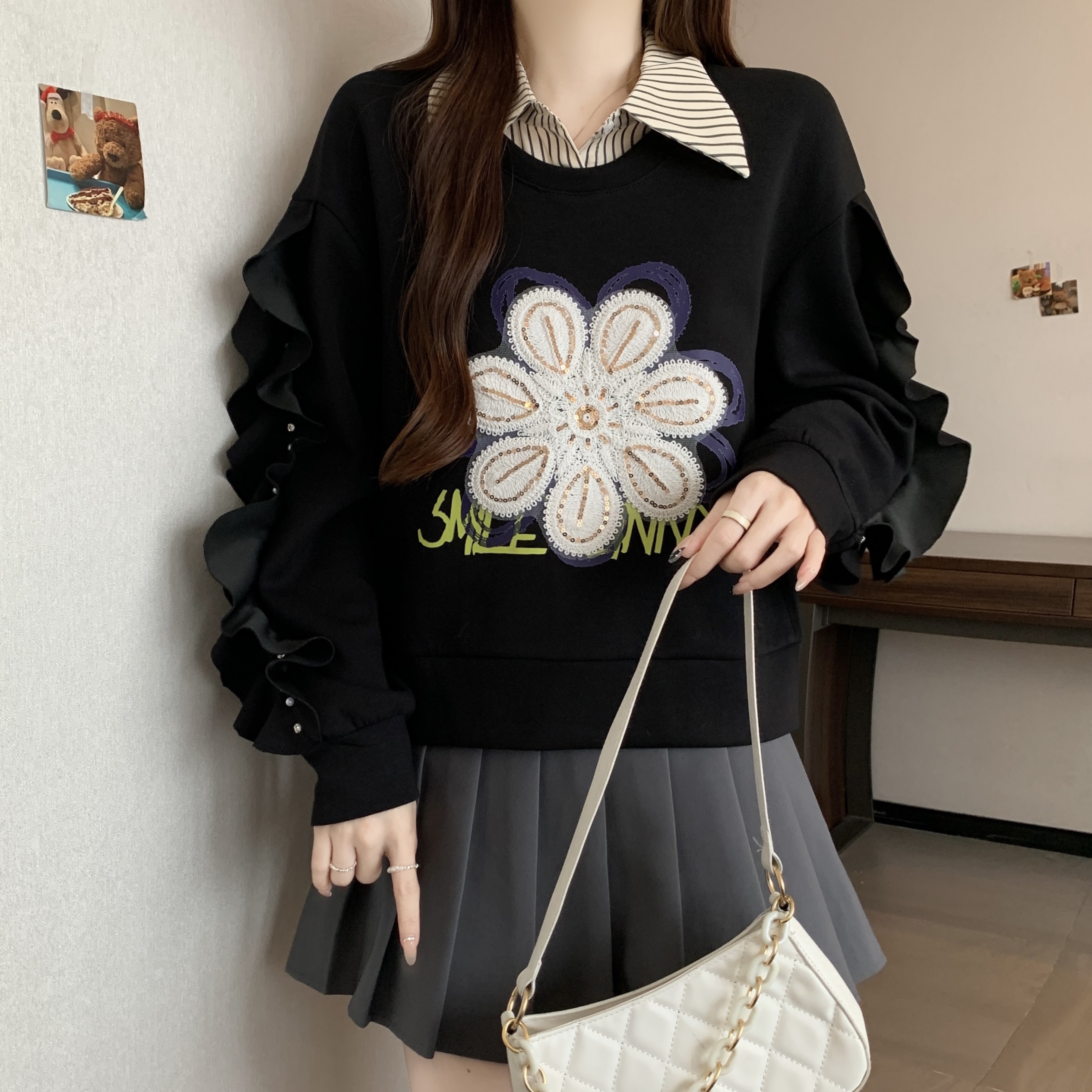 MY14665# 大码重工花朵条纹翻领卫衣小众设计木耳边钉珠休闲上衣女裝貨源服裝批發