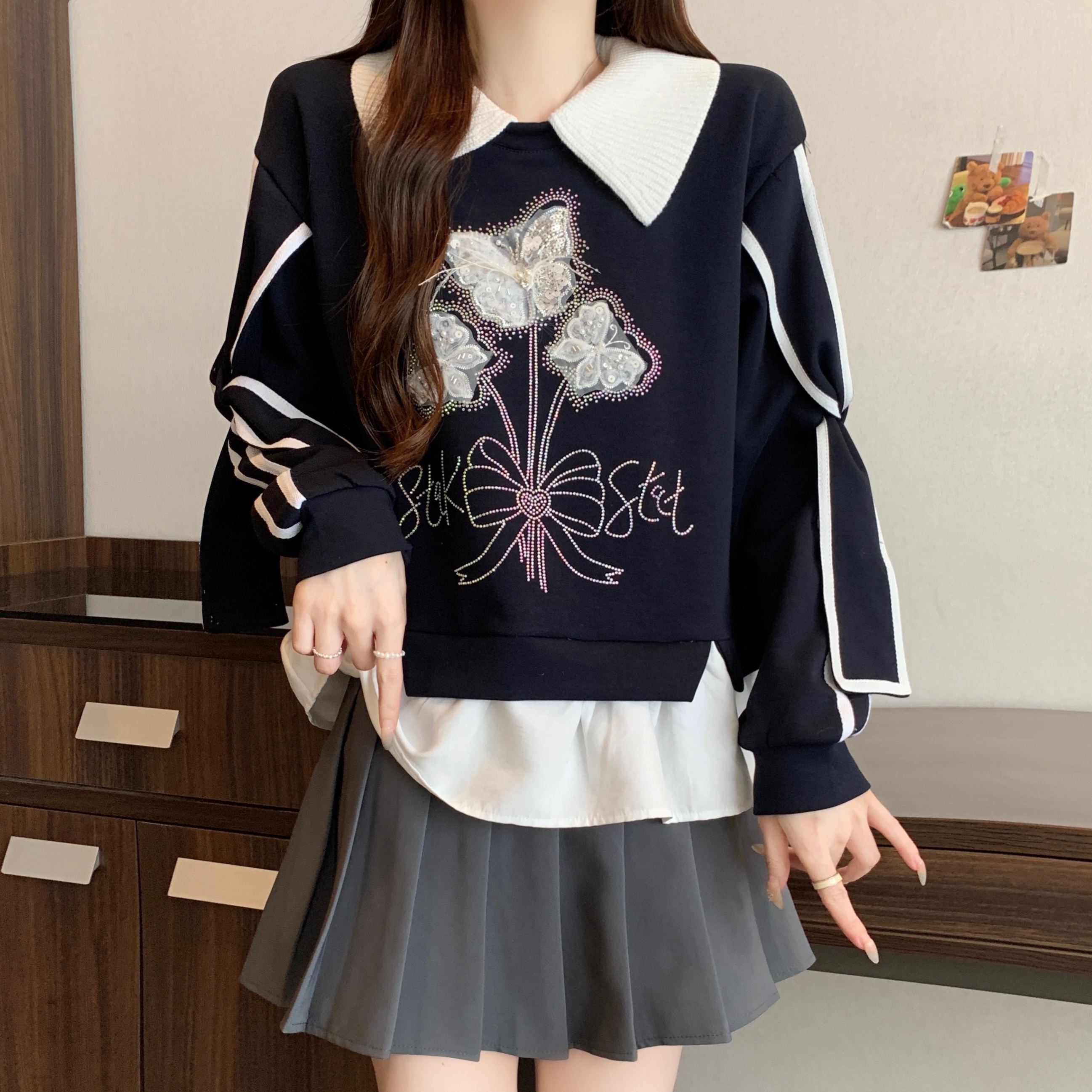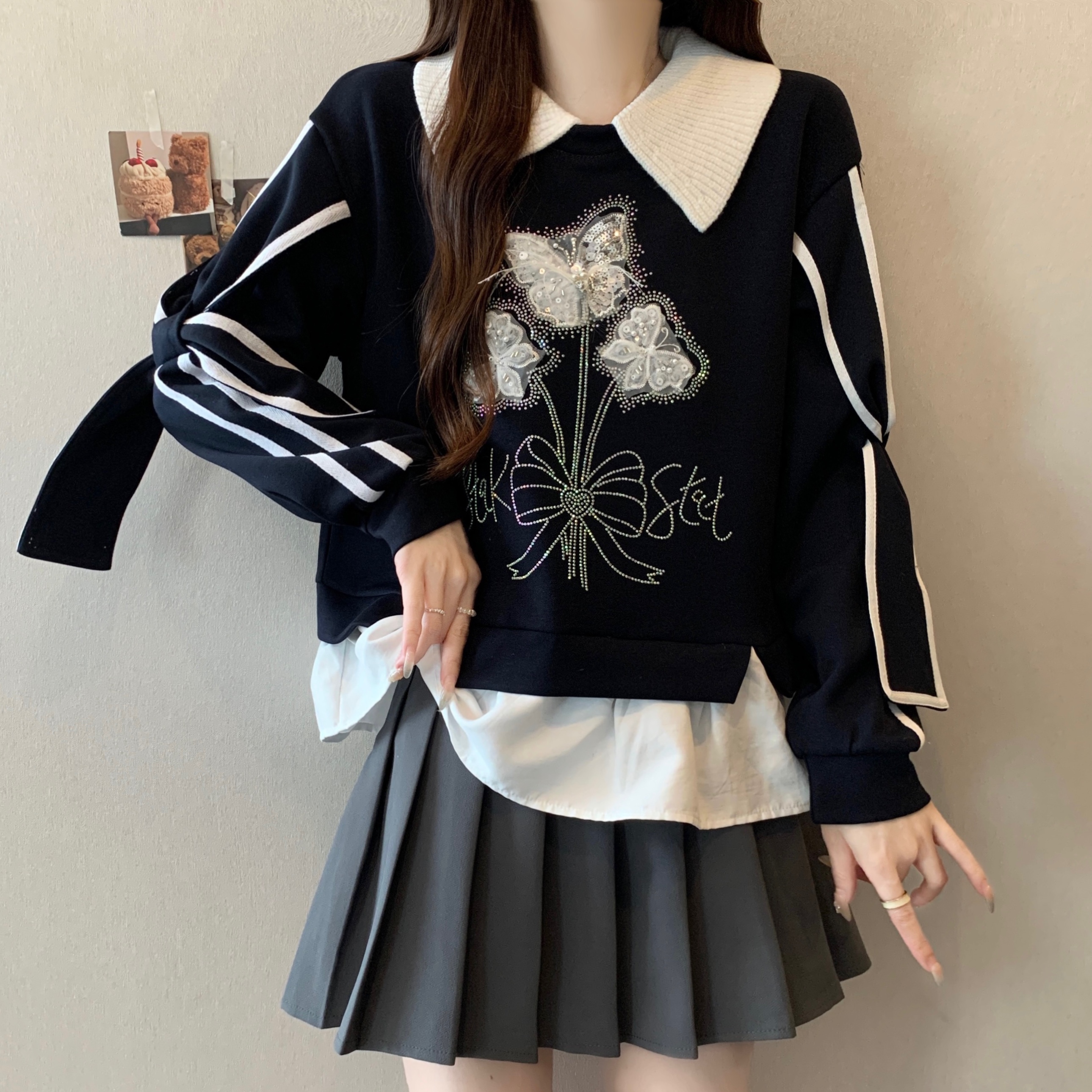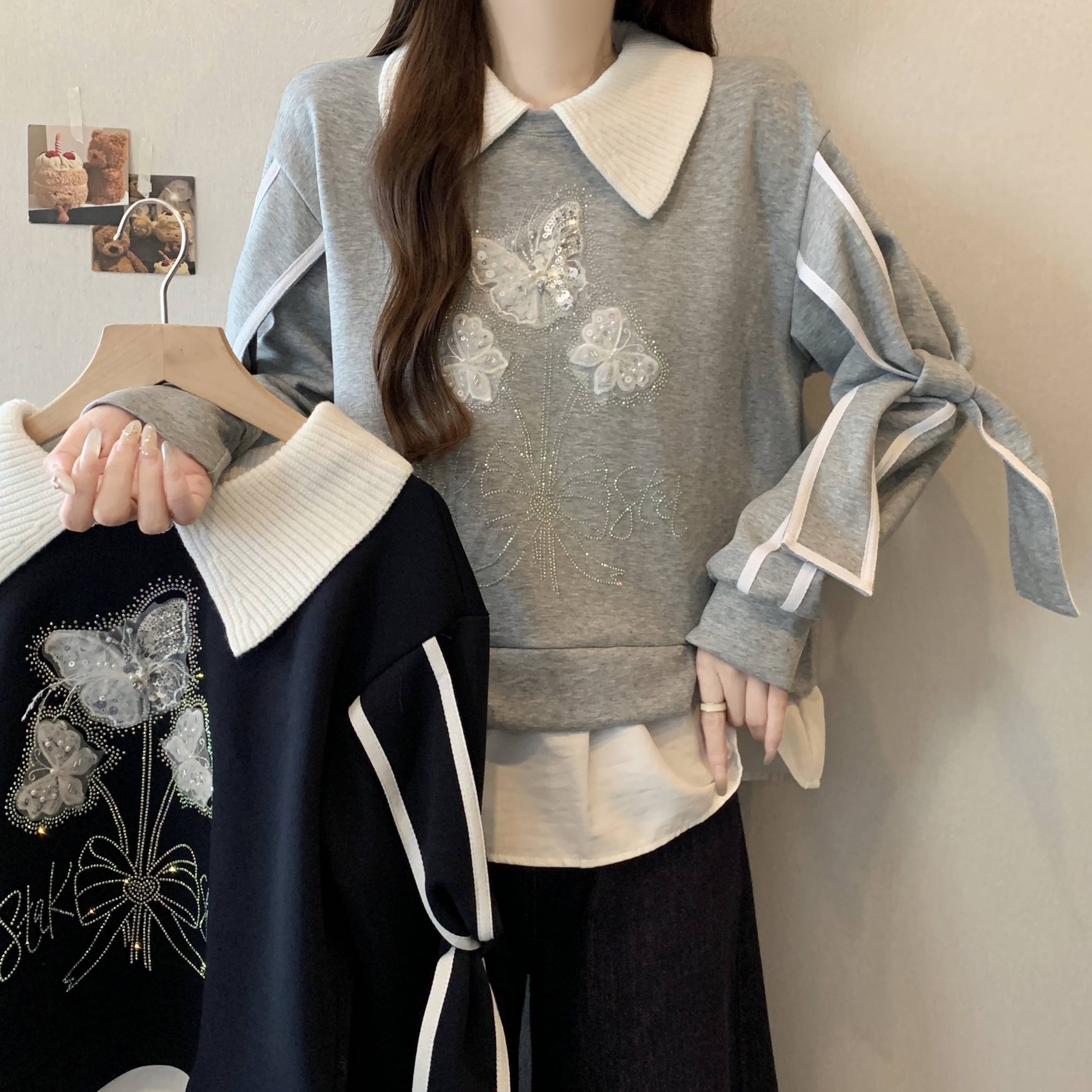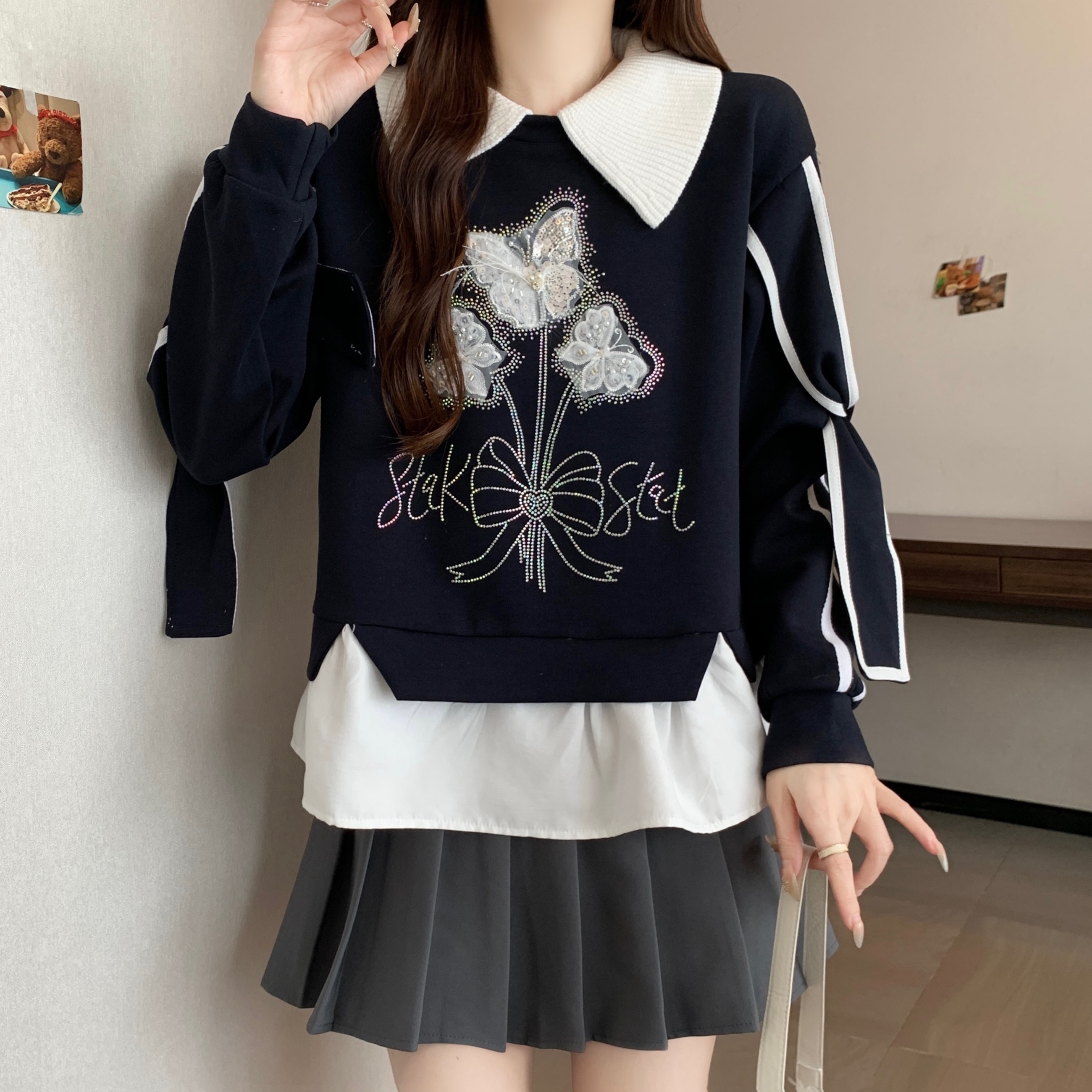 MY14666# 大码重工蝴蝶烫钻假两件卫衣加厚保暖拼接翻领长袖上衣女裝貨源服裝批發