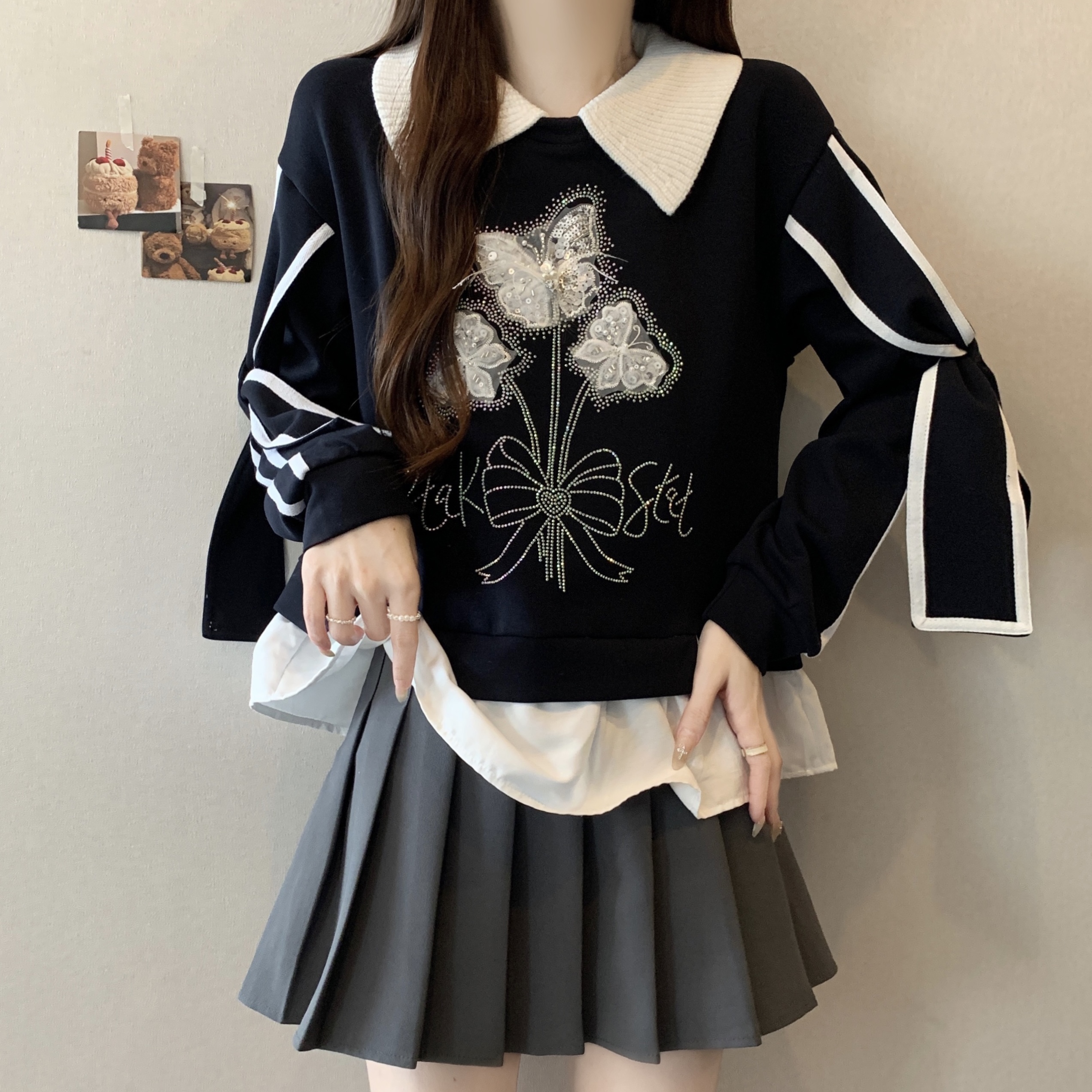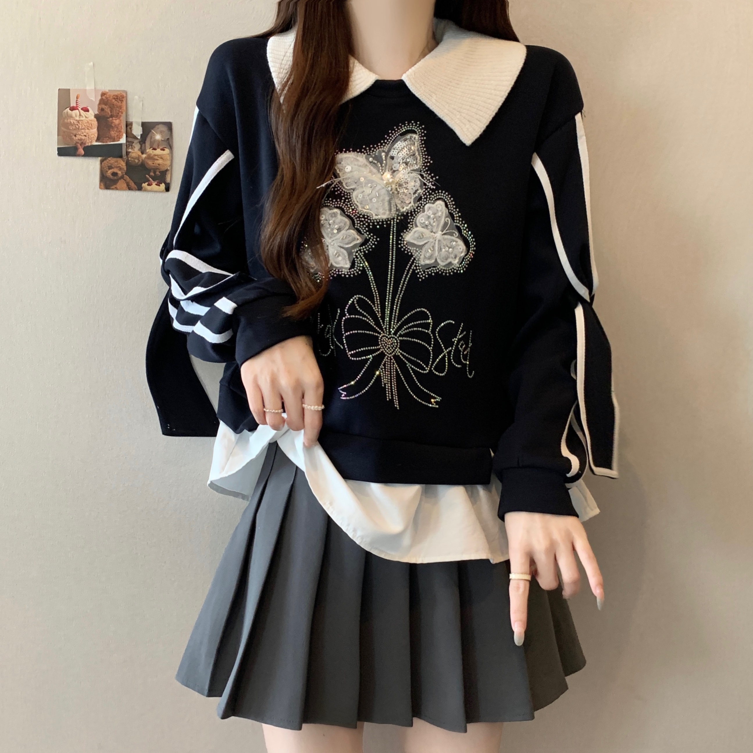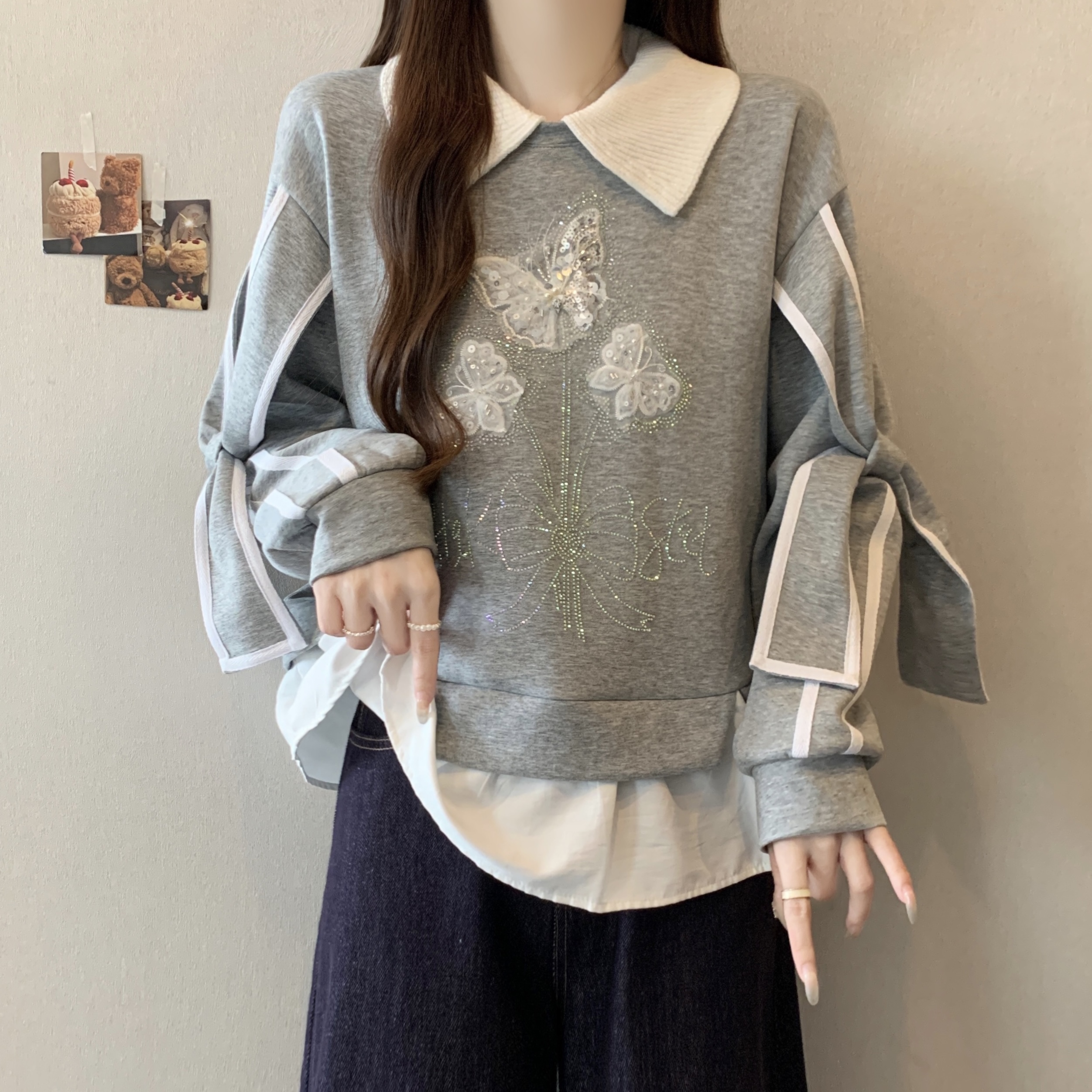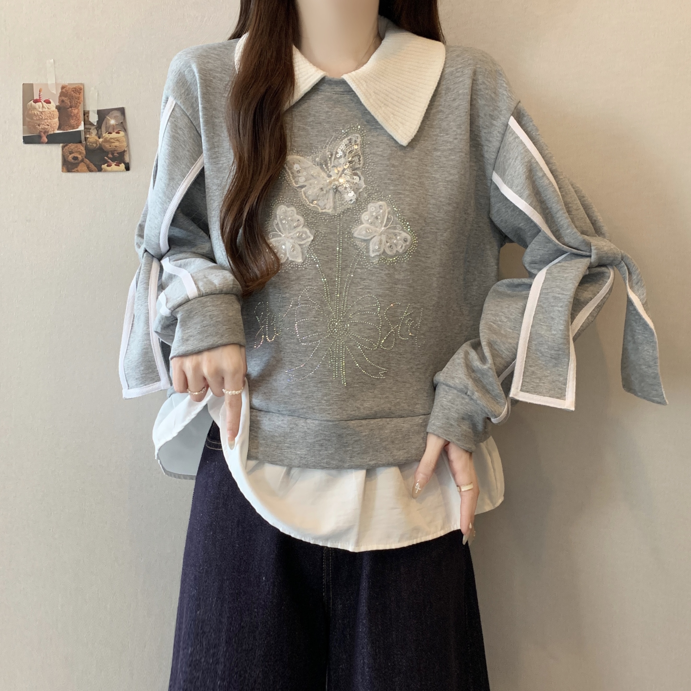 MY14666# 大码重工蝴蝶烫钻假两件卫衣加厚保暖拼接翻领长袖上衣女裝貨源服裝批發