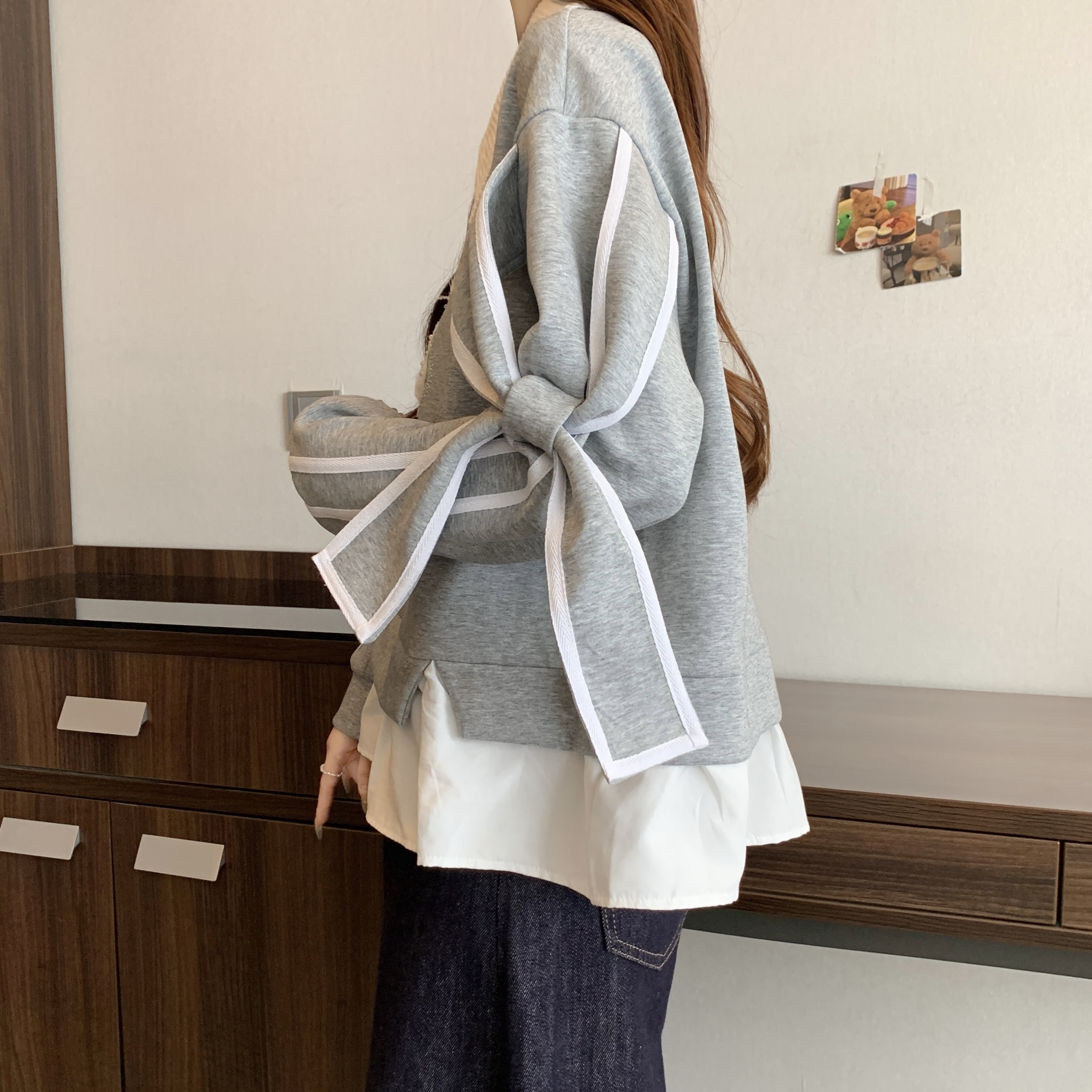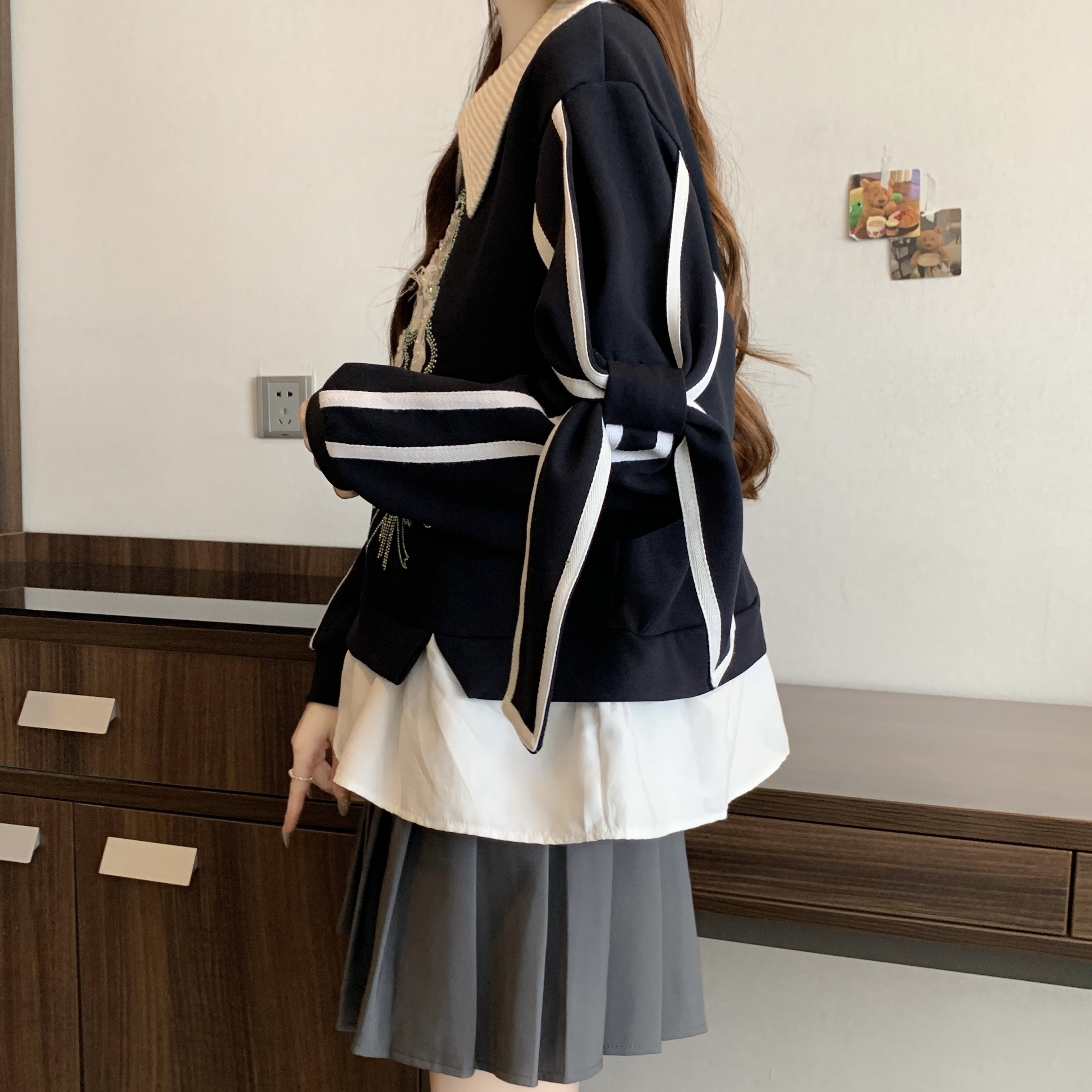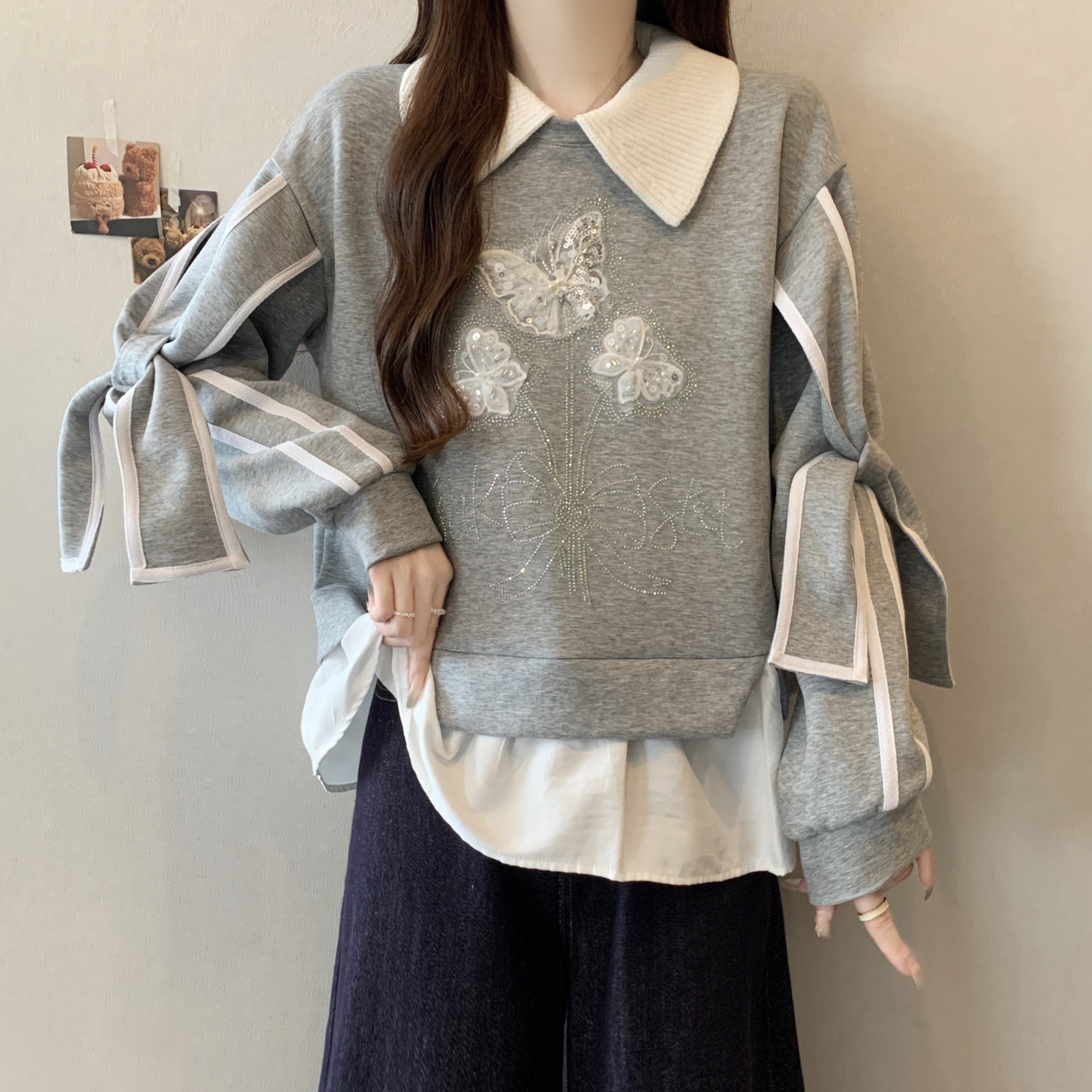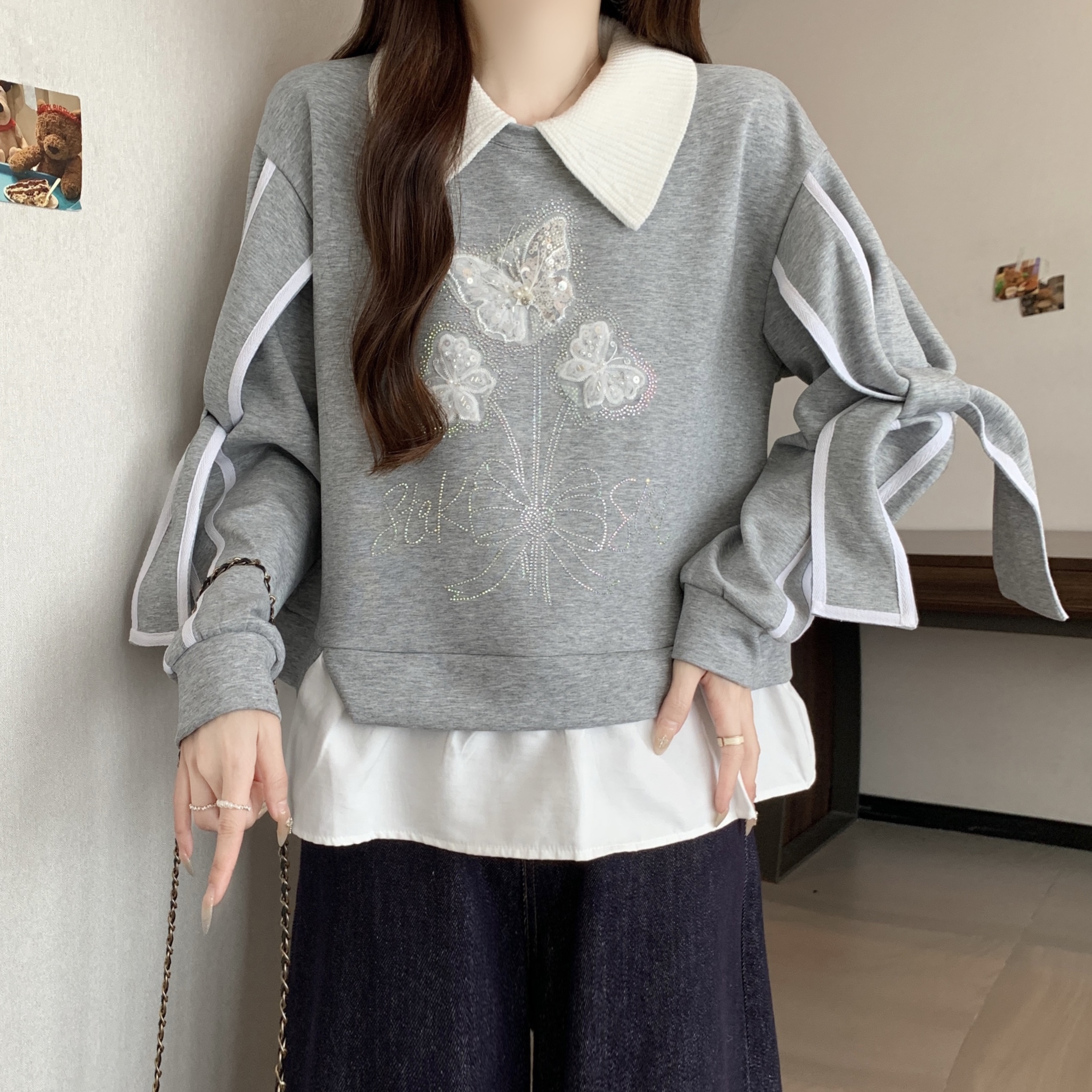 MY14666# 大码重工蝴蝶烫钻假两件卫衣加厚保暖拼接翻领长袖上衣女裝貨源服裝批發