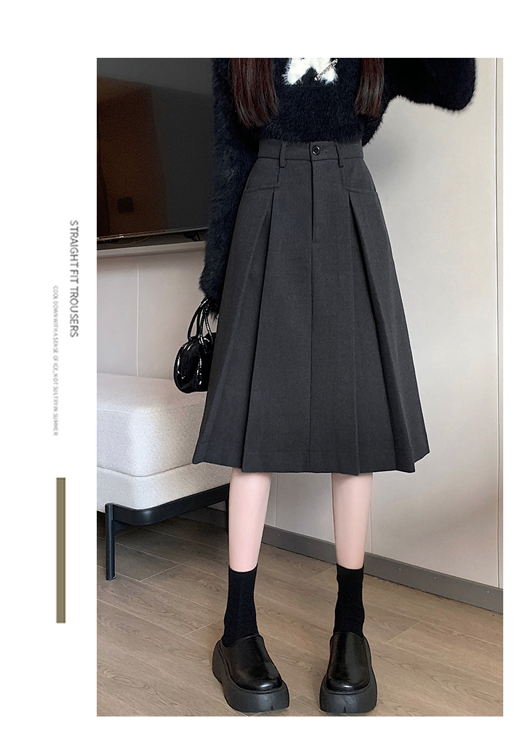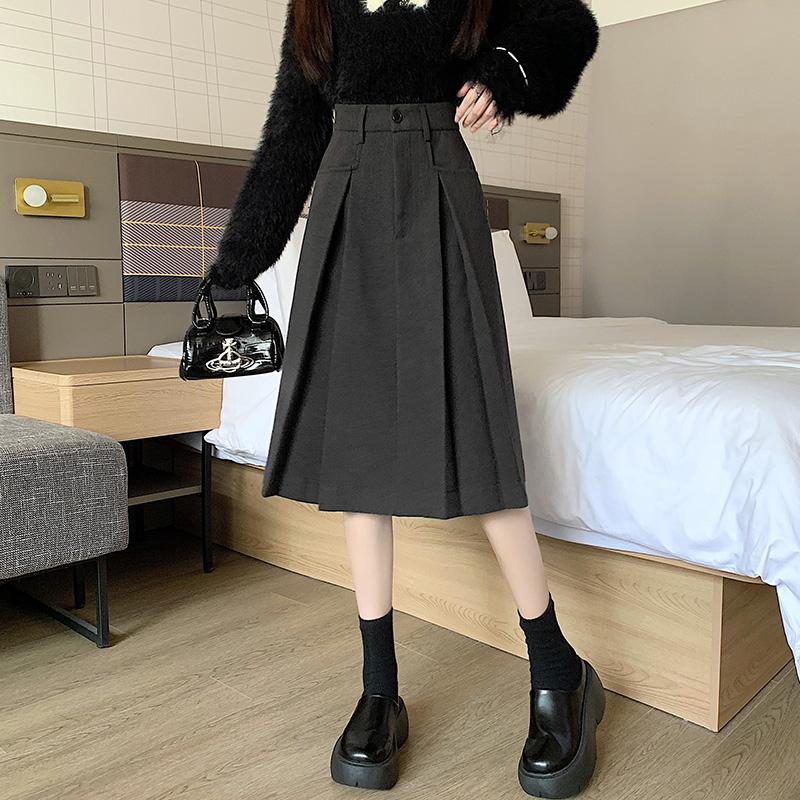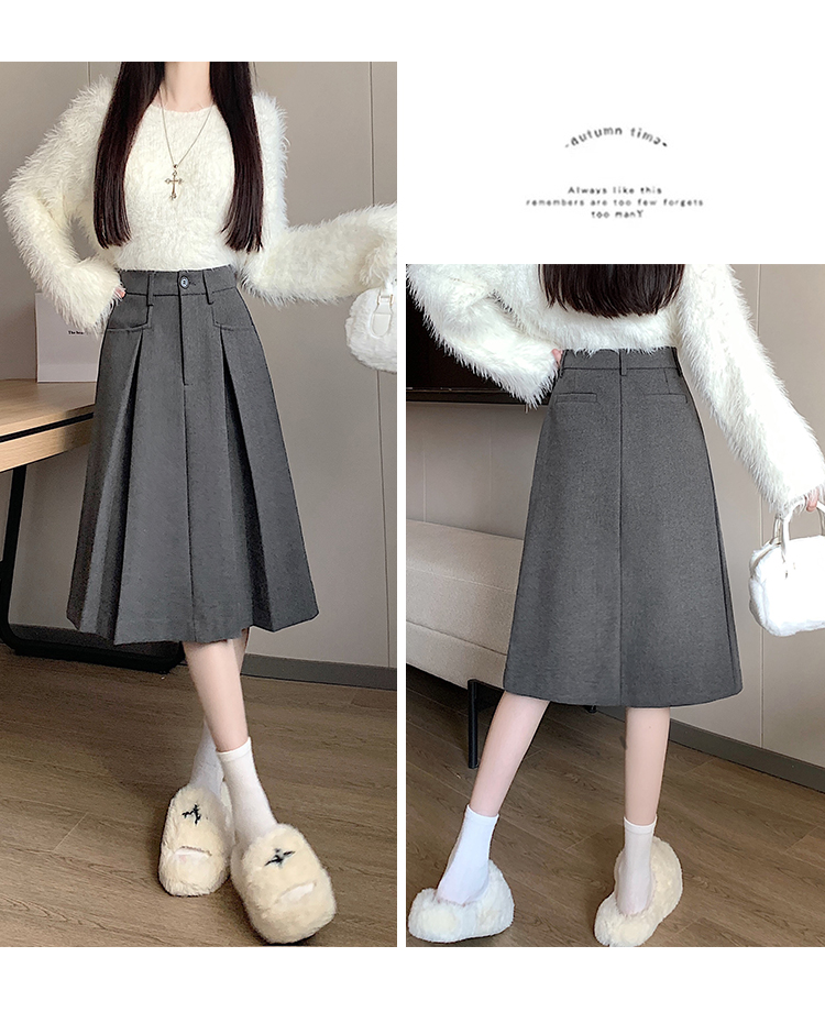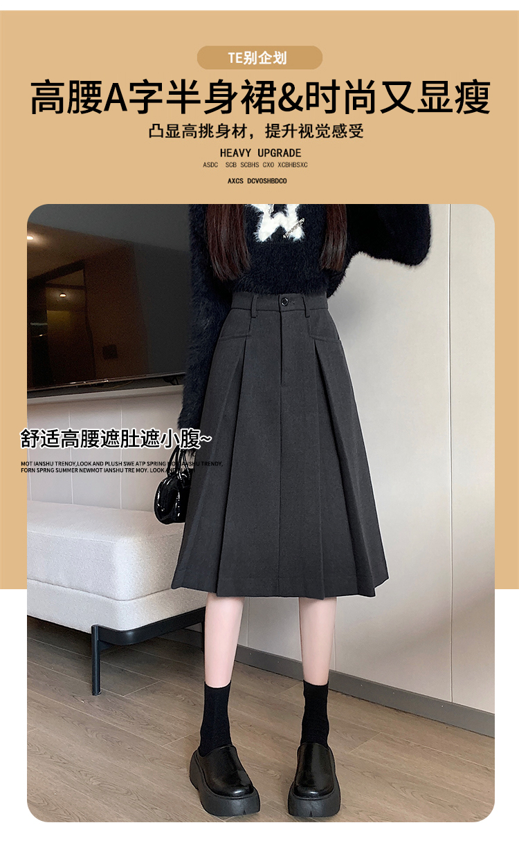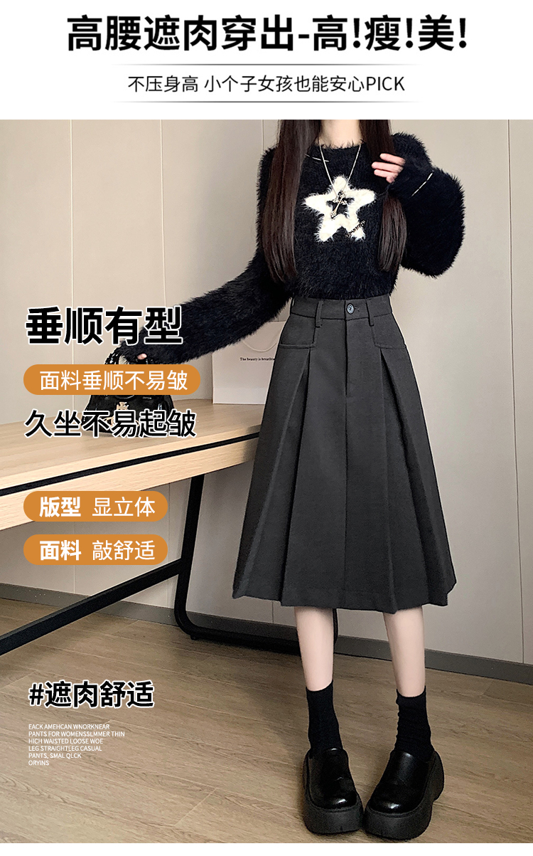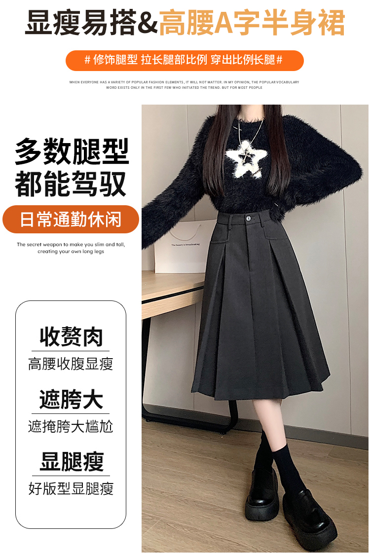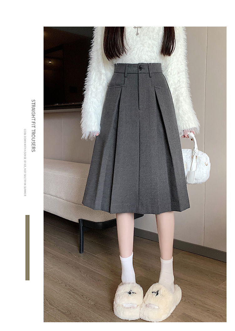 MY14753# 新款A型褶裥裙女毛呢百搭休闲百褶裙中长款半身裙女裝貨源服裝批發
