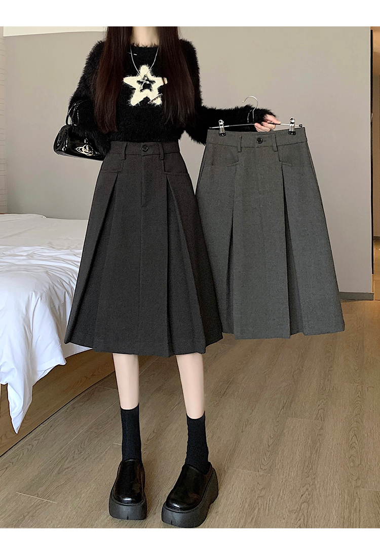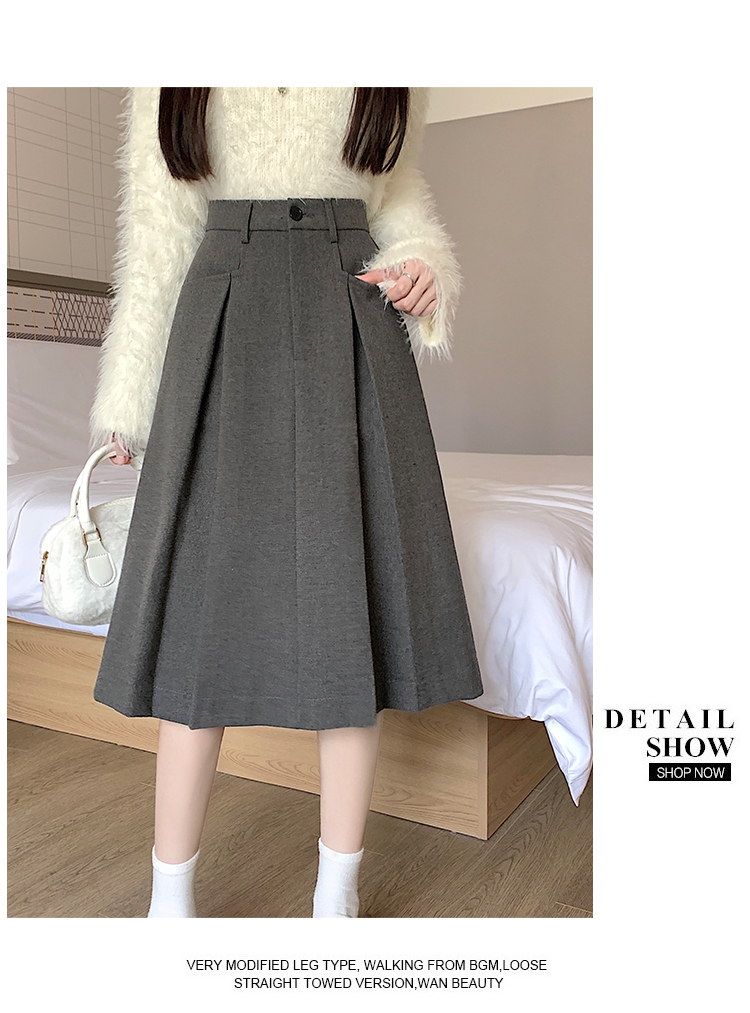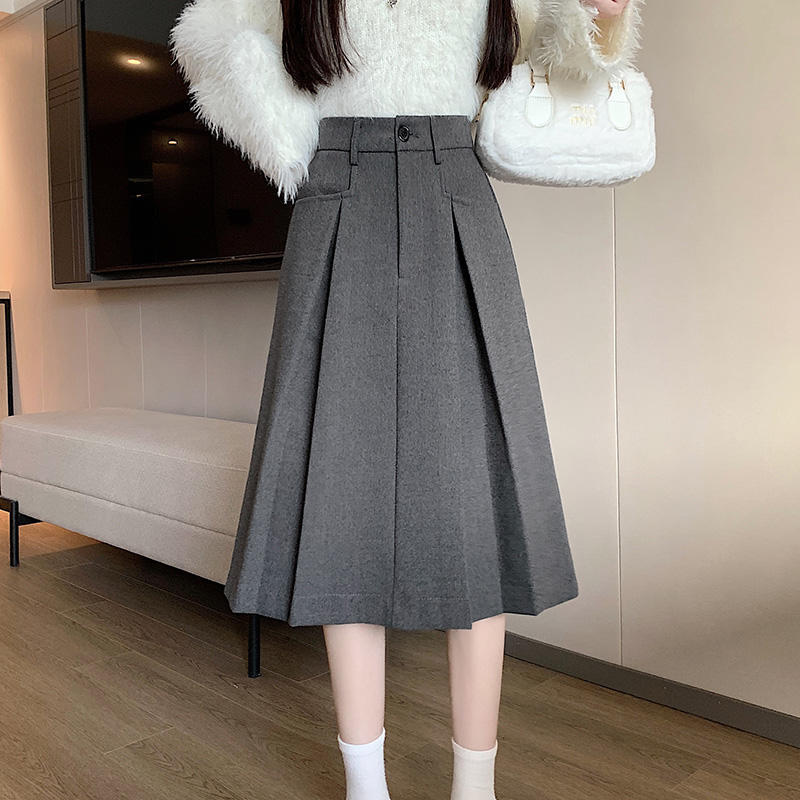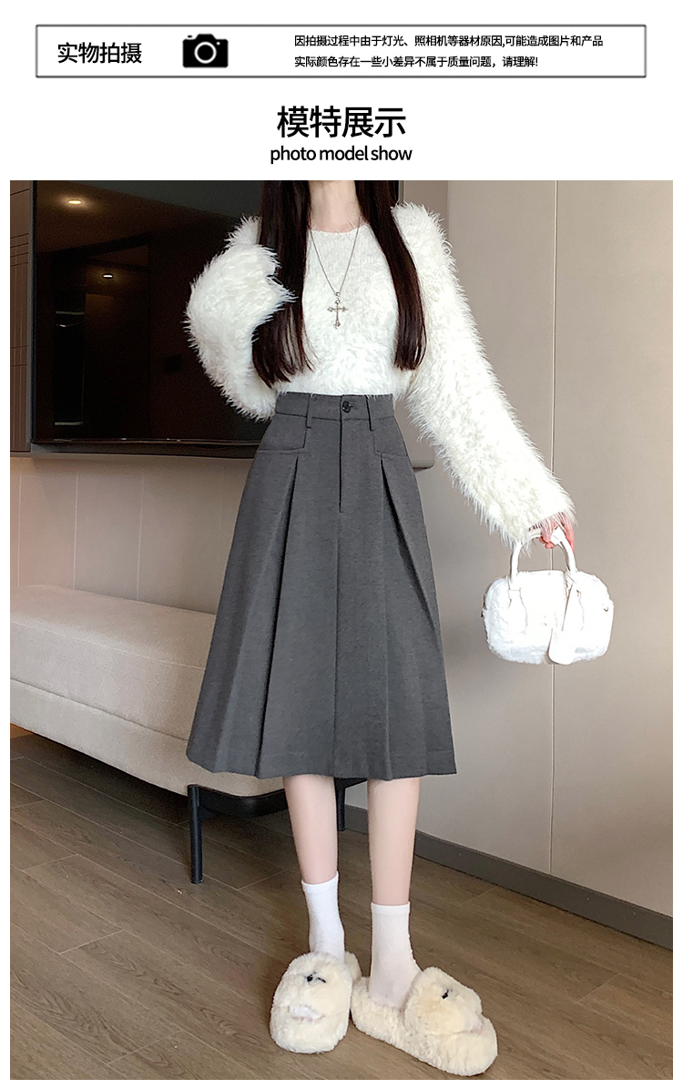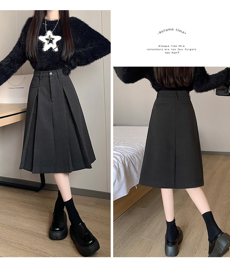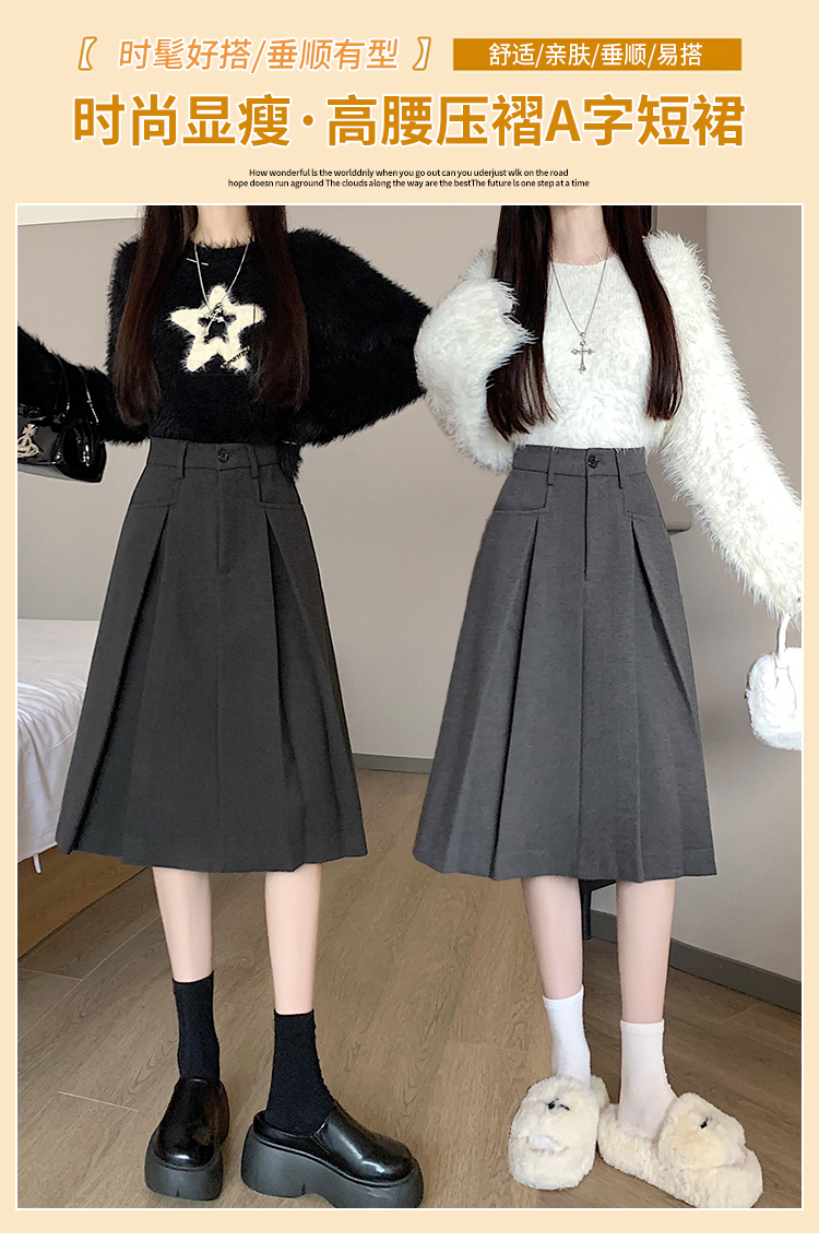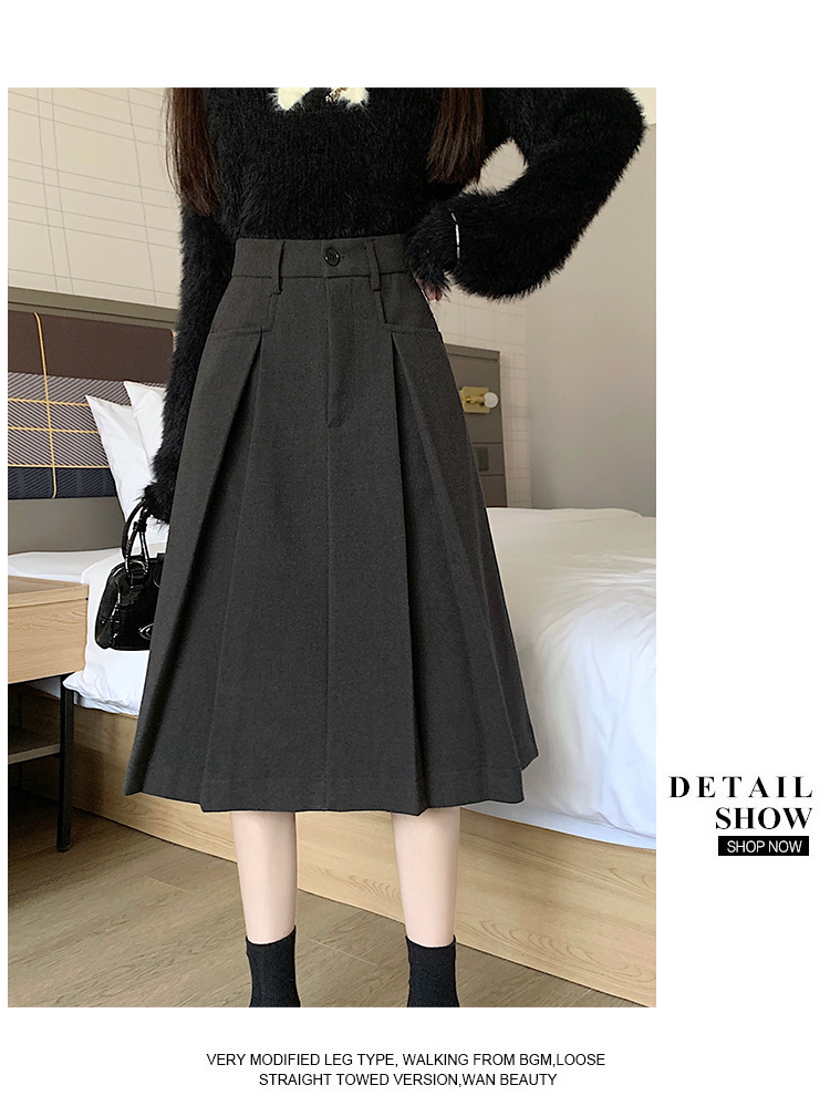 MY14753# 新款A型褶裥裙女毛呢百搭休闲百褶裙中长款半身裙女裝貨源服裝批發