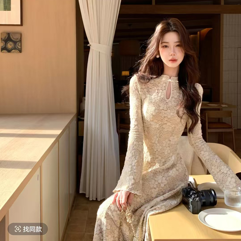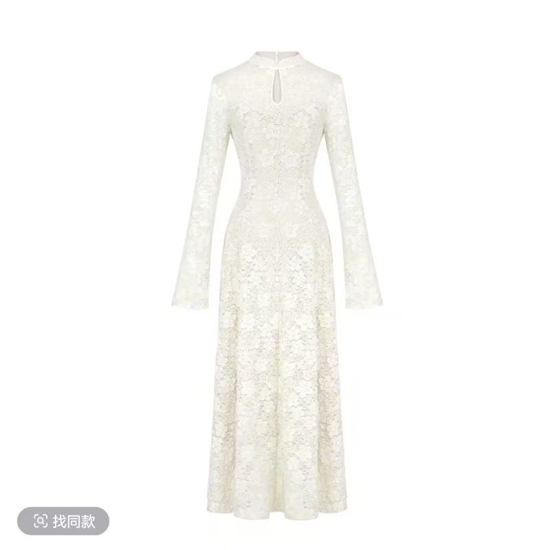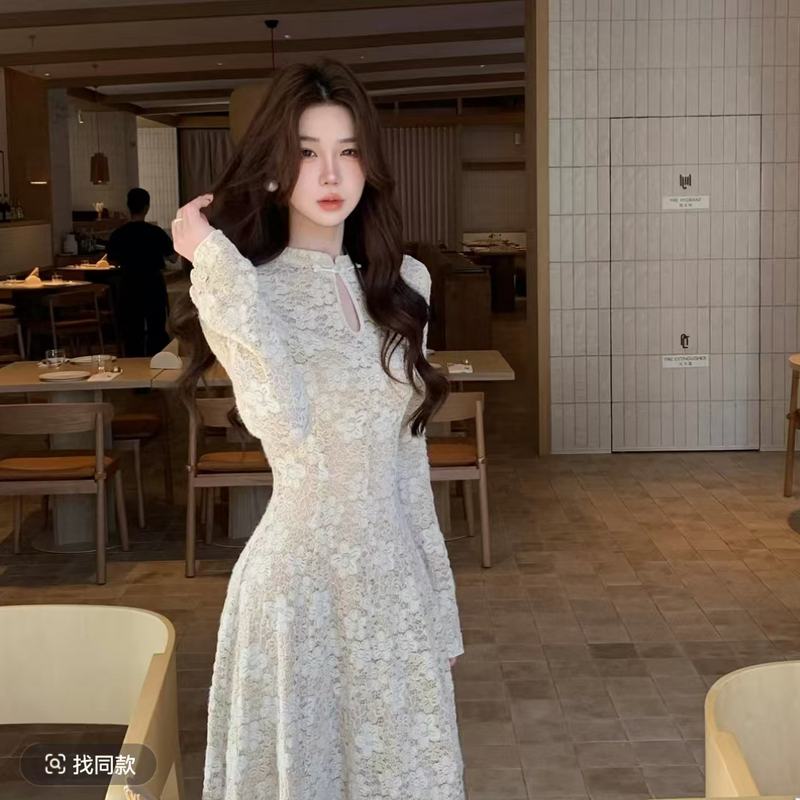 MY14757# 木子李的李缕香国韵新中式立领盘扣蕾丝连衣裙收腰大摆内衬加绒女裝貨源服裝批發