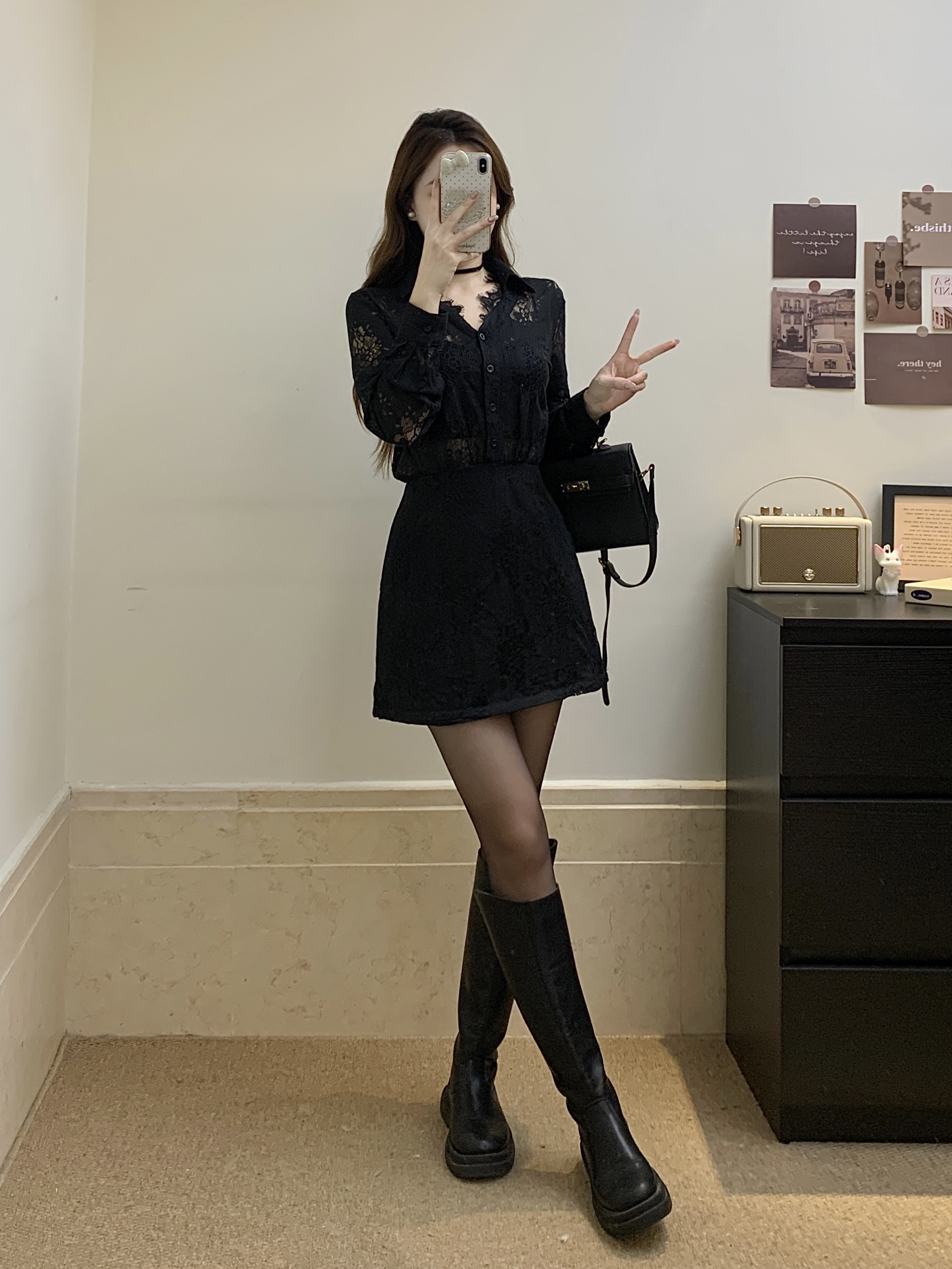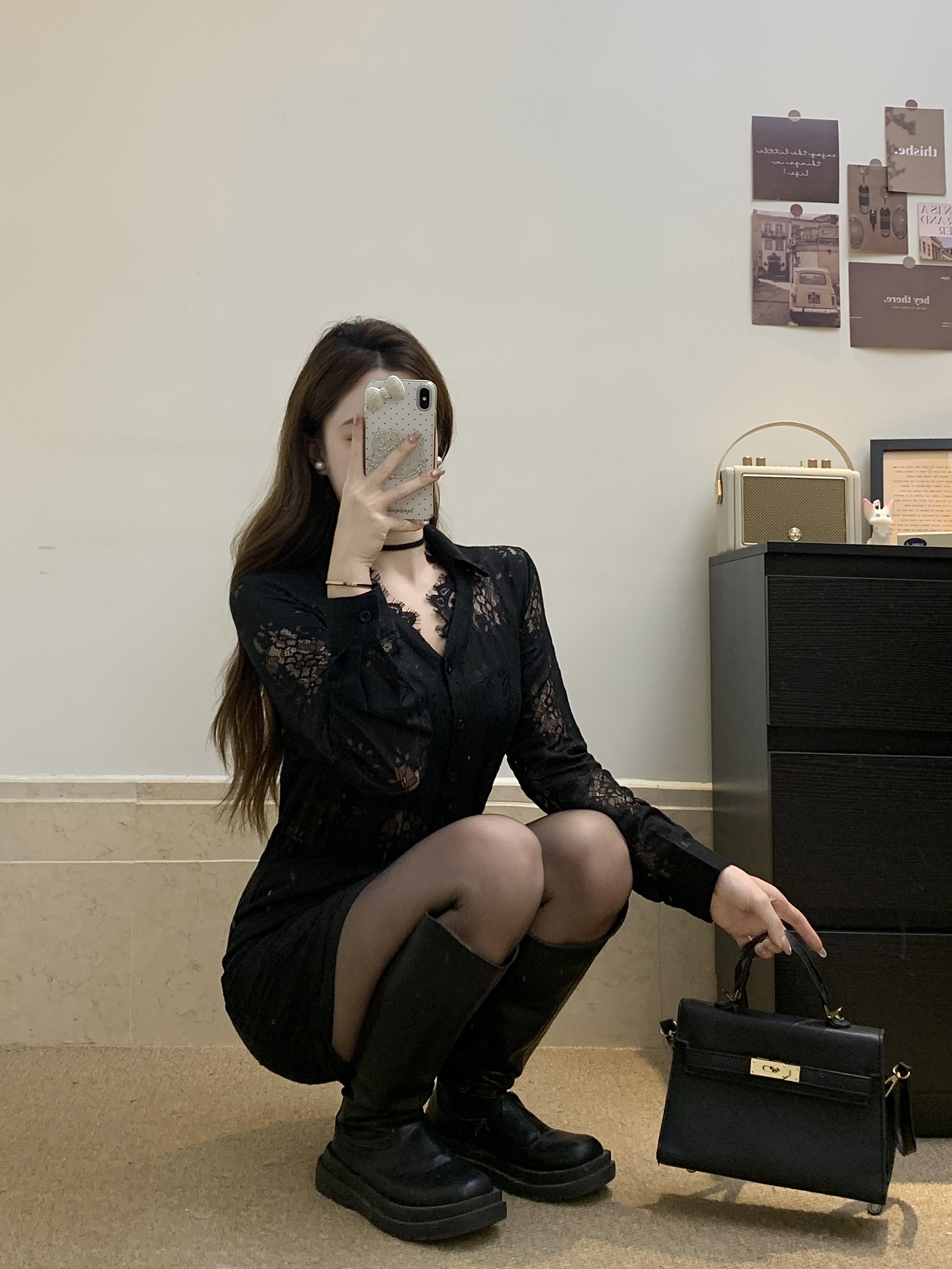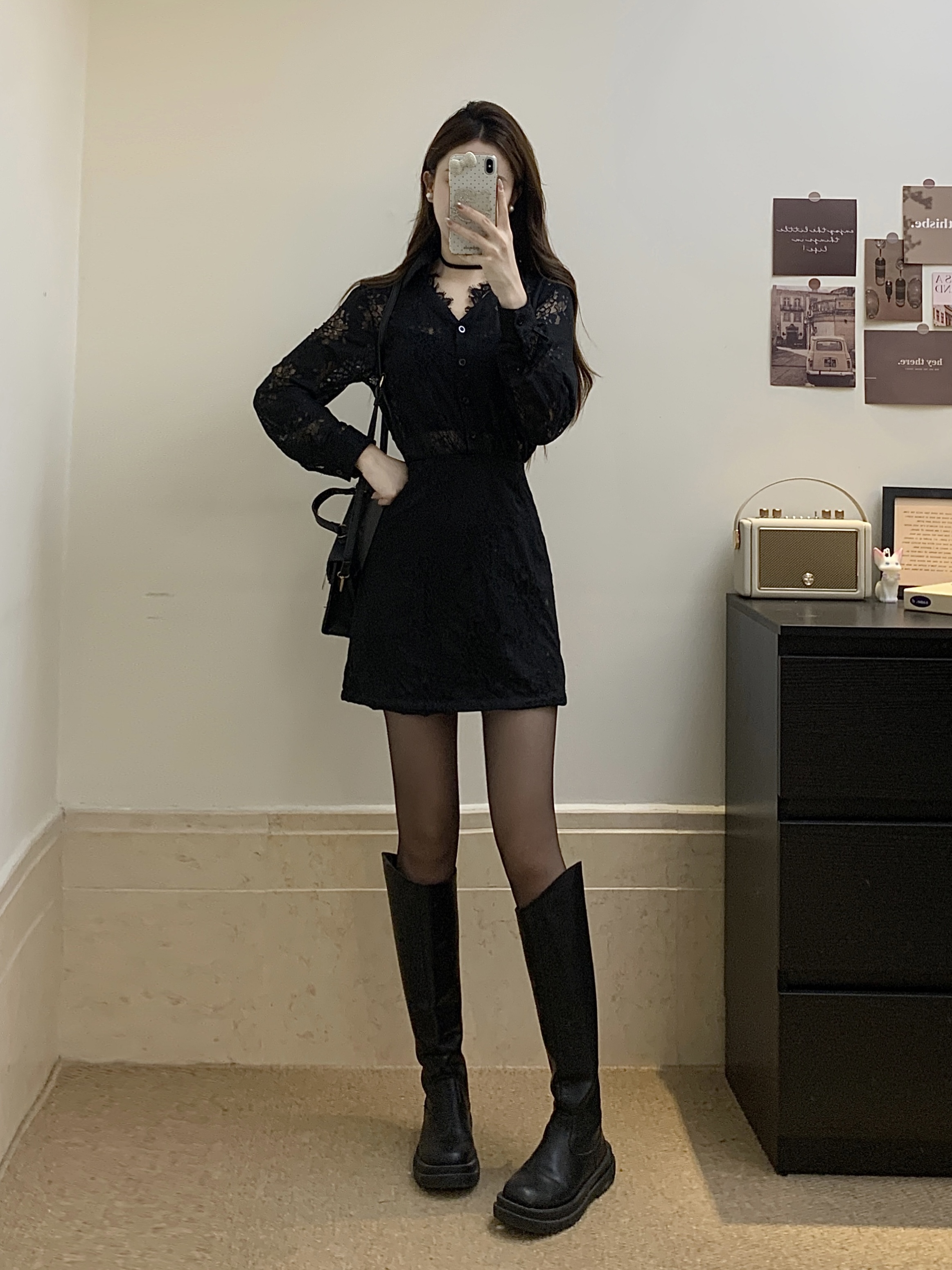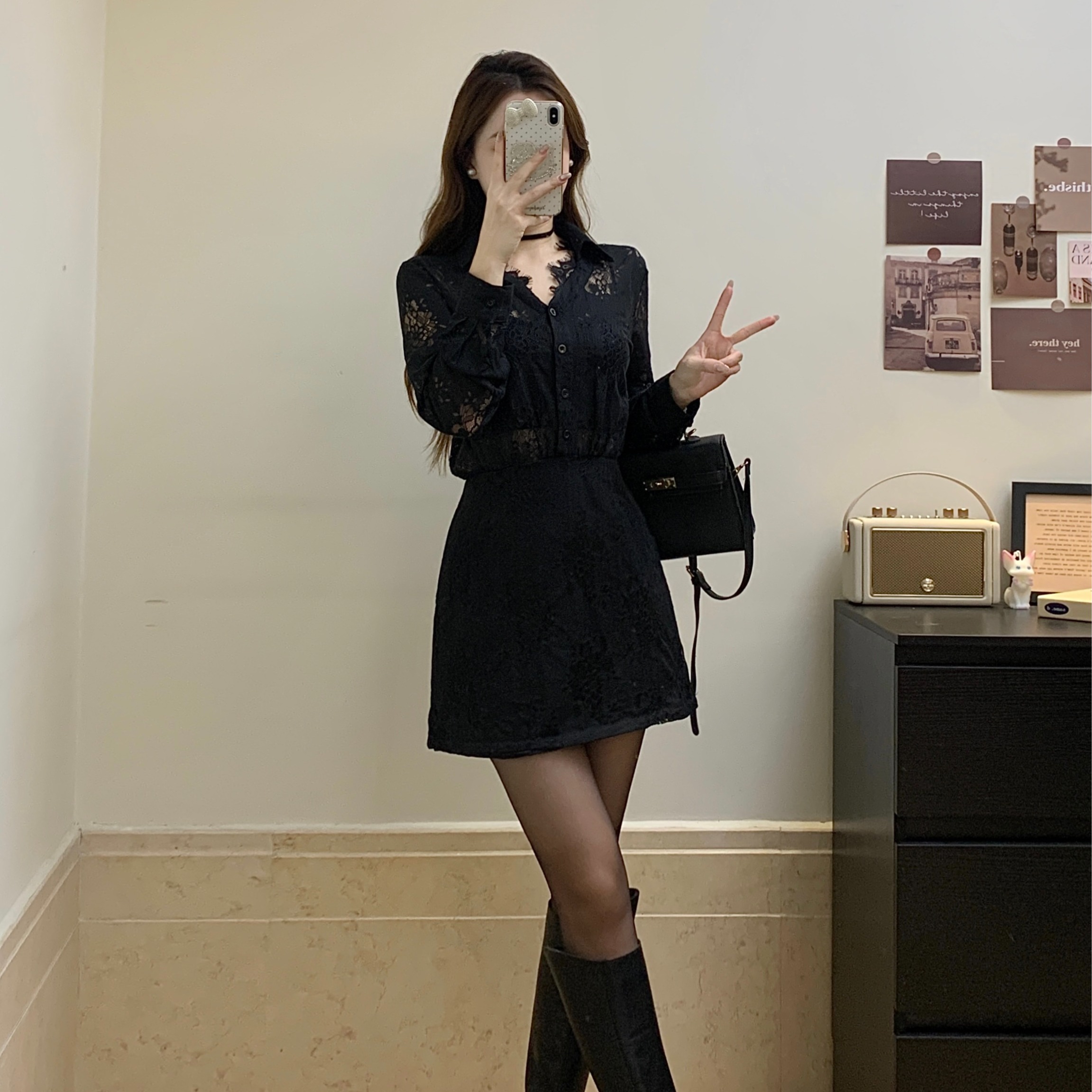 MY14767# 大码女装胖mm纯欲气质蕾丝镂空长袖V领秋冬修身显瘦小黑裙女裝貨源服裝批發