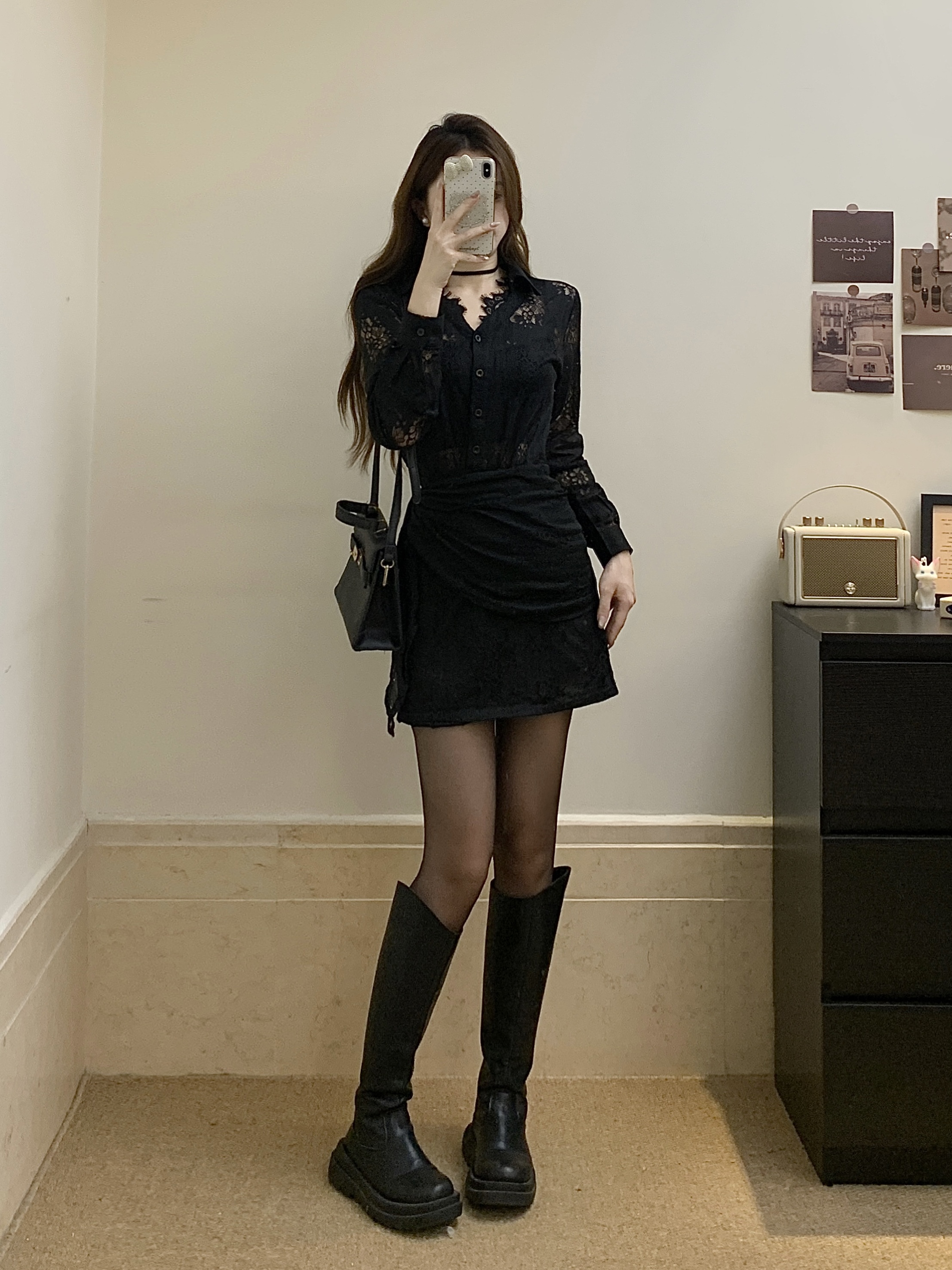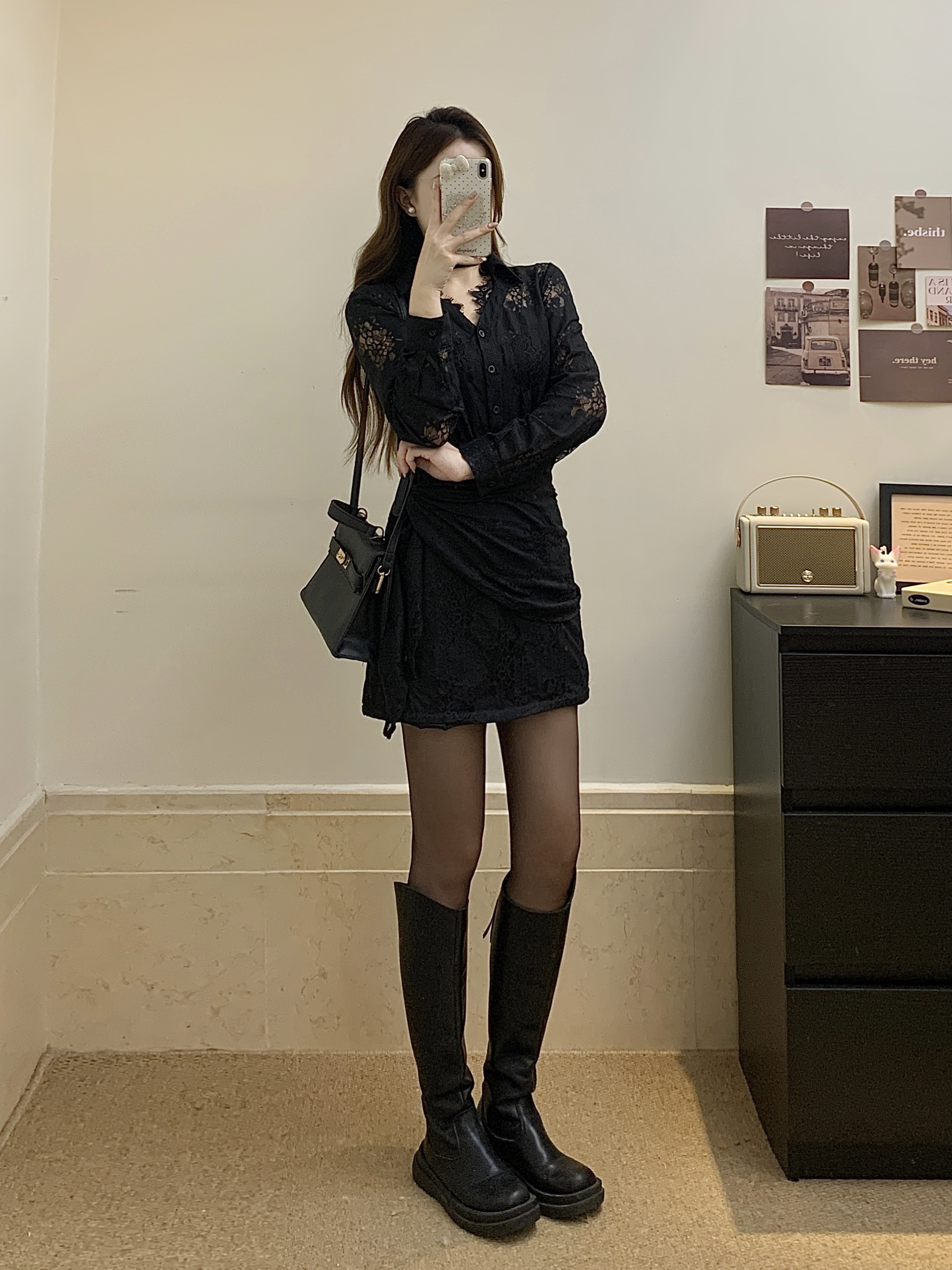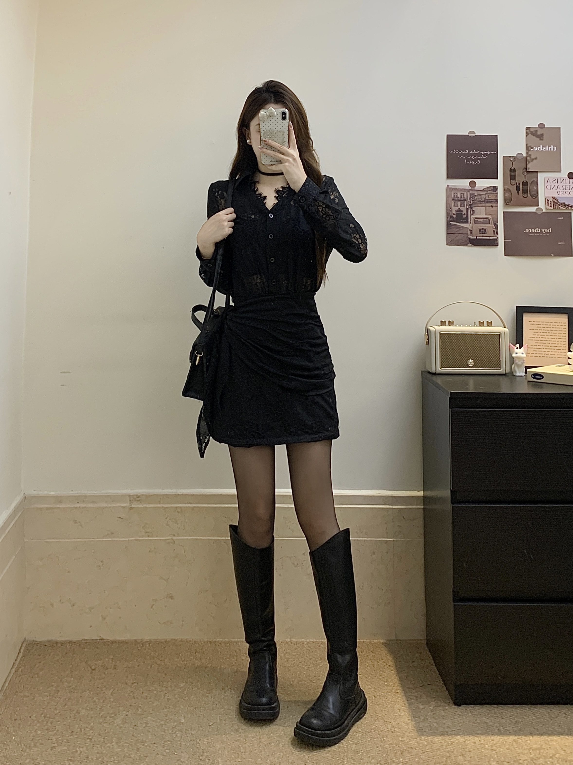 MY14767# 大码女装胖mm纯欲气质蕾丝镂空长袖V领秋冬修身显瘦小黑裙女裝貨源服裝批發