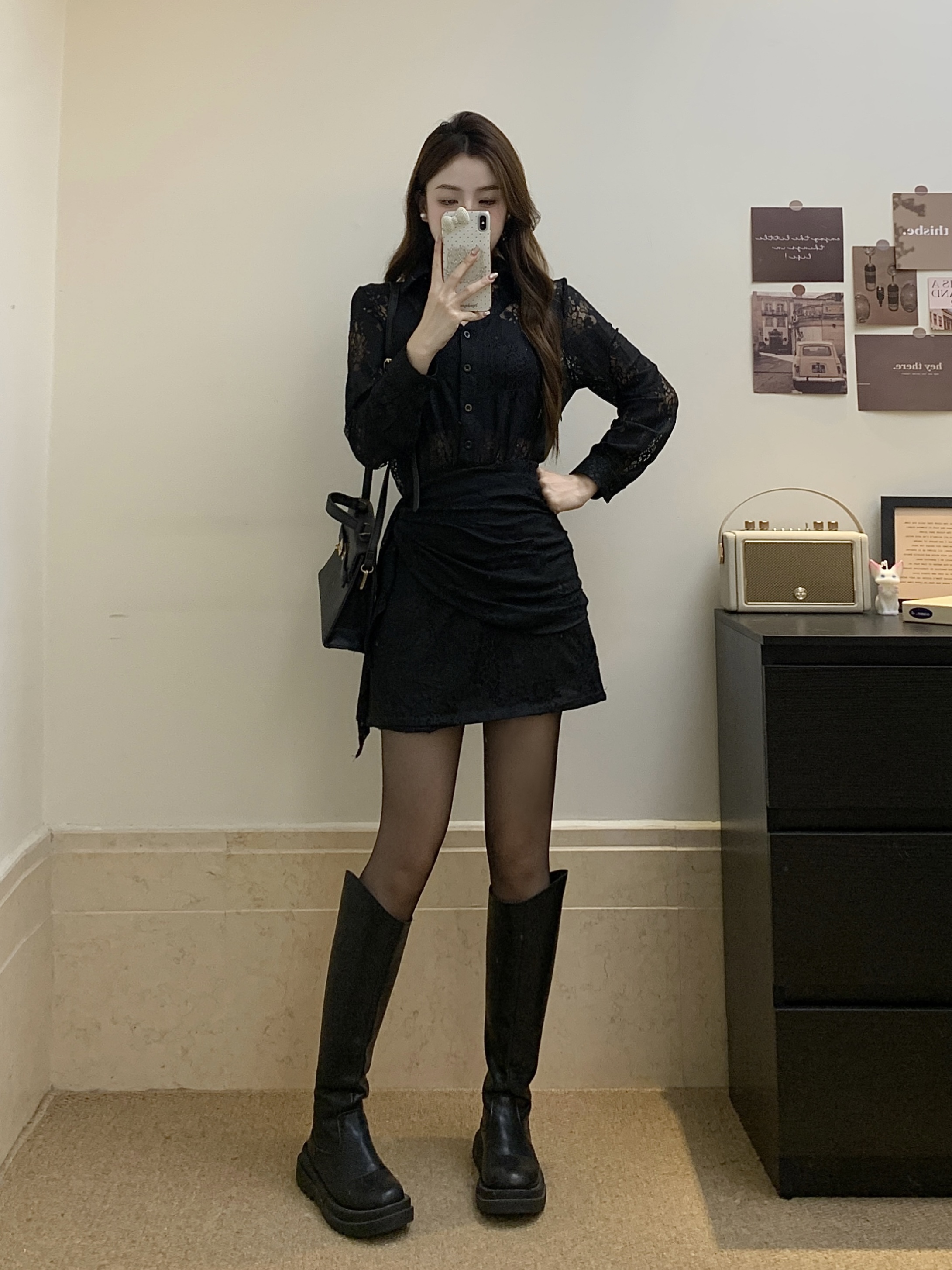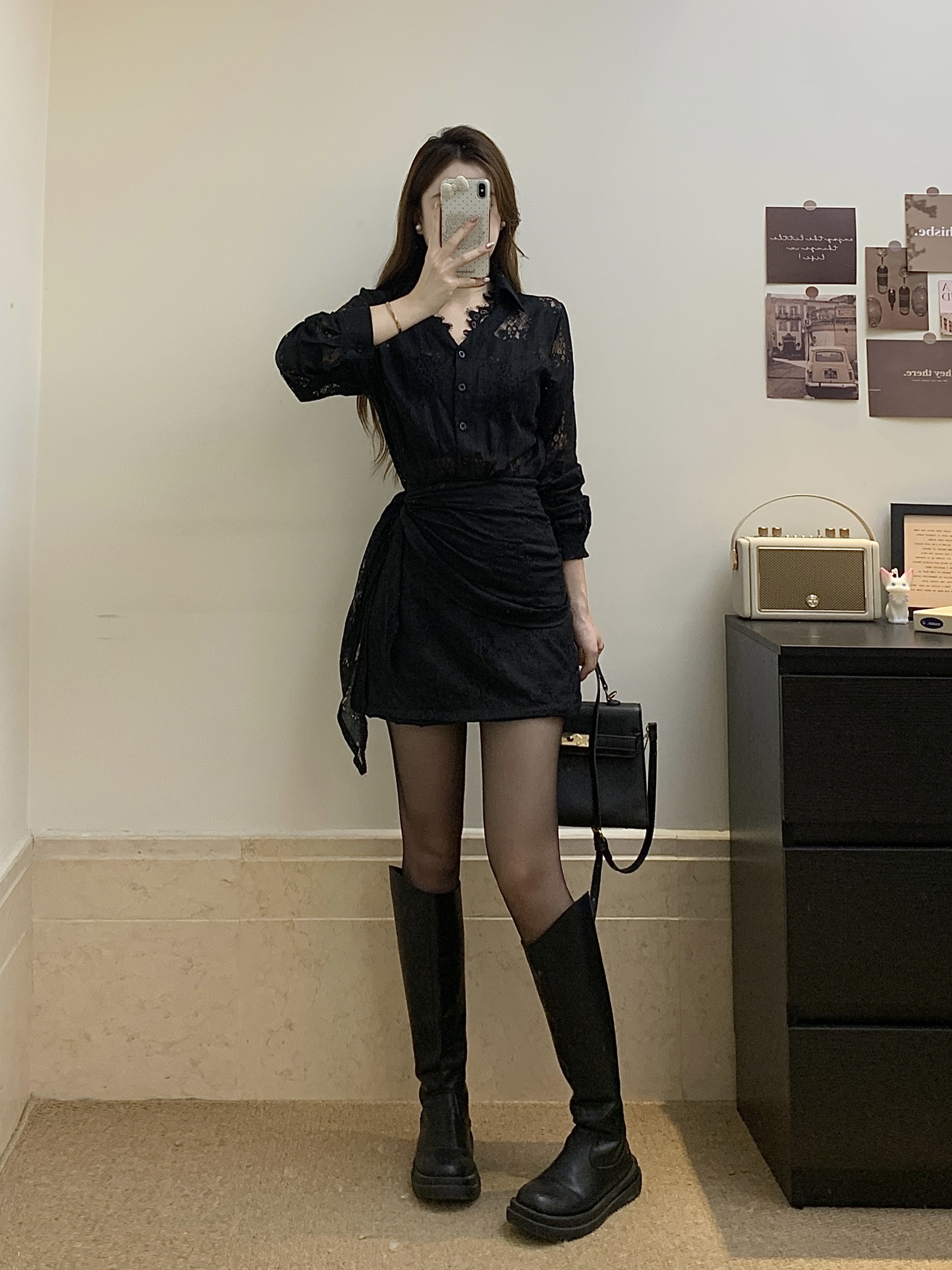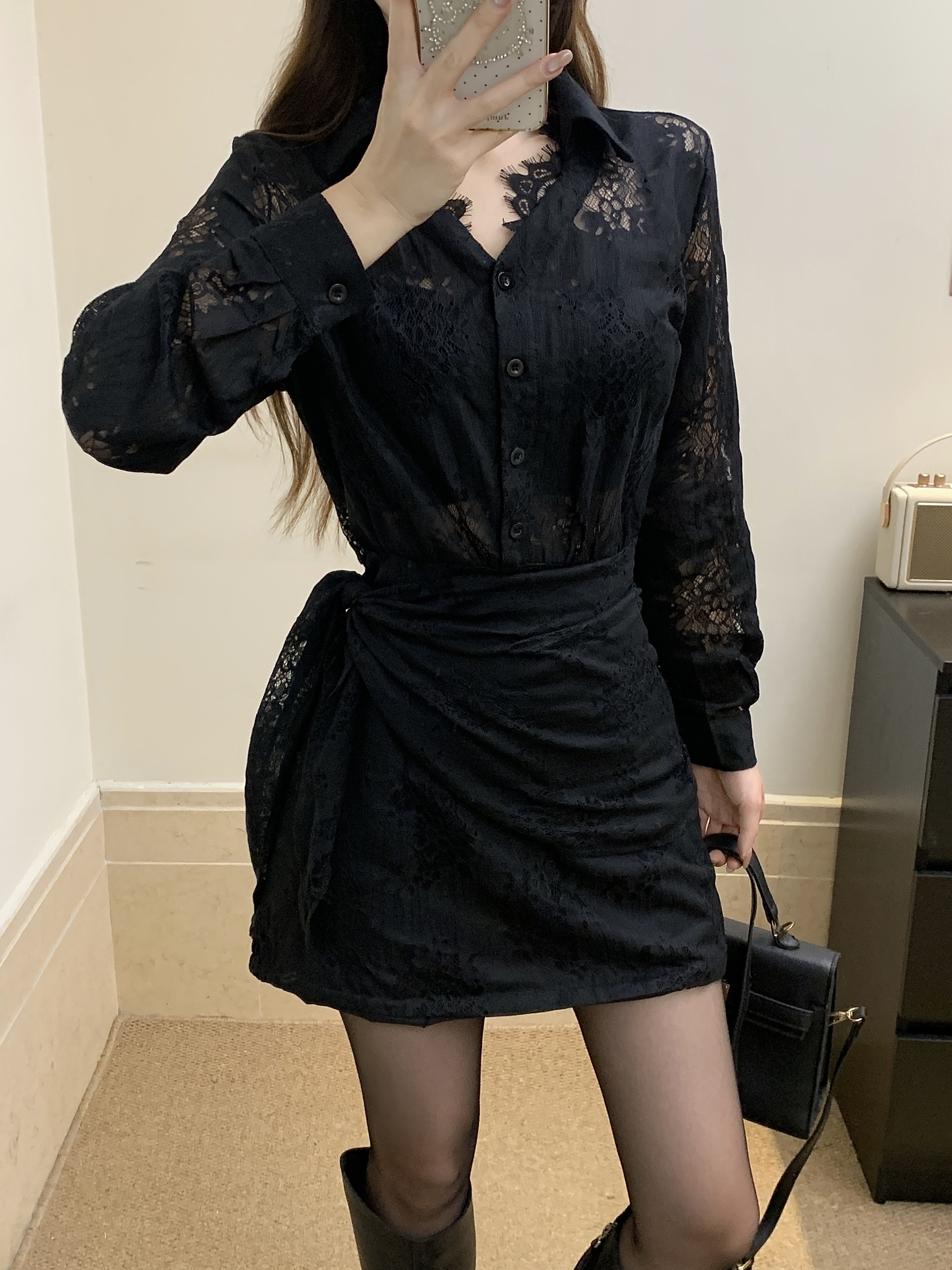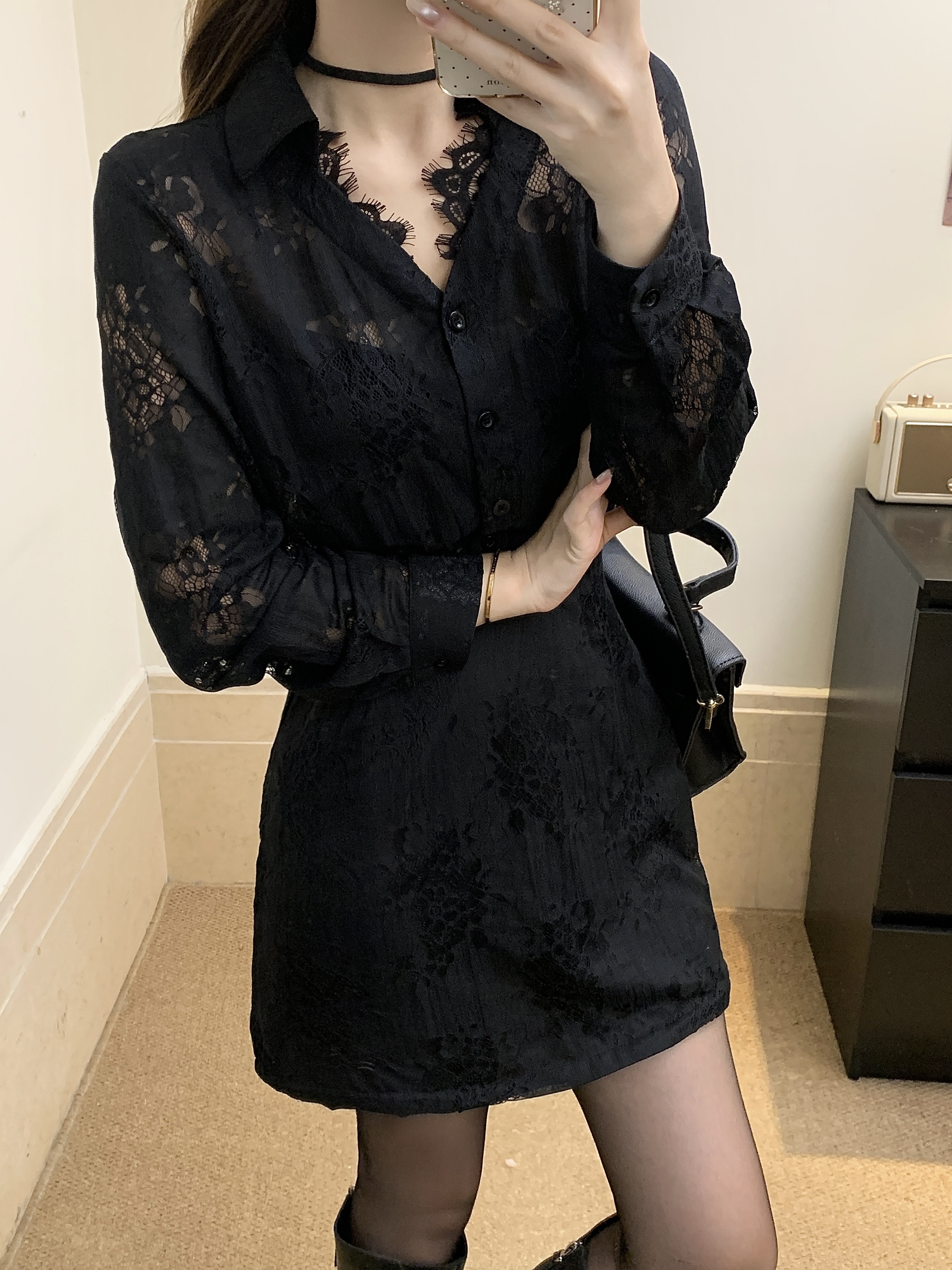 MY14767# 大码女装胖mm纯欲气质蕾丝镂空长袖V领秋冬修身显瘦小黑裙女裝貨源服裝批發