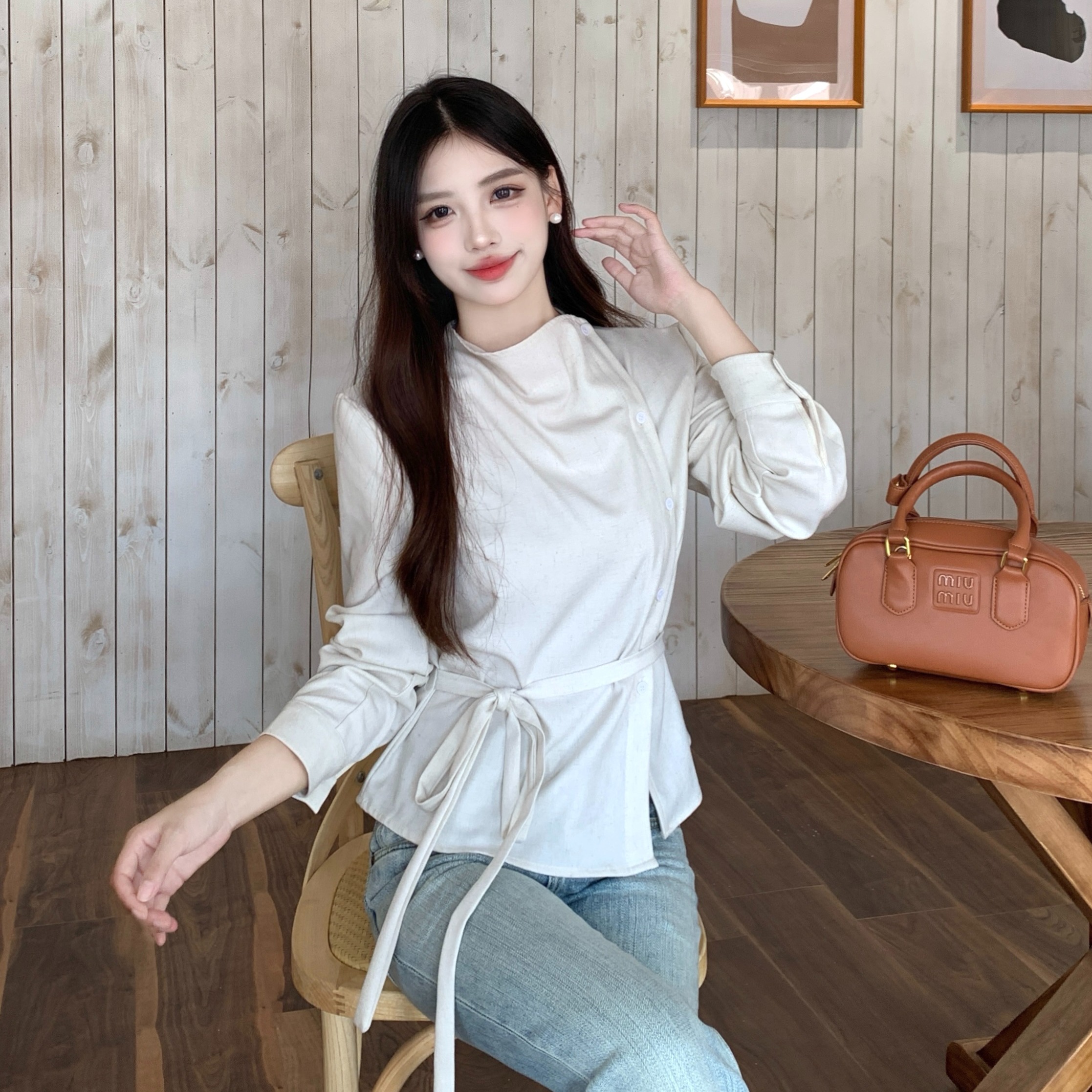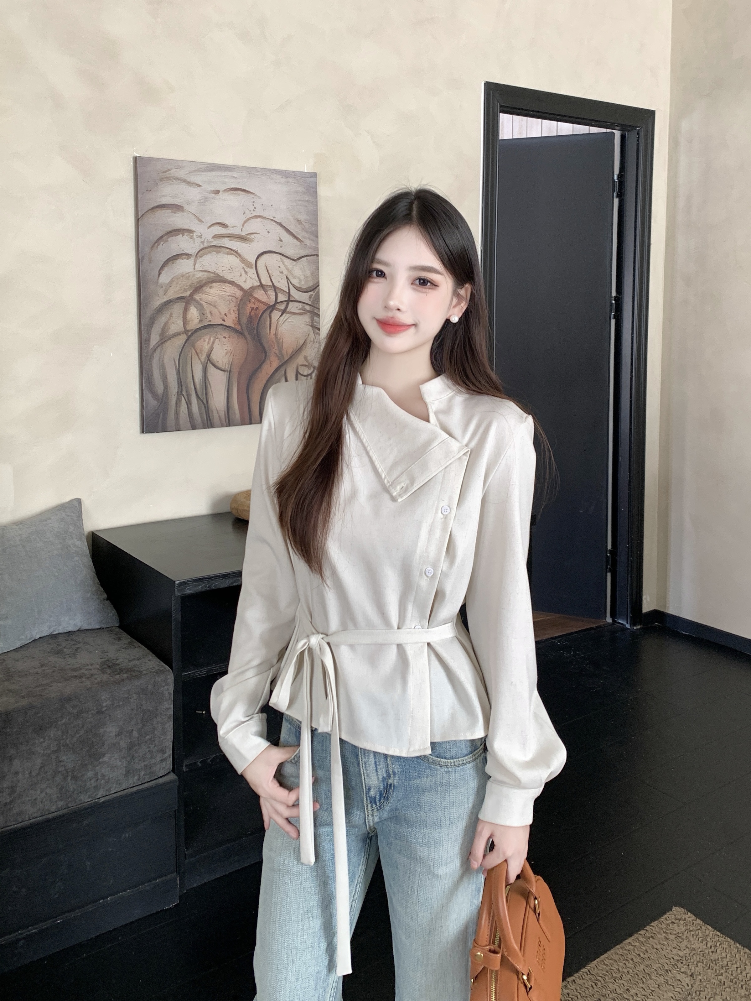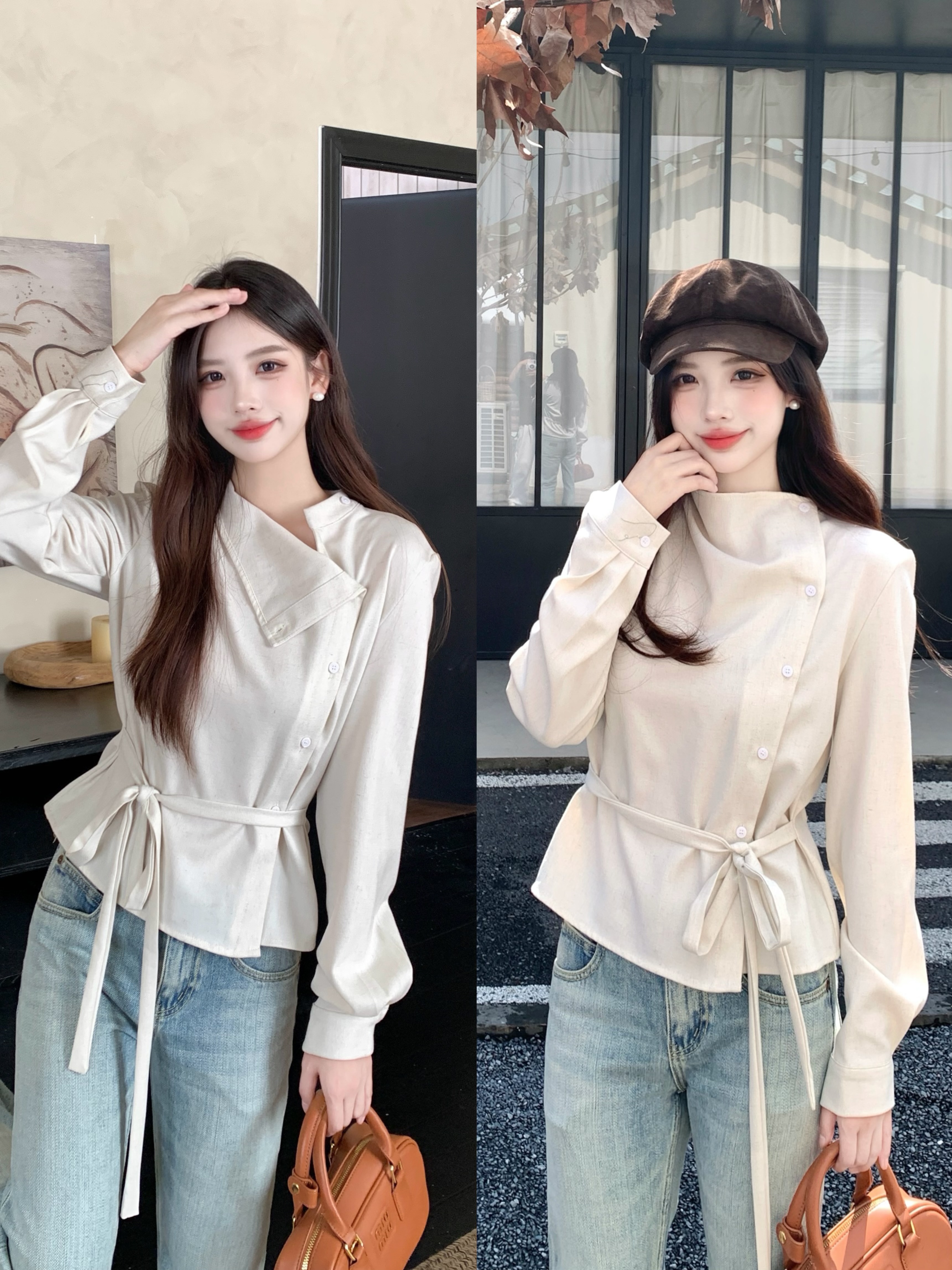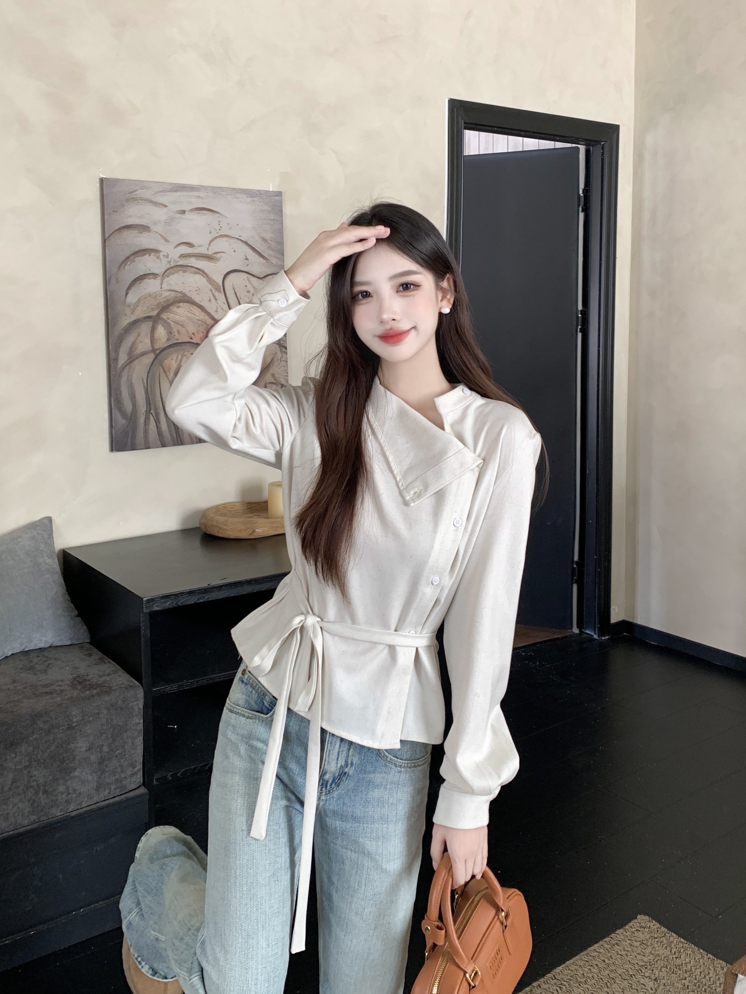 MY14768# 大码女装胖mm轻熟简约风不对称荡领衬衫系带收腰显瘦上衣女裝貨源服裝批發