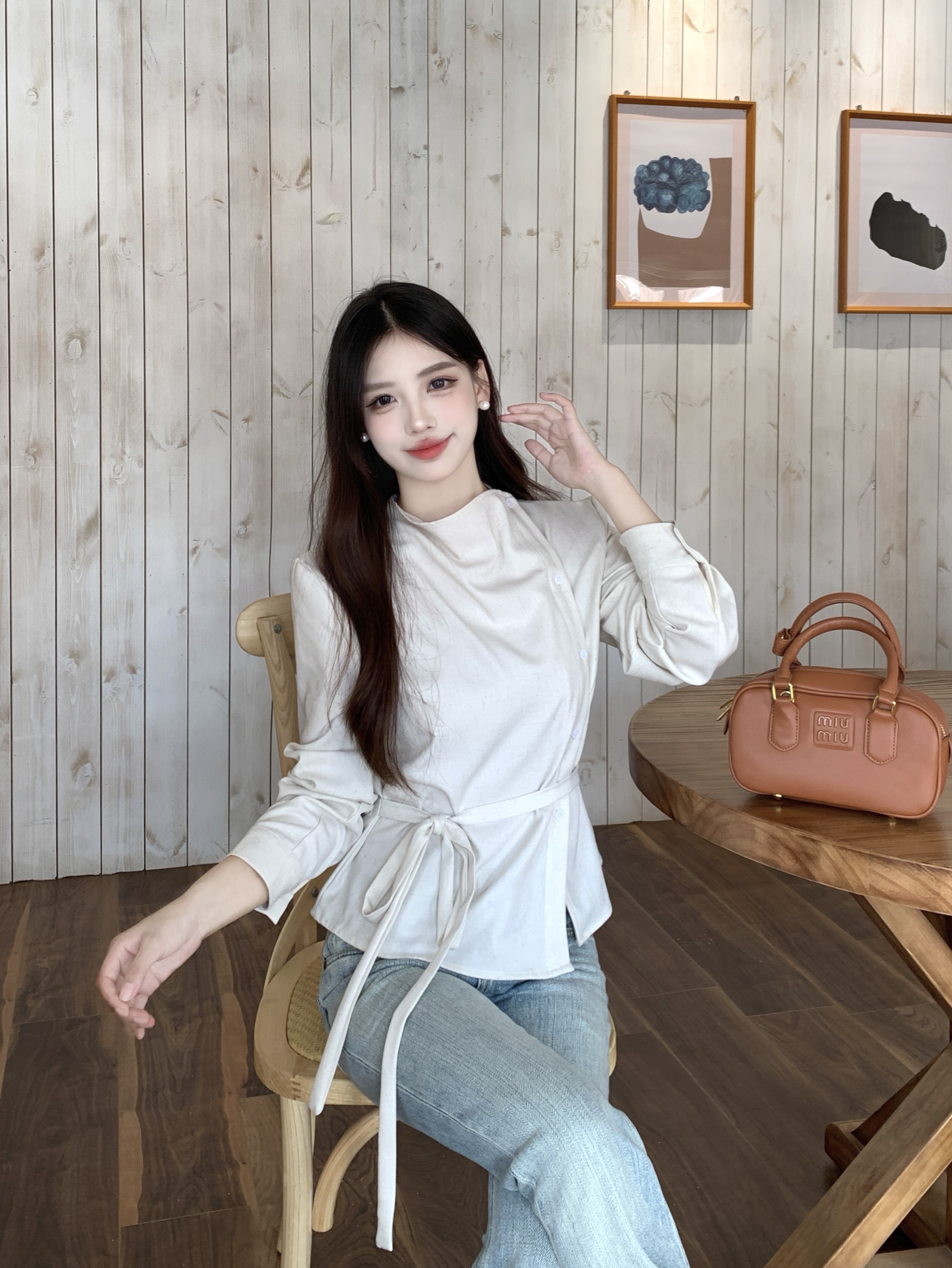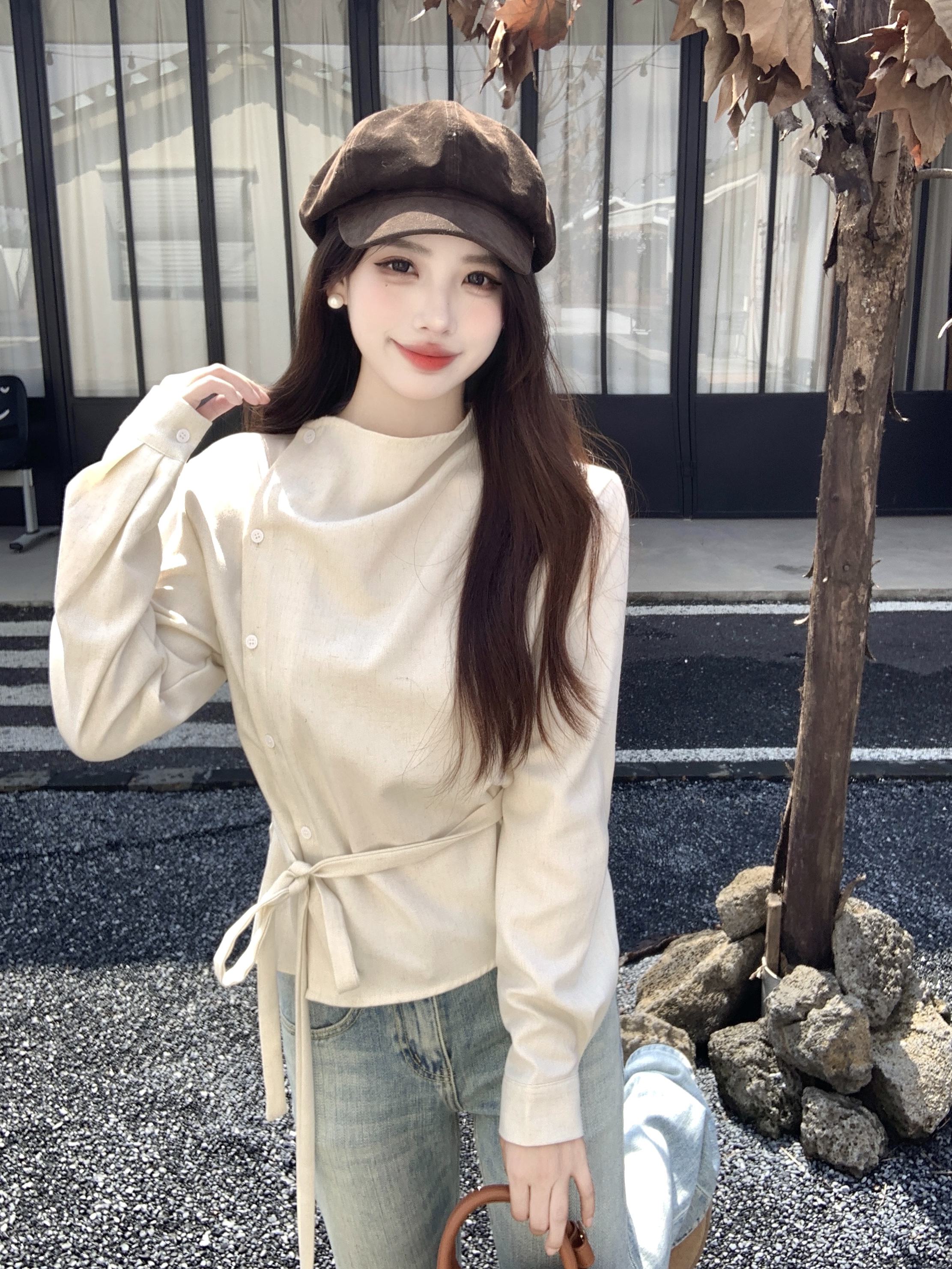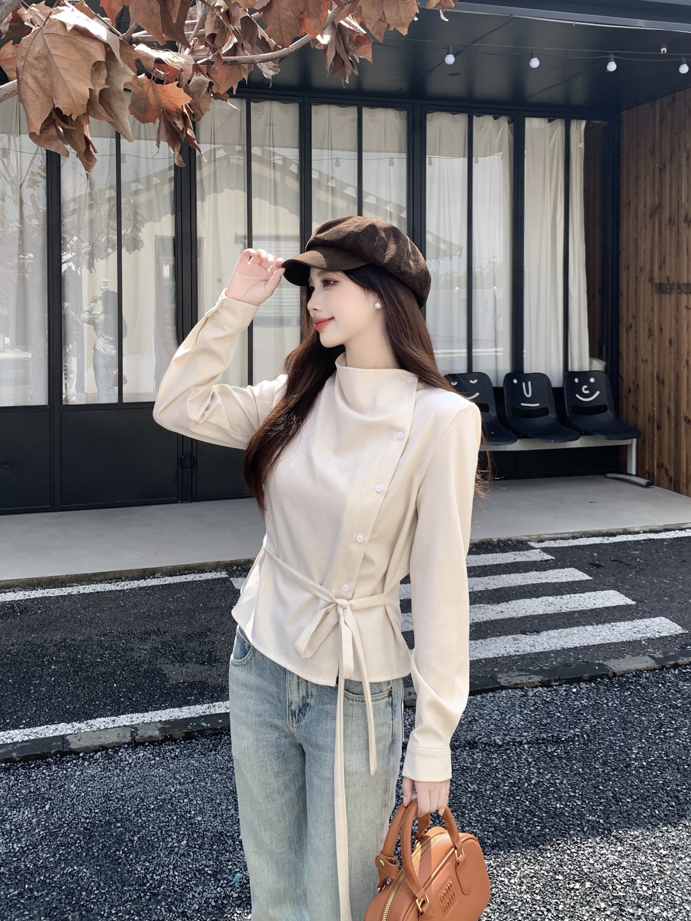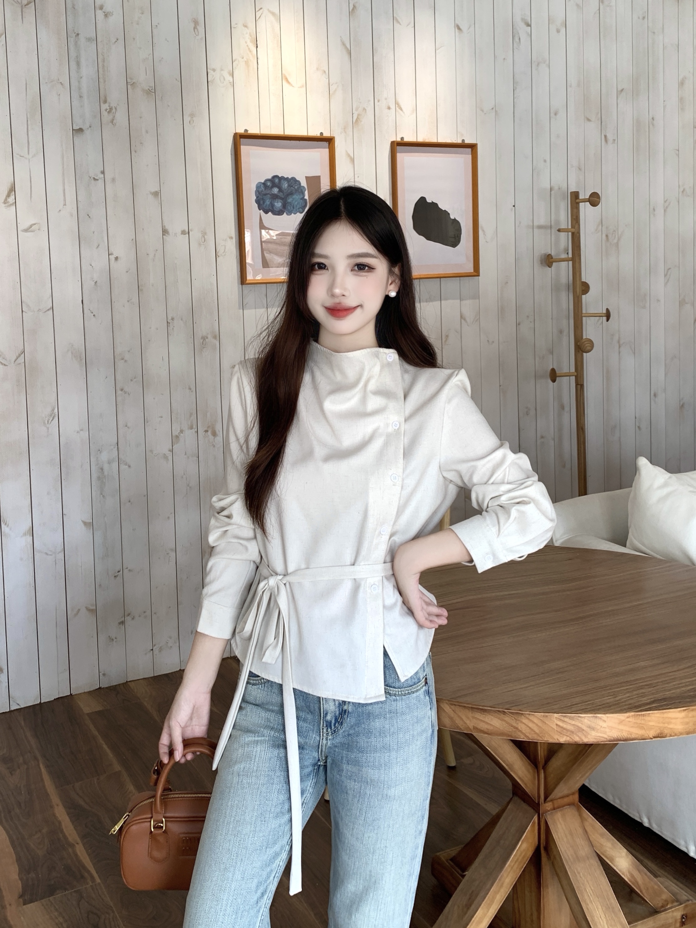MY14768# 大码女装胖mm轻熟简约风不对称荡领衬衫系带收腰显瘦上衣女裝貨源服裝批發