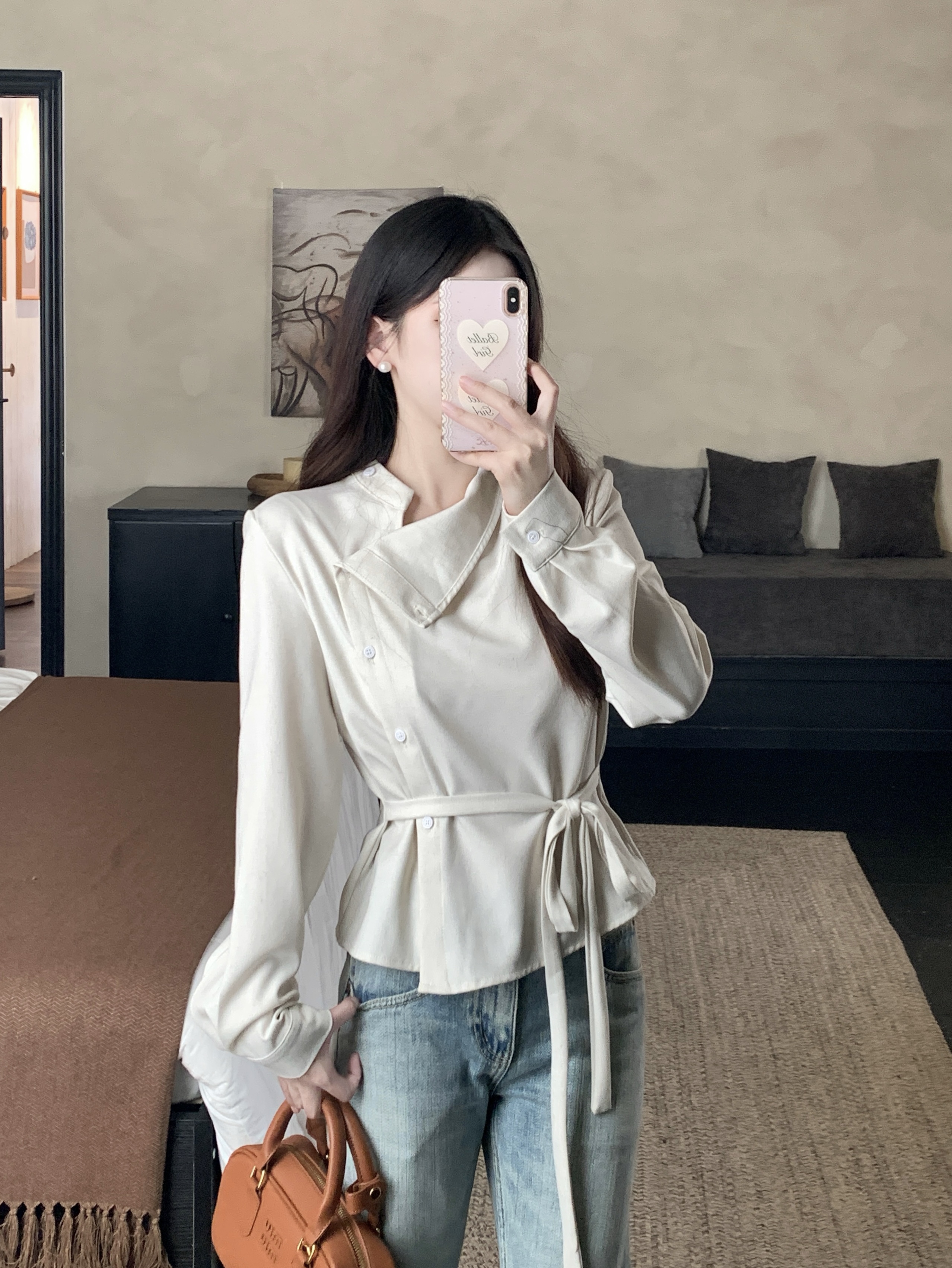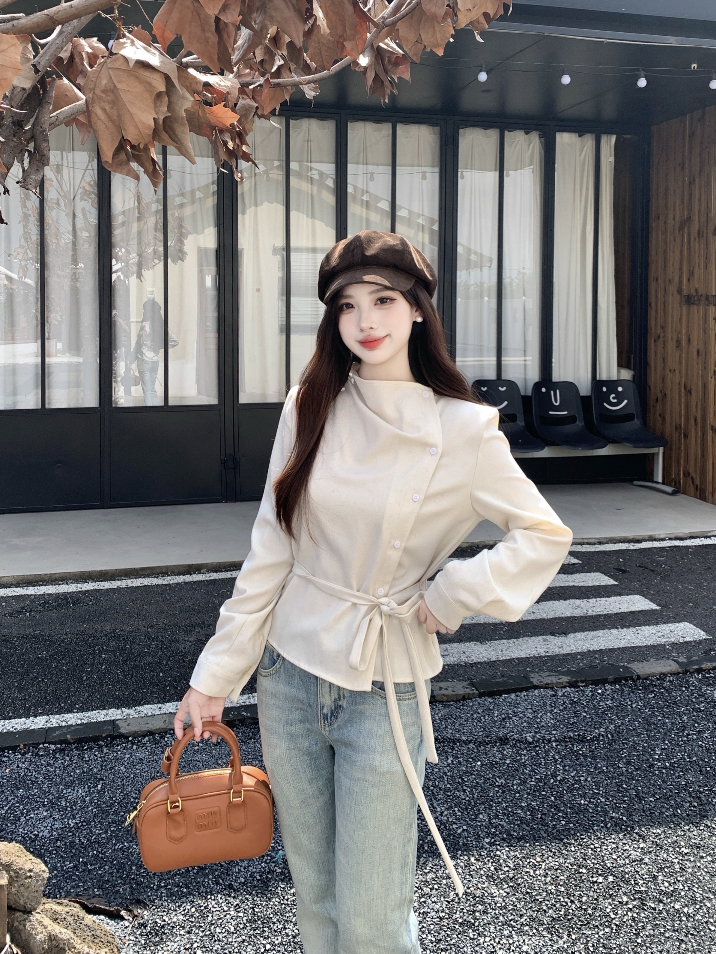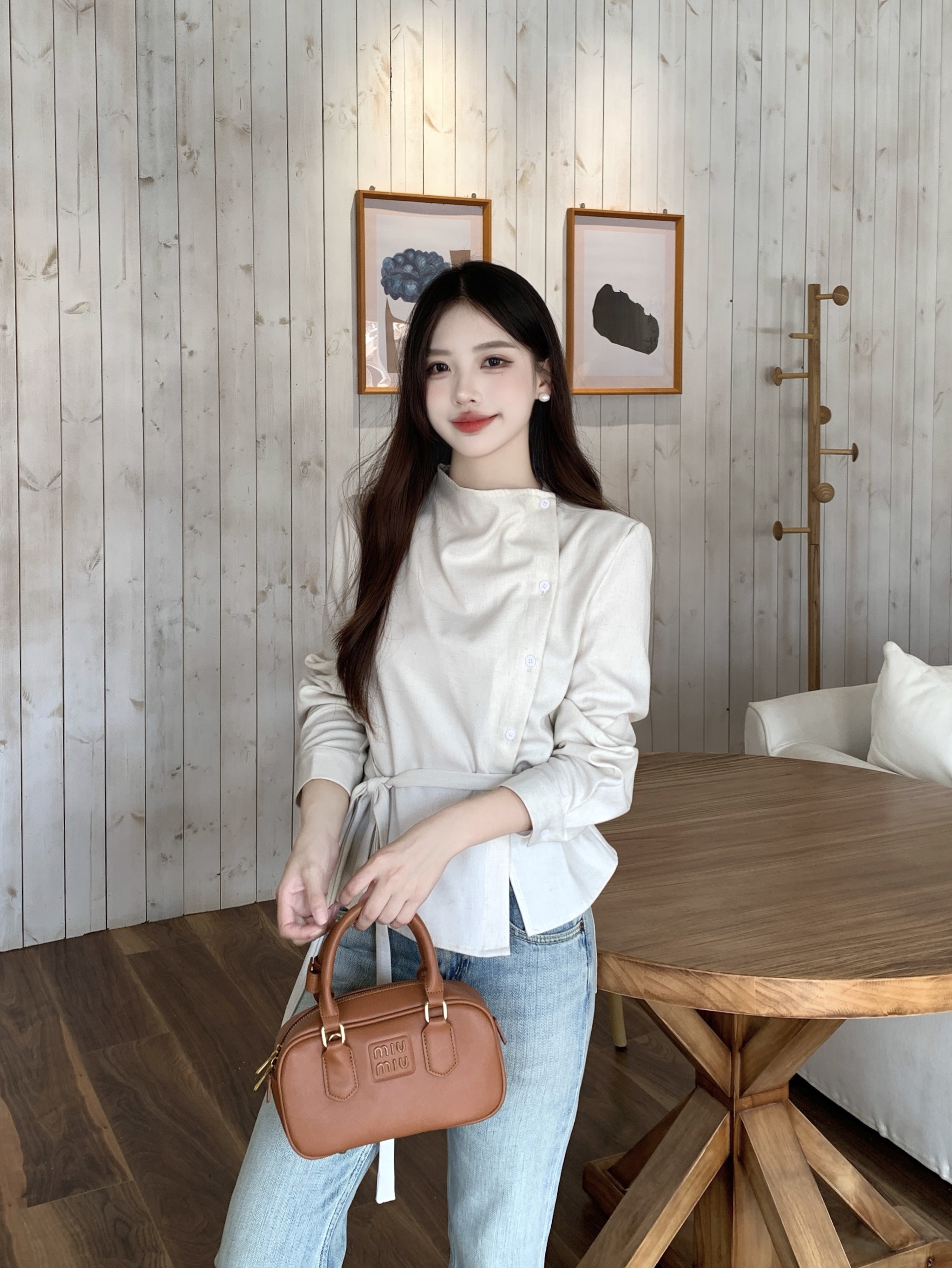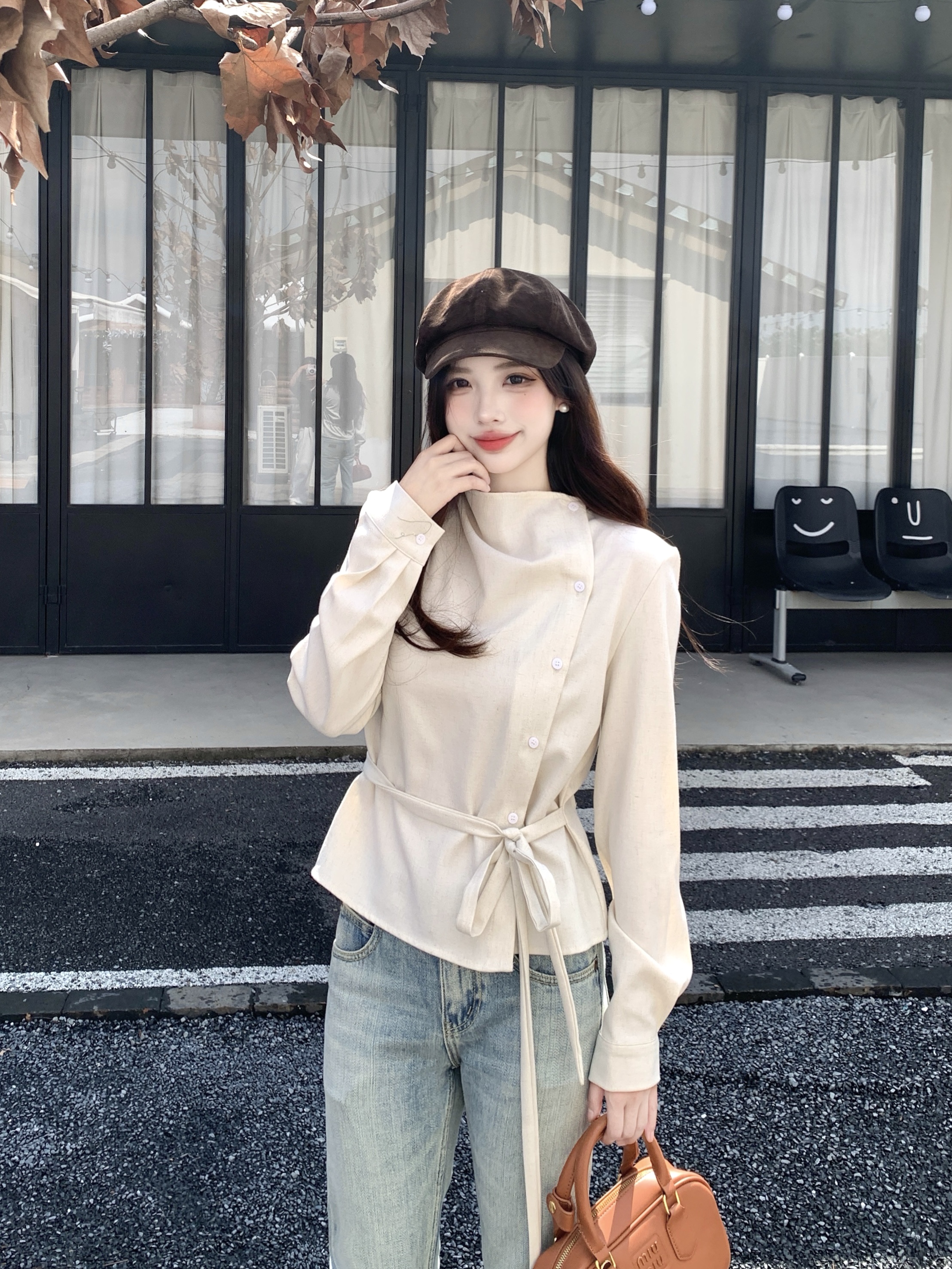 MY14768# 大码女装胖mm轻熟简约风不对称荡领衬衫系带收腰显瘦上衣女裝貨源服裝批發
