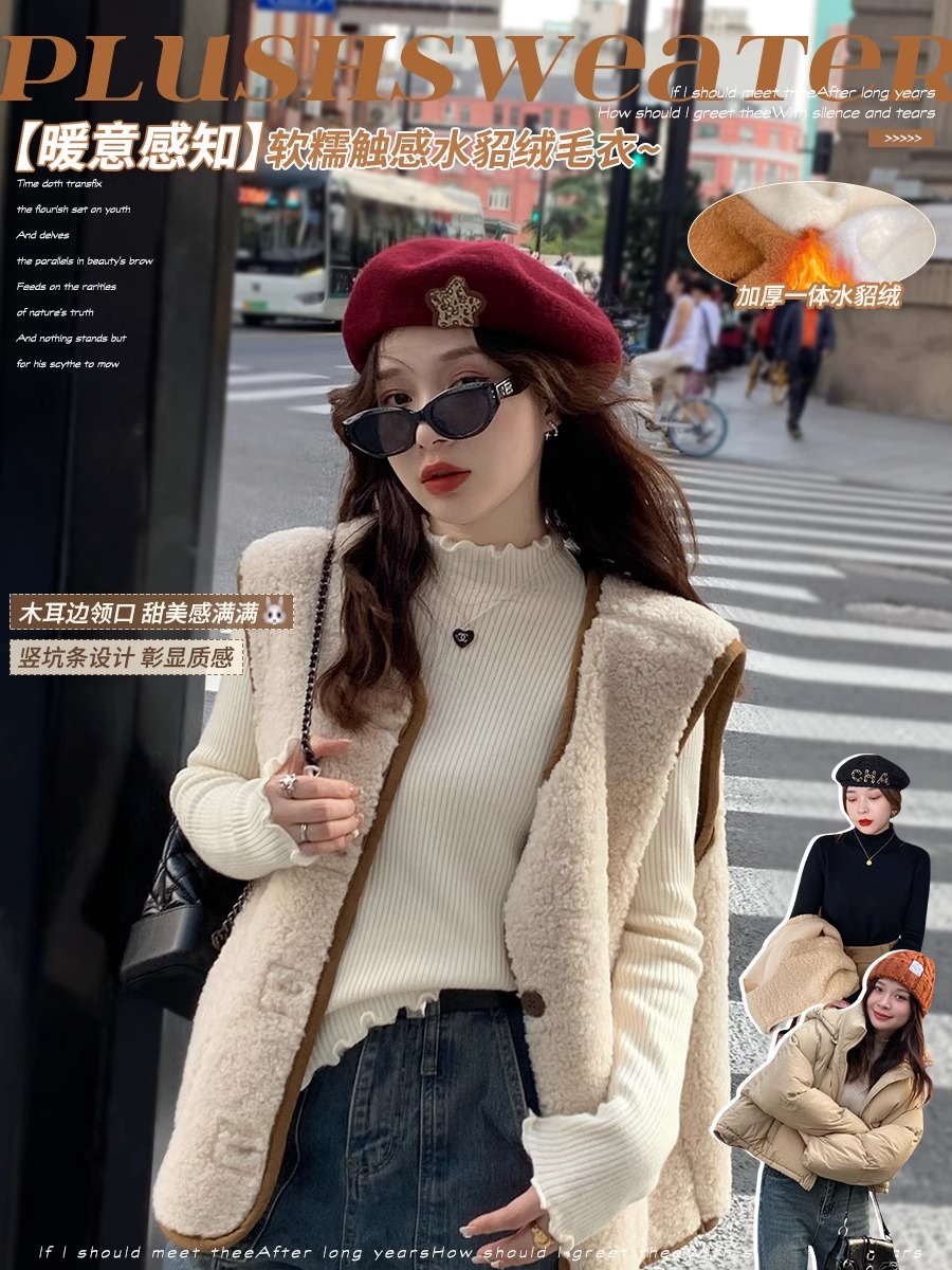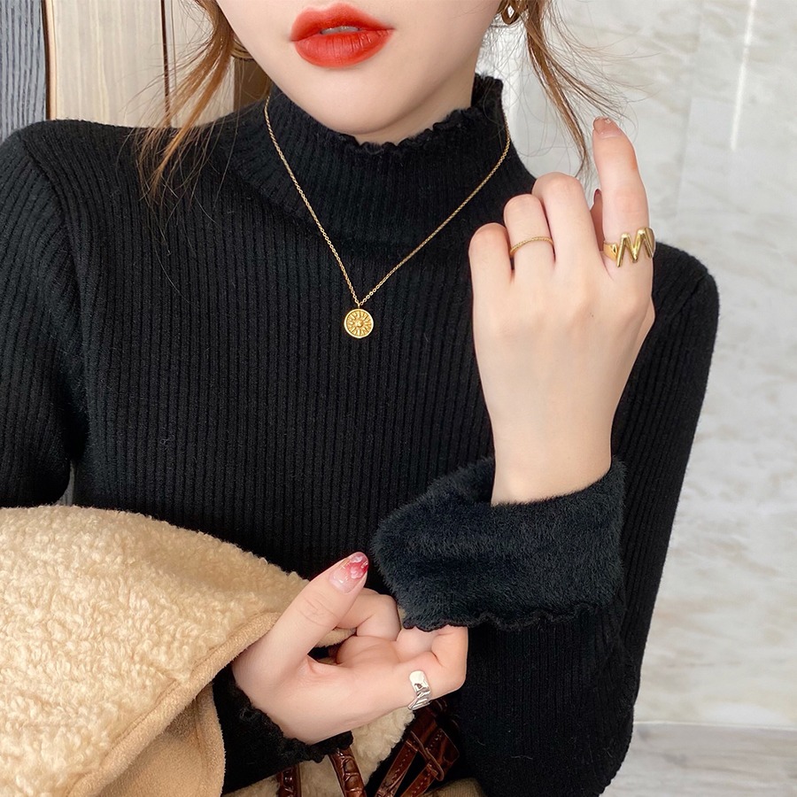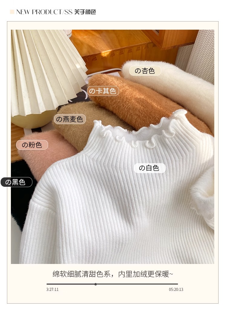 MY14795# 一体绒加绒加厚打底衫女高级感木耳边毛衣内搭冬季半高领毛衣女裝貨源服裝批發