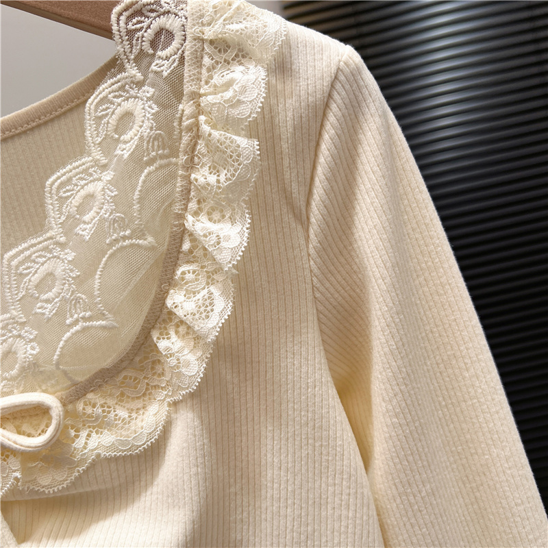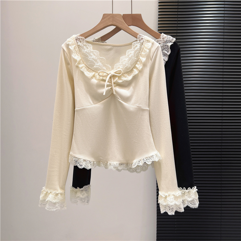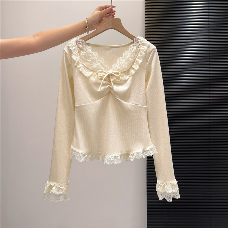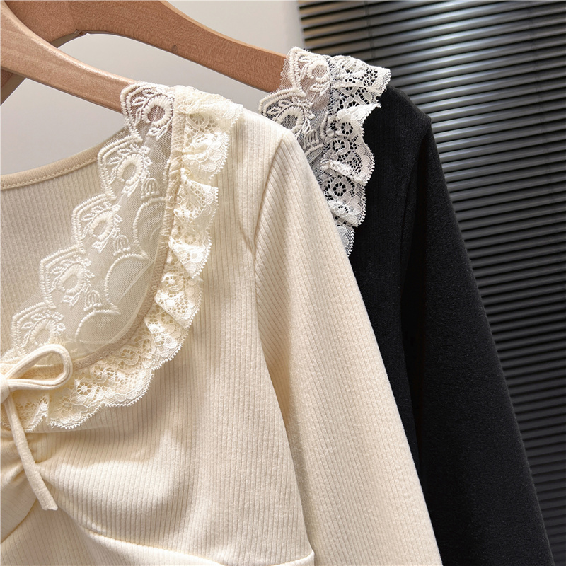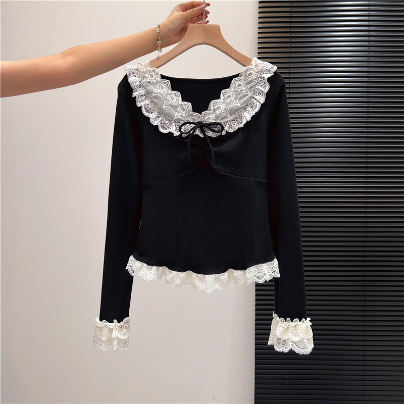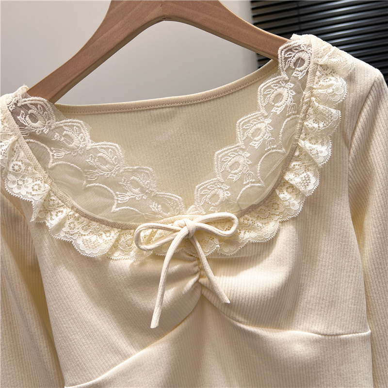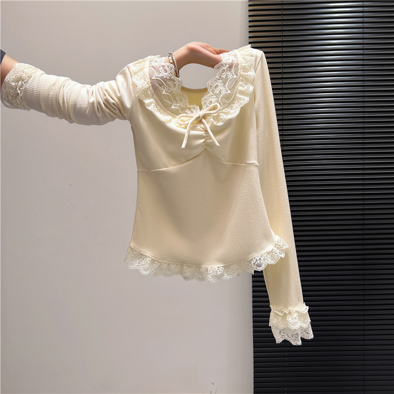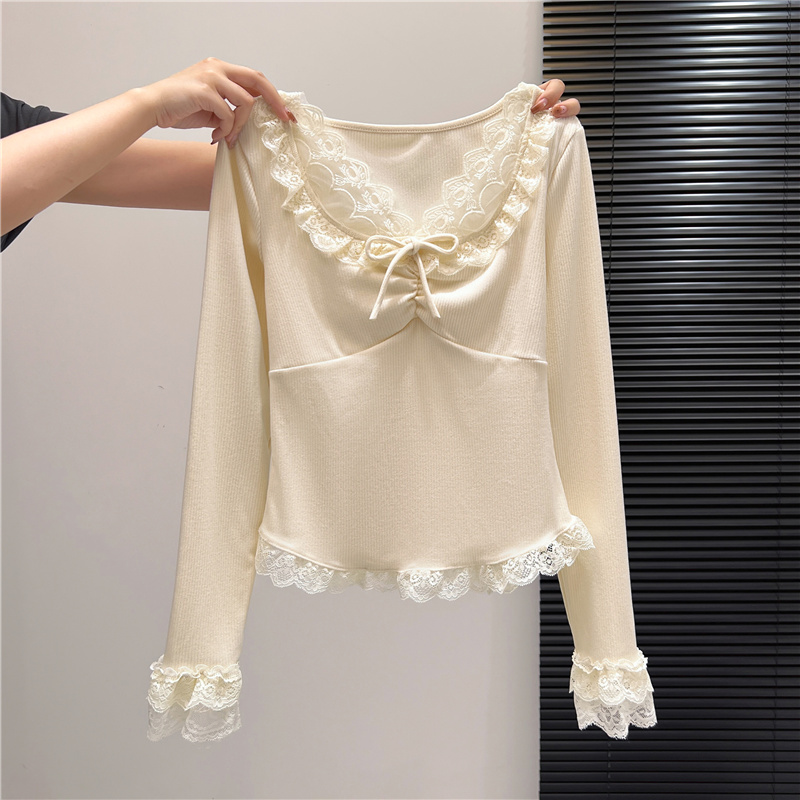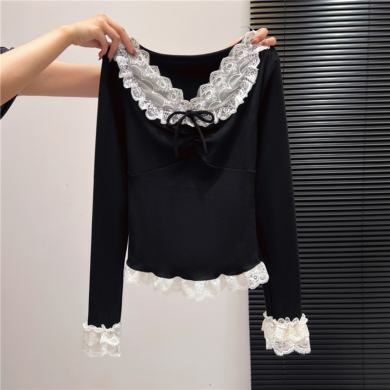 MY14805# 纯欲蝴蝶结蕾丝v领磨毛打底衫女秋冬修身绝美上衣设计感小众女裝貨源服裝批發