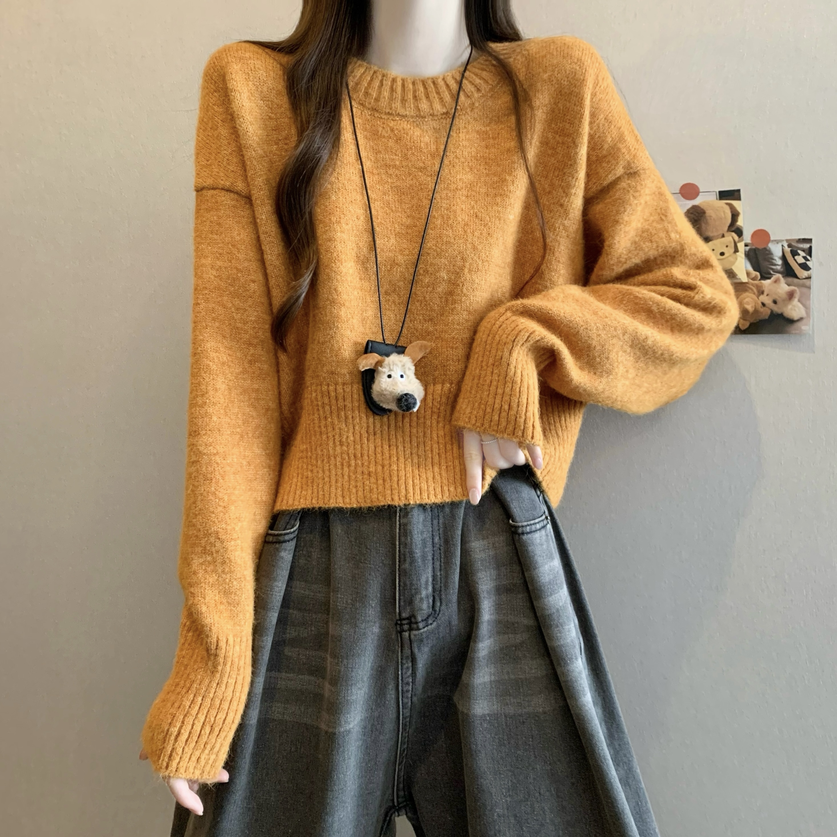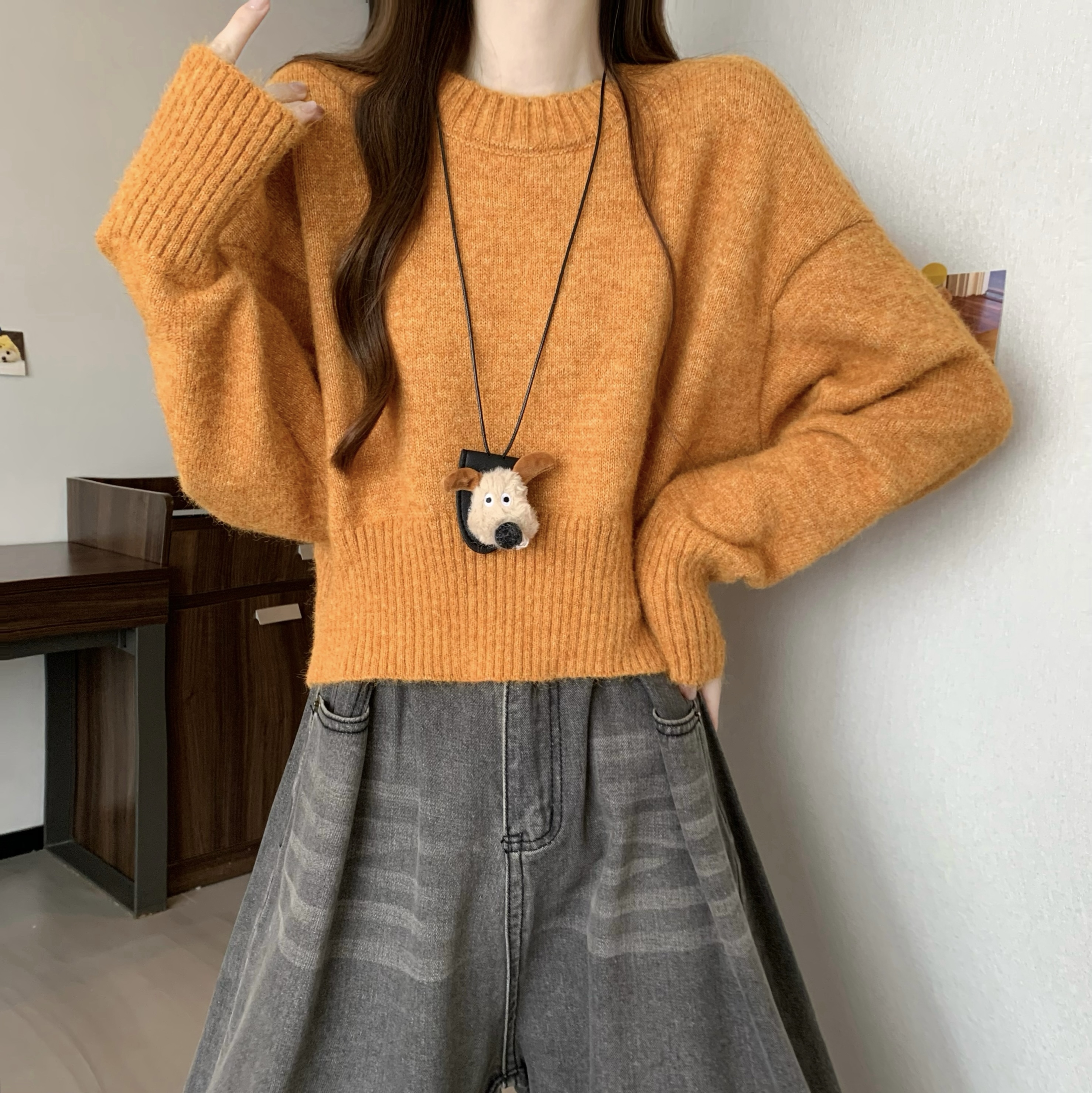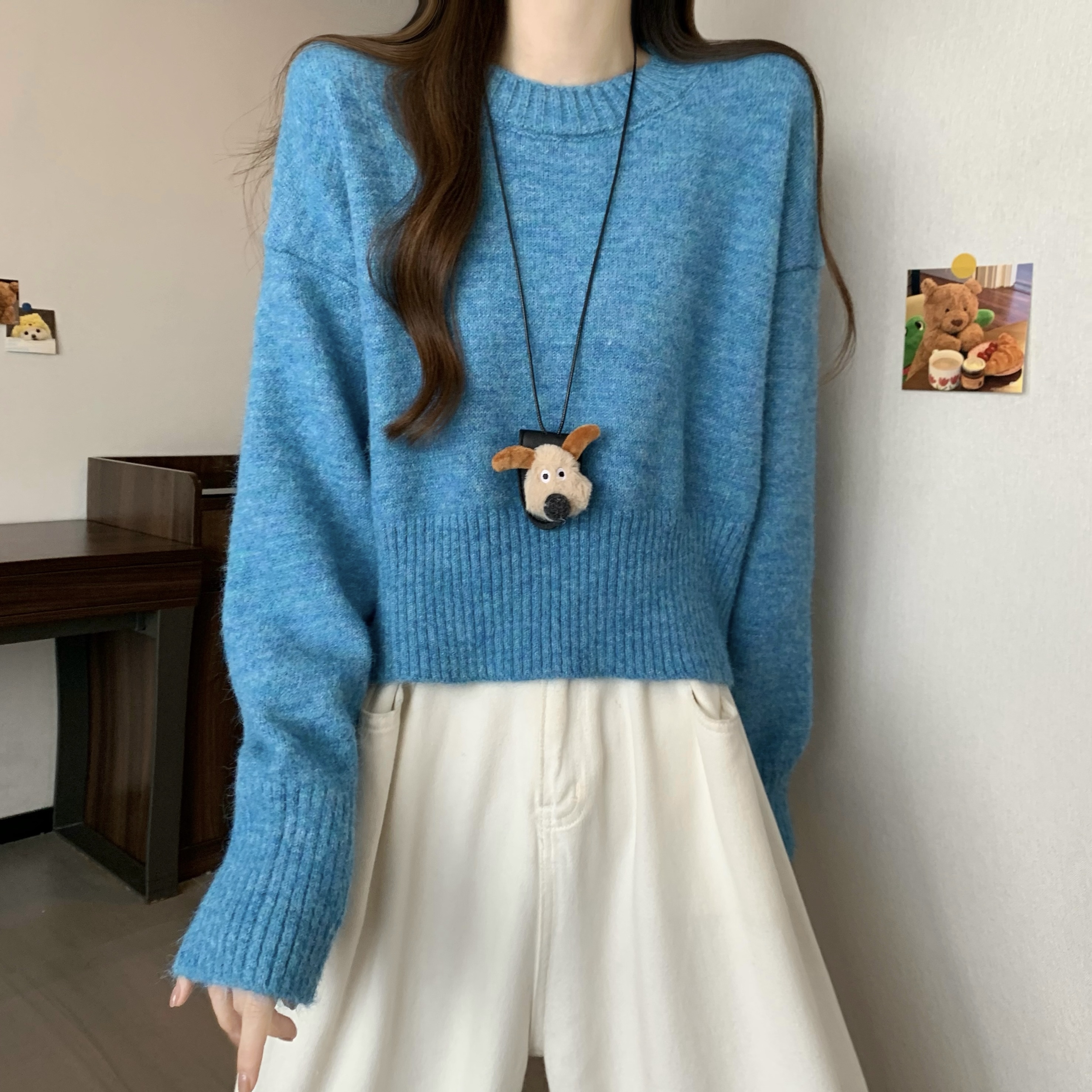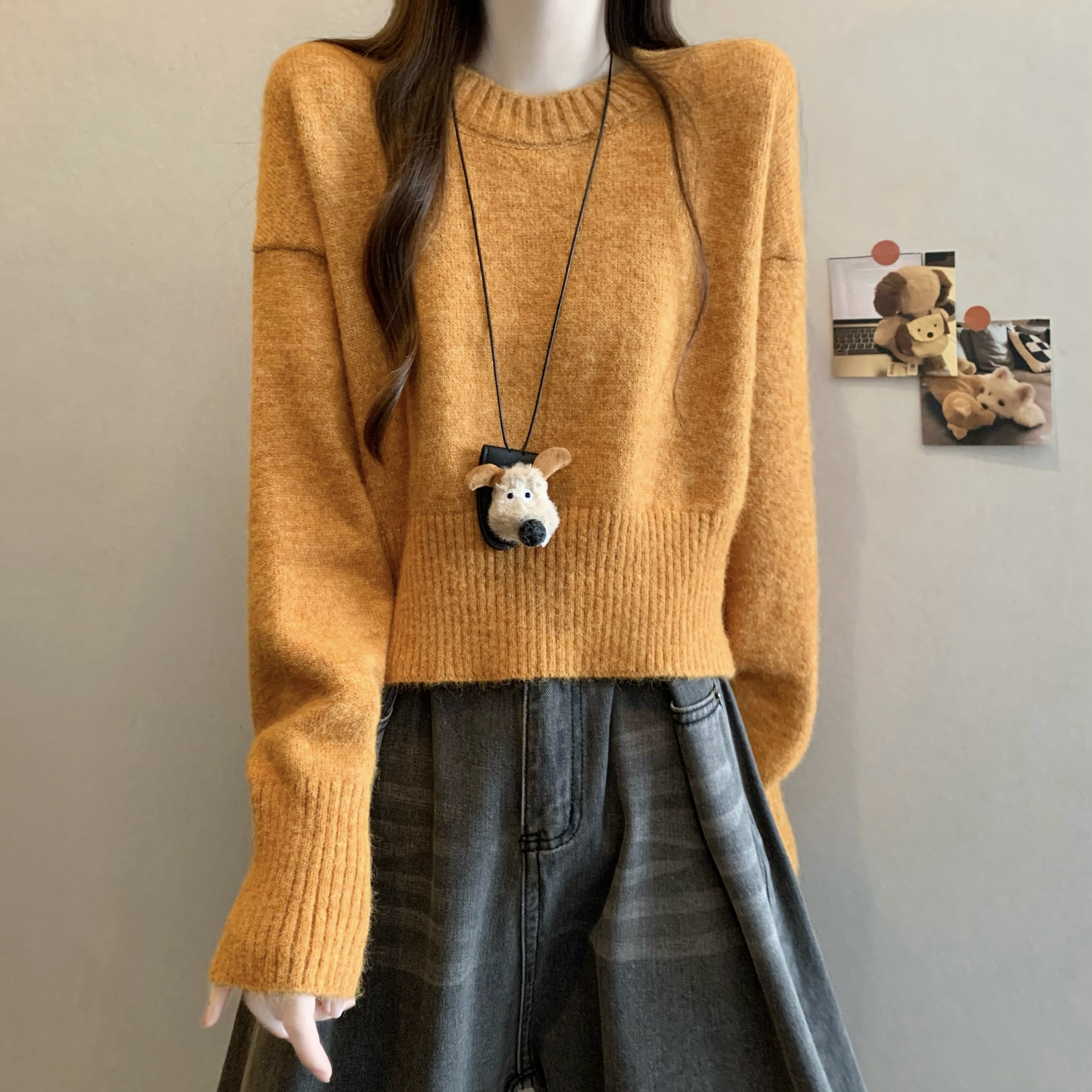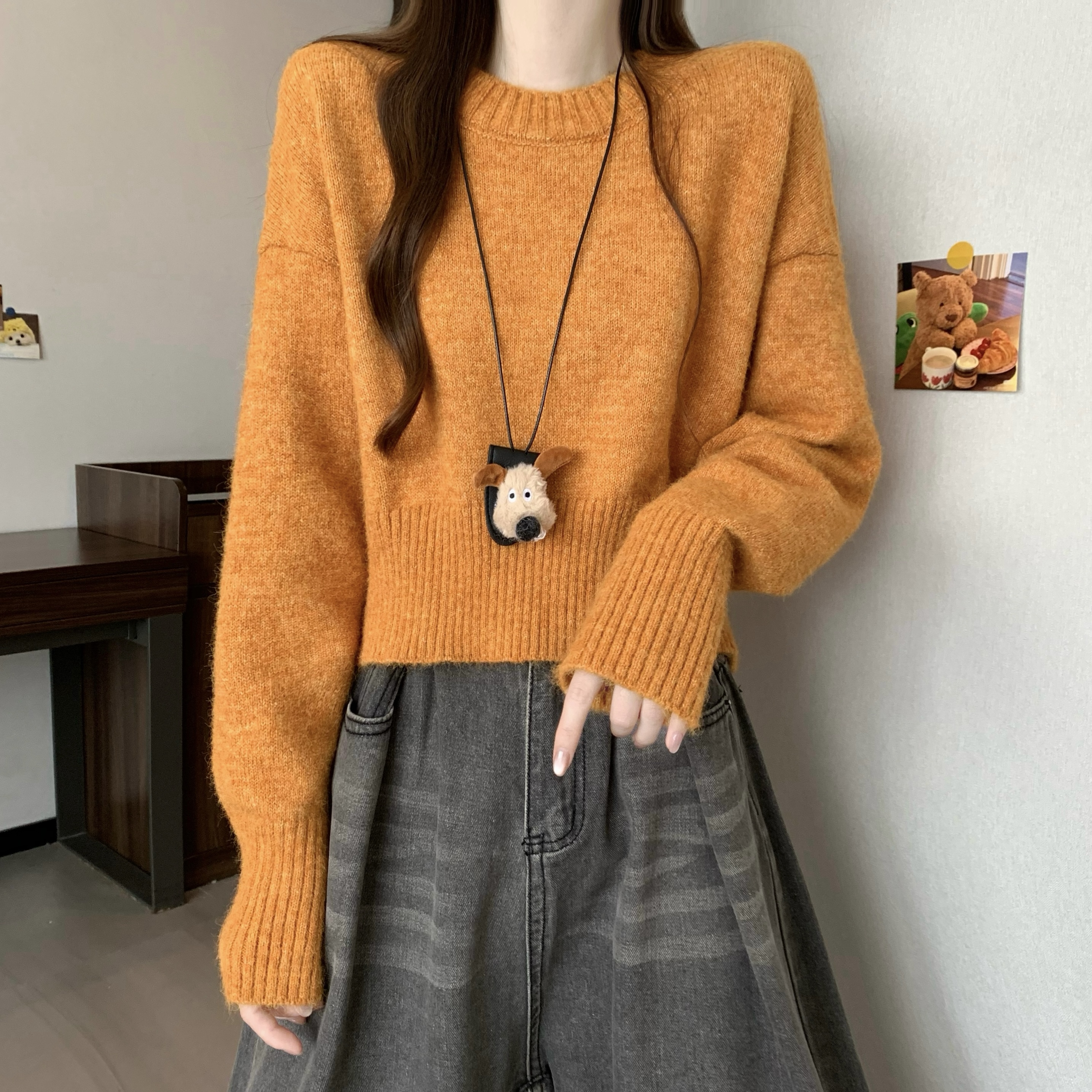 MY14809# 新版韩风设计感纯色圆领针织短款毛衣女裝貨源服裝批發