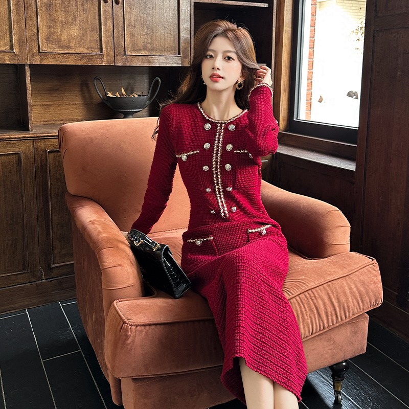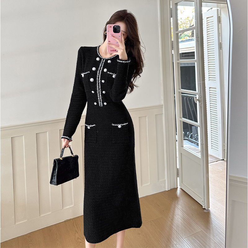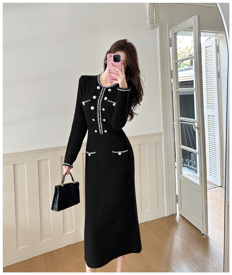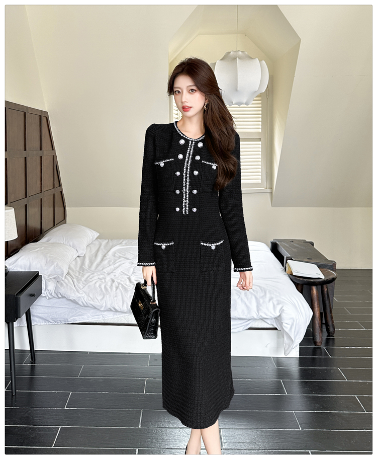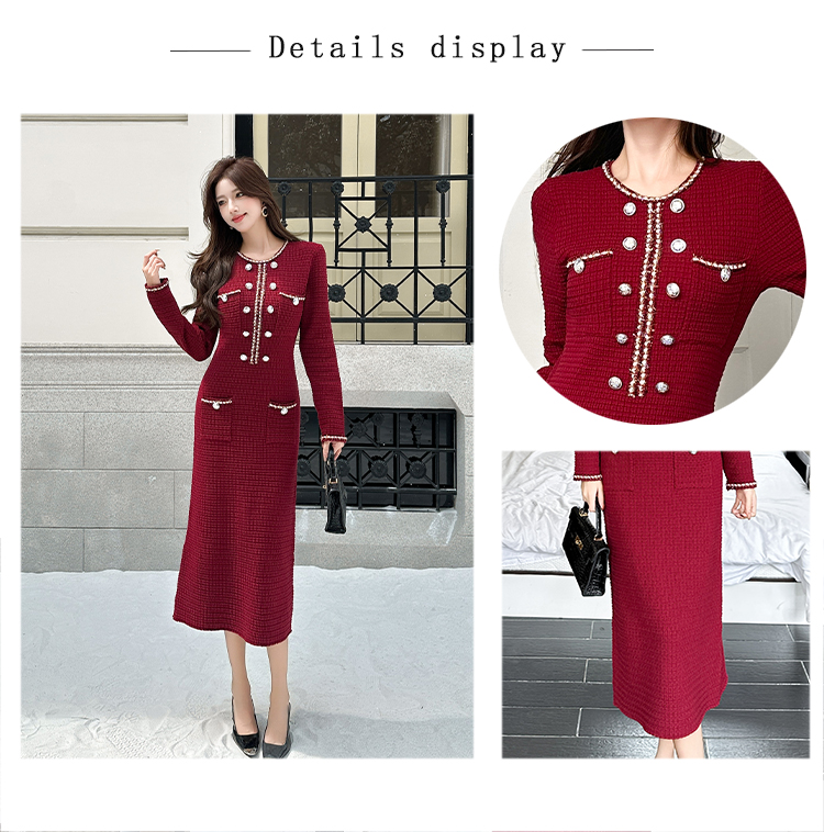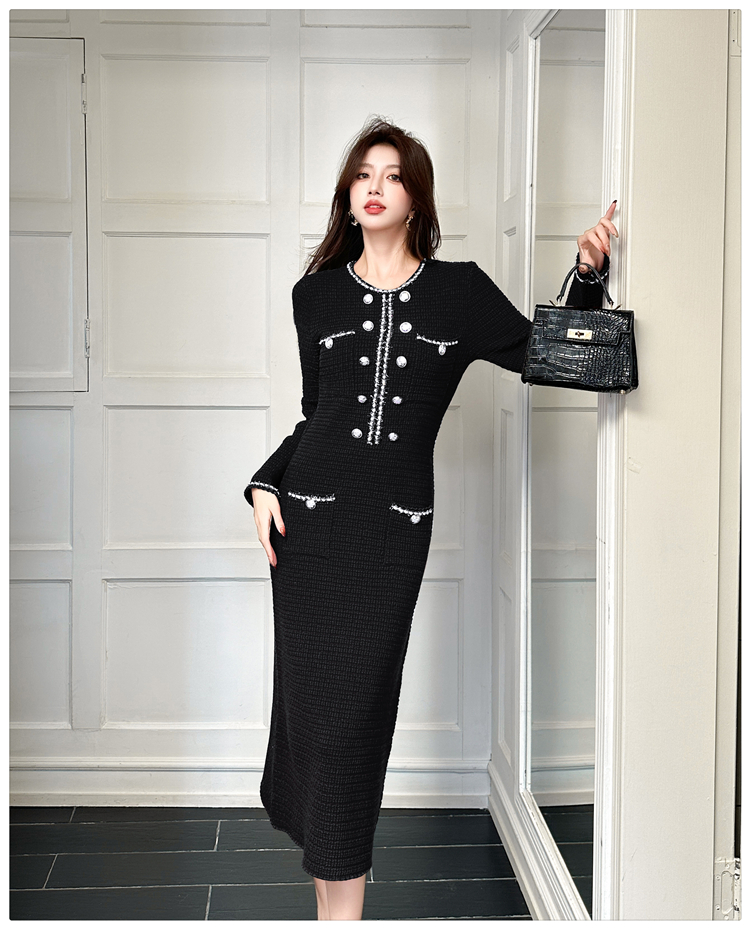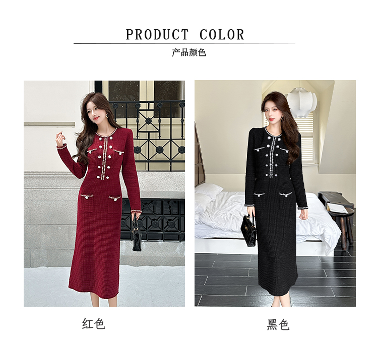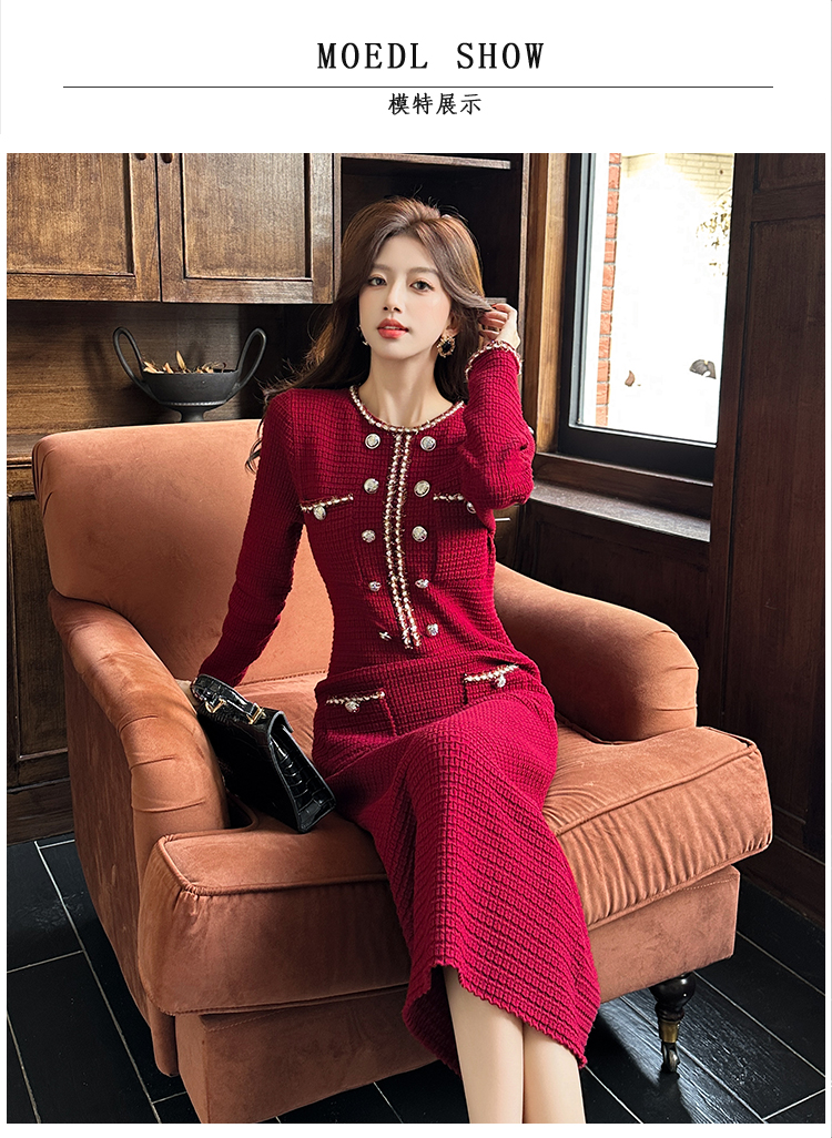 MY14812# 小香风针织连衣裙女法式高级感金属扣收腰修身气质毛衣过膝长裙女裝貨源服裝批發