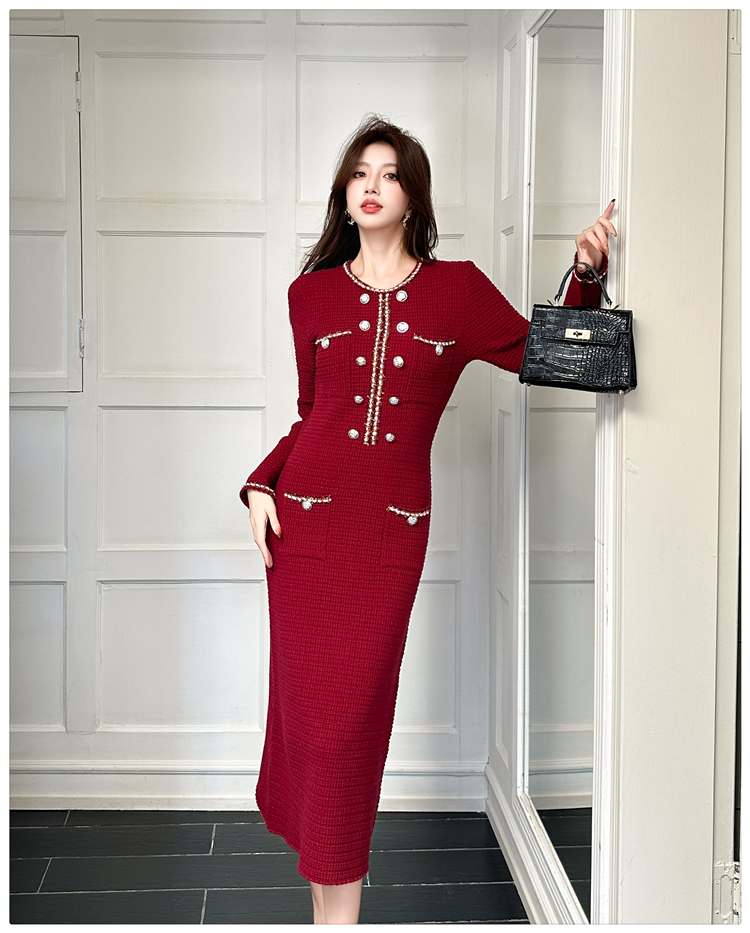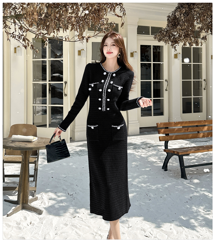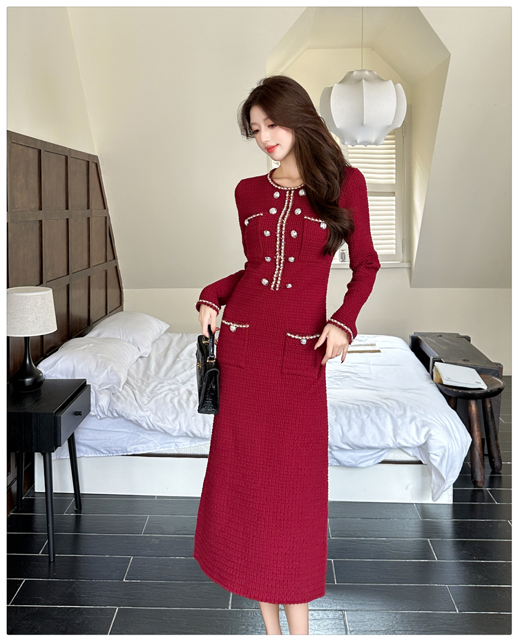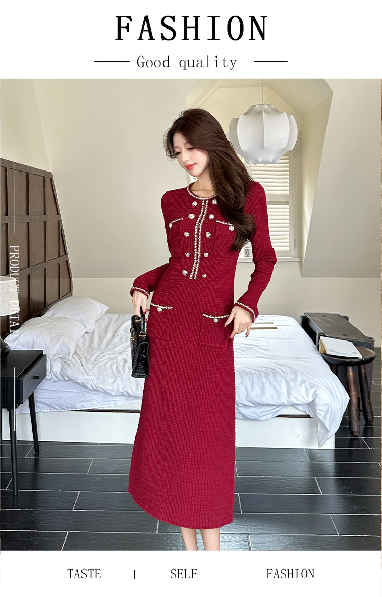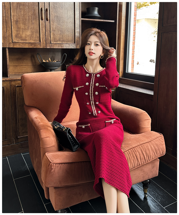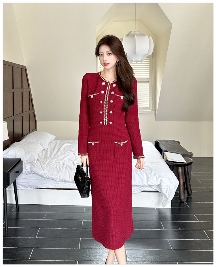MY14812# 小香风针织连衣裙女法式高级感金属扣收腰修身气质毛衣过膝长裙女裝貨源服裝批發