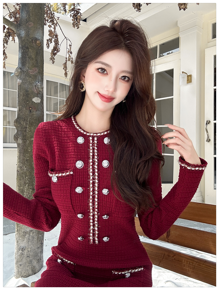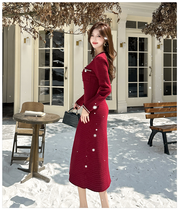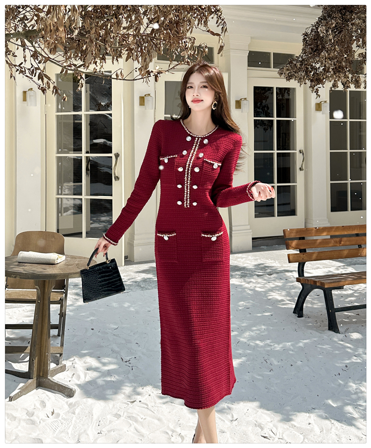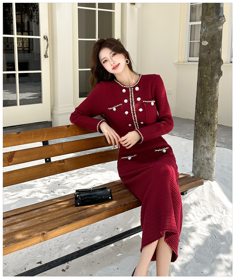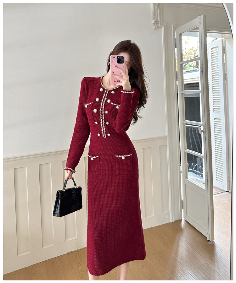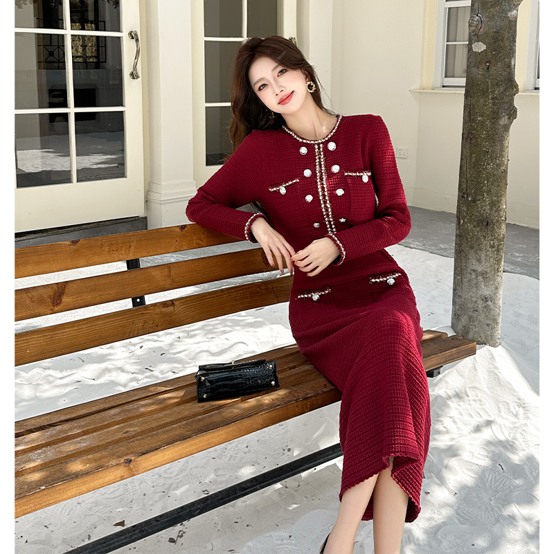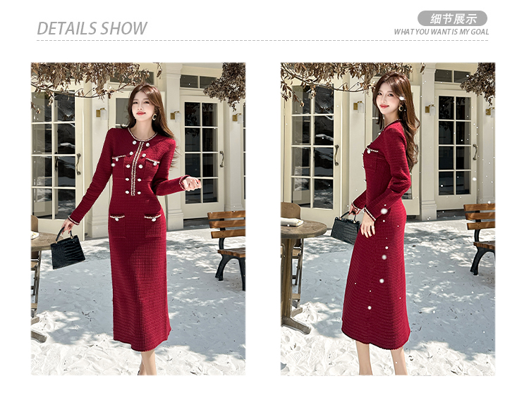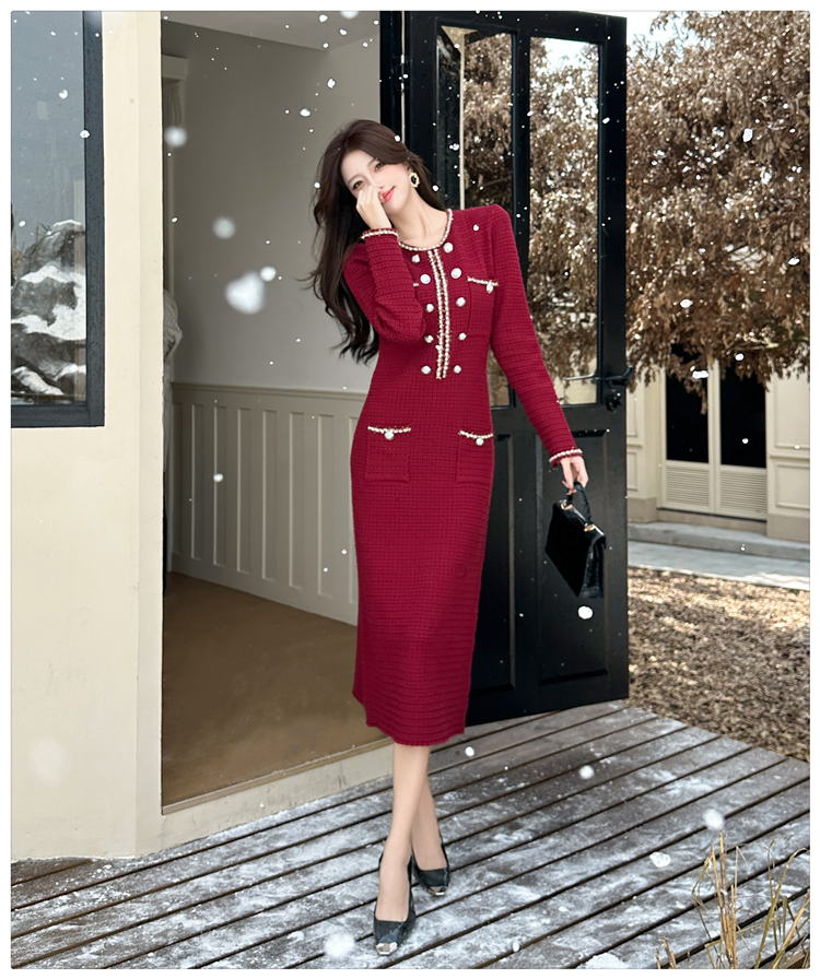 MY14812# 小香风针织连衣裙女法式高级感金属扣收腰修身气质毛衣过膝长裙女裝貨源服裝批發
