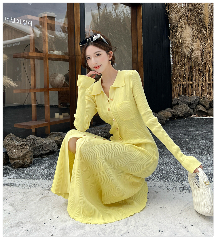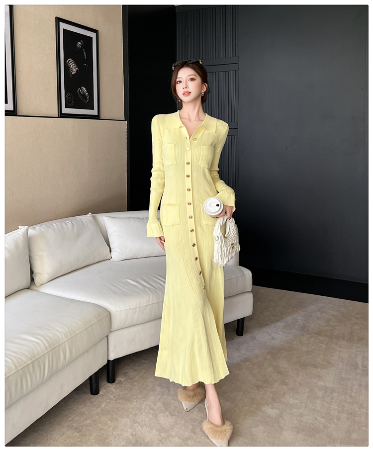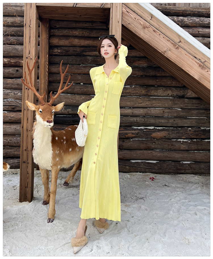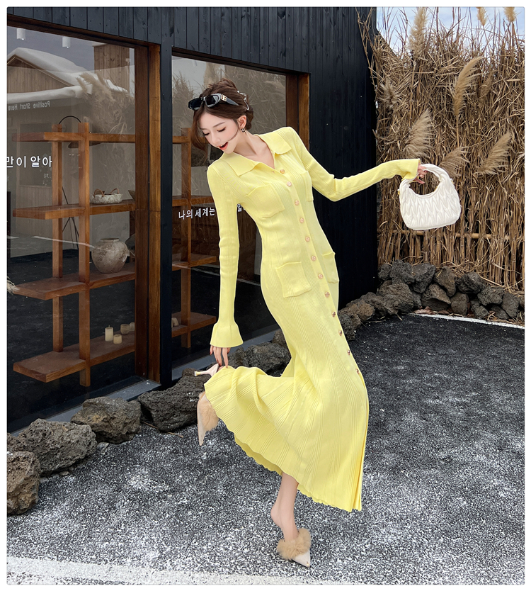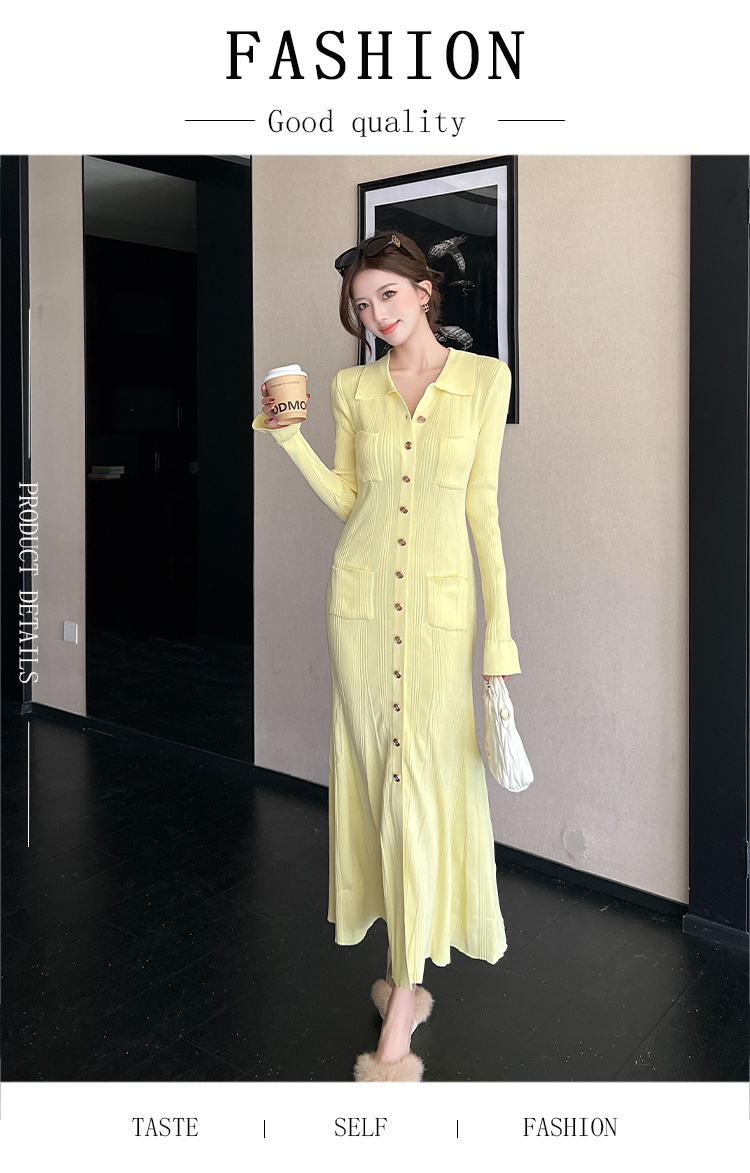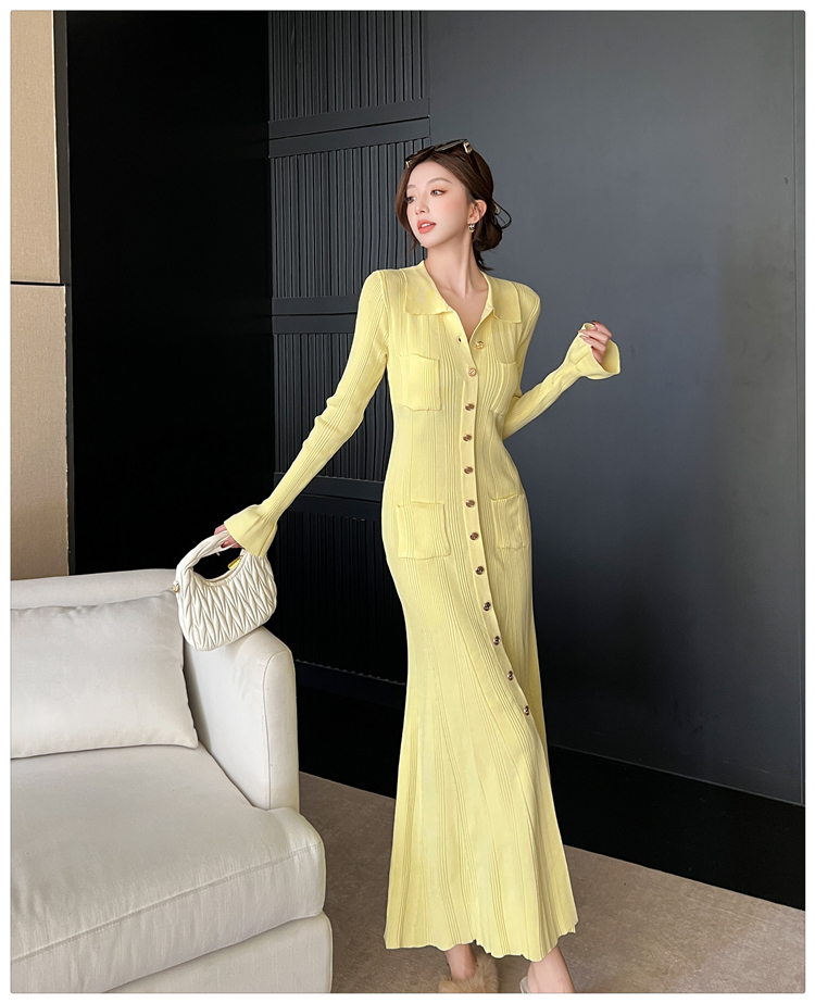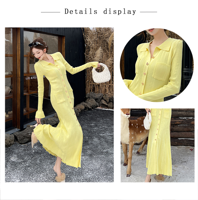 MY14813# 法式轻奢气质名媛减龄奶油黄单排扣修身垂感翻领针织连衣裙长裙女裝貨源服裝批發