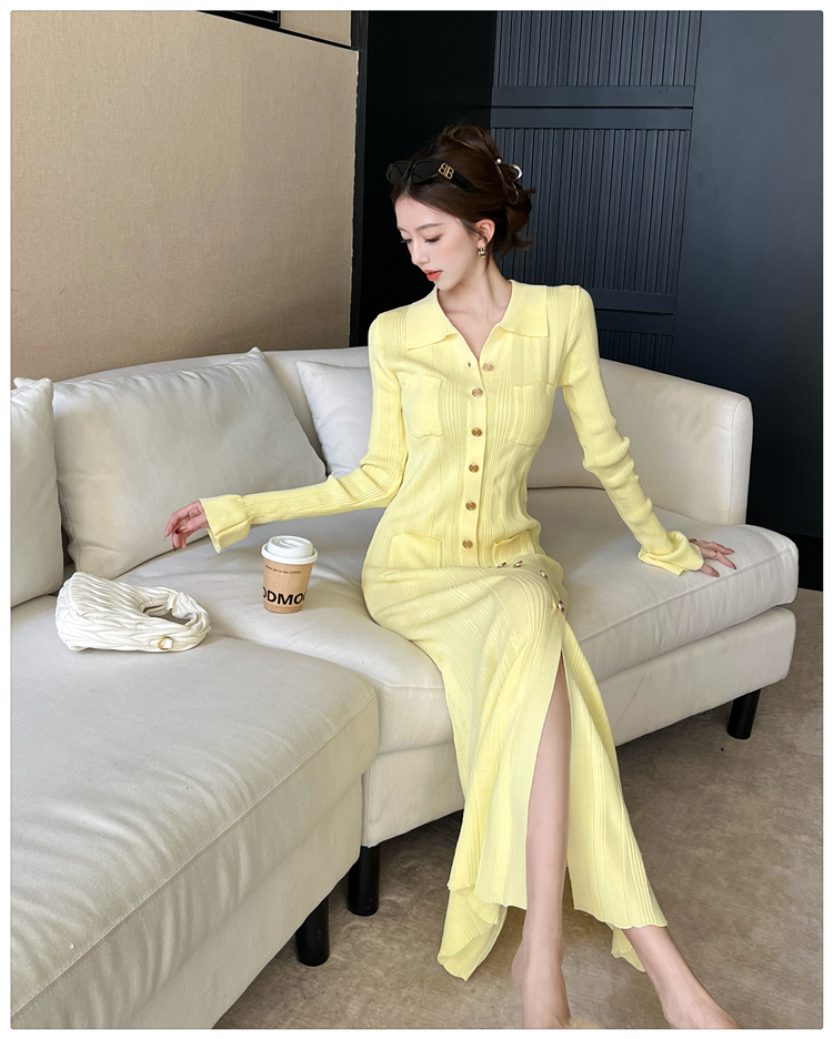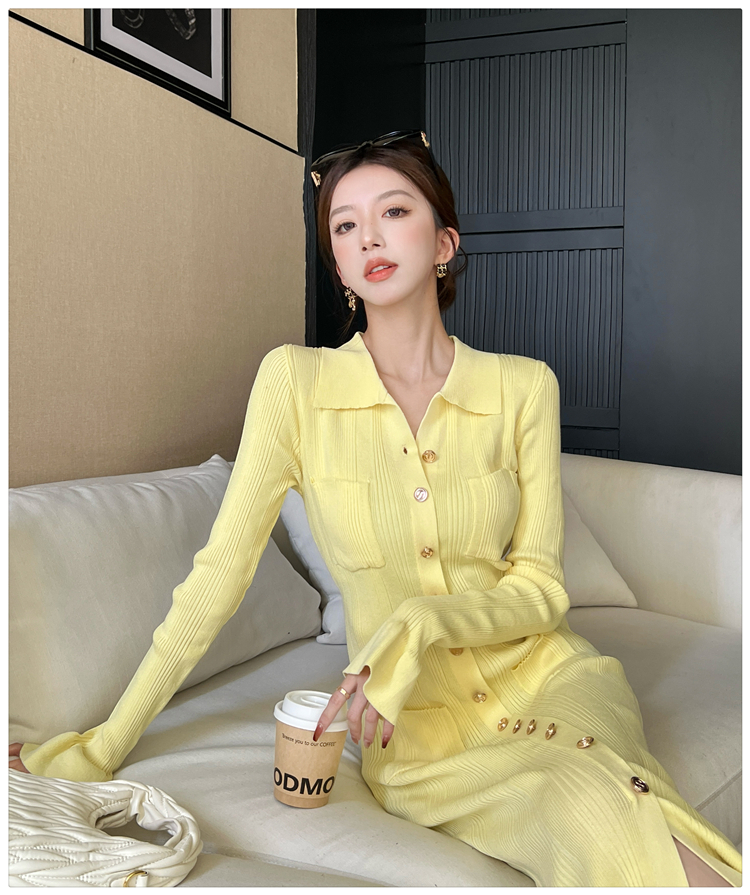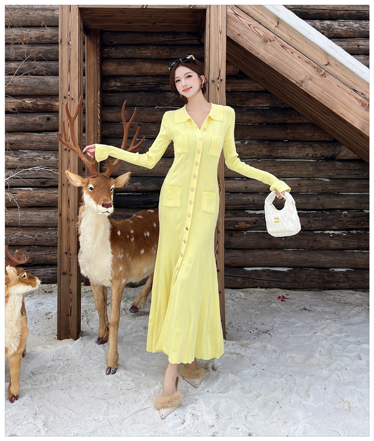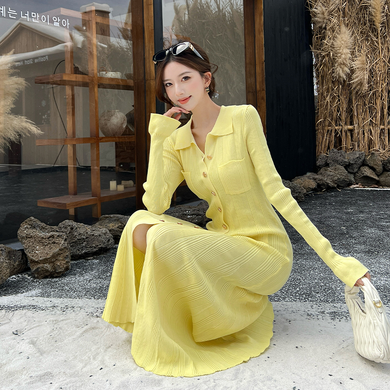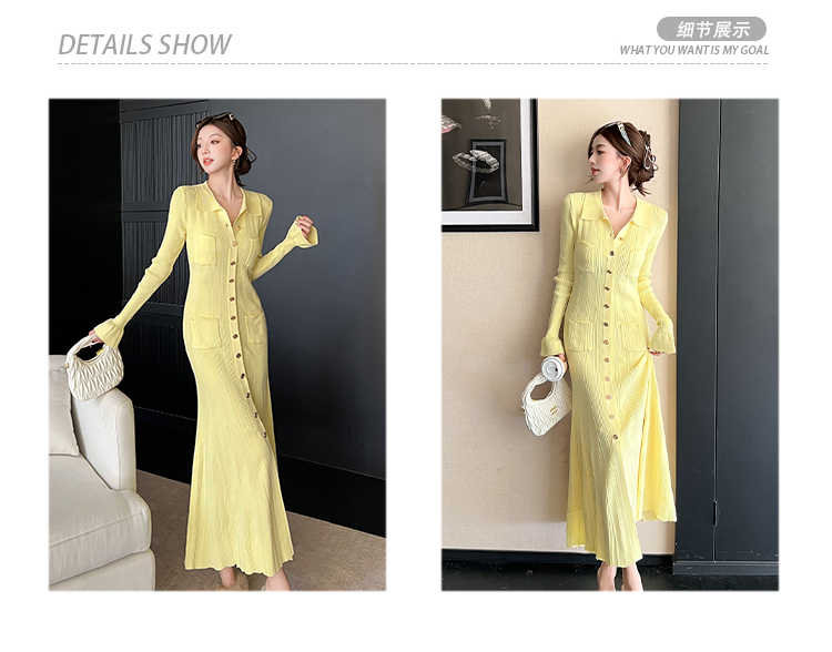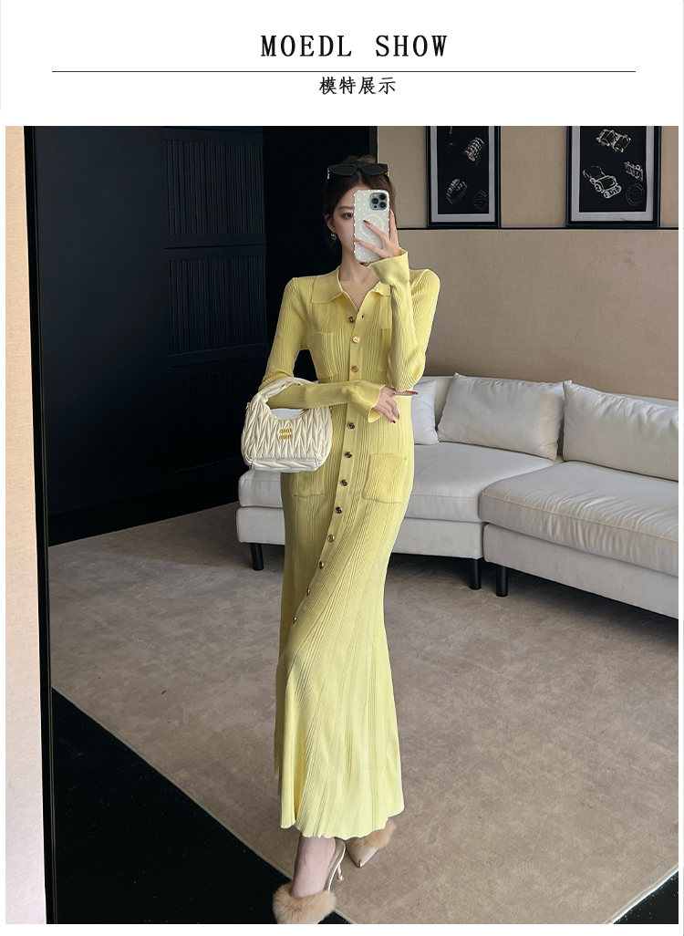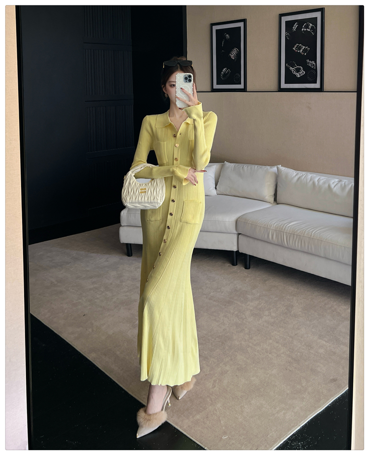 MY14813# 法式轻奢气质名媛减龄奶油黄单排扣修身垂感翻领针织连衣裙长裙女裝貨源服裝批發