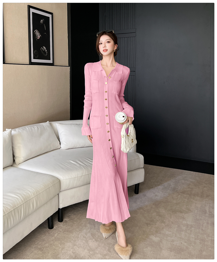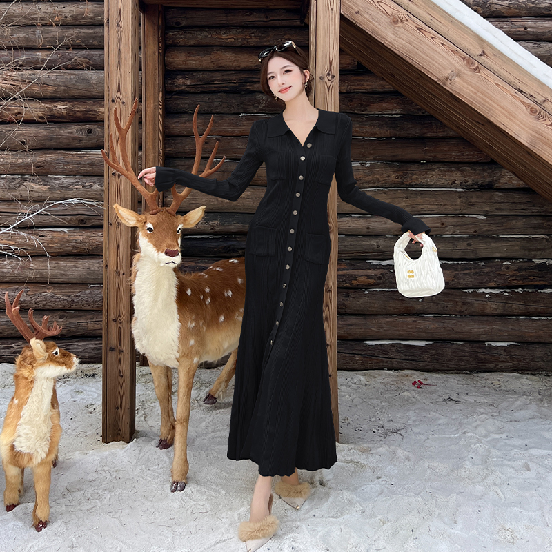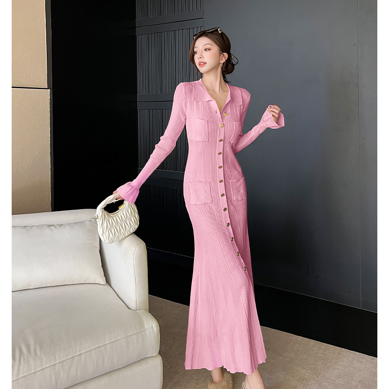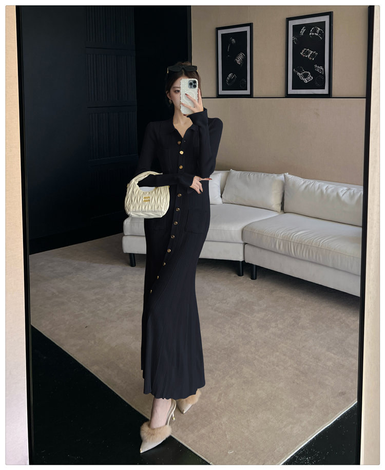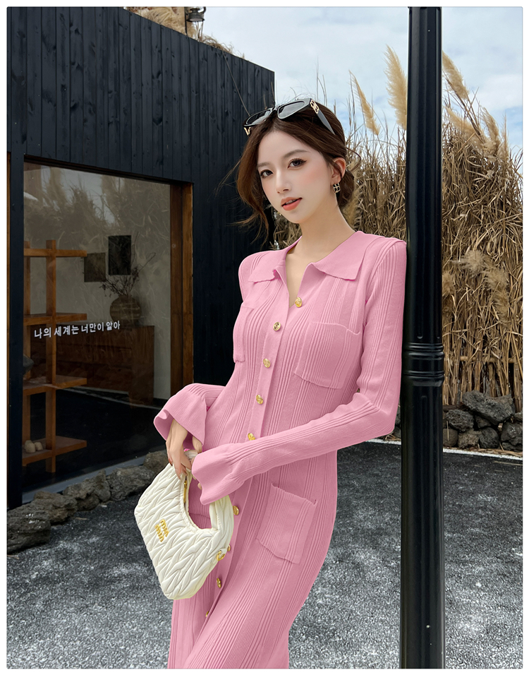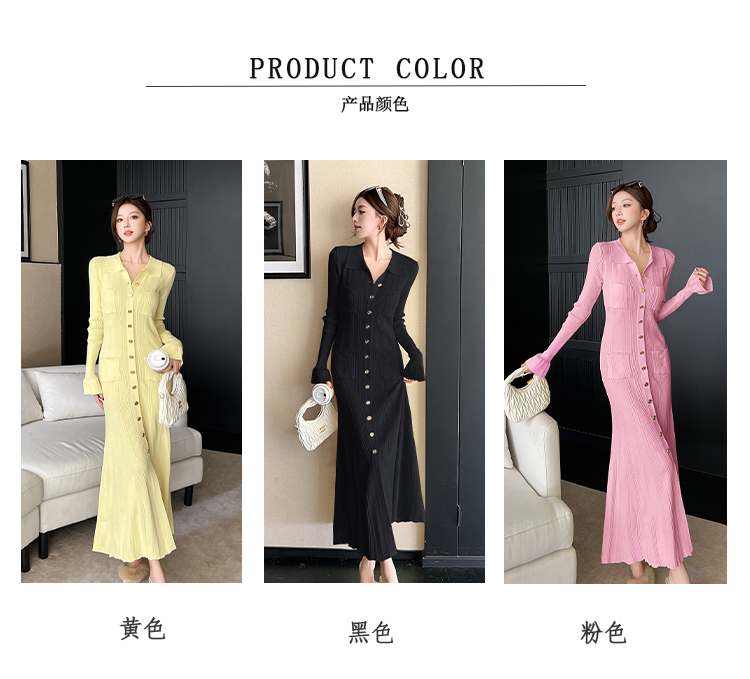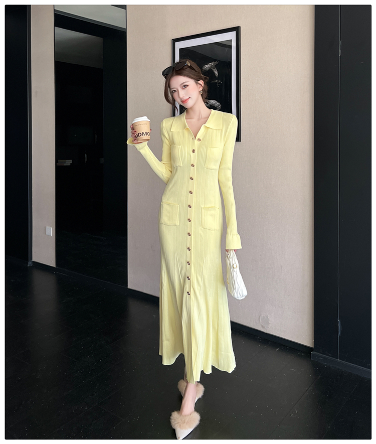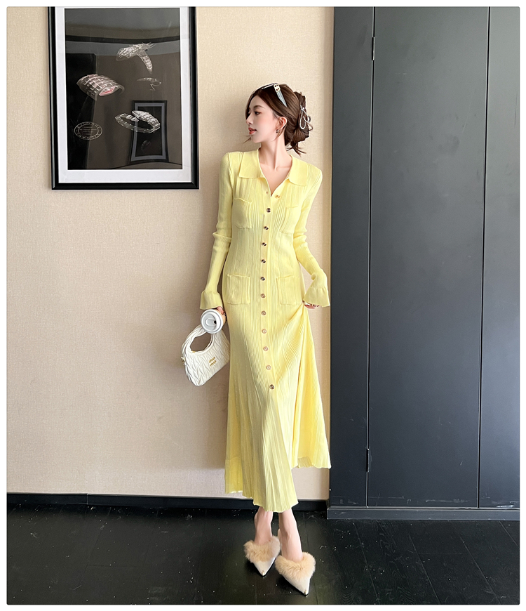 MY14813# 法式轻奢气质名媛减龄奶油黄单排扣修身垂感翻领针织连衣裙长裙女裝貨源服裝批發