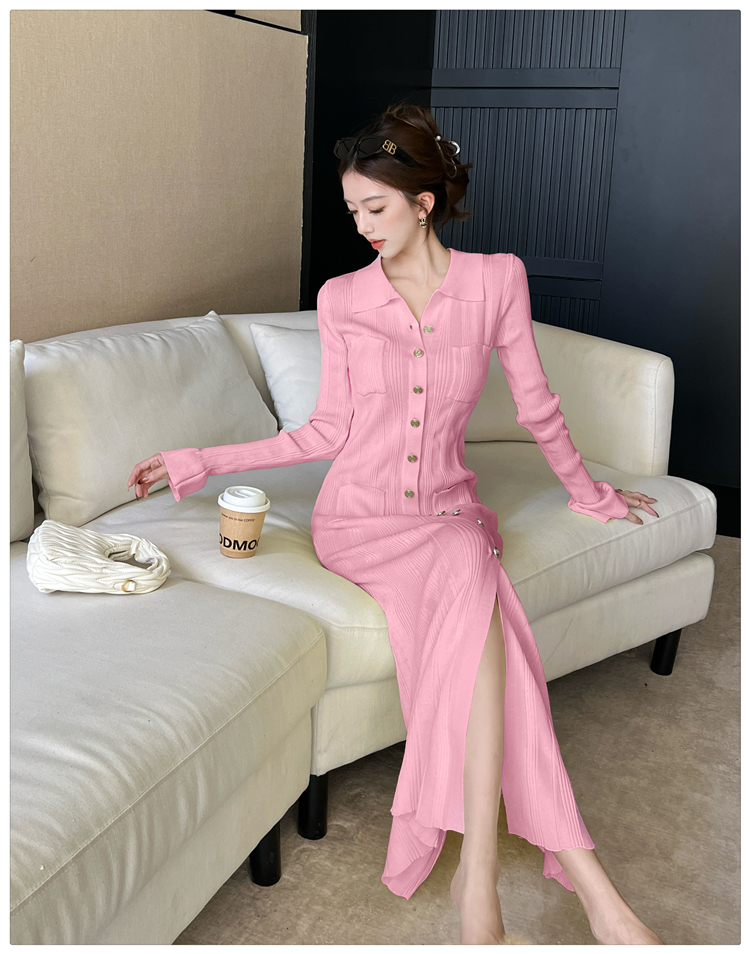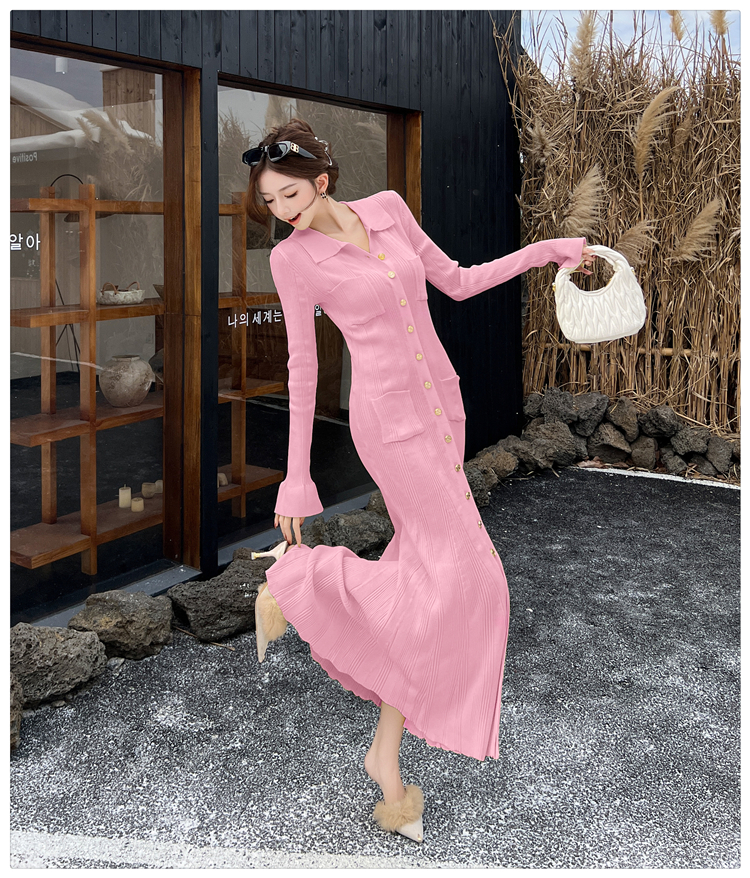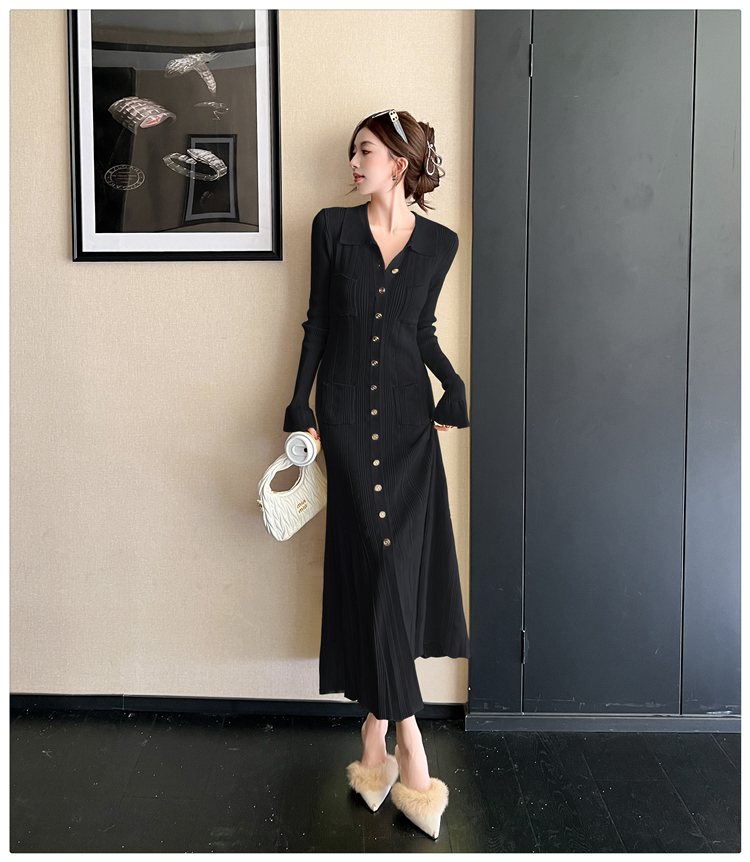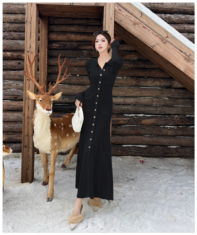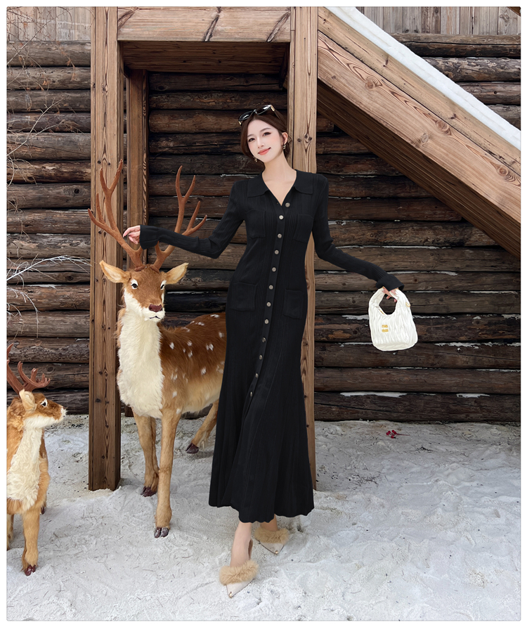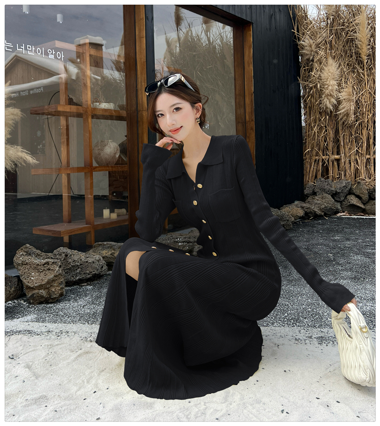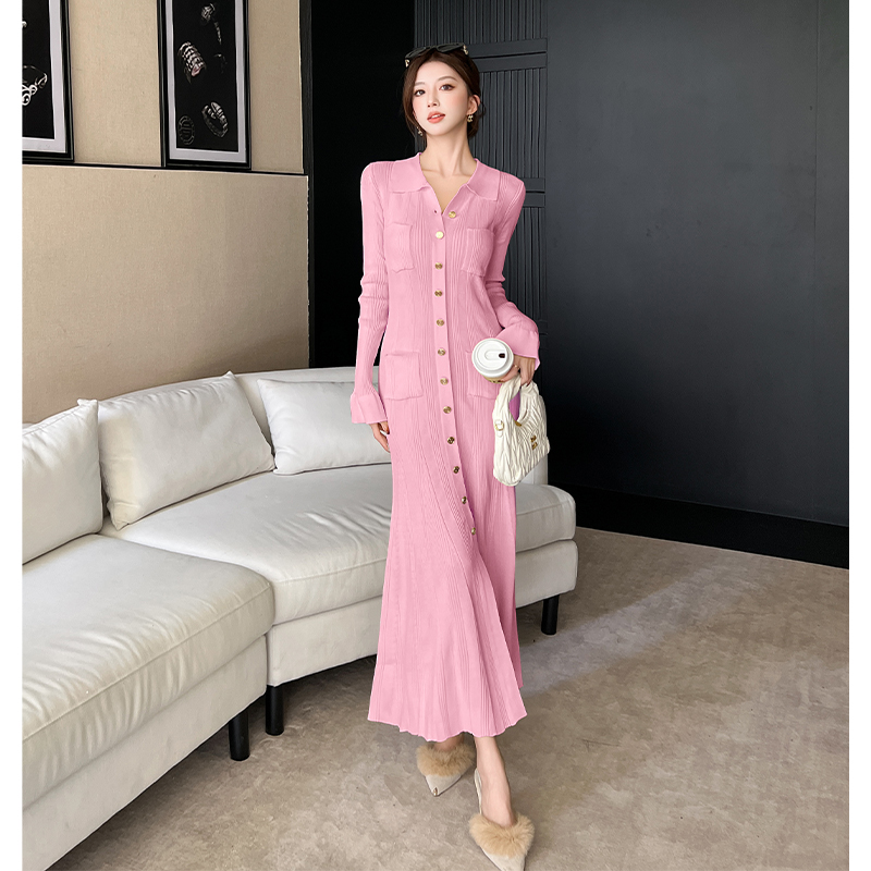 MY14813# 法式轻奢气质名媛减龄奶油黄单排扣修身垂感翻领针织连衣裙长裙女裝貨源服裝批發