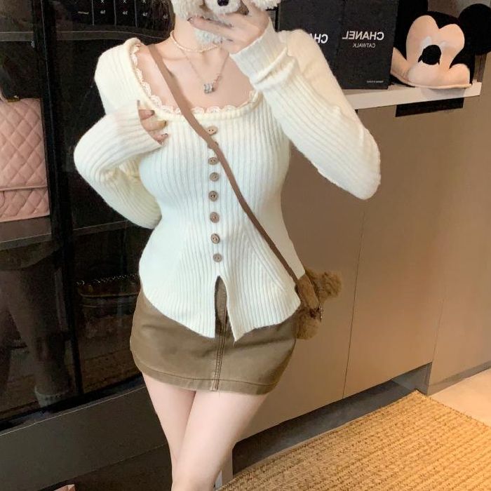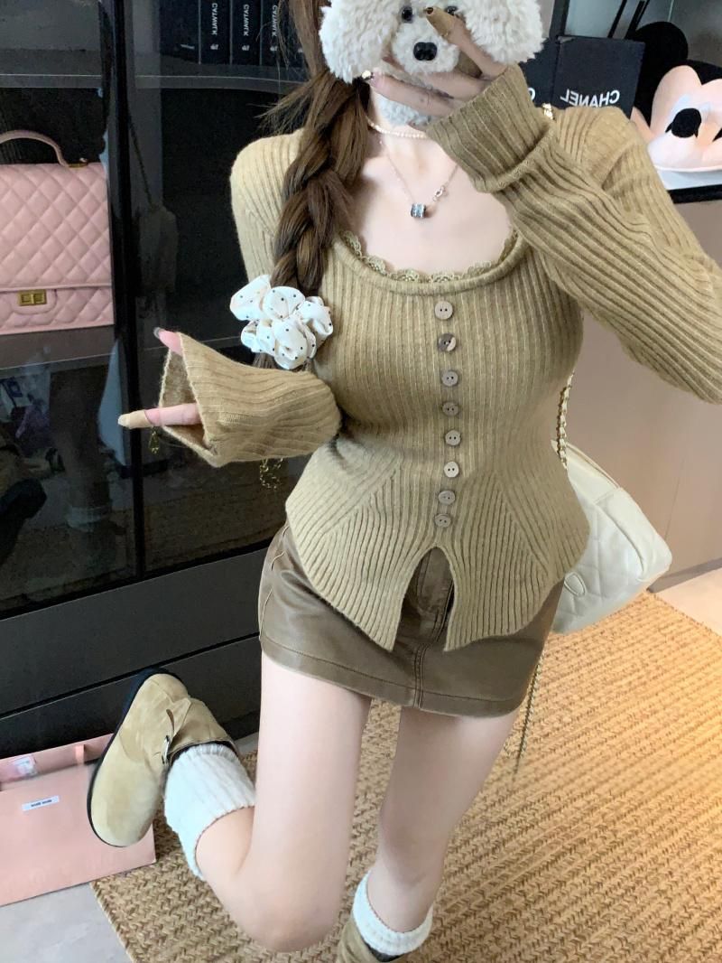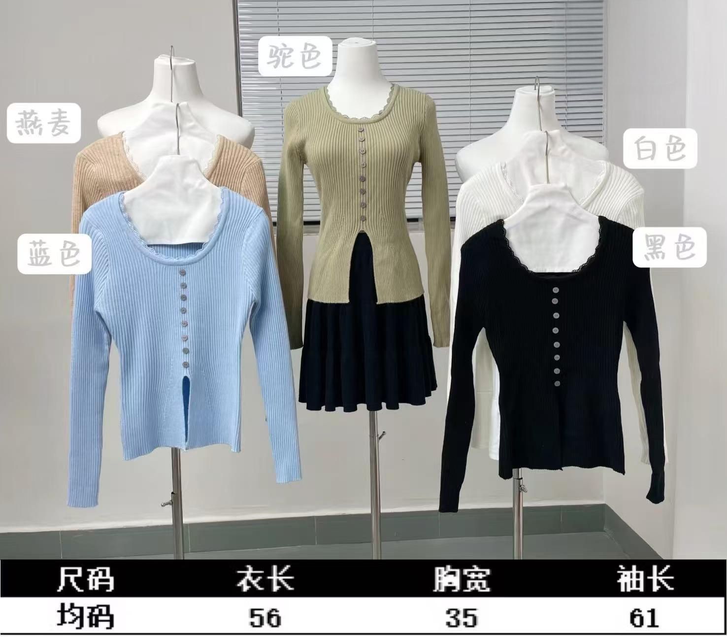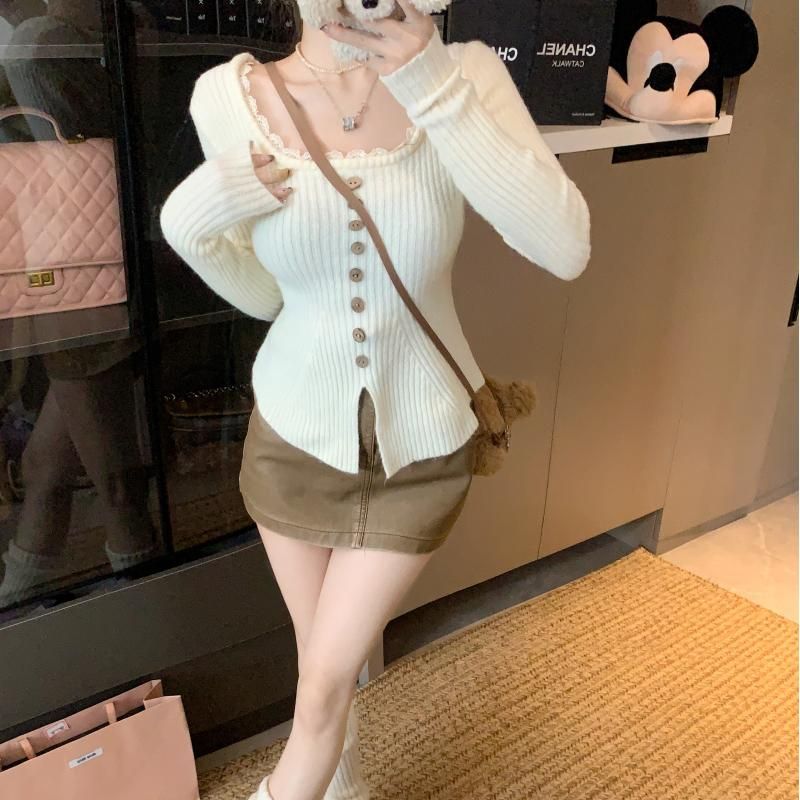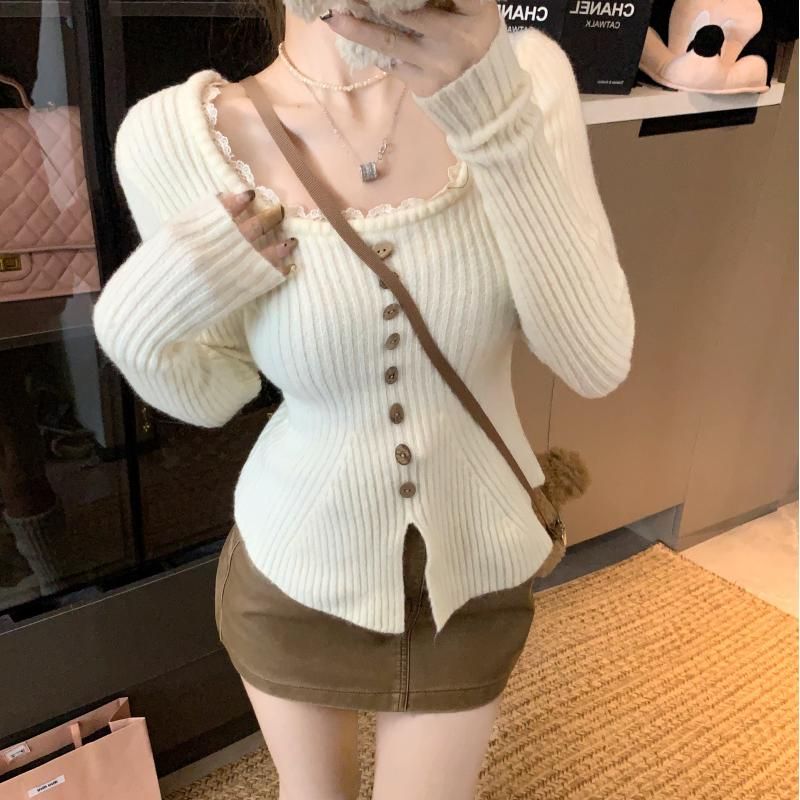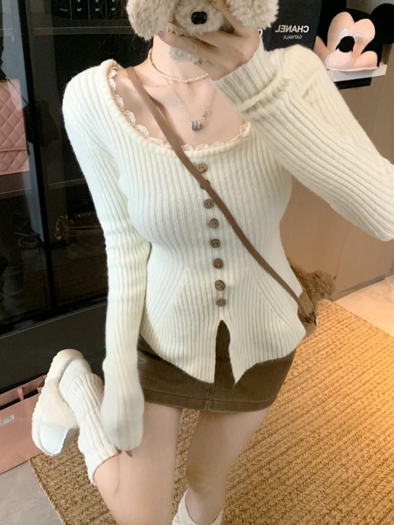 MY14822# 韩版纯色蕾丝拼接长袖针织衫女装新款修身显瘦设计感百搭上衣女裝貨源服裝批發